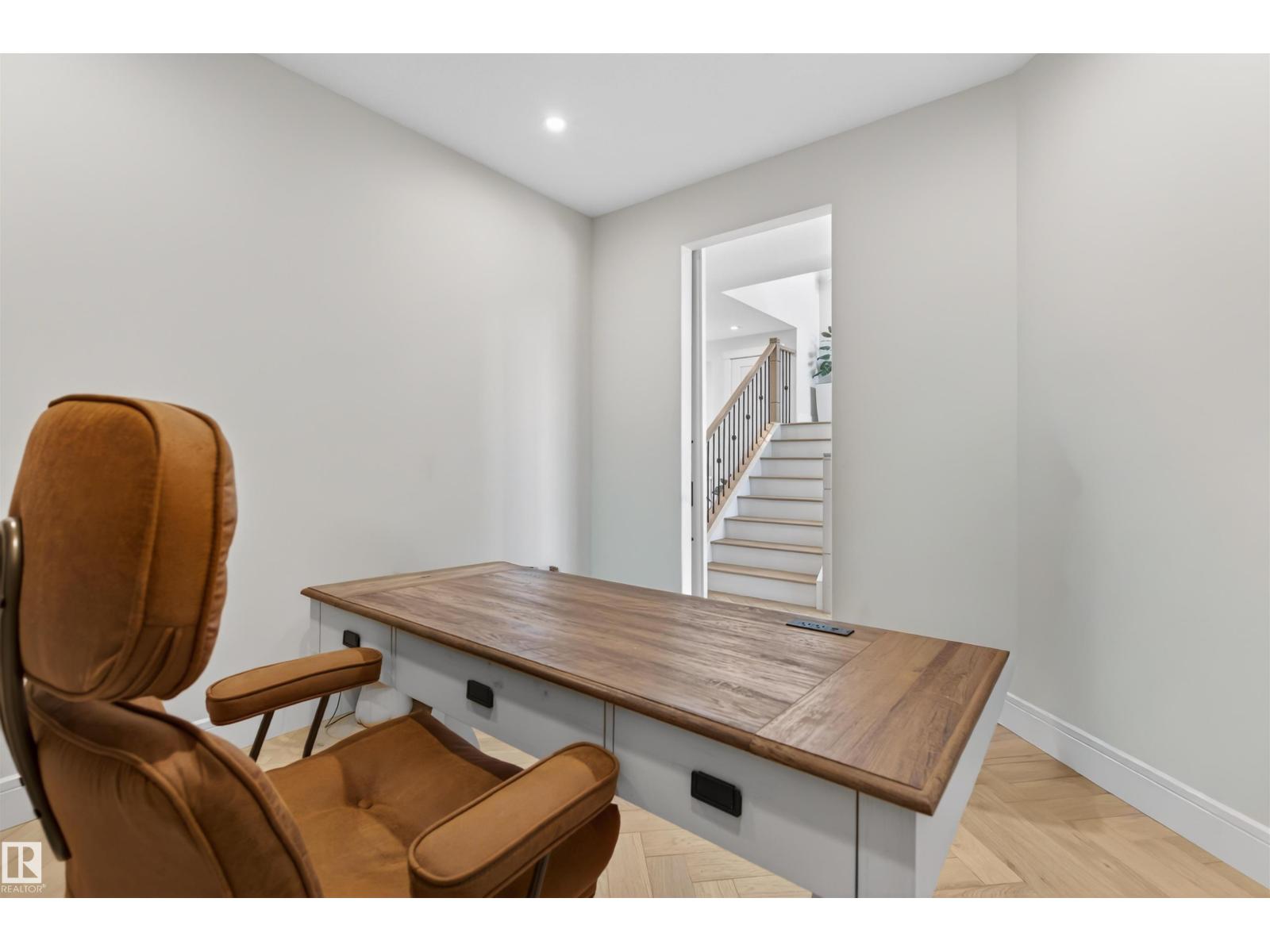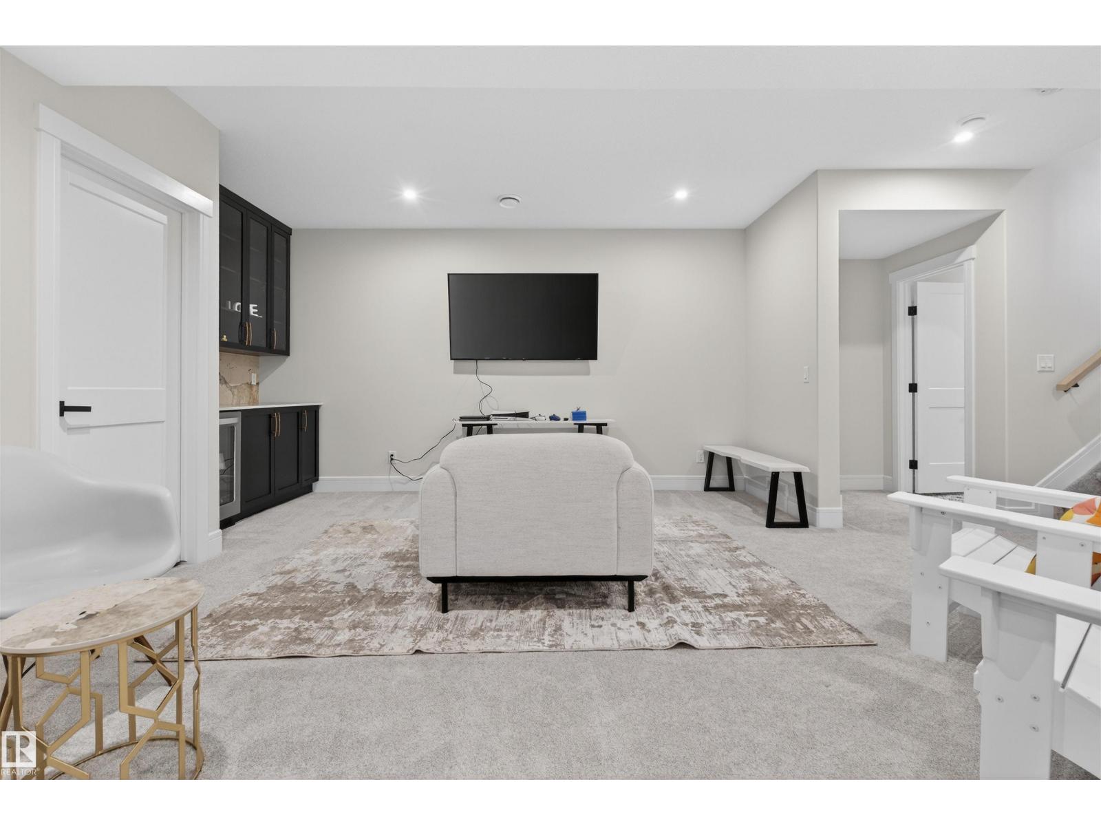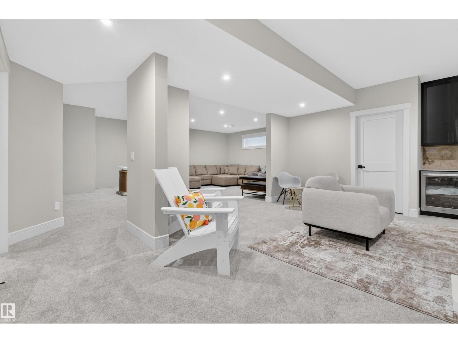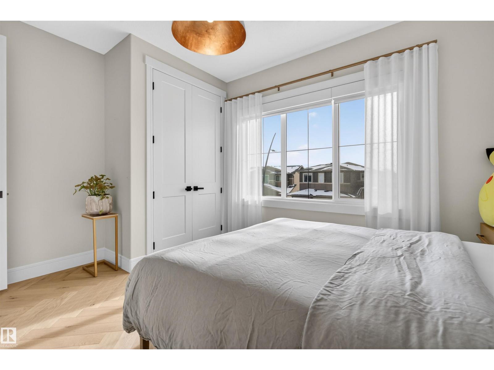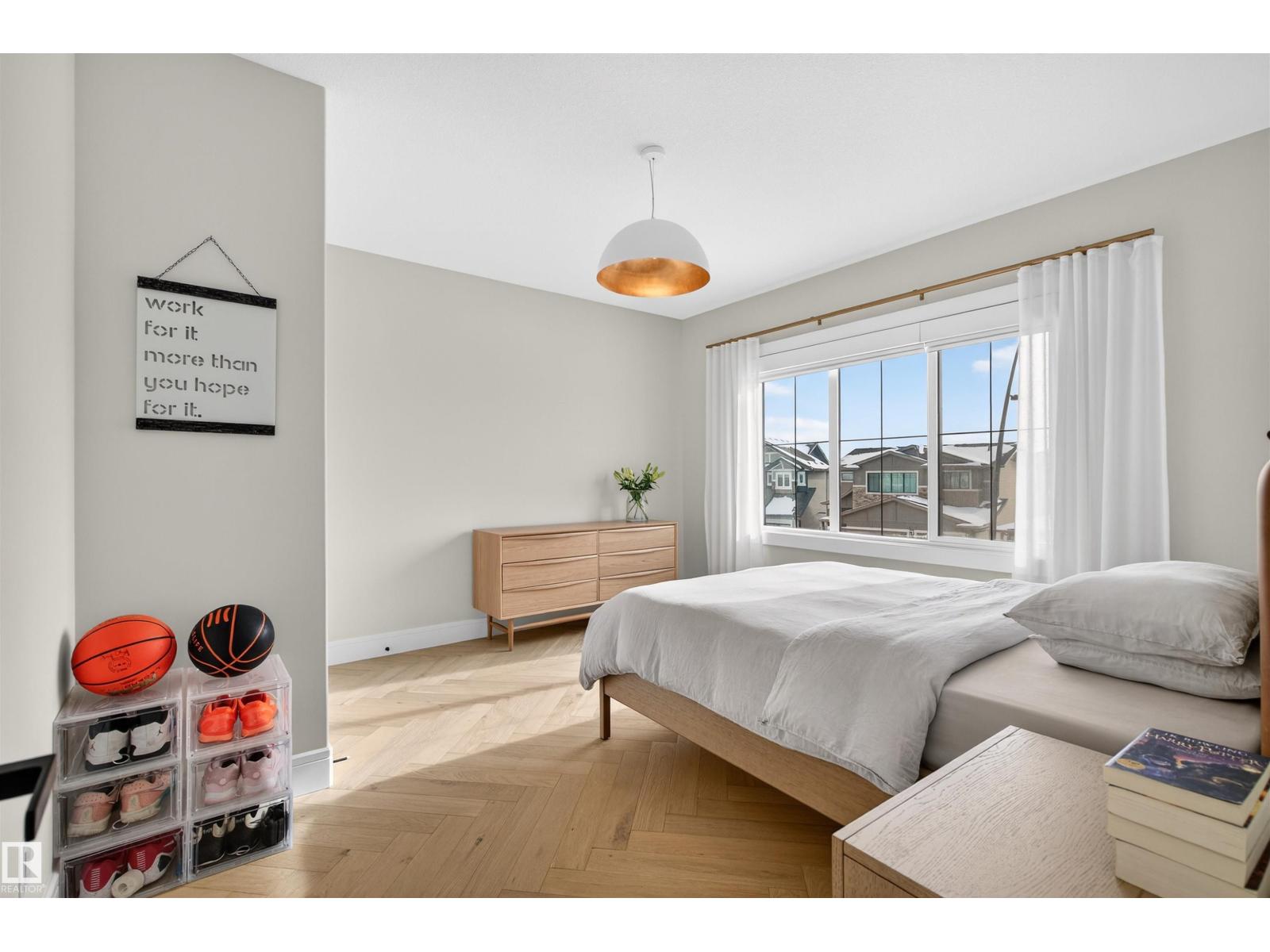 This elegant custom built home blends timeless architecture with refined, minimalist design. Perfectly positioned along an extensive walking trail & forested green space offers both privacy & a serene natural backdrop. All details curated for comfort & family living. Stunning, spacious kitchen showcases a luxury leather-touch Cambria Quartz Island, gas range & hidden butler’s pantry with direct access to the garage. The open-concept main floor is graced by an open stairwell leading to the upper loft, creating a sense of light & architectural interest. Upgrades include Hardwood Flooring, Oversized Windows, Custom floor-to-ceiling Drapes, main-floor office & large upper laundry room. With 4 bdrms, 3.5 baths, A/C &Triple garage. This Home is perfect for all family sizes. The Fully finished basement has a stylish wet bar, recreation room, an extra bedroom & a 3-piece bathroom—perfect for guests & entertaining. Walking distance to park, playground & transit, this home blends luxury, comfort, and convenience. (id:63190)