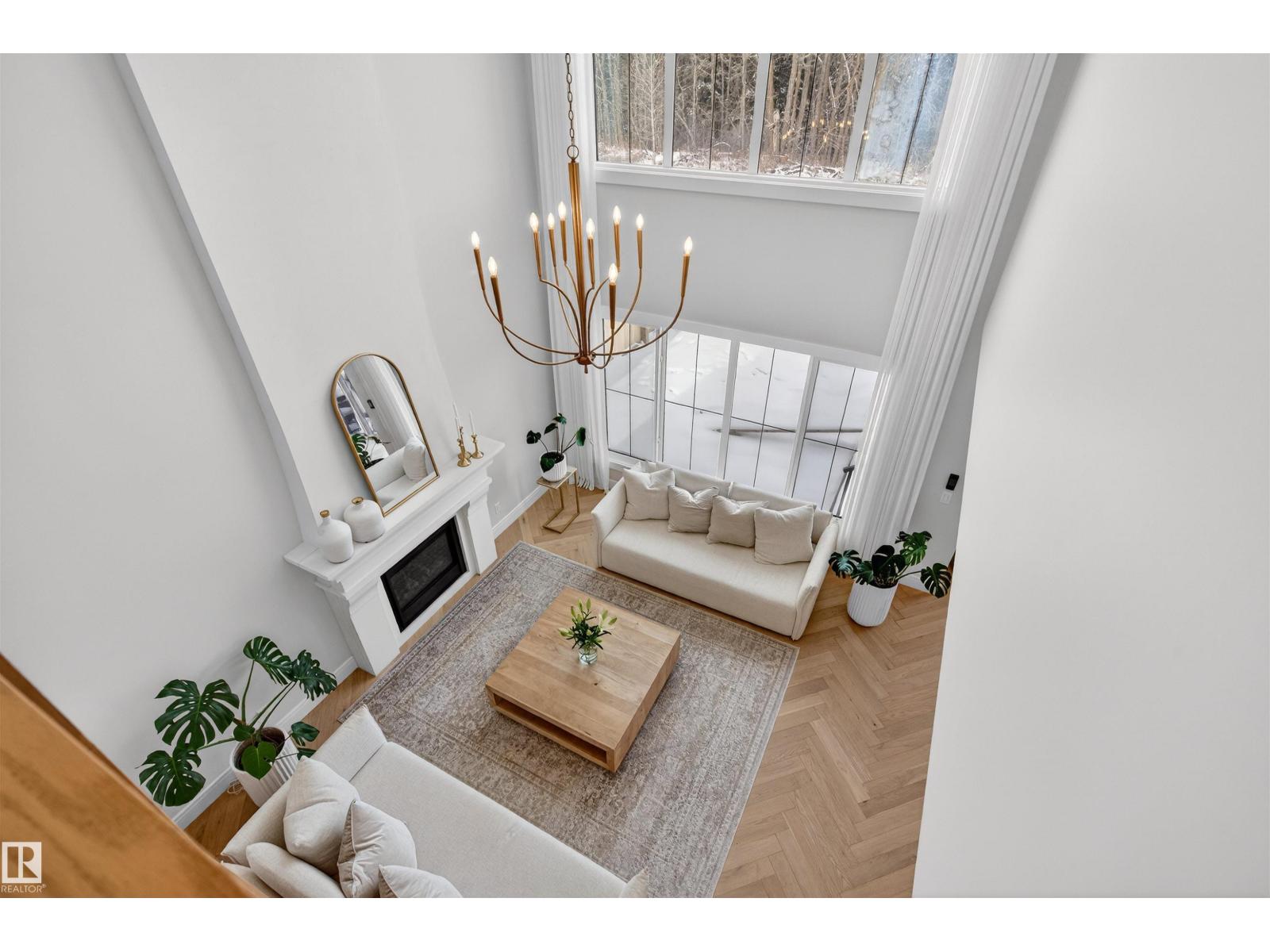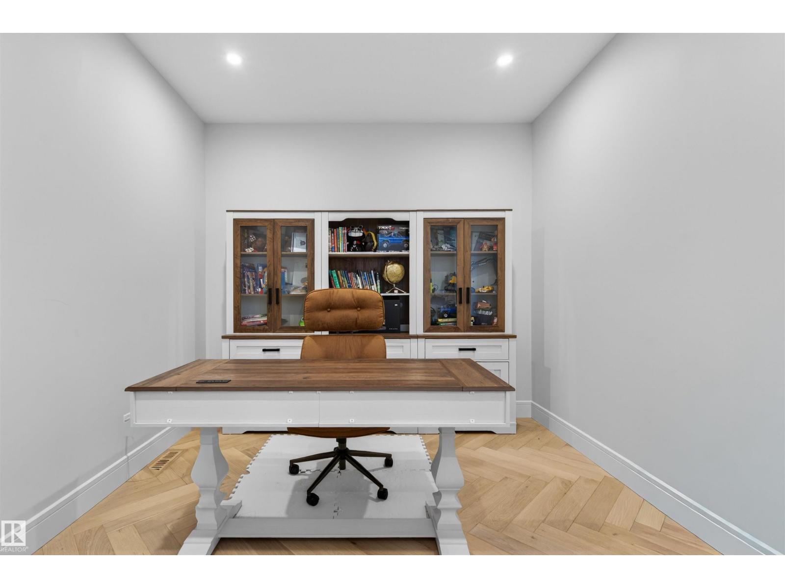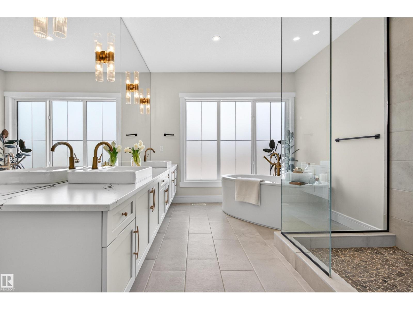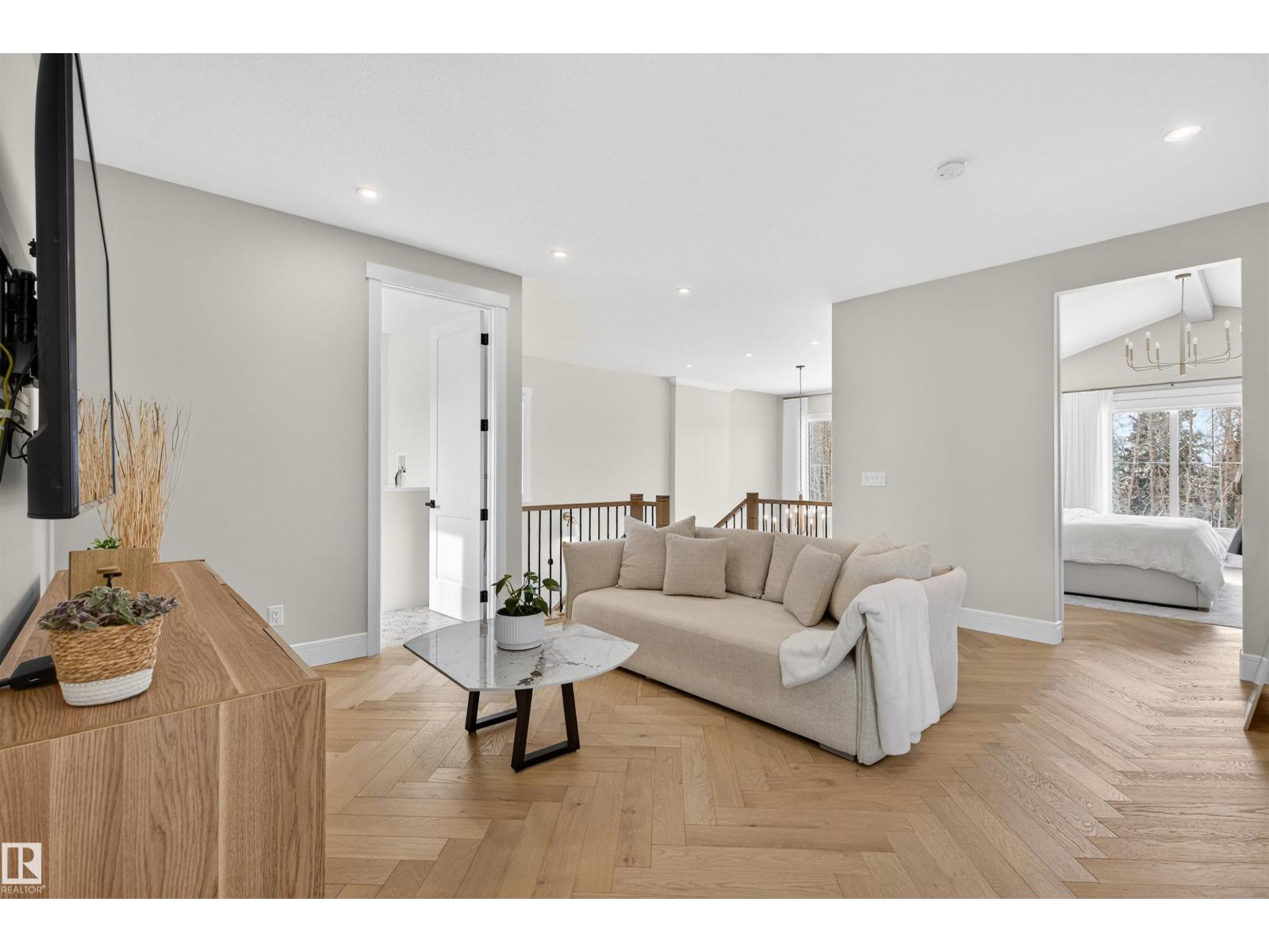This elegant custom built home blends timeless architecture with refined, minimalist design. Perfectly positioned along an extensive walking trail & forested green space offers both privacy & a serene natural backdrop. All details curated for comfort & family living. Stunning, spacious kitchen showcases a luxury leather-touch Cambria Quartz Island, gas range & hidden butler’s pantry with direct access to the garage. The open-concept main floor is graced by an open stairwell leading to the upper loft, creating a sense of light & architectural interest. Upgrades include Hardwood Flooring, Oversized Windows, Custom floor-to-ceiling Drapes, main-floor office & large upper laundry room. With 4 bdrms, 3.5 baths, A/C &Triple garage. This Home is perfect for all family sizes. The Fully finished basement has a stylish wet bar, recreation room, an extra bedroom & a 3-piece bathroom—perfect for guests & entertaining. Walking distance to park, playground & transit, this home blends luxury, comfort, and convenience. (id:63190)