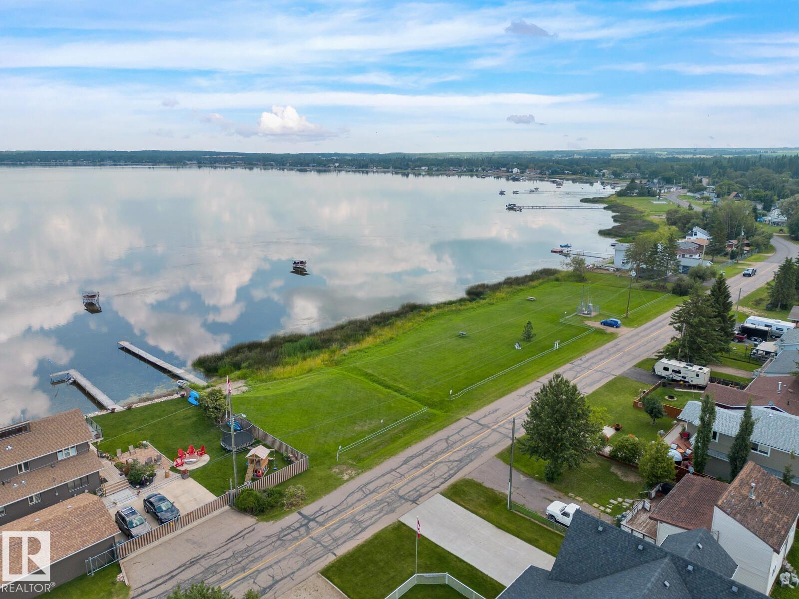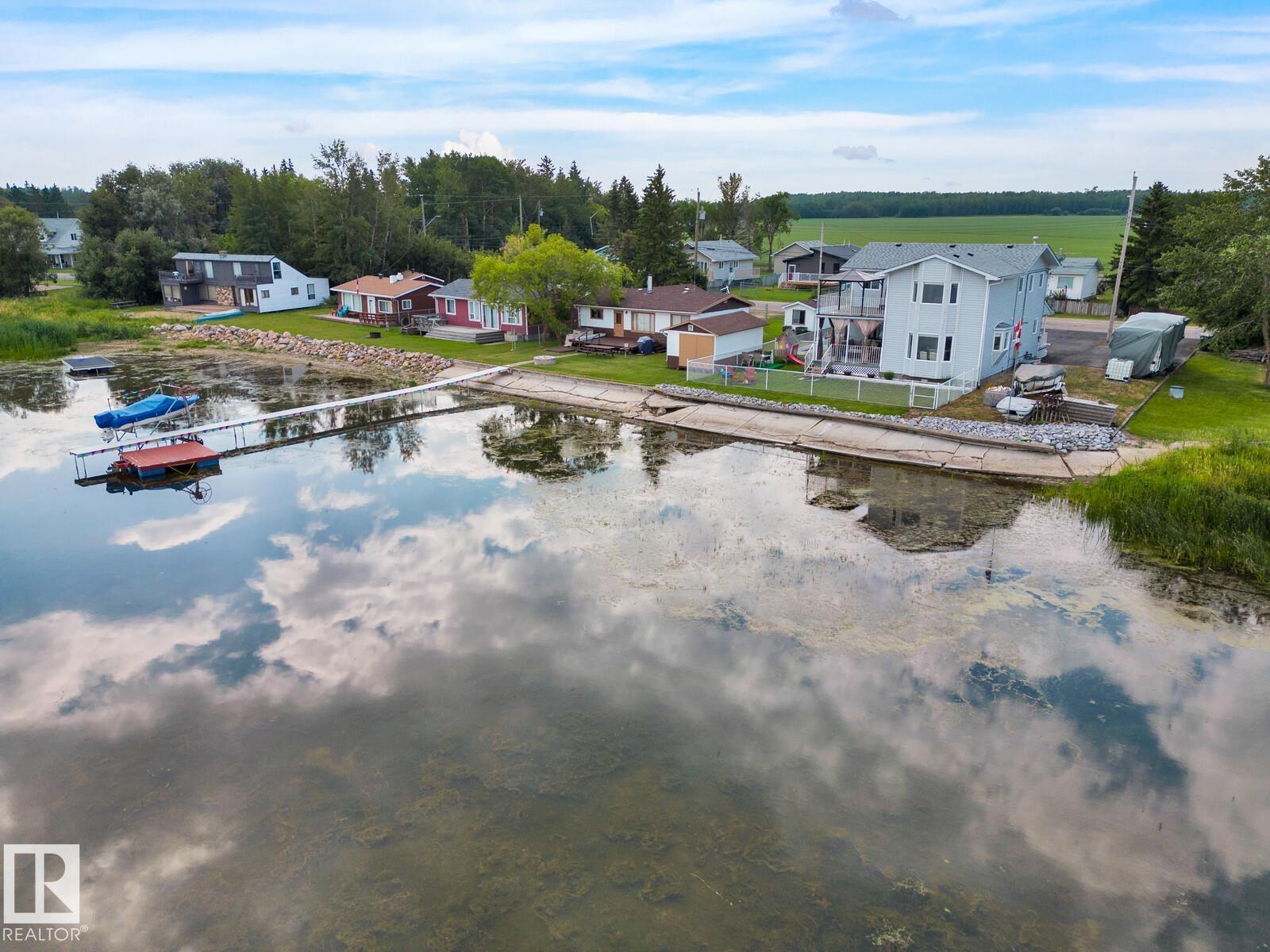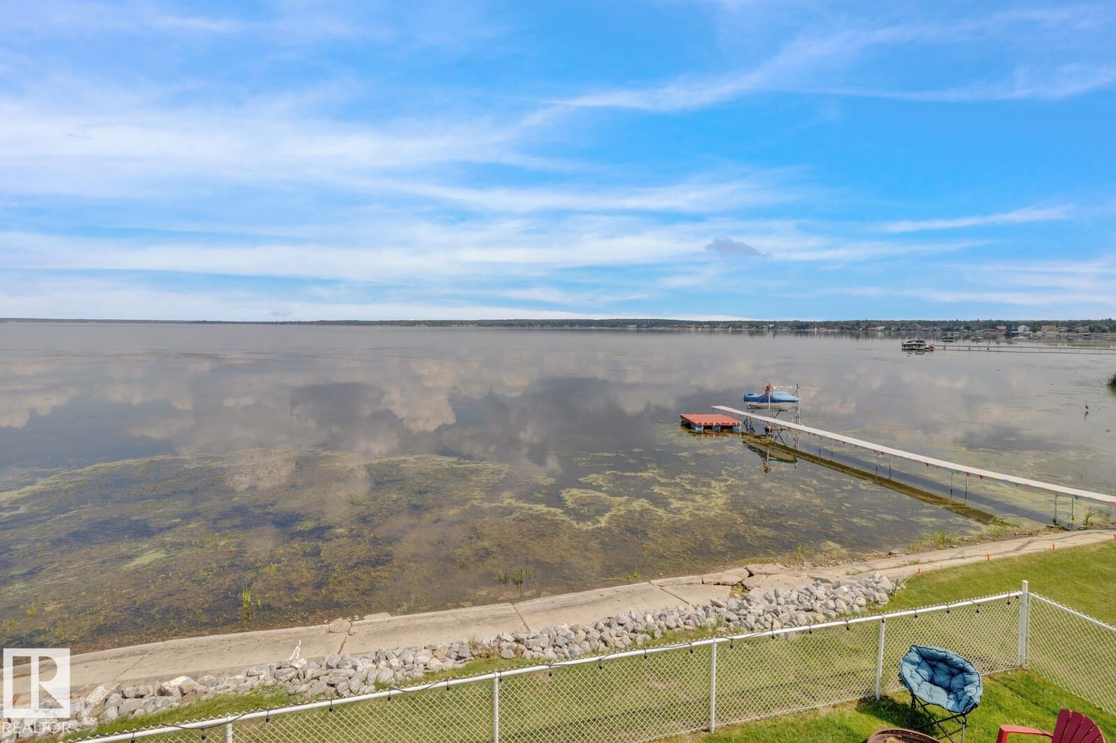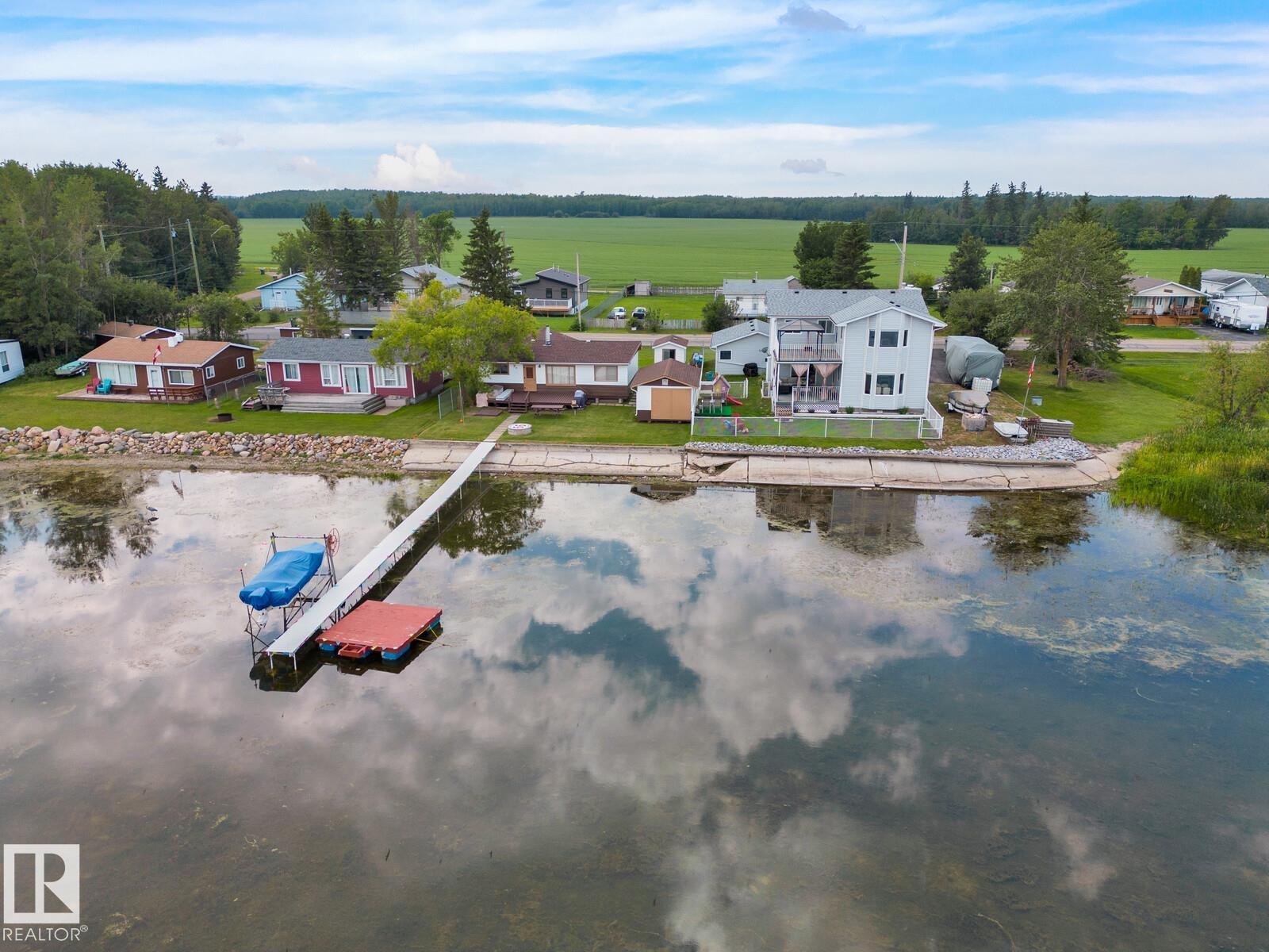 Love living on the quieter side of Alberta Beach in the Summer Village of Val Quentin. This move-in ready home offers stunning water views from every window—lake views surround you, creating a peaceful year-round retreat. Situated on a private DOUBLE LOT with reserve land on one side and only one direct neighbour. Extensively upgraded: well (2020), shingles (2020), paving (2020), vinyl plank flooring (2020), hi-eff boiler (2015), HWT (2016), Tuf Deck, blinds, FP remote (2020), generator (2020). Fresh paint and a bright, beachy kitchen complete the space. Enjoy year-round events, festivals, shops, and access to Grasmere School. Embrace lake living with boating, fishing, ice fishing, and bonfires, then unwind in the tranquil setting. Located 30 mins to Stony Plain and 45 mins to St. Albert. (id:63190)