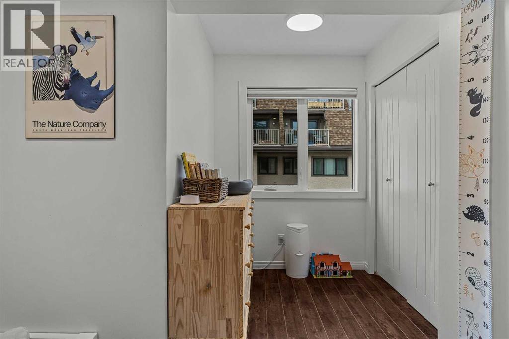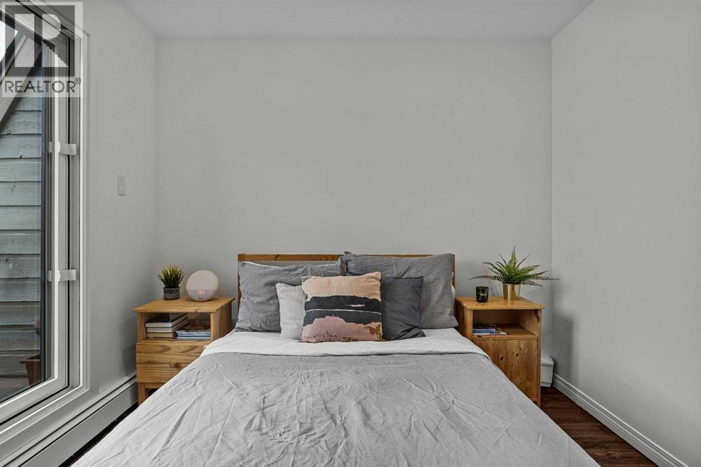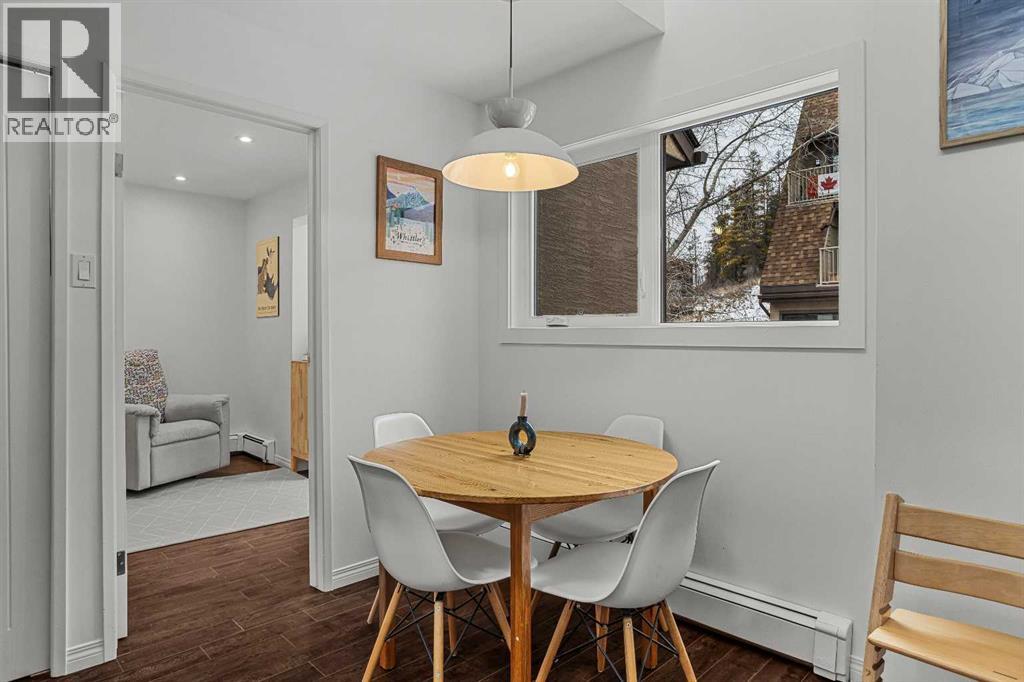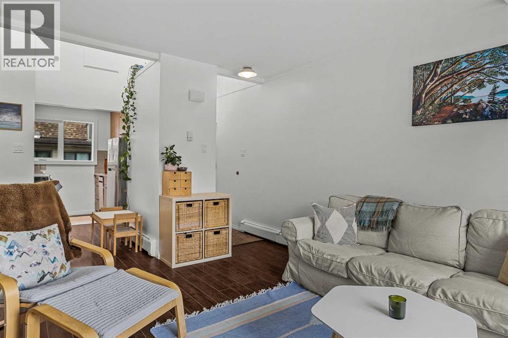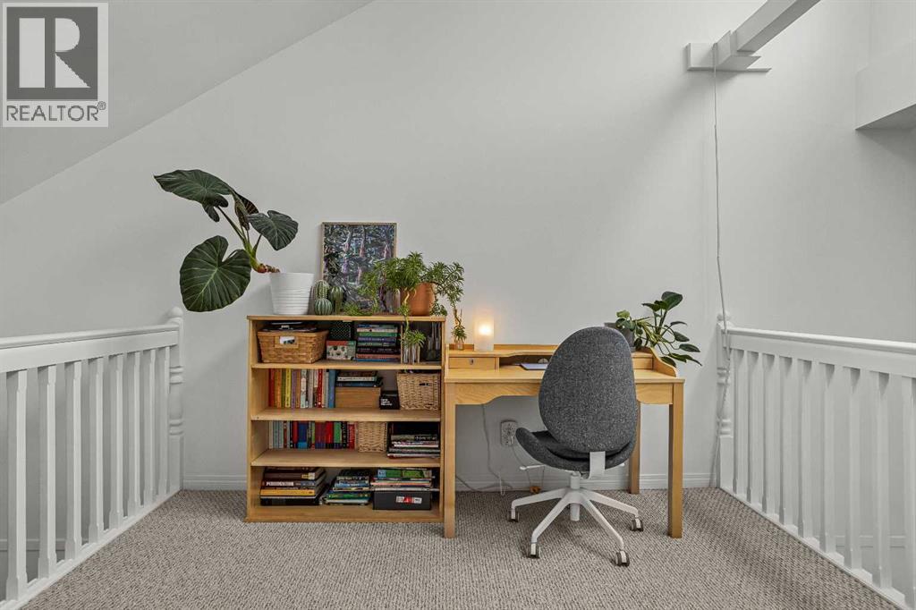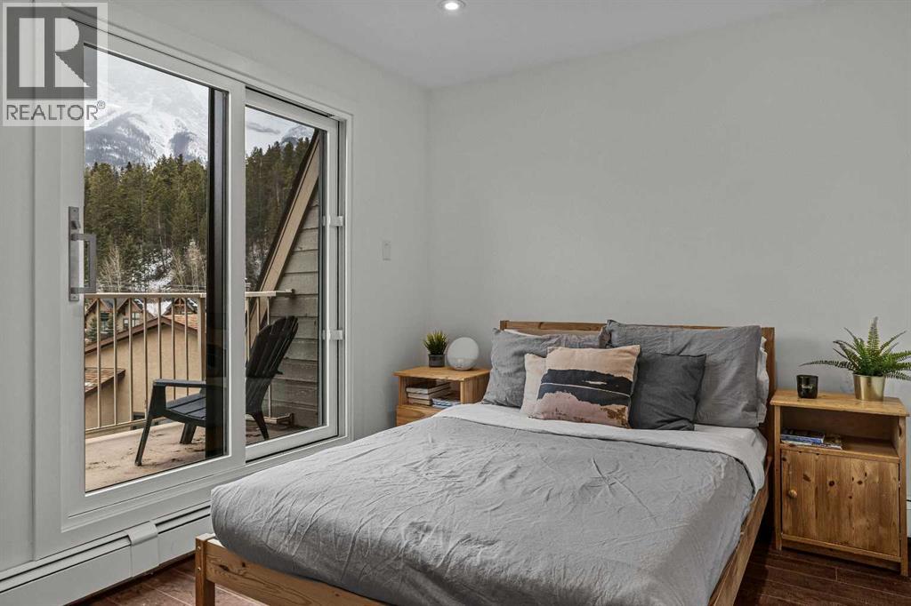 Just steps from the Bow River, endless trails & the singular mountain town aura that Canmore brings, you’ll find this top level, 2 bed & loft townhouse. On entry, the views are immediately apparent, with a direct line-of-sight to the emblematic Three Sisters mountains. Anchored by a feature fireplace, the main living area is a calming refuge, where high ceilings & natural light take advantage of the southeast aspect. Year round sun is a certainty during the many blue-sky days the valley enjoys. A private, spacious deck brings wonderful additional living space. The kitchen is a study in efficiency with an adjacent dining area ideal for a “4 top” table. The 2 bedrooms offer a south facing primary enjoying a second view deck. The second bedroom is great for guests or the growing family. What sets this home apart must be the loft; on its own level, the “hanging” design is open on two sides under a high shed roof. “Clerestory” windows above frame a broad swath of sky. A feature only found in new construction at far higher prices. Outside, a covered parking stall has a large storage area perfect for your toys & gear. New windows highlight the care & attention of the condo corporation ensuring trouble free ownership. (id:63190)