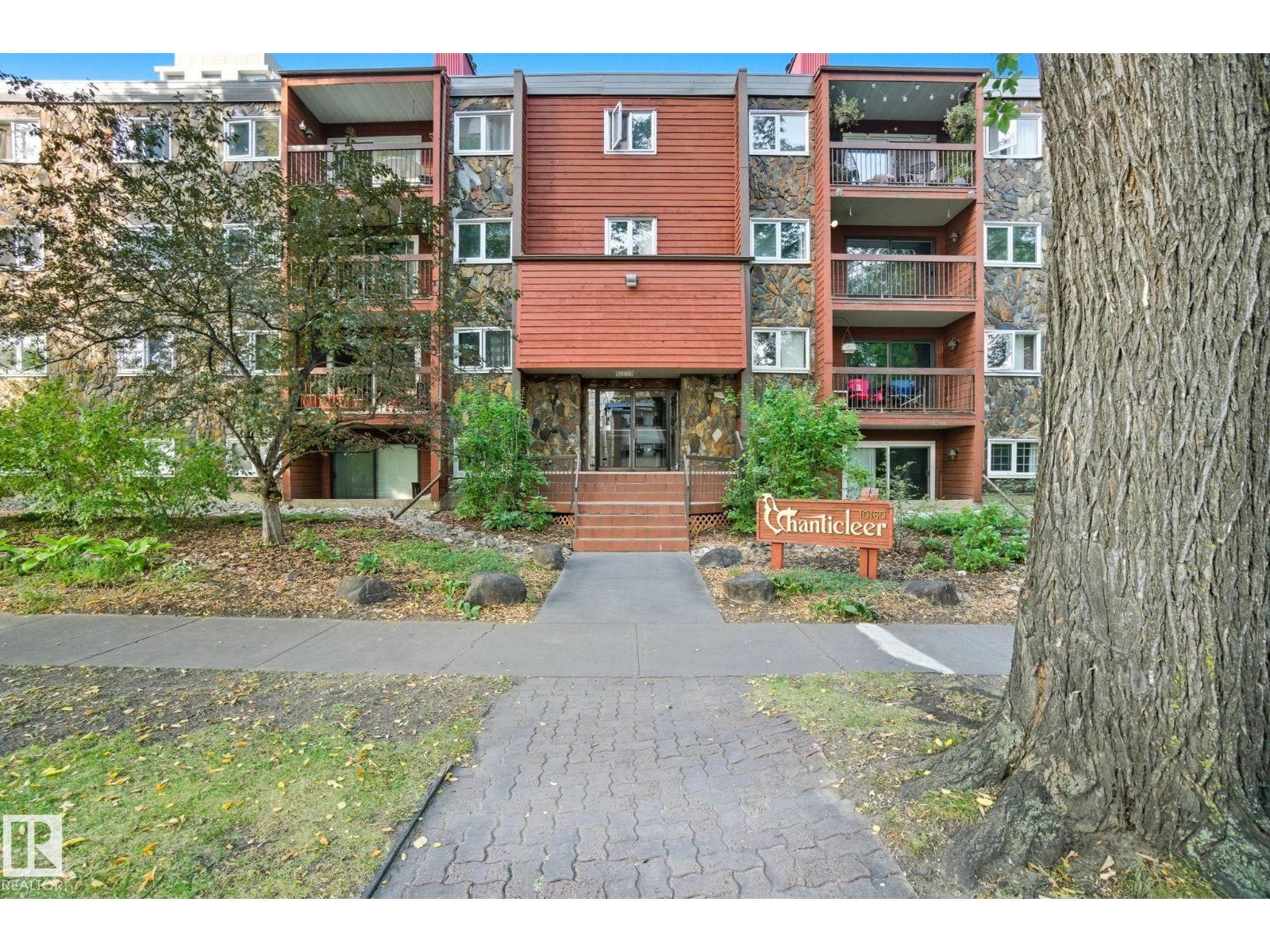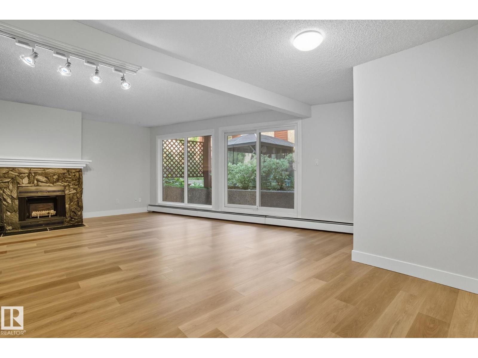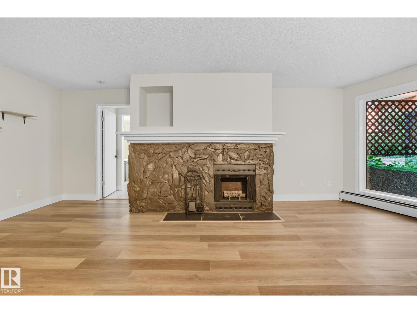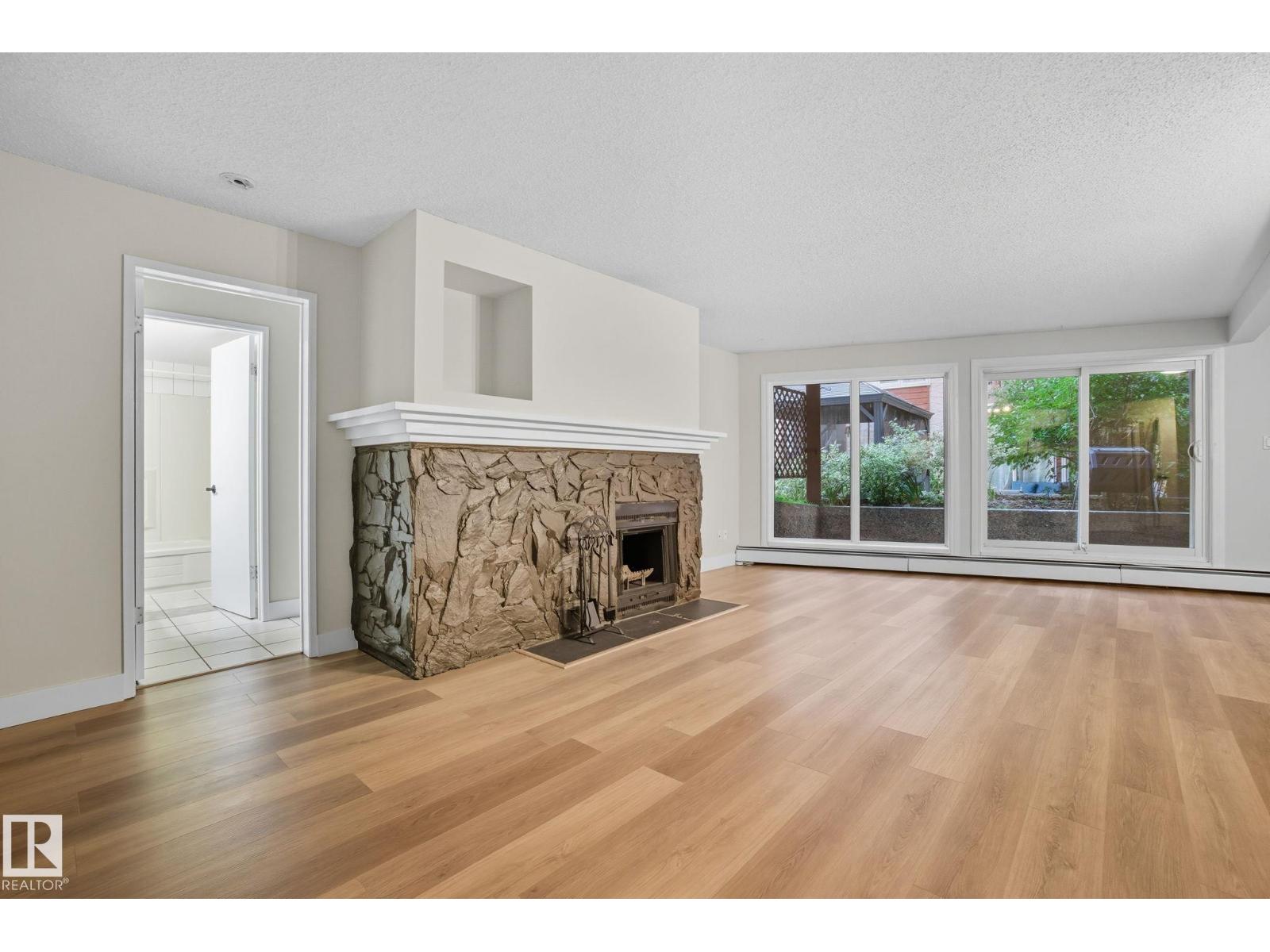Best Value in Central Edmonton! Welcome to the Chanticleer! This Beautifully renovated 2 bedroom home boasts over 1200 sq ft! Renovated kitchen with gorgeous white cabinetry, quartz countertops, SS appliances and new tile backsplash. The bedrooms are at separated by the massive living area at opposite ends of the home and each has it's own large closet and full bath. Situated on the ground floor for ease of access, the unit is private and secure as it faces the serene central courtyard, with access from both the main living area and the bedroom with huge patio doors. Numerous Additional upgrades include new vinyl flooring, light fixtures,a timeless and cozy wood-burning fireplace and new paint throughout. Well-managed complex offers underground parking, in-suite laundry and plenty of storage including a locker in the parkade. This spacious unique home has no neighboring unit on either side and is located in one of the nicest pockets of downtown our city has to offer. Quiet building allows 1 cat per suite (id:63190)