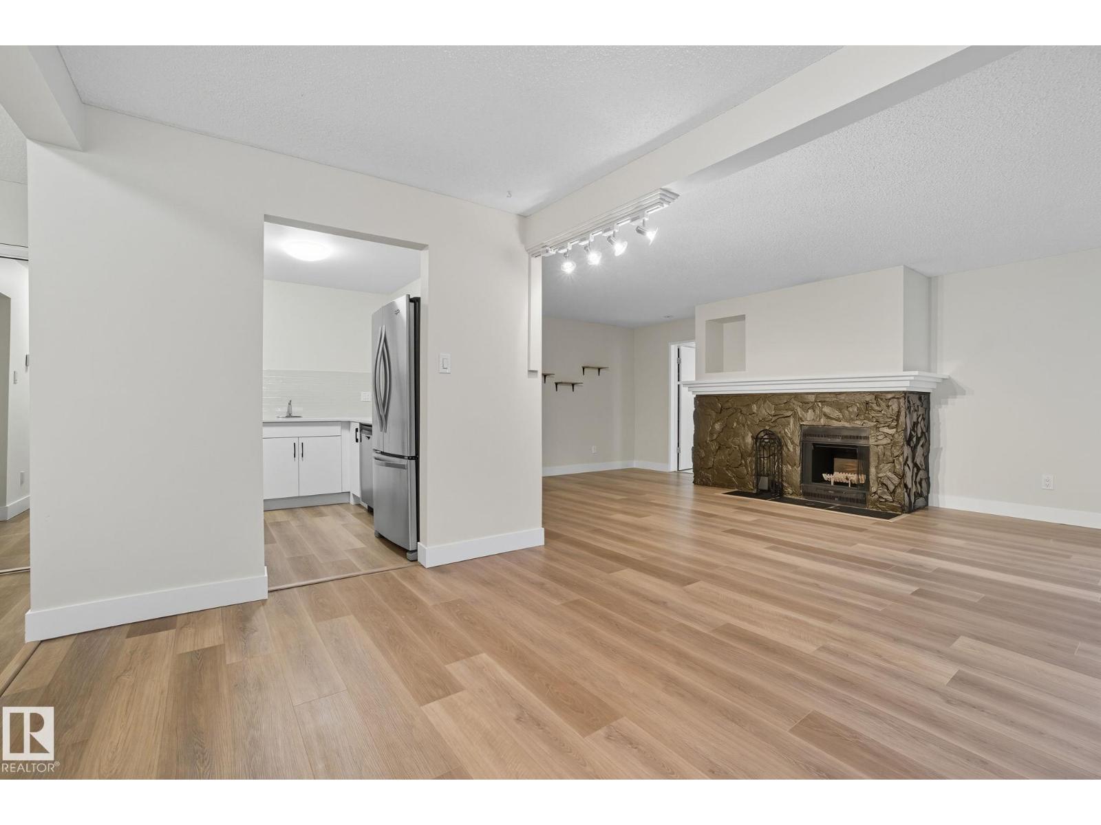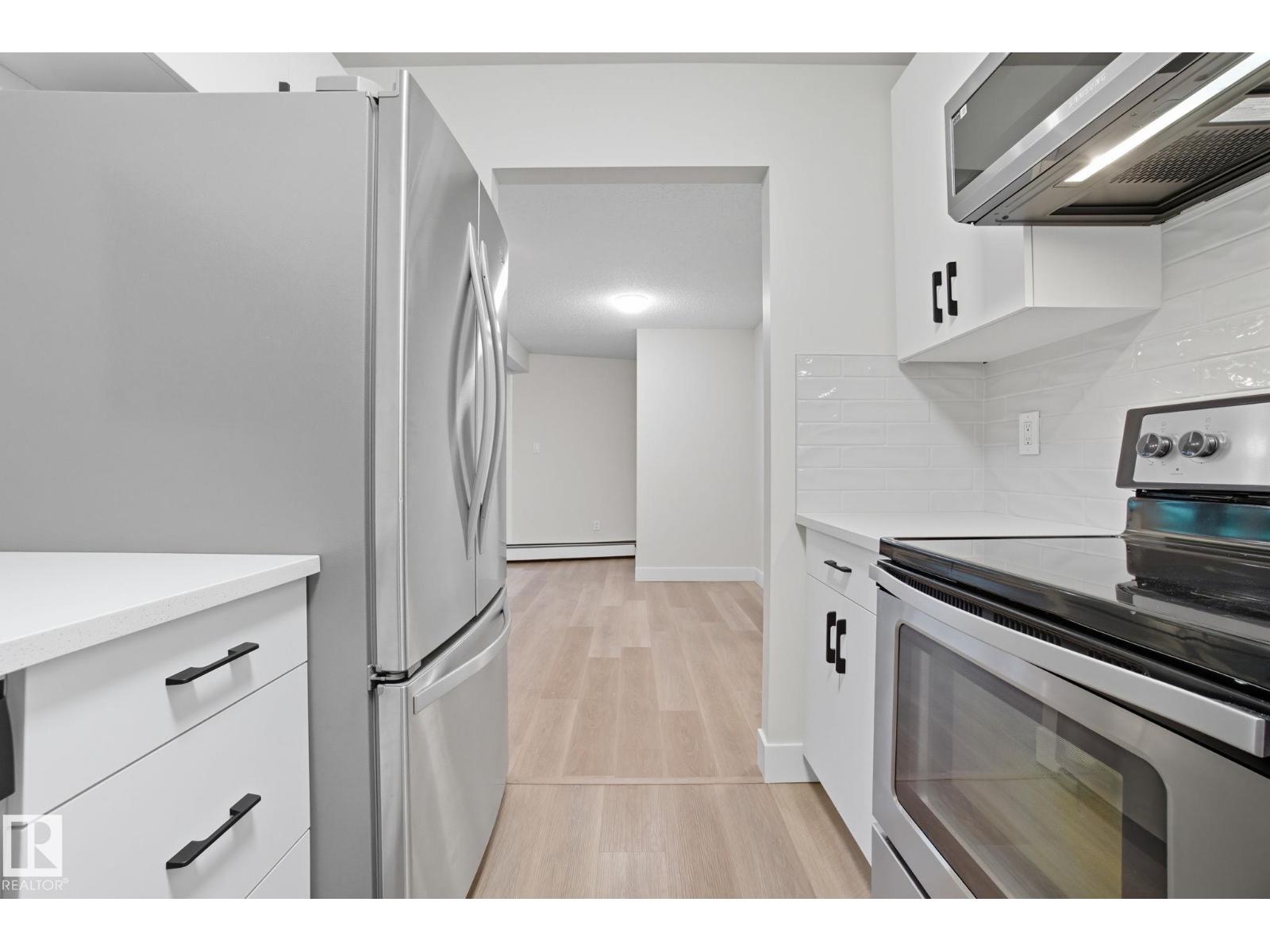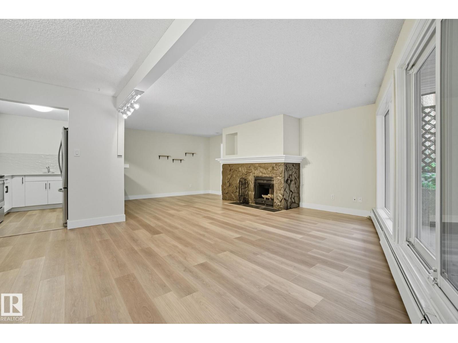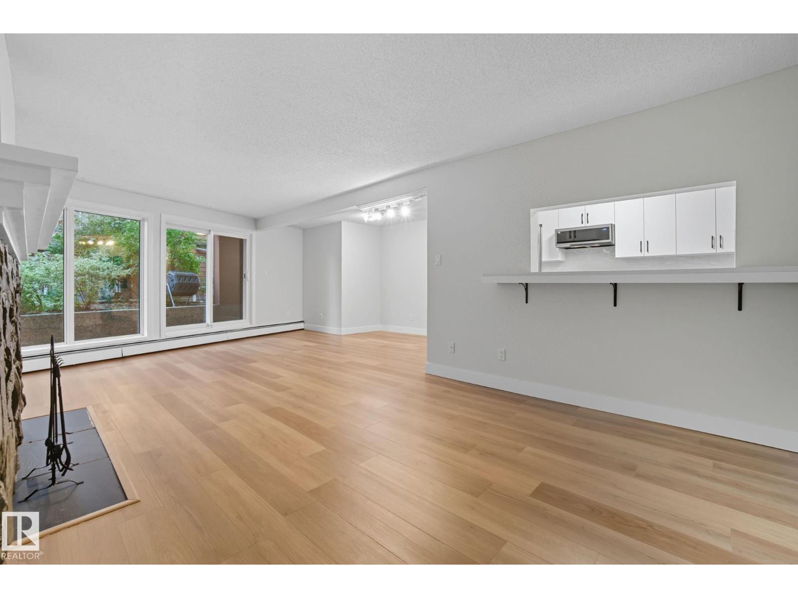 Best Value in Central Edmonton! Welcome to the Chanticleer! This Beautifully renovated 2 bedroom home boasts over 1200 sq ft! Renovated kitchen with gorgeous white cabinetry, quartz countertops, SS appliances and new tile backsplash. The bedrooms are at separated by the massive living area at opposite ends of the home and each has it's own large closet and full bath. Situated on the ground floor for ease of access, the unit is private and secure as it faces the serene central courtyard, with access from both the main living area and the bedroom with huge patio doors. Numerous Additional upgrades include new vinyl flooring, light fixtures,a timeless and cozy wood-burning fireplace and new paint throughout. Well-managed complex offers underground parking, in-suite laundry and plenty of storage including a locker in the parkade. This spacious unique home has no neighboring unit on either side and is located in one of the nicest pockets of downtown our city has to offer. Quiet building allows 1 cat per suite (id:63190)