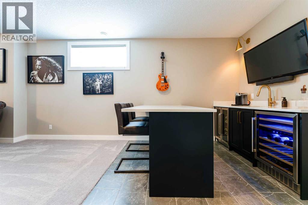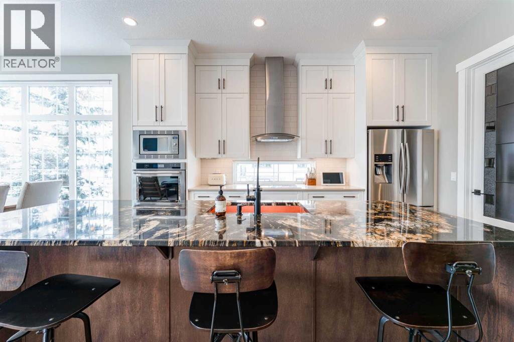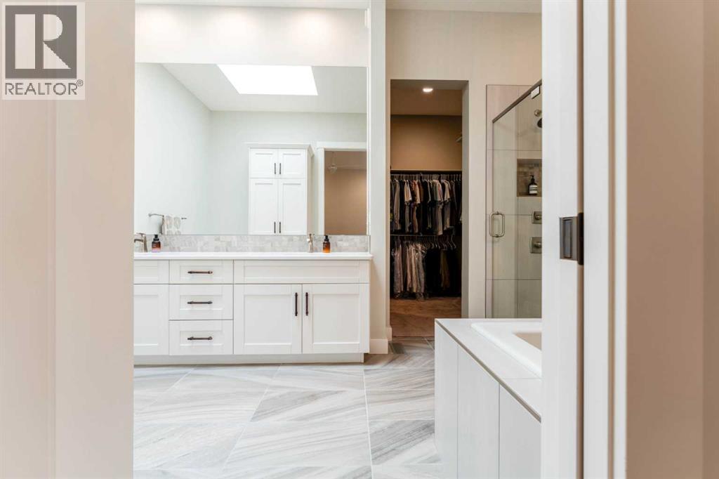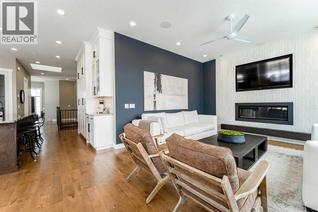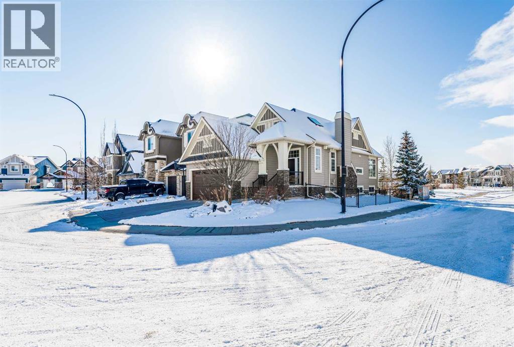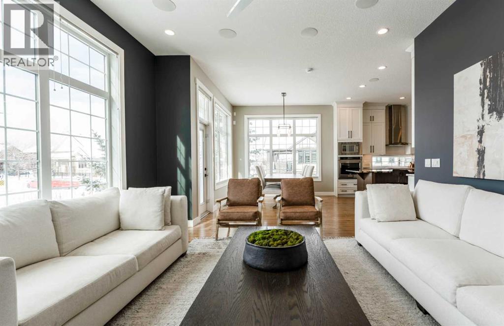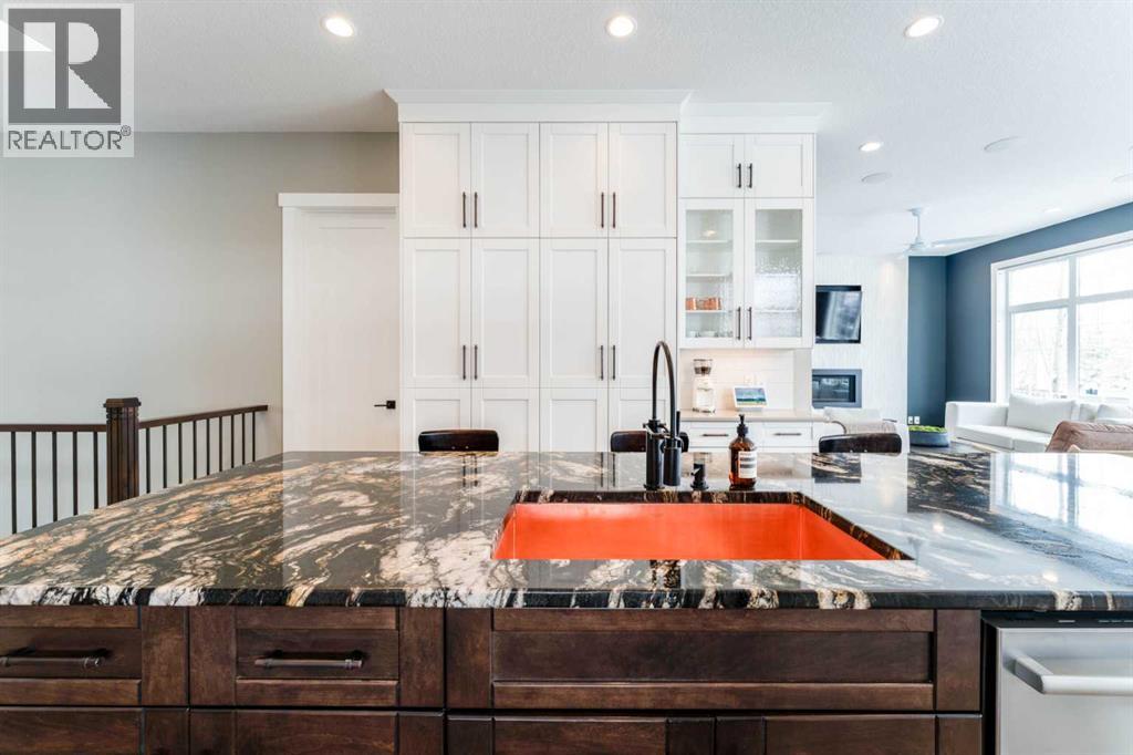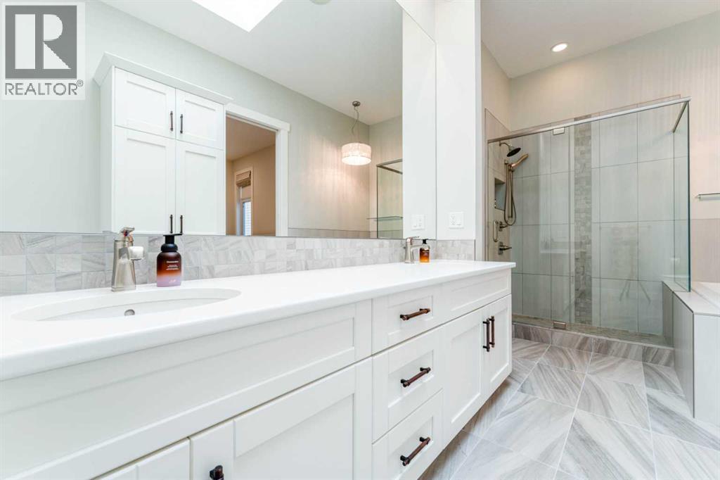 This beautifully crafted custom bungalow offers the perfect blend of modern elegance and thoughtful design, ideally located in the highly sought-after community of Coopers Crossing. Situated on a premium lot backing onto a park, and pathways with water features. This home provides both privacy and exceptional outdoor access. Flooded with natural light, the main level features expansive windows, two large skylights, and stylish upgraded lighting throughout. The open-concept layout is enhanced by 10’ ceilings, engineered hardwood flooring, a neutral colour palette, and a welcoming spacious entry. The living room is a true focal point, highlighted by a floor-to-ceiling feature wall with modern tile and a sleek linear fireplace. The adjacent dining area flows seamlessly into the chef-inspired kitchen, complete with granite and quartz countertops, a copper sink, a large central island, high-end appliances including an induction cooktop, and an abundance of custom cabinetry and pantry space. From here, step out to the beautifully landscaped backyard—perfect for entertaining or relaxing in your own private oasis. The primary suite is designed as a retreat, featuring a spa-like ensuite with skylight, dual sinks, quartz vanity, soaker tub, oversized glass and tile shower, and a walk-through closet with direct access to the laundry room. A convenient 2-piece powder room completes the main floor. The fully developed basement offers exceptional additional living space, including a large media/family room, a versatile office or bedroom with custom glass walls, a spacious bedroom, a full 4-piece bathroom, and ample storage room. Additional highlights include a multi-zone Sonos sound system, upgraded front door, phantom screens, exterior programmable lights, and beautiful exterior stone detailing. The garage is fully equipped with an upgraded door, side-mount opener, 220V power, and built-in metal cabinetry, and additional storage features. Outside, the private yard features profe ssional landscaping, a composite deck, custom built wood Pergola, and tranquil views—ideal for summer enjoyment. All of this, just moments from Discovery Park, expansive pathway systems, schools, shopping and a wide range of amenities. (id:63190)
