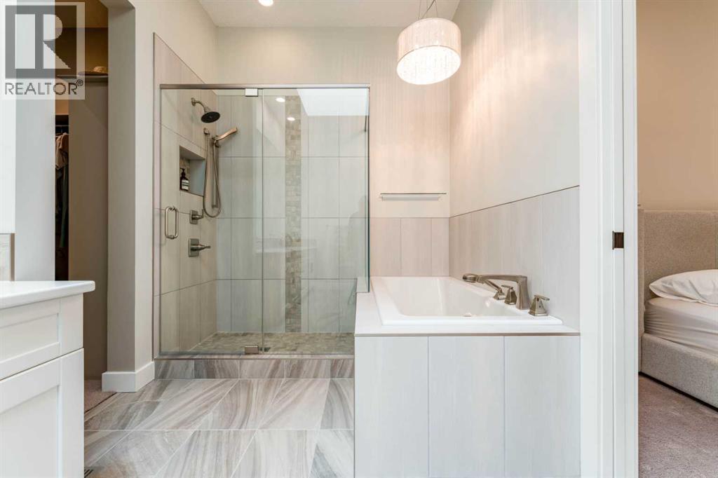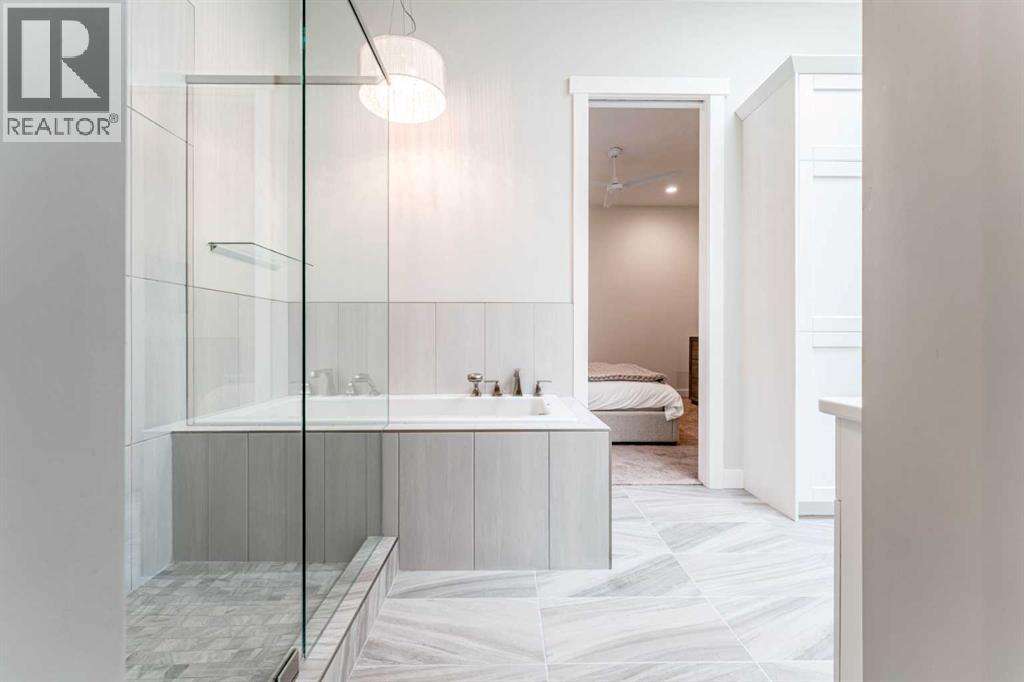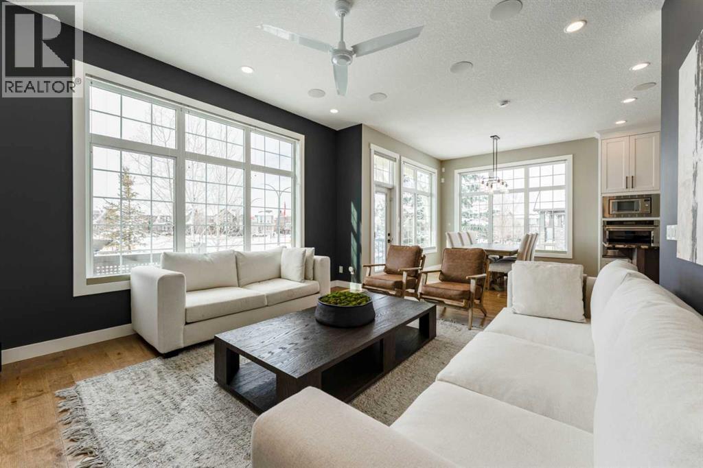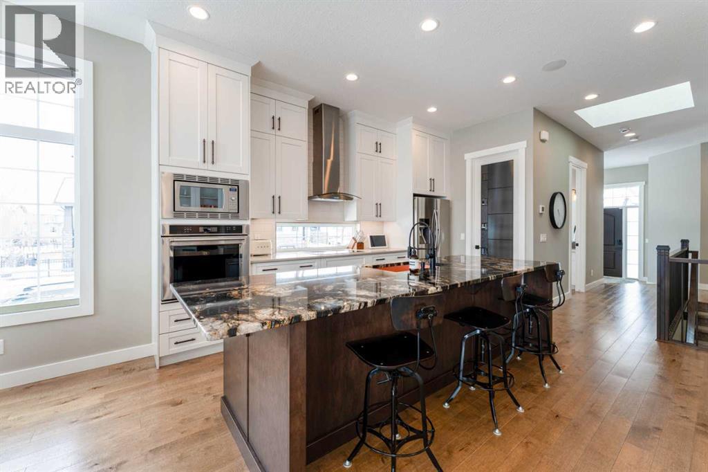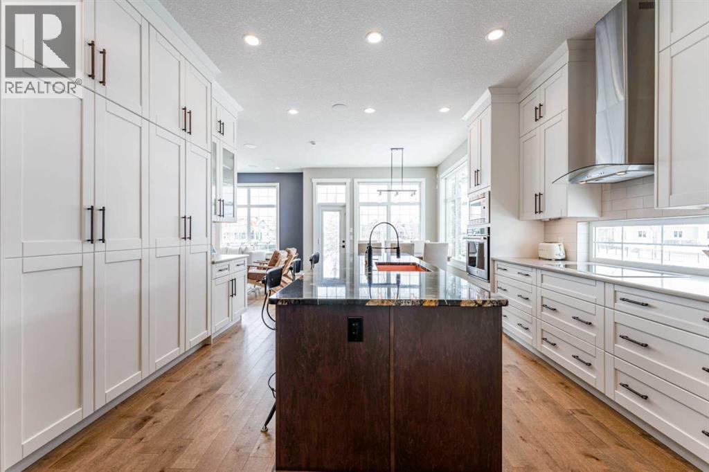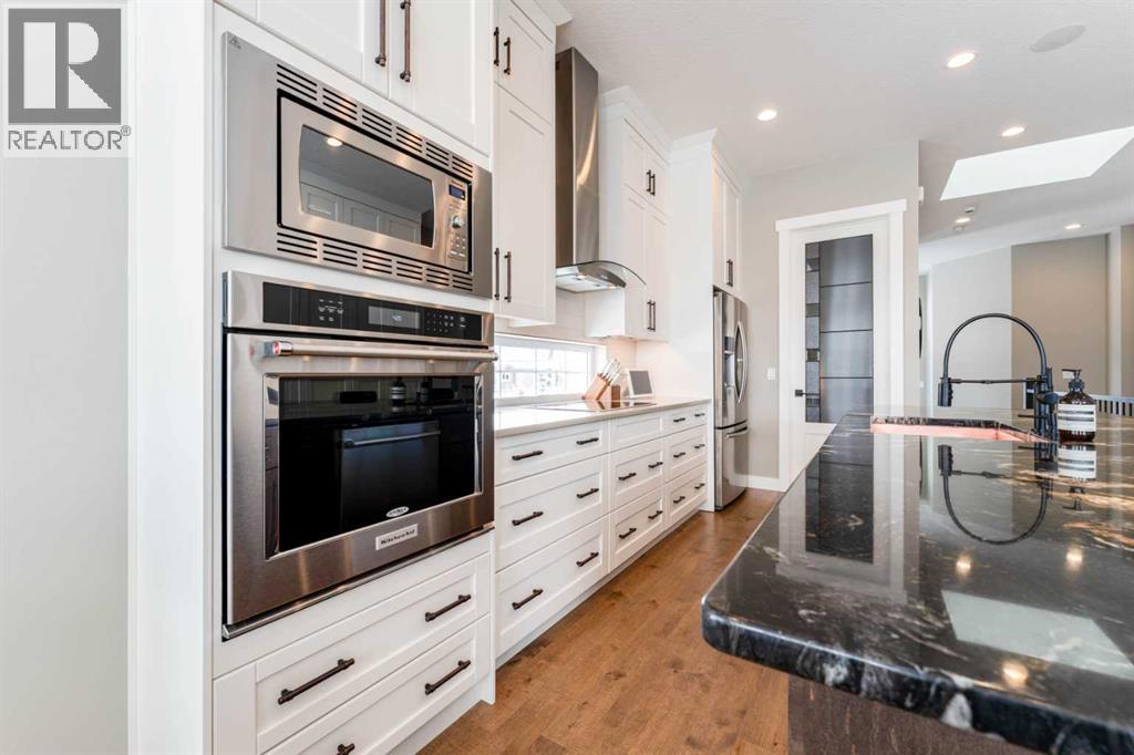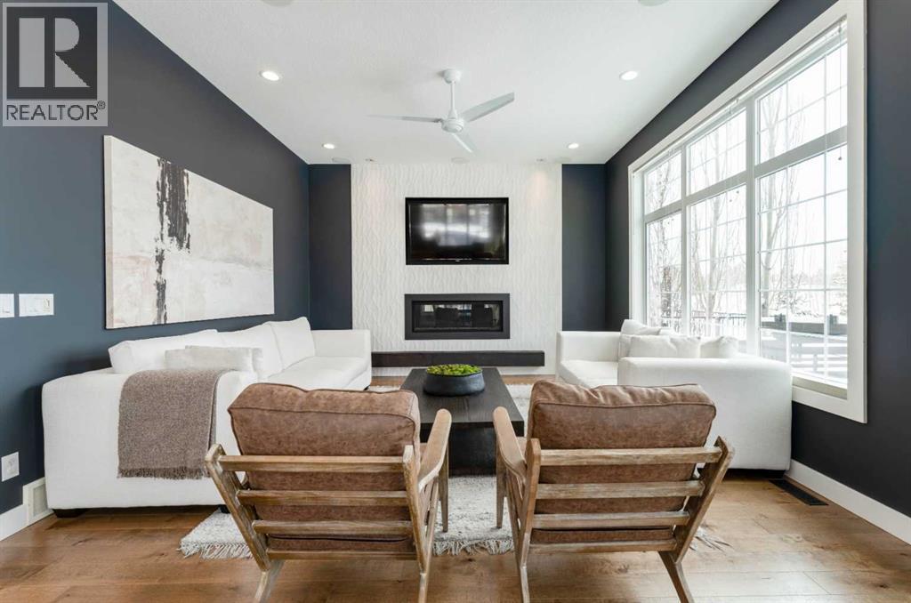 This beautifully crafted custom bungalow offers the perfect blend of modern elegance and thoughtful design, ideally located in the highly sought-after community of Coopers Crossing. Situated on a premium lot backing onto a park, and pathways with water features. This home provides both privacy and exceptional outdoor access. Flooded with natural light, the main level features expansive windows, two large skylights, and stylish upgraded lighting throughout. The open-concept layout is enhanced by 10’ ceilings, engineered hardwood flooring, a neutral colour palette, and a welcoming spacious entry. The living room is a true focal point, highlighted by a floor-to-ceiling feature wall with modern tile and a sleek linear fireplace. The adjacent dining area flows seamlessly into the chef-inspired kitchen, complete with granite and quartz countertops, a copper sink, a large central island, high-end appliances including an induction cooktop, and an abundance of custom cabinetry and pantry space. From here, step out to the beautifully landscaped backyard—perfect for entertaining or relaxing in your own private oasis. The primary suite is designed as a retreat, featuring a spa-like ensuite with skylight, dual sinks, quartz vanity, soaker tub, oversized glass and tile shower, and a walk-through closet with direct access to the laundry room. A convenient 2-piece powder room completes the main floor. The fully developed basement offers exceptional additional living space, including a large media/family room, a versatile office or bedroom with custom glass walls, a spacious bedroom, a full 4-piece bathroom, and ample storage room. Additional highlights include a multi-zone Sonos sound system, upgraded front door, phantom screens, exterior programmable lights, and beautiful exterior stone detailing. The garage is fully equipped with an upgraded door, side-mount opener, 220V power, and built-in metal cabinetry, and additional storage features. Outside, the private yard features profe ssional landscaping, a composite deck, custom built wood Pergola, and tranquil views—ideal for summer enjoyment. All of this, just moments from Discovery Park, expansive pathway systems, schools, shopping and a wide range of amenities. (id:63190)