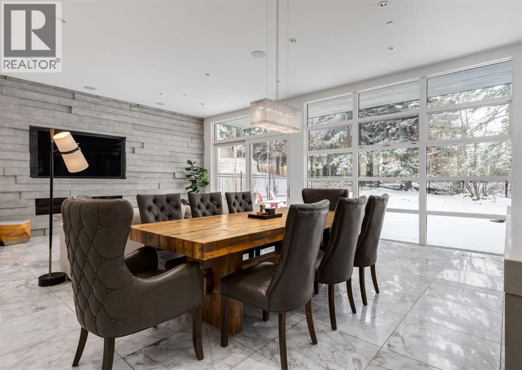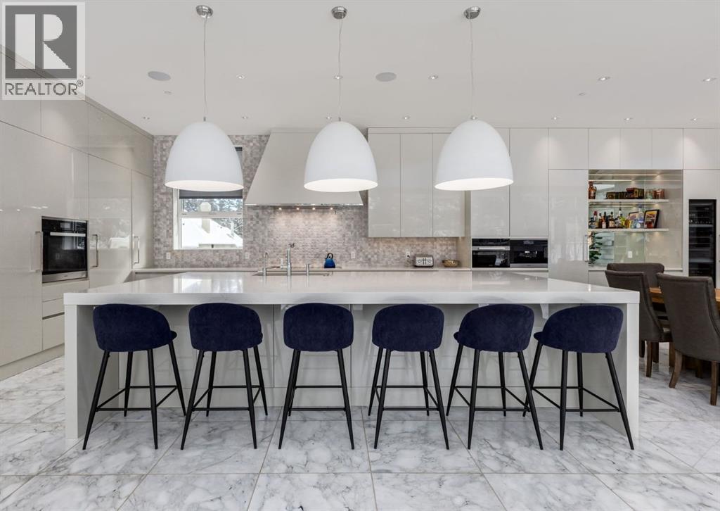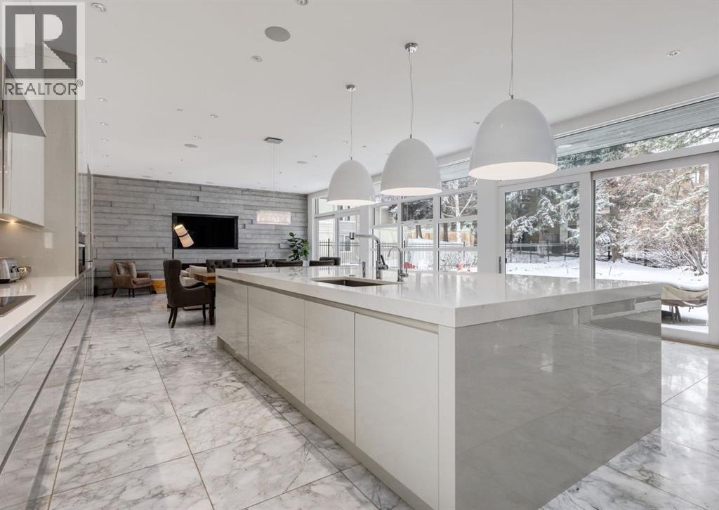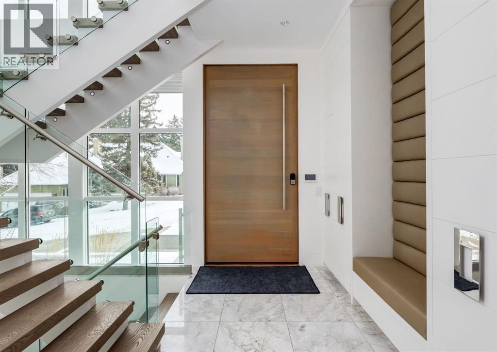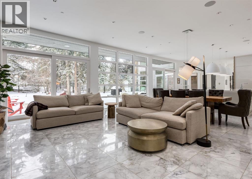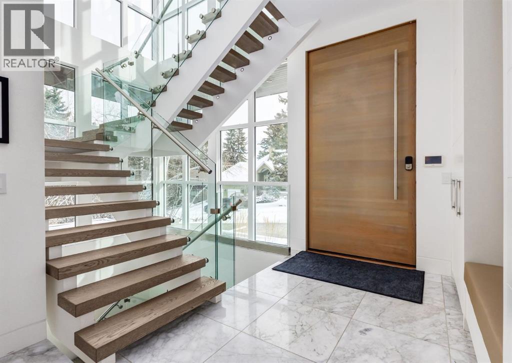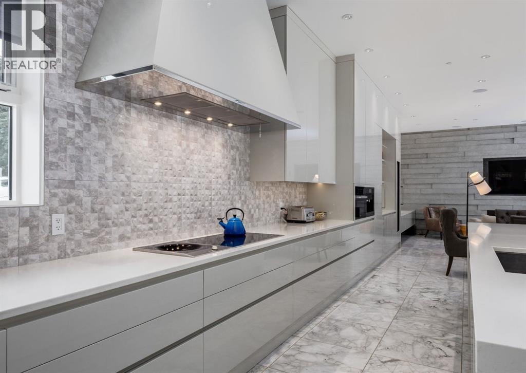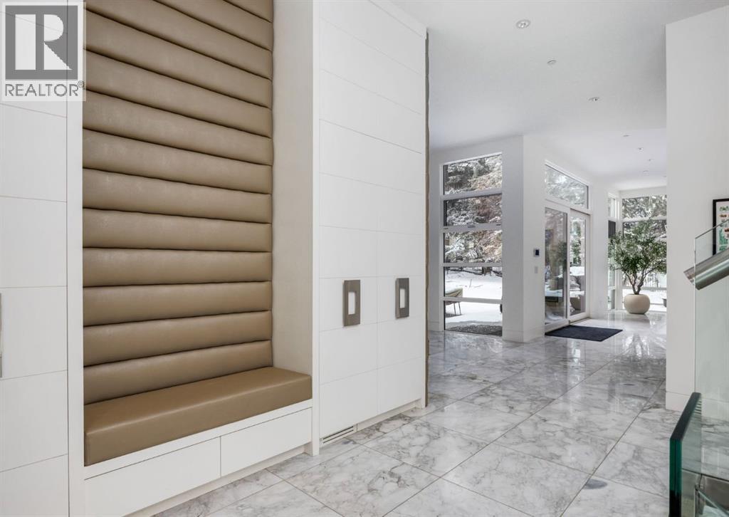 Stunning modern estate offering a rare combination of architectural excellence, elevated craftsmanship, and thoughtfully designed family living, ideally situated on a quiet cul-de-sac on over a quarter acre in the prestigious community of Pump Hill. Built in 2016, this remarkable legacy home was designed by the award-winning Vancouver firm Stuart Howard Architects, with interiors by acclaimed designer Paul Lavoie, and constructed by Riverview Custom Homes. From the moment you arrive, the home makes a statement. An impressive 9-foot pivot door opens to a grand foyer with soaring ceilings, expansive walls of triple-pane windows, a dramatic open-riser staircase, dual closets, and a newly upholstered bench. Inside, 5,500 square feet of living space unfolds with light-filled rooms and seamless indoor-outdoor connections. The open-concept main level is designed for both elegant entertaining and comfortable everyday living. A stunning executive office features custom millwork and tranquil views of the surrounding trees. The living room is anchored by a sleek Ortal fireplace and heated marble flooring, creating a warm yet contemporary gathering space. At the heart of the home is a chef-inspired kitchen showcasing quartz countertops and a premium Miele appliance package, including 72" of panelled refrigeration, induction cooktop, dual dishwashers, wine fridge, and built-in coffee system—perfect for both casual family meals and sophisticated entertaining. Designed with families in mind, the home offers five spacious bedrooms, each with its own ensuite, walk-in closet, and built-in desk space. Every bathroom is finished with timeless floor-to-ceiling marble and designer fixtures. Comfort is exceptional year-round thanks to hydronic in-floor heating on every level and two air conditioning units, while a fully integrated home automation system manages lighting, security, and built-in speakers throughout. The lower level features polished concrete floors and offers incredible fle xibility with a large guest bedroom, full gym, and spacious recreation room. A massive mudroom connects to the attached heated triple garage, providing abundant storage for busy family life. Outside, the sunny WEST-facing backyard is a private retreat surrounded by mature trees, while the snowmelt driveway and front walkway ensure effortless winters. Located just minutes from Glenmore Reservoir and Rockyview General Hospital, this home offers the tranquility of an established neighborhood with convenient access to top amenities, parks, and pathways. A rare opportunity to own a truly distinctive modern estate in one of Calgary’s most sought-after communities. Floor plans and a 3D tour are readily available, providing a glimpse into this dream home. (id:63190)