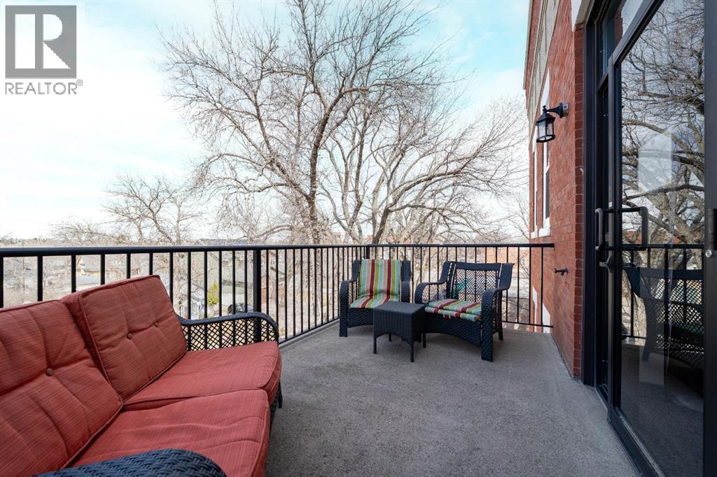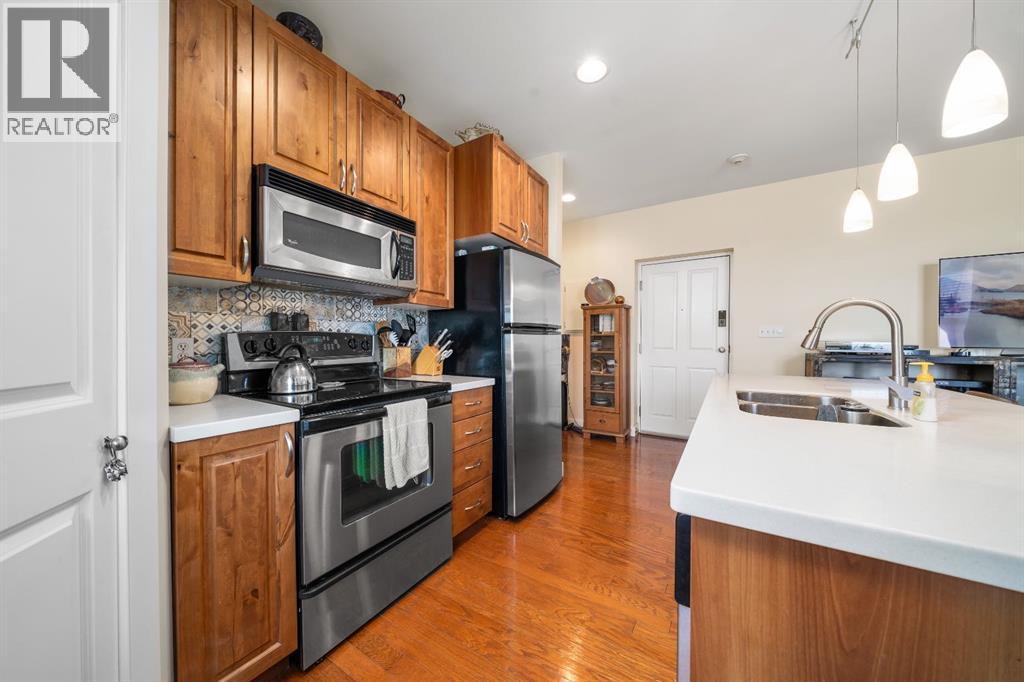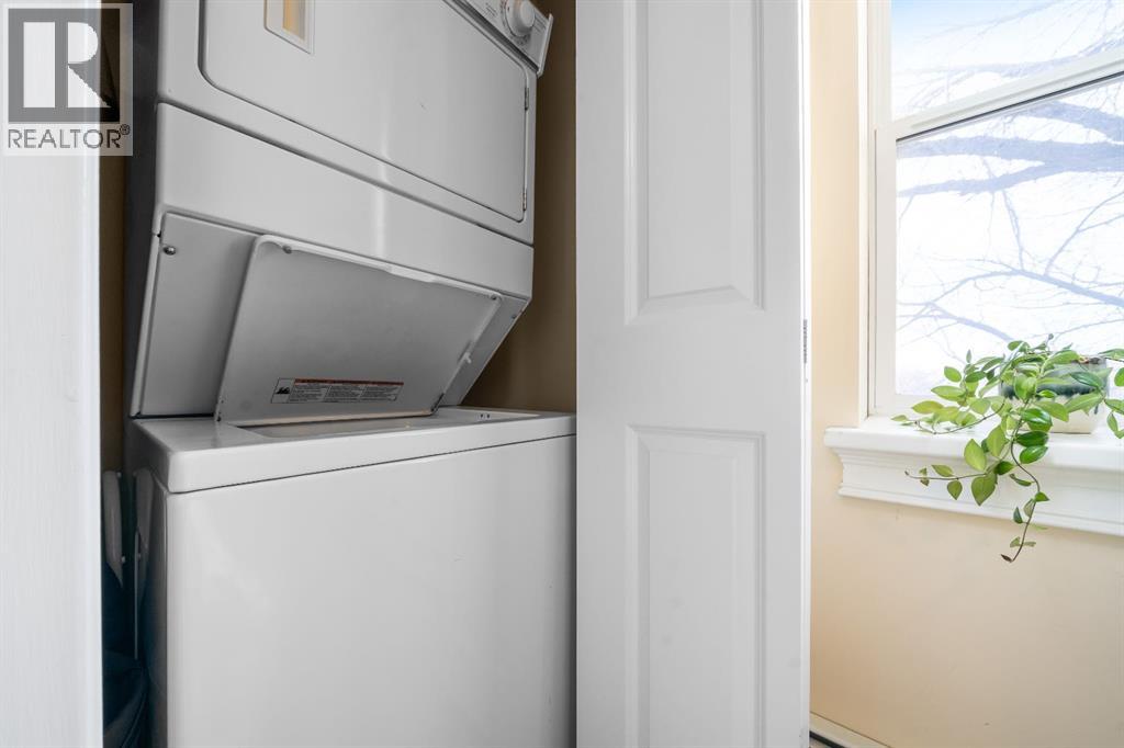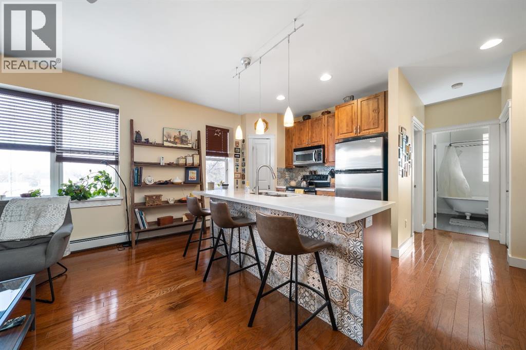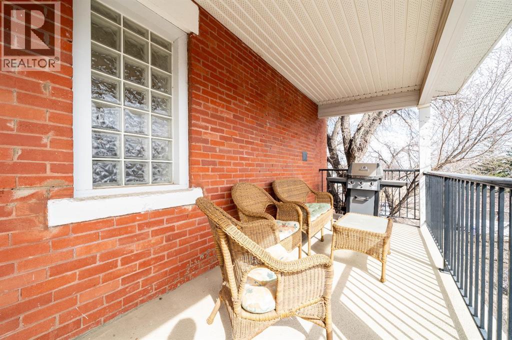 Welcome to this charming TOP-FLOOR one-bedroom, one-bathroom condo, perfectly situated in a beautiful historic brick building just minutes from downtown Medicine Hat! This well-maintained unit offers a quiet and private living experience, facing east to capture the basking morning sun, while staying comfortably cool during the summer months. Inside, you’ll find thoughtful upgrades and quality finishes throughout. The kitchen features stunning Corian Countertops installed in 2021, complemented by rich knotted alder cabinetry in a warm cinnamon stain, convenient pull-out drawers, corner pantry and stainless steel appliances. The open living space including the kitchen, living room and hallway are finished with hardwood flooring in a pecan stain, which are in impeccable condition. The bathroom adds a touch of character with a classic clawfoot tub, enhancing the condo’s cozy and inviting feel. The Primary Bedroom includes a closet and secondary closet with your in suite laundry. This unit is exceptionally well laid out, making the most of every square foot while maintaining a bright and welcoming atmosphere. Additional features include a dedicated storage unit in the basement, one assigned parking stall, and ample street parking for guests. Residents also enjoy shared front and back patios, with the rear patio offering a communal gas BBQ—perfect for relaxing or entertaining. Condo fees of $450/month include gas, water, building maintenance, and reserve fund contributions, making for easy and predictable ownership. Average electricity costs are only approximately $55/month, keeping overall expenses very affordable. This top-floor condo is ideal for a single professional, first-time homeowners, or someone looking to downsize. Cute, comfortable, and move-in ready, this is a fantastic opportunity to own a well-cared-for home in a desirable location on one of the ABCD Streets, close to downtown amenities. Book a showing today and see for yourself! (id:63190)