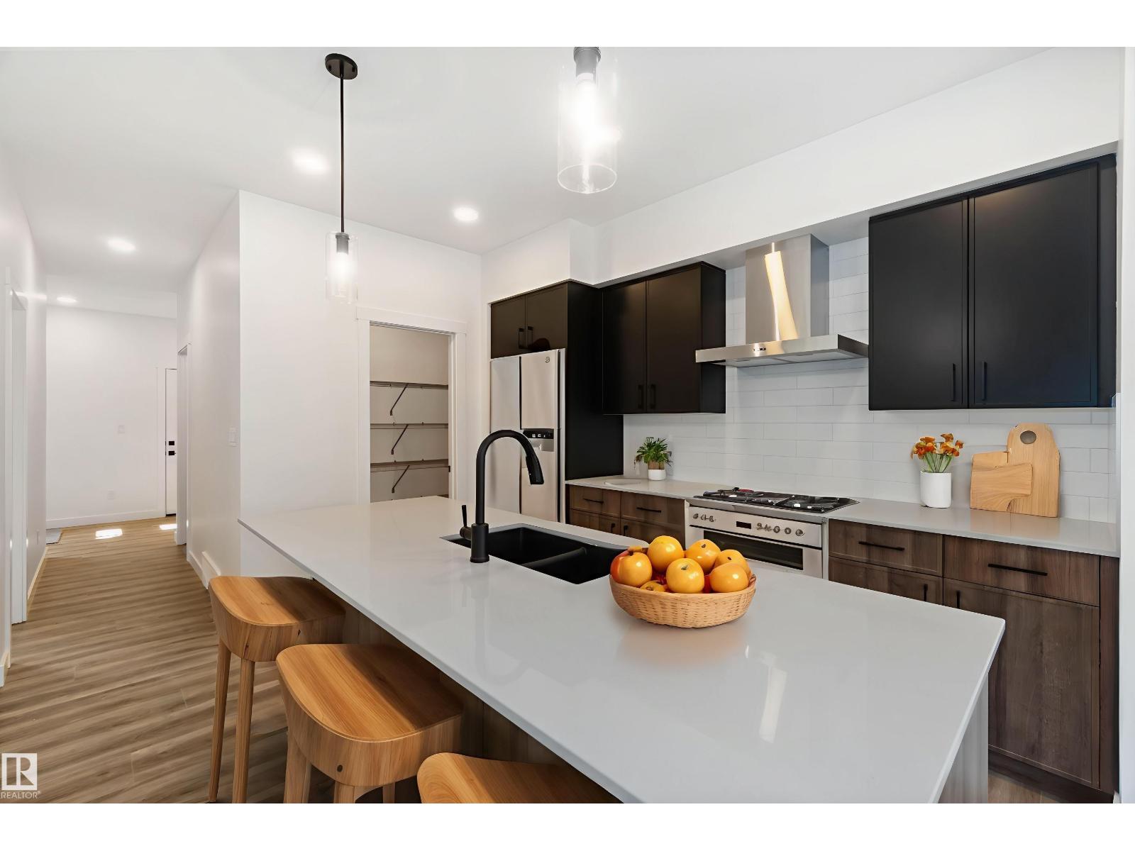Built by Sterling Homes, this well-designed home offers a flexible layout ideal for today’s families. Features include a double attached garage with floor drain, separate side entrance, 9-ft ceilings on the main and basement, and luxury vinyl plank flooring throughout the main floor. A welcoming foyer leads to a full 3-pc bath with a walk-in shower and a main-floor bedroom—perfect for guests or a home office. The open-concept nook, great room, and kitchen create a bright living space. The kitchen features an island with a flush eating ledge, a Silgranit undermount sink, a built-in microwave, pendant lighting, a chimney-style hood fan, a full-height tiled backsplash, soft-close cabinets, and a corner pantry. The great room includes an electric fireplace, large windows, and a patio door to the deck and backyard. Upstairs offers a primary suite with a walk-in closet and a 5-pc ensuite, bonus room, upper laundry, two additional bedrooms, and a full bath. Basement rough-ins included. (id:63190)
