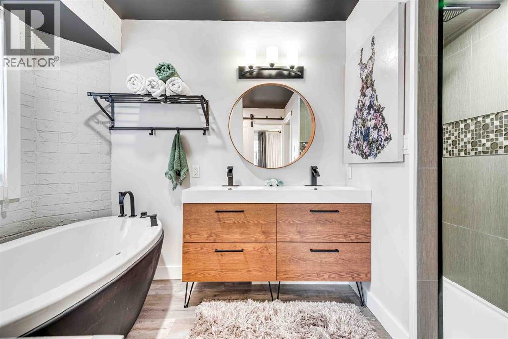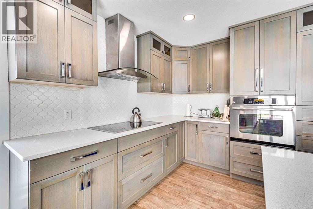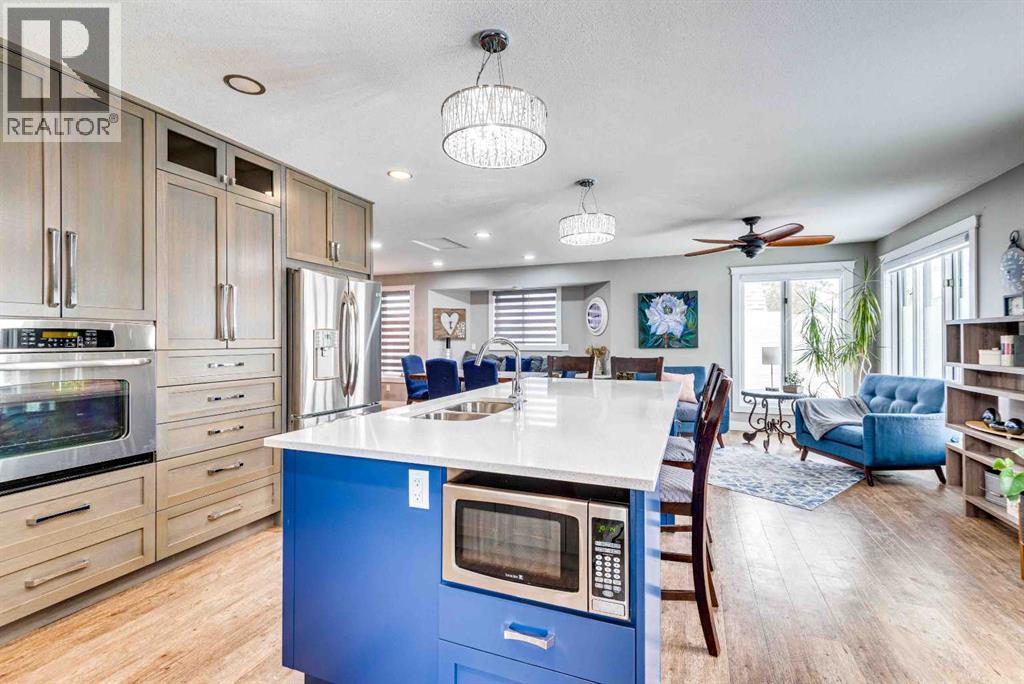 Discover the perfect blend of elegance, comfort, and craftsmanship at 211 4 Ave SE. From the moment you step through the welcoming foyer, this home invites you to slow down, gather, and enjoy the spaces designed for real living. The showpiece kitchen and dining area — complete with quartz surfaces, rich quarter-sawn oak cabinetry, a cozy wood-burning fireplace, and a generous island made for conversation — becomes the heart of the home. Upstairs, the serene primary suite offers a spa-like escape, while additional bedrooms provide room for family or guests. The lower level features a spacious living room, a dedicated office, and a high-function laundry room. The basement level includes the fourth bedroom, a rec room, a storage room, and a utility room — providing flexibility for guests, hobbies, or additional living space. Outside, the home continues to impress. The exterior is low-maintenance, finished in stucco with a beautiful natural stone fireplace and a rubber roof for long-lasting durability. There is triple off-street parking plus an oversized double garage. The fully fenced backyard is private and inviting, featuring mature trees and shrubs, a covered patio, built-in concrete planters, and a storage shed — perfect for outdoor living and gardening. (id:63190)