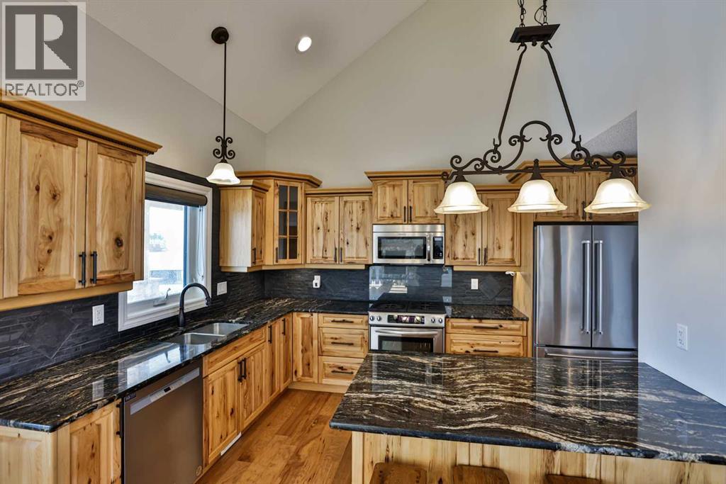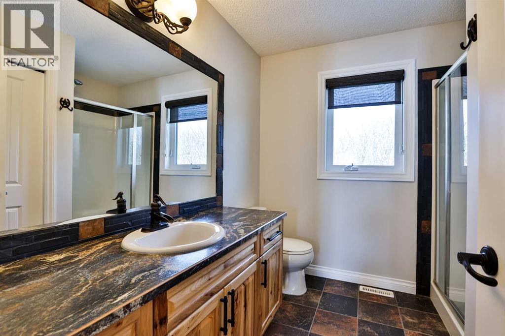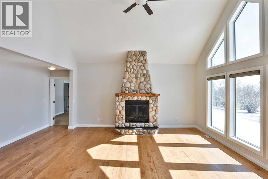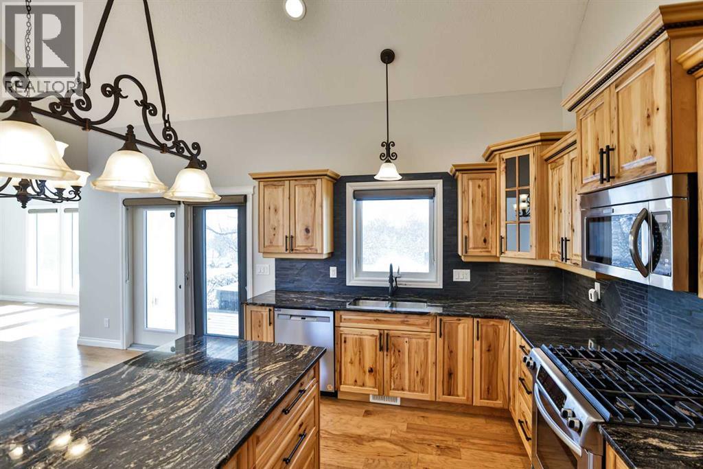 Welcome to this exceptional 20-acre hobby farm located just 9 km north of Mossleigh on Highway 24—perfectly set up for families, livestock, and those seeking the ideal balance of country living with convenient access to amenities. Schools, shopping, and services are all within approximately 30 minutes, with an easy commute to SE Calgary.The beautifully treed and private yard surrounds a stunning two-storey home offering 4,000 sq. ft. of developed living space. Recent updates include a fresh interior paint job and a fully developed basement completed in 2026, now featuring 6 bedrooms plus a den, providing flexibility for large families or multi-generational living.The main living space is a true showpiece, highlighted by a striking two-storey river rock stone fireplace that extends to the ceiling and is open to above from the second floor, anchoring the great room with warmth and character. Floor-to-ceiling windows and vaulted ceilings fill the home with natural light, while hand-scraped engineered hardwood flooring adds timeless appeal.The kitchen is both functional and inviting, featuring custom knotty hickory cabinetry, granite countertops, a slate backsplash, and a large central island. Stainless steel appliances include a gas cooktop with electric oven, along with a new fridge and dishwasher (2024). A spacious dining area seamlessly connects to the kitchen and living room, with direct access to the covered veranda, composite decking and built in hot tub (2024) perfect for enjoying expansive prairie views.The main floor also offers laundry/butler’s pantry with loads of cabinets, a office/den with patio access, and a convenient guest bathroom with glass shower. The primary suite provides a private retreat with a walk-in closet, soaker tub, glass shower, and separate water closet and even more storage.Upstairs features two large bedrooms and a full bathroom, while the newly completed basement offers additional 3 bedrooms, a full bath, and a large open family/r ec space with in-floor heat, future bar area, and cold storage room.This home is built for efficiency and comfort with triple-glazed windows, an ICF foundation, in-floor heating, and spray foam insulation. Additional updates include a new septic tank (2024) and well water tested in 2024 with excellent results.Outside, the property is exceptionally well-equipped for animals and rural living, featuring multiple shelters, barns, shops with power, and a new hydrant close to the garden, built in Richie waterer, metal gates on pens, and wood burning stove in shop. Complete with a heated triple attached garage and thoughtfully designed yard, this property offers a rare opportunity to own a turn-key acreage lifestyle.This is country living at its finest—space, privacy, and endless potential to grow! (id:63190)