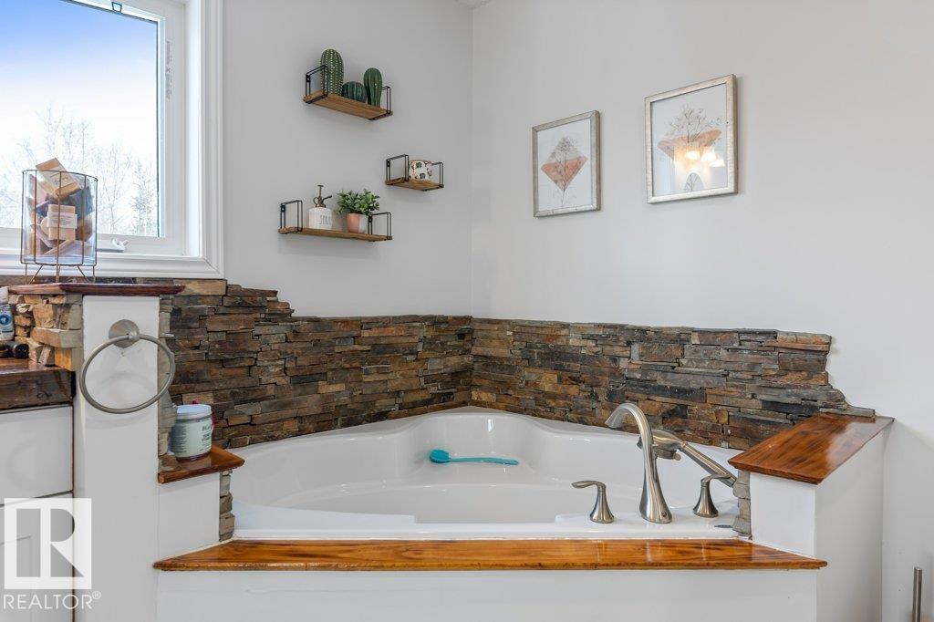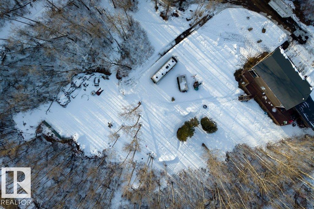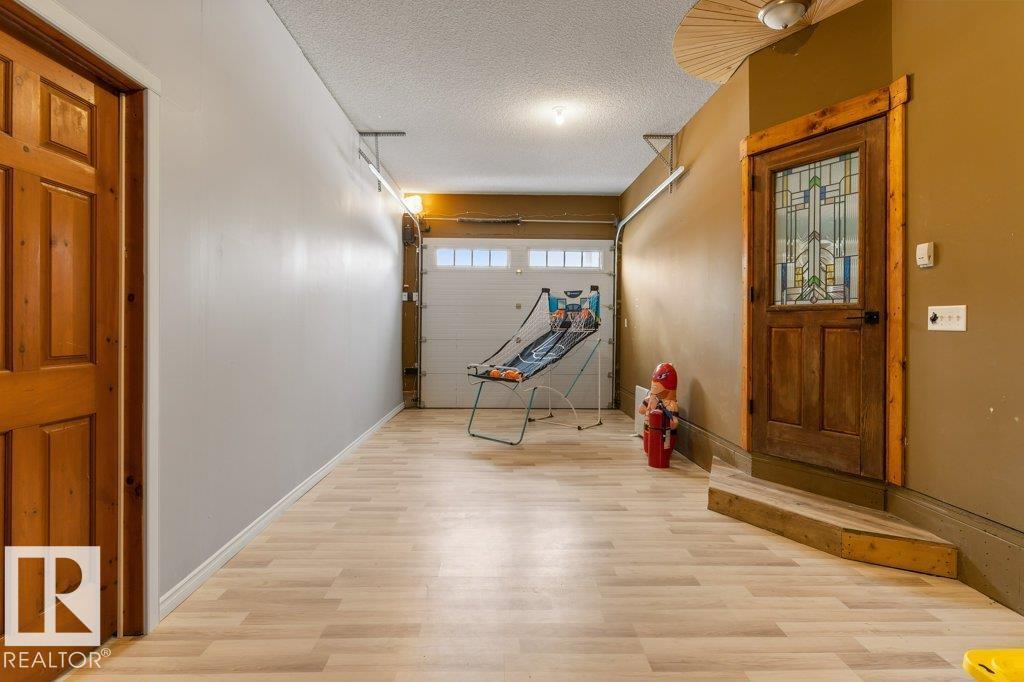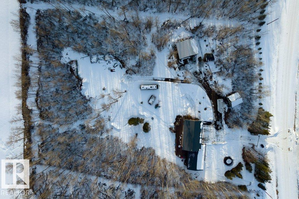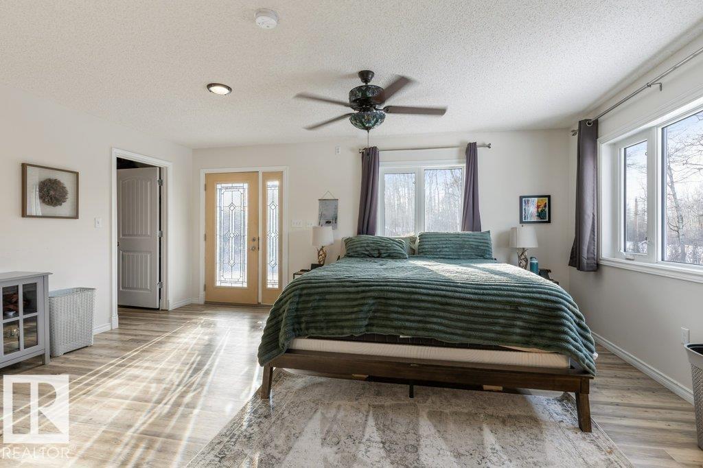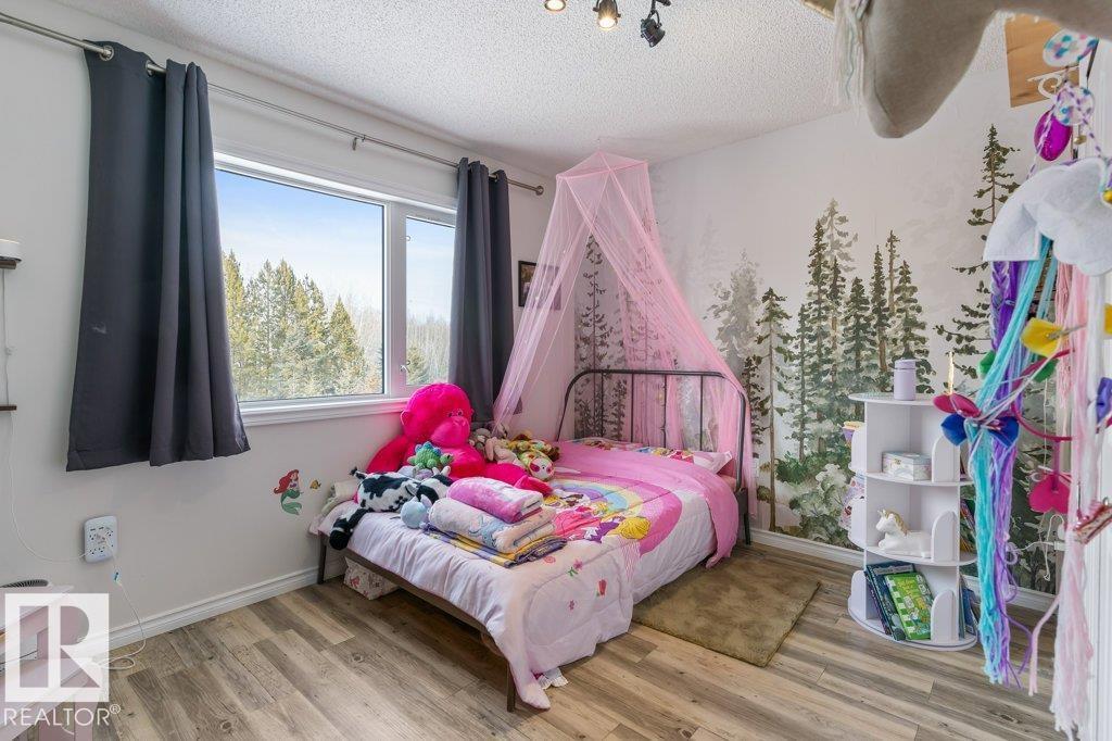 Fabulous, private 3.14 acre over 2400 sq. ft. 2 storey split with triple attached garage and huge SHOP. Just 4 minutes north of Highway 37 and only 30 minutes to Edmonton. This beautifully renovated 5-bedroom home offers 2 bdrms on the main and 3 upstairs, 2.5 baths , and convenient upper-level laundry. Upgrades include newer flooring, cabinets, windows, metal roof, and decks. The spacious primary suite features a private balcony and 4 pce ensuite. The original bungalow was taken to the studs and expanded in 2017 with a full second storey and triple attached heated garage with in-floor heat and 2 HE hydronic heaters. The impressive shop is equipped with Sol-Ray radiant tube heating and thick 7–8 inch concrete floors. The home and garage offer 200 amp service, with 100 amp to the shop. The treed yard provides privacy and plenty of space for family living and outdoor enjoyment. Exceptional country living at its finest! (id:63190)