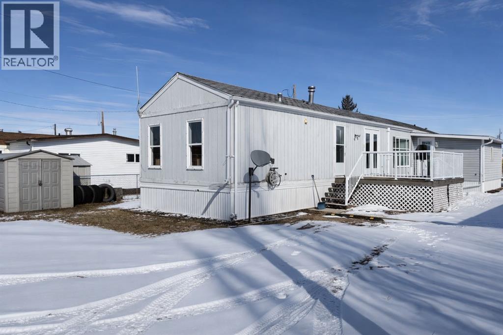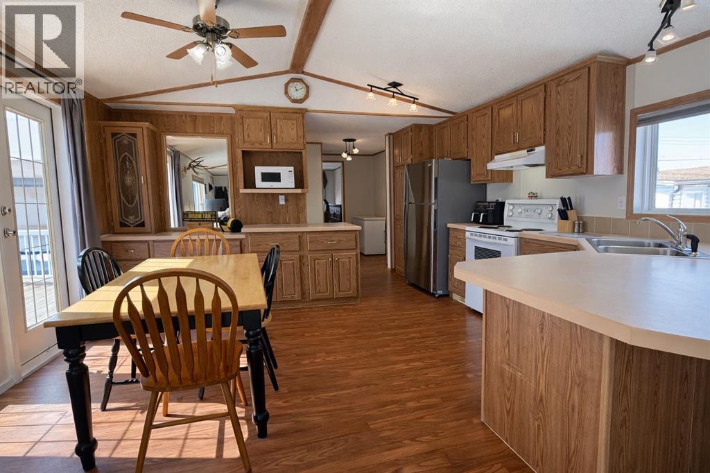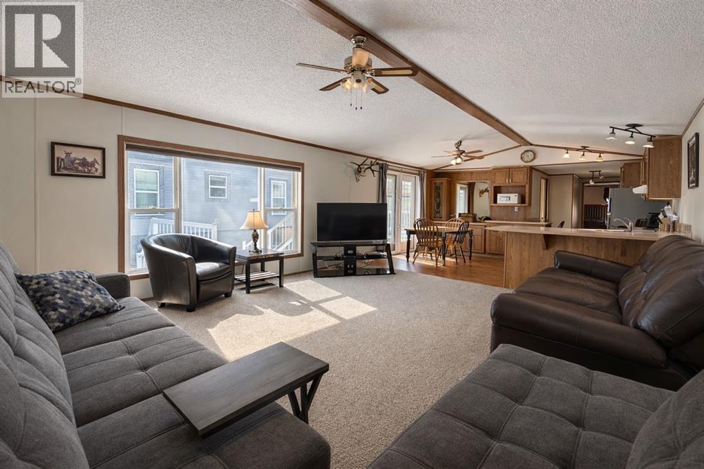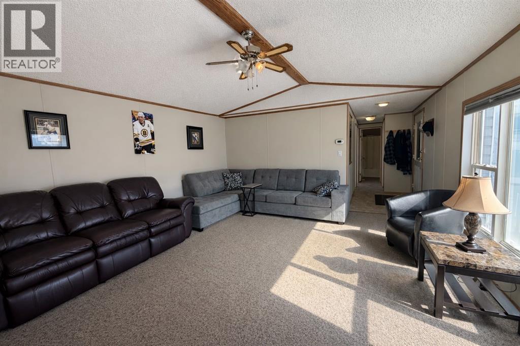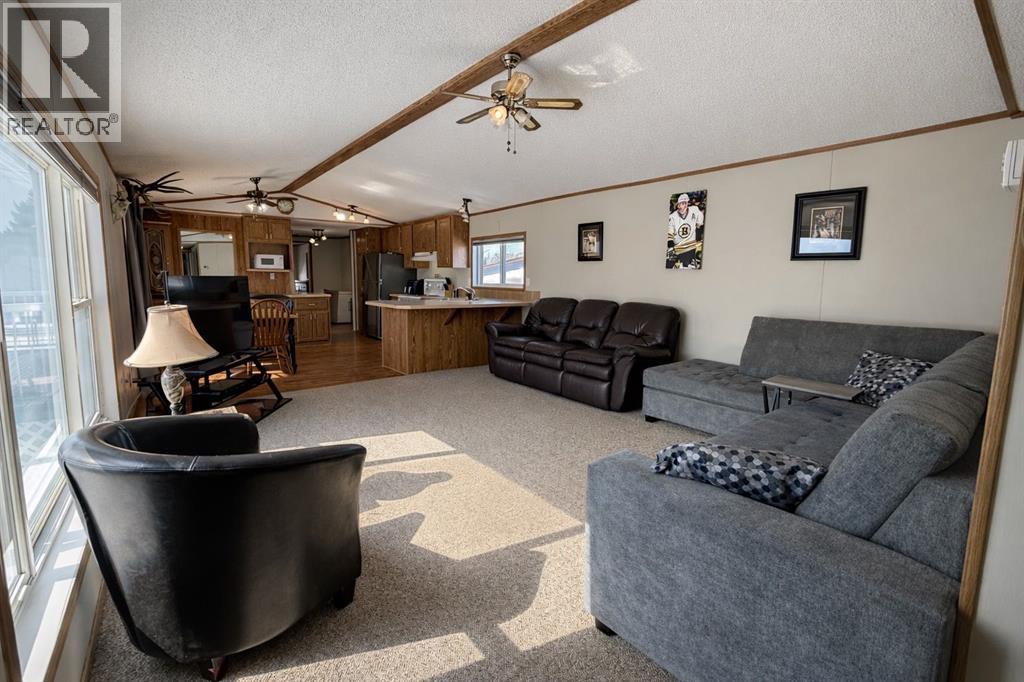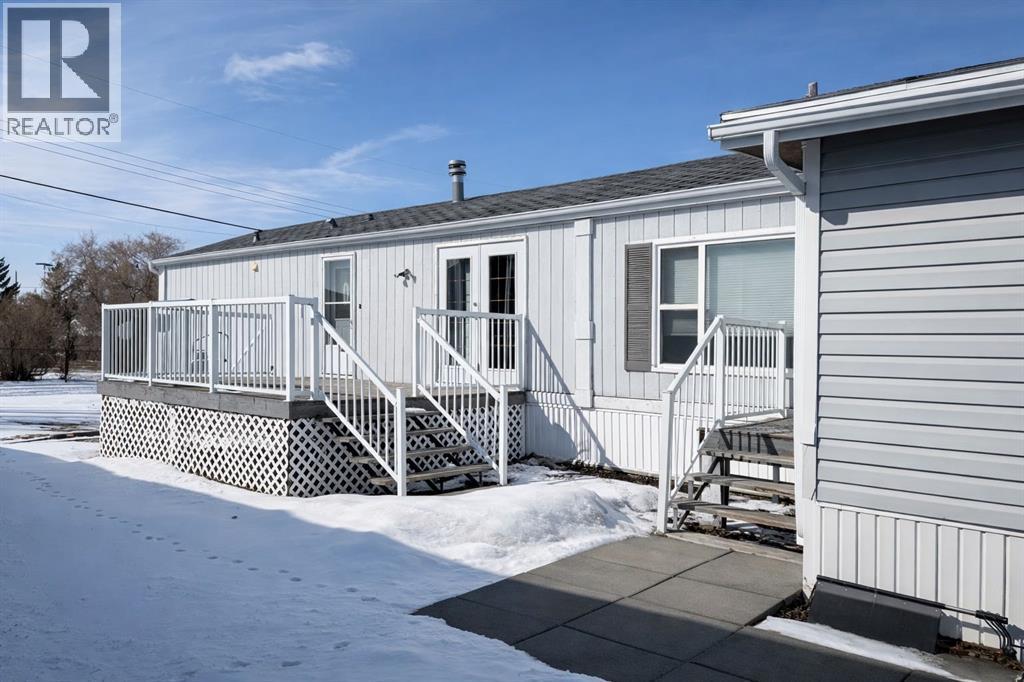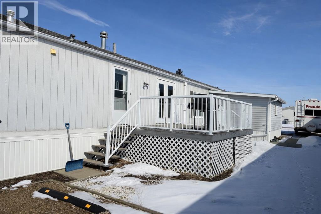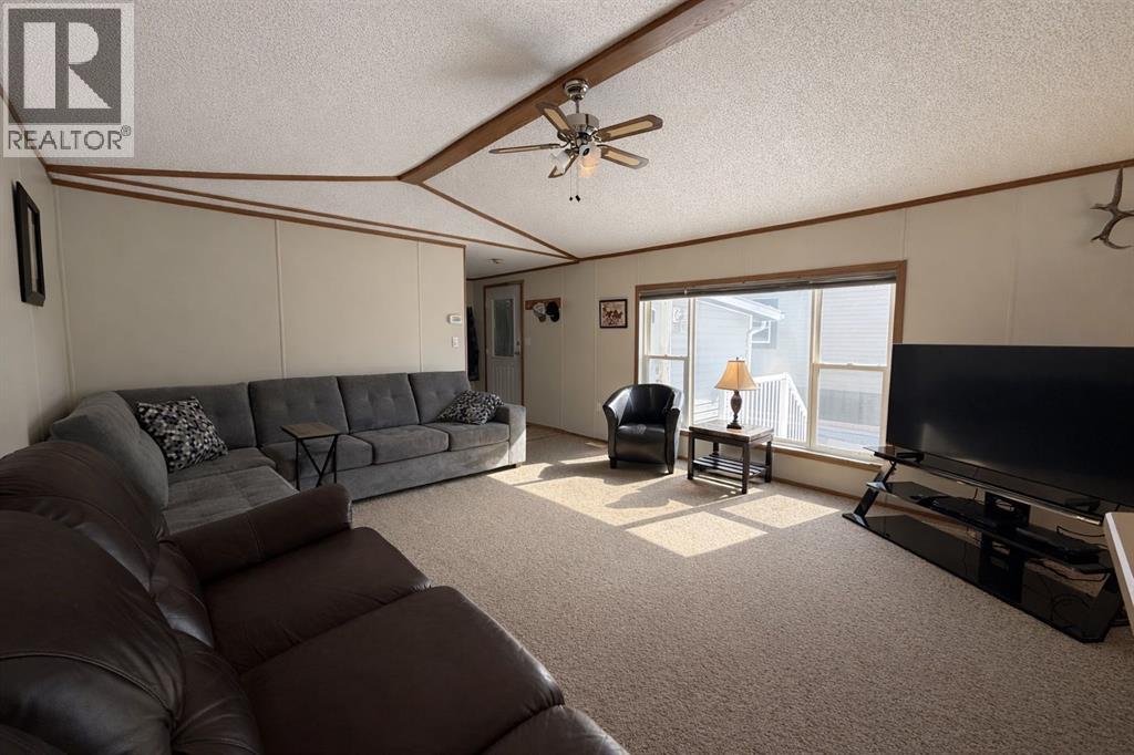 Welcome to this well-maintained mobile home in the quiet community of Edgerton, ideally located directly across from a park and playground with convenient sidewalks right out front. This property offers excellent functionality with a spacious heated front addition that serves as a dual-entry porch—perfect for coats, boots, and extra storage, keeping your main living space clean and organized year-round. Step inside to an inviting open-concept layout featuring vaulted ceilings that create a bright and airy feel throughout. The large living room is filled with natural light from a generous south-facing window and flows seamlessly into the dining area and kitchen, where you’ll find ample cupboard and counter space for everyday living. Patio doors off the dinning room provide direct access to the deck, making it easy to enjoy outdoor living. The home features a thoughtful layout with a rear entry that includes laundry and access to the back deck. The primary bedroom is privately situated and offers convenient access to a four-piece bathroom—creating a semi-ensuite feel—along with two windows that bring in plenty of natural light. Two additional bedrooms provide flexibility for family, guests, or a home office, including one with an oversized window that enhances the bright and welcoming atmosphere. A second four-piece bathroom serves as the main/guest bath. Outside, you’ll appreciate the aluminum-railed decks for low-maintenance enjoyment, as well as a rear parking pad with alley access for added convenience. A great opportunity for affordable living in a family-friendly location—just steps from green space and outdoor amenities. (id:63190)