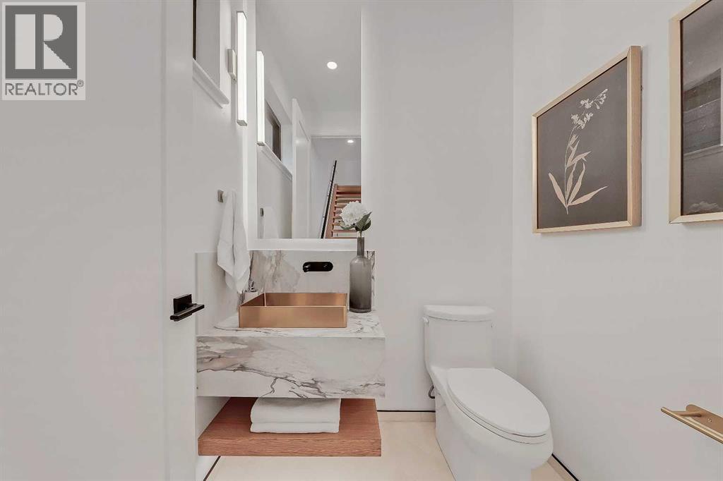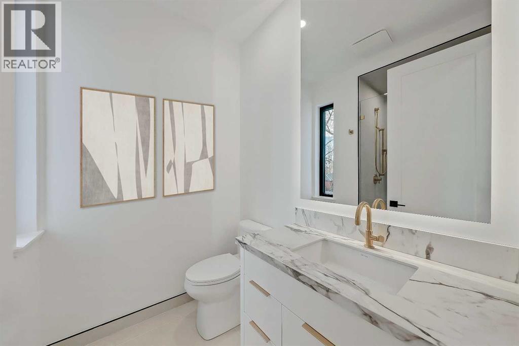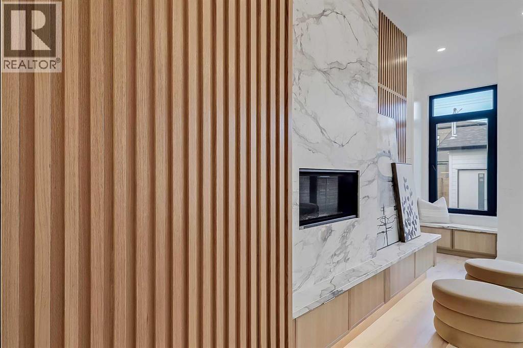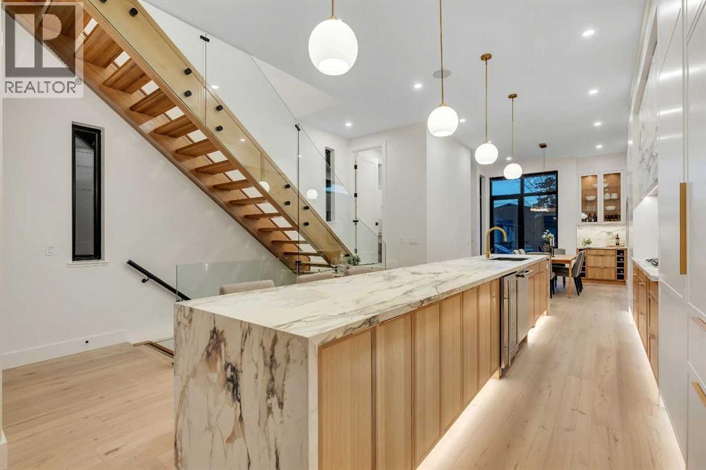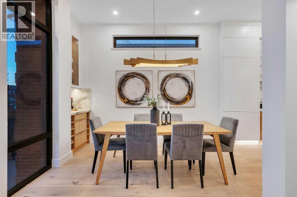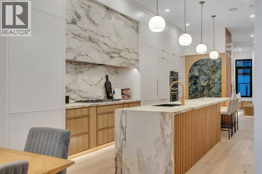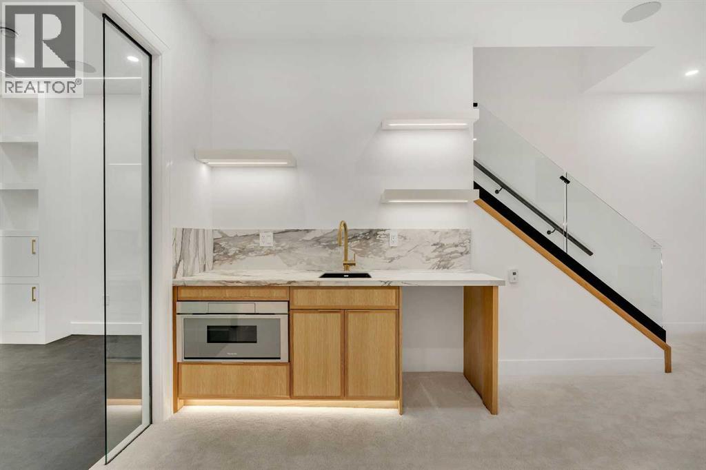 Architectural distinction meets contemporary luxury in this newly built custom home designed by JTA Design and expertly built by Brick Developments. Located in the heart of Inglewood, one of Calgary’s most iconic inner-city communities, the residence features steep-pitched rooflines, timeless brick detailing, and expansive windows that blend modern design with enduring architectural character.Steps from the Bow River pathways and surrounded by Inglewood’s renowned shops, restaurants, music venues, and breweries, the location offers an exceptional inner-city lifestyle.The open-concept main floor is designed for elevated living & entertaining, showcasing high ceilings, wide-plank hardwood flooring, and curated designer finishes. The chef’s kitchen features full-height custom cabinetry, HONED PORCELAIN countertops, backsplash & hood fan, a stunning PORCELAIN feature wall with built in clock, concealed walk-in pantry, waterfall island, and a premium THERMADOR appliance package including gas cooktop, wall oven, integrated refrigerator & dishwasher, and a beverage fridge. The dining area includes a statement chandelier and built-in buffet with wine storage and glass custom cabinetry, while the living room offers a custom media wall, inset gas fireplace, and full-height quartz surround overlooking the private backyard. A mudroom, powder room, and striking full-height GLASS WALL staircase complete the main level.Upstairs, the primary suite features vaulted ceilings, an expansive walk-in closet with custom built-ins, offering refined storage & functionality, and a spa-inspired ensuite with heated floors STEAM SHOWER, dual vanities, and freestanding soaker tub. A spacious laundry room with quartz counter, built-in cabinetry, and sink, along with two additional bedrooms—each offering PRIVATE ENSUITES with HEATED tile floors and walk-in closets nicely round off this level.The fully developed basement features radiant in-floor heating, soaring 10-FT ceilings, and an expan sive recreation area with a built-in media centre. A custom wet bar with sink & microwave drawer, dedicated home gym, fourth bedroom, three-piece bathroom, and a discreet pocket office with built-in workstation complete the level. Outside, the home is professionally landscaped and complemented by a fully finished garage with gas rough-in for a future heater. This is an exceptional opportunity to own a thoughtfully designed architectural home in one of Calgary’s most sought-after inner-city communities. (id:63190)