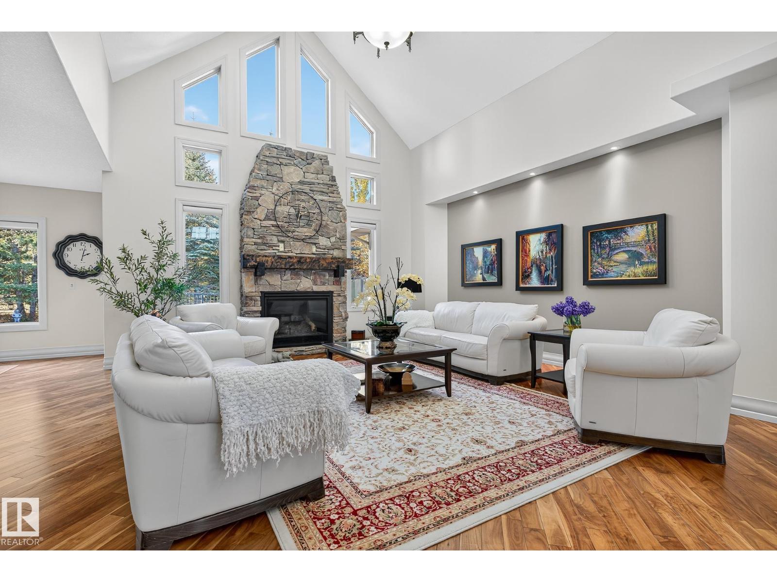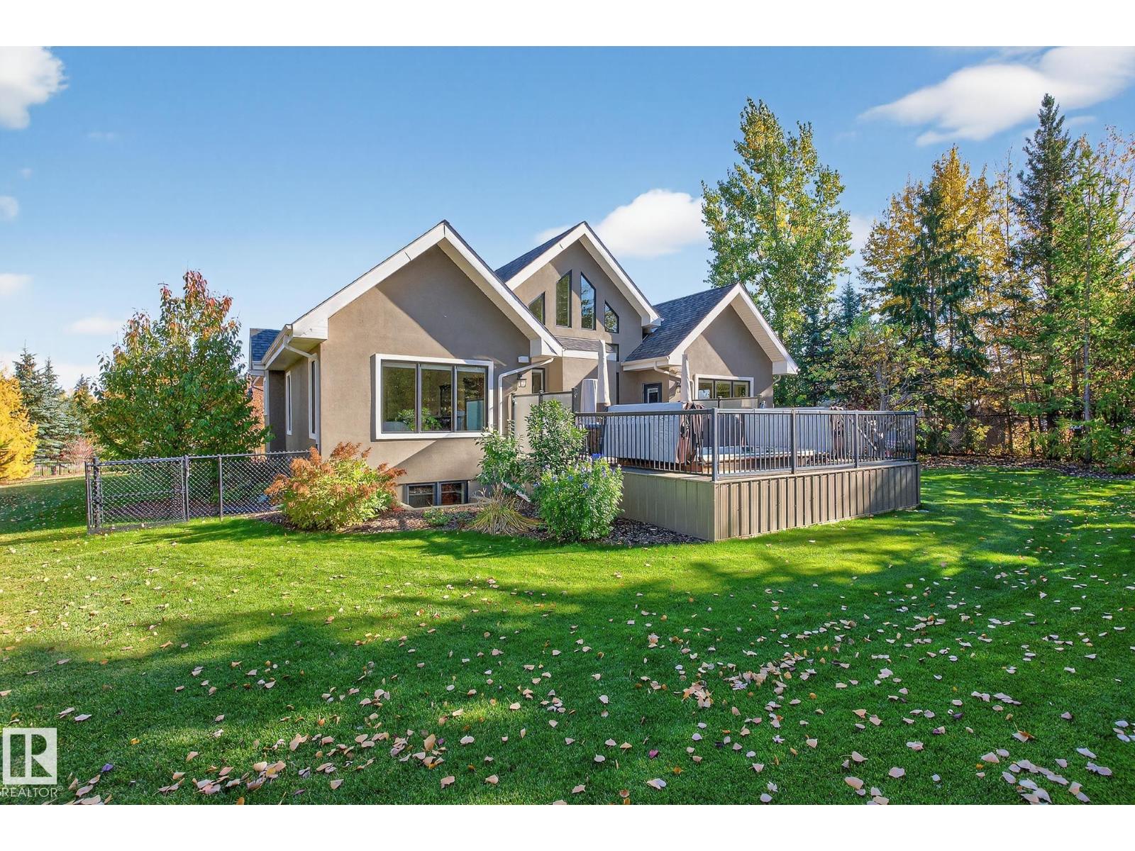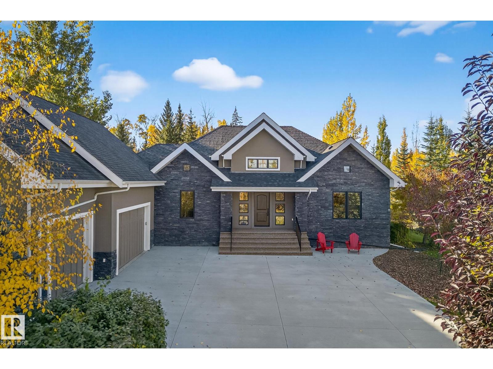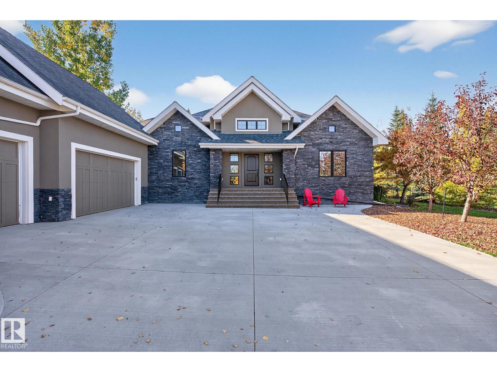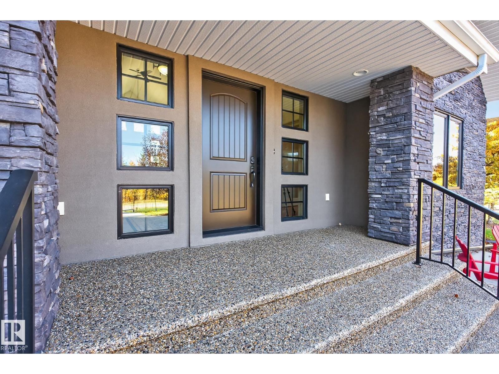 Exceptional custom-built bungalow in prestigious Atim Creek Springs, 20 mins west of Edmonton and 5 mins north of Spruce Grove features a fully landscaped, fenced yard with electric gate offering privacy among mature spruce trees, perennial beds, and underground irrigation. Over 4,600 sq ft of refined living space and oversized triple garage. This home impresses with a grand foyer, soaring 20’ vaulted ceilings, and a striking barrel-vaulted ceiling. Formal dining room with coffered ceilings, a private office with French doors, and surround sound throughout. The chef’s kitchen features a 6-burner gas stove, newer appliances, and breakfast nook opening to a west-facing deck with swim spa—ideal for entertaining. The primary suite offers a spa-inspired ensuite with steam shower and jetted tub. Fully finished basement includes 9’ ceilings, in-floor heat, two colossal bedrooms, one with walk-in closet, a 4-piece bath, media room, gym, sitting room with stone fireplace, and generous storage. New paint and carpet (id:63190)