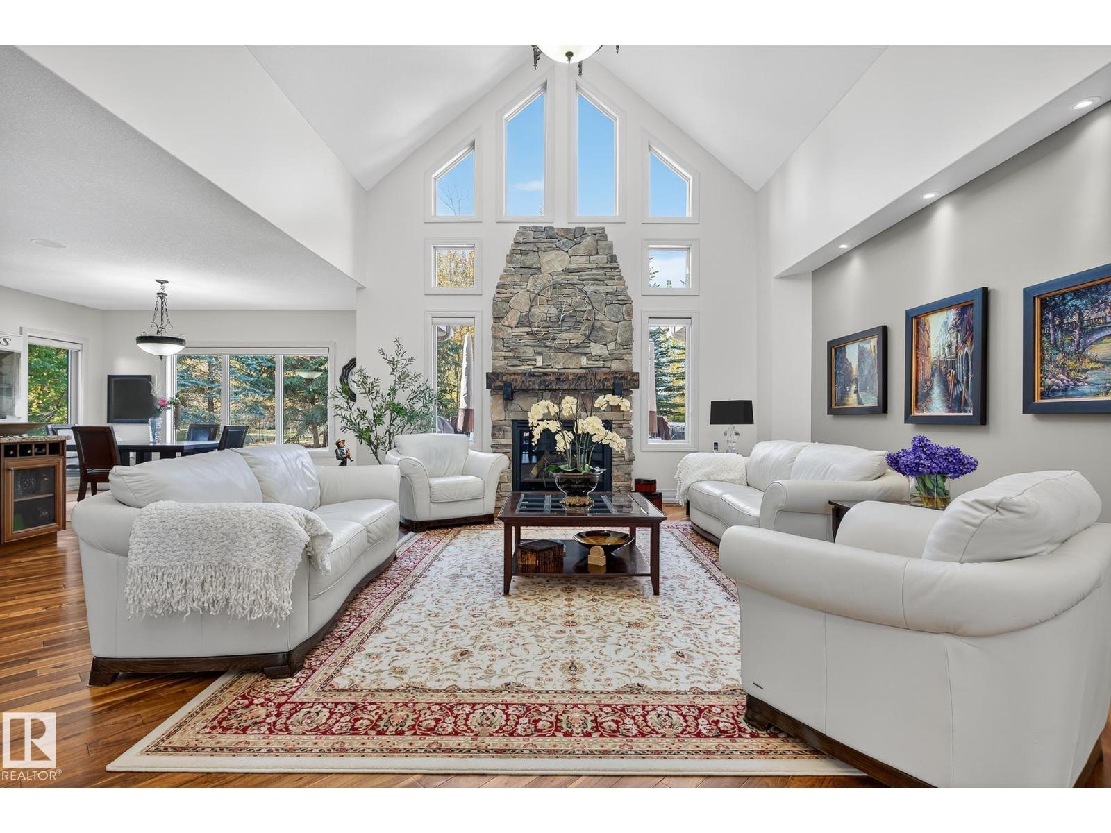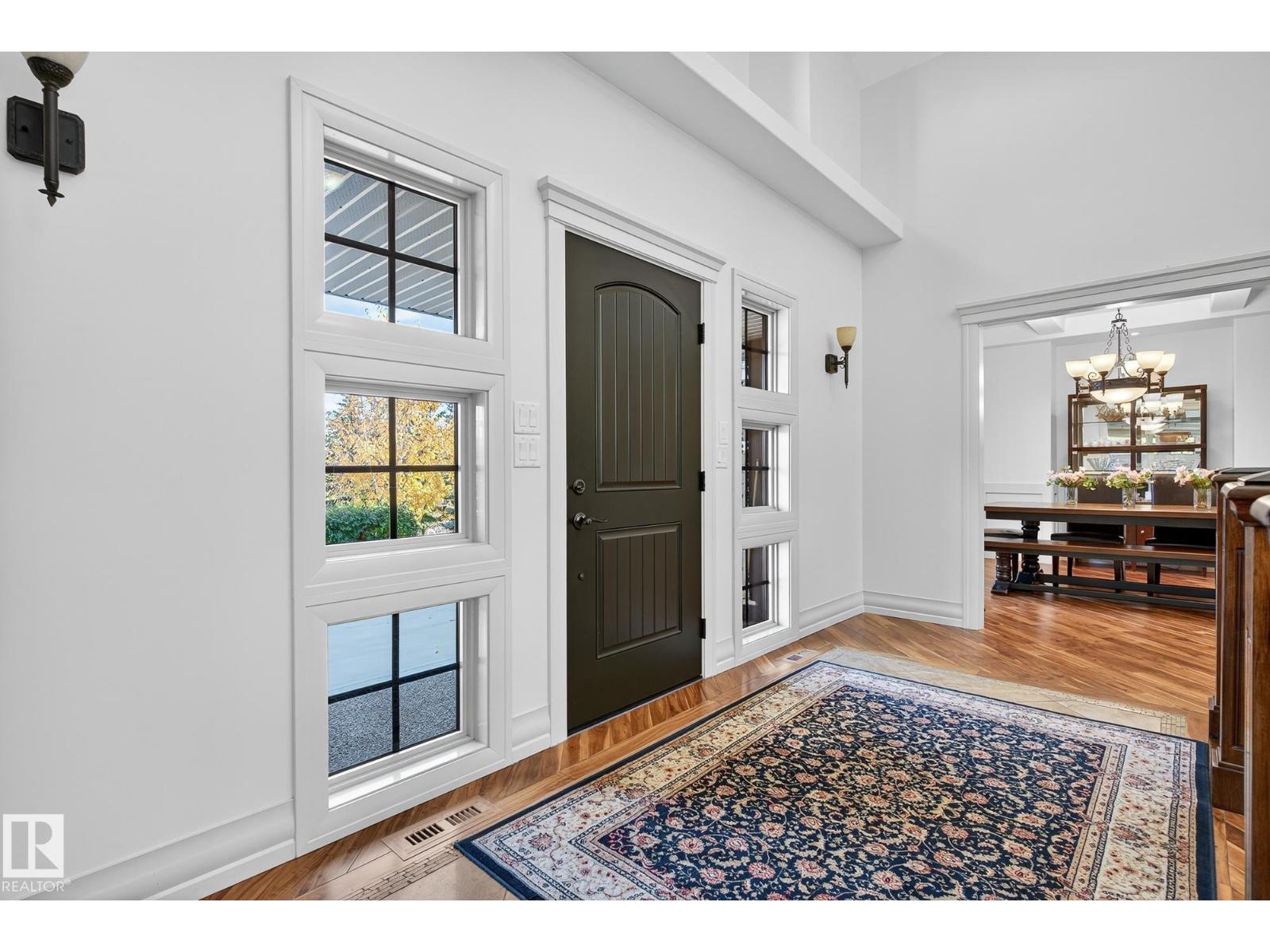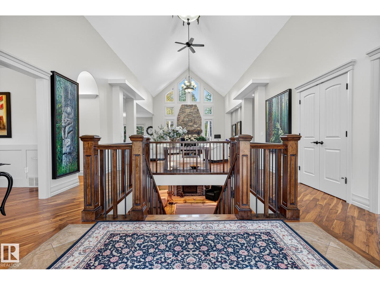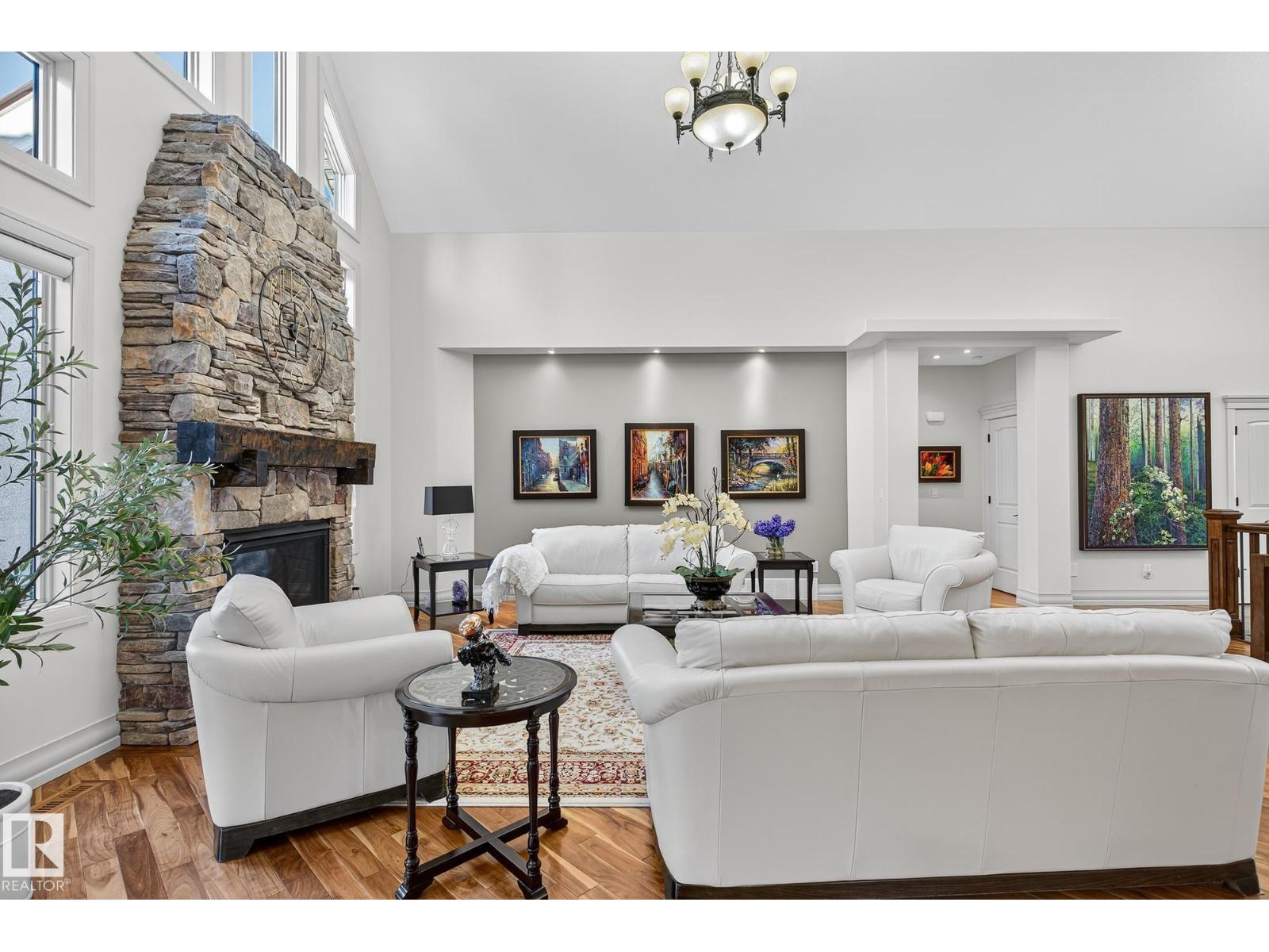Exceptional custom-built bungalow in prestigious Atim Creek Springs, 20 mins west of Edmonton and 5 mins north of Spruce Grove features a fully landscaped, fenced yard with electric gate offering privacy among mature spruce trees, perennial beds, and underground irrigation. Over 4,600 sq ft of refined living space and oversized triple garage. This home impresses with a grand foyer, soaring 20’ vaulted ceilings, and a striking barrel-vaulted ceiling. Formal dining room with coffered ceilings, a private office with French doors, and surround sound throughout. The chef’s kitchen features a 6-burner gas stove, newer appliances, and breakfast nook opening to a west-facing deck with swim spa—ideal for entertaining. The primary suite offers a spa-inspired ensuite with steam shower and jetted tub. Fully finished basement includes 9’ ceilings, in-floor heat, two colossal bedrooms, one with walk-in closet, a 4-piece bath, media room, gym, sitting room with stone fireplace, and generous storage. New paint and carpet (id:63190)