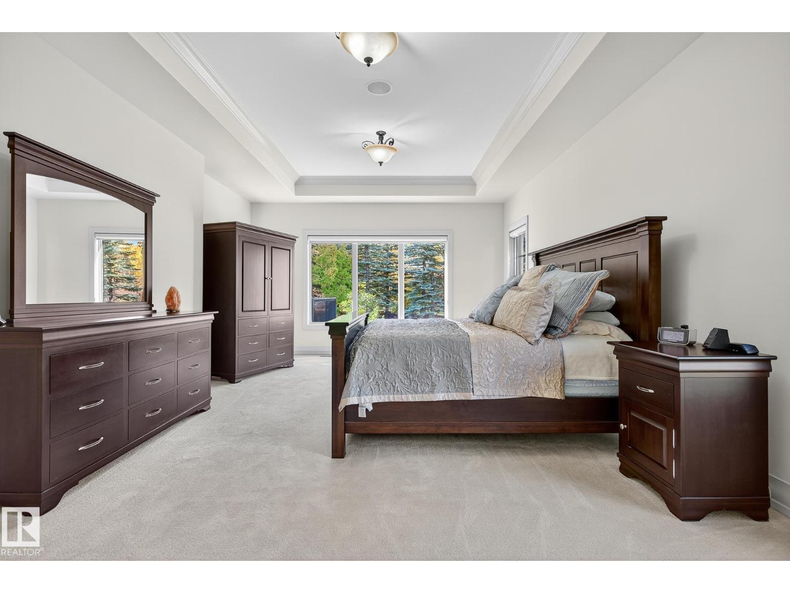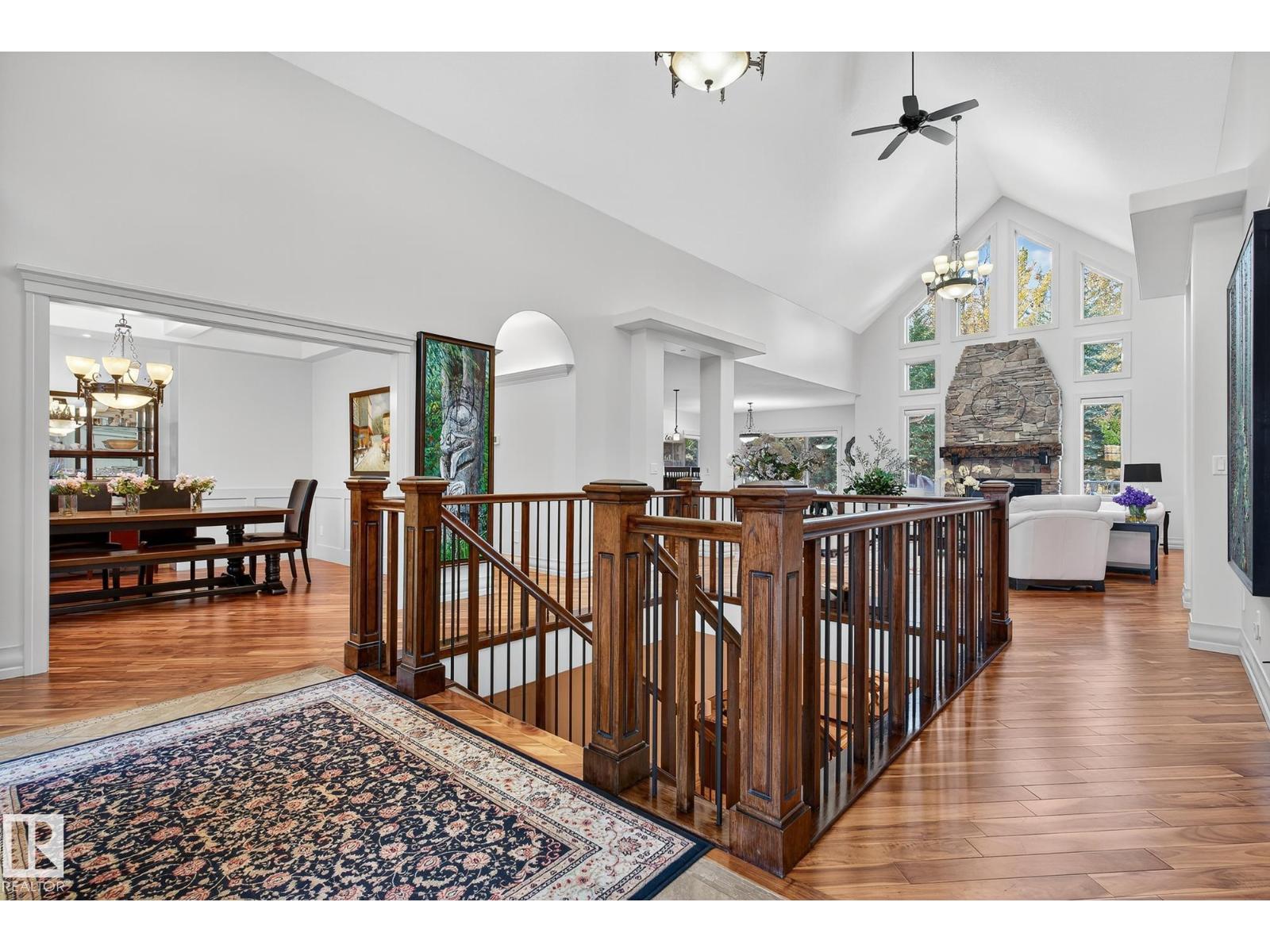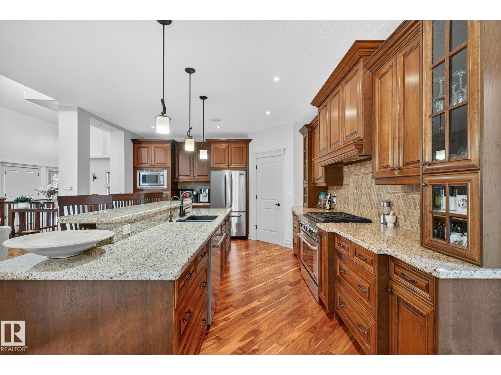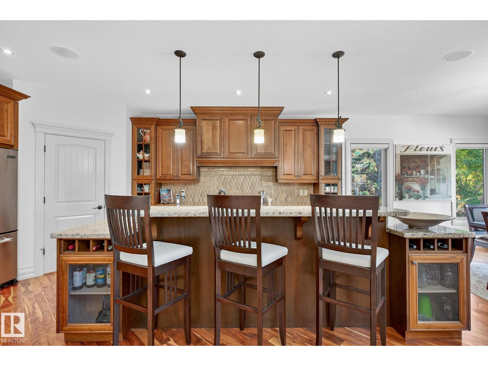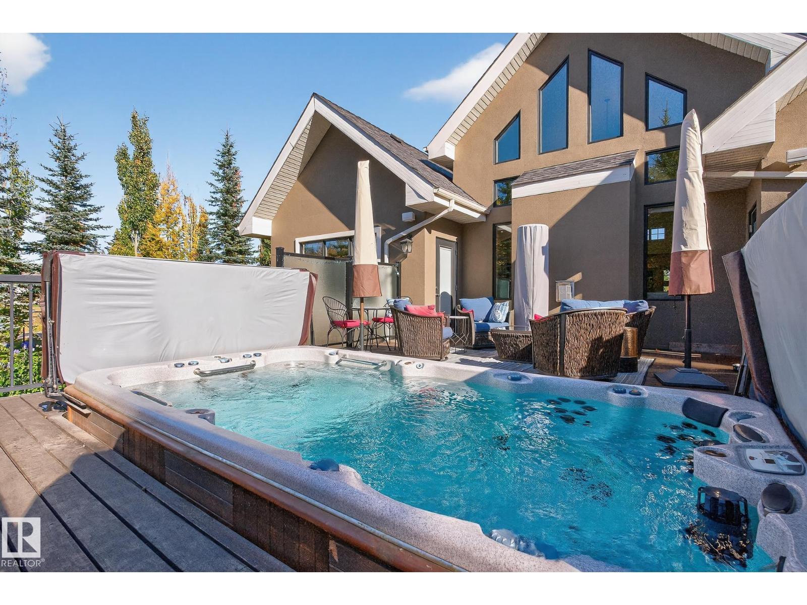 Exceptional custom-built bungalow in prestigious Atim Creek Springs, 20 mins west of Edmonton and 5 mins north of Spruce Grove features a fully landscaped, fenced yard with electric gate offering privacy among mature spruce trees, perennial beds, and underground irrigation. Over 4,600 sq ft of refined living space and oversized triple garage. This home impresses with a grand foyer, soaring 20’ vaulted ceilings, and a striking barrel-vaulted ceiling. Formal dining room with coffered ceilings, a private office with French doors, and surround sound throughout. The chef’s kitchen features a 6-burner gas stove, newer appliances, and breakfast nook opening to a west-facing deck with swim spa—ideal for entertaining. The primary suite offers a spa-inspired ensuite with steam shower and jetted tub. Fully finished basement includes 9’ ceilings, in-floor heat, two colossal bedrooms, one with walk-in closet, a 4-piece bath, media room, gym, sitting room with stone fireplace, and generous storage. New paint and carpet (id:63190)