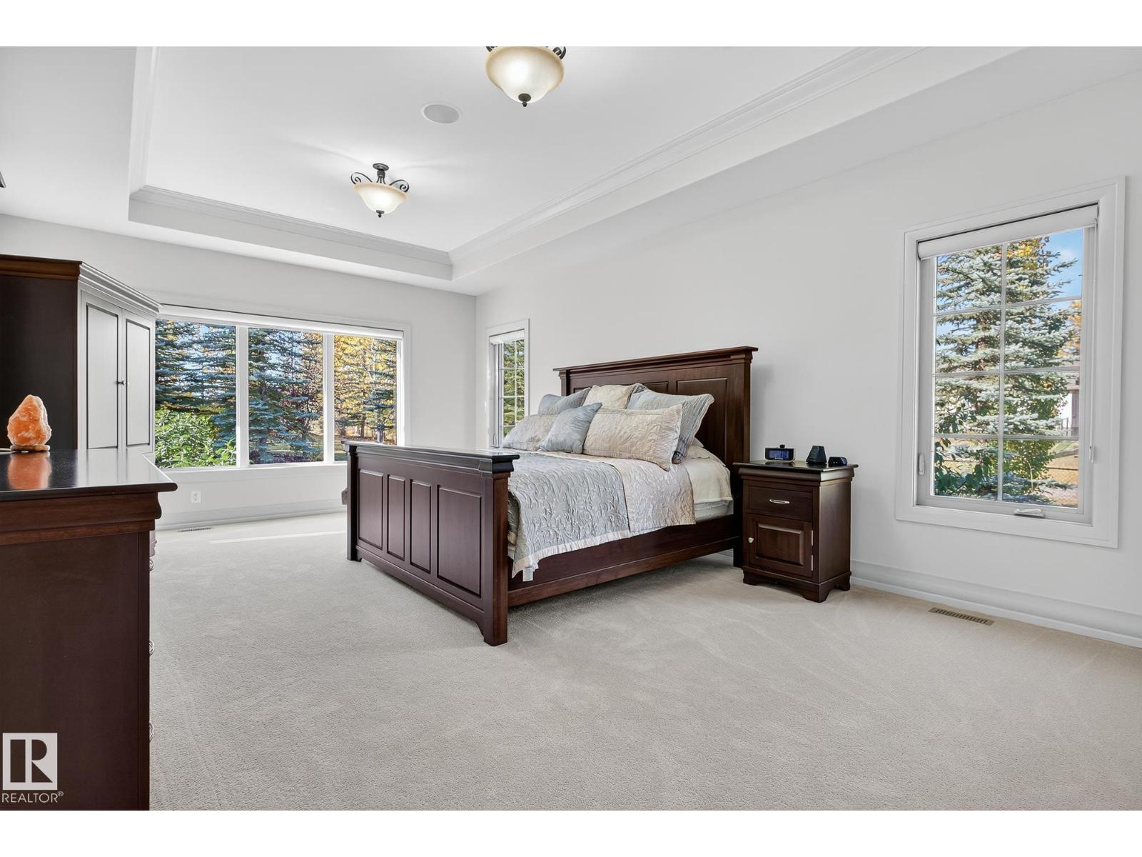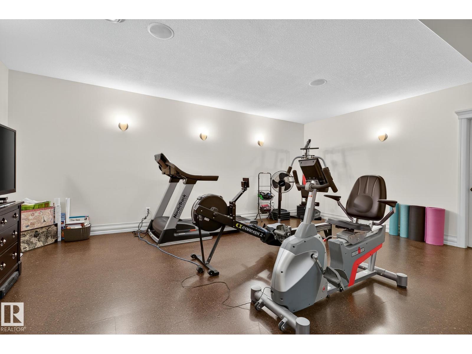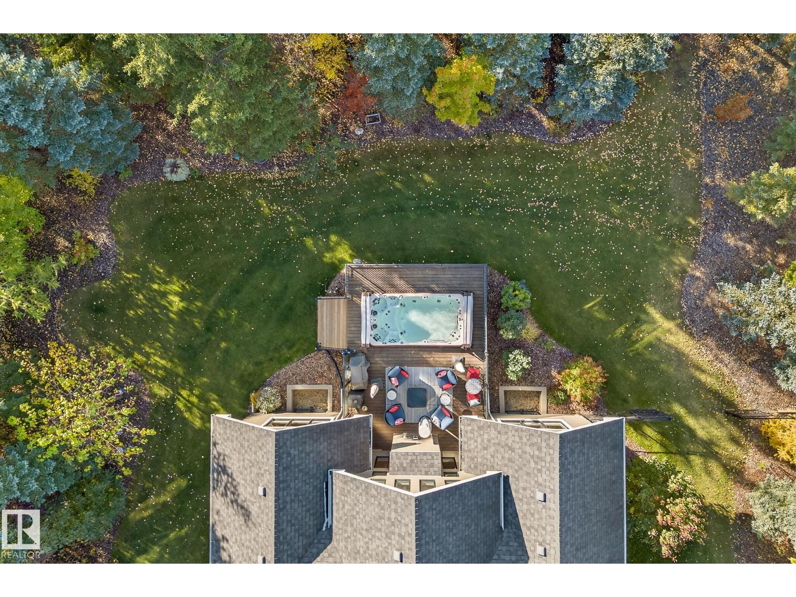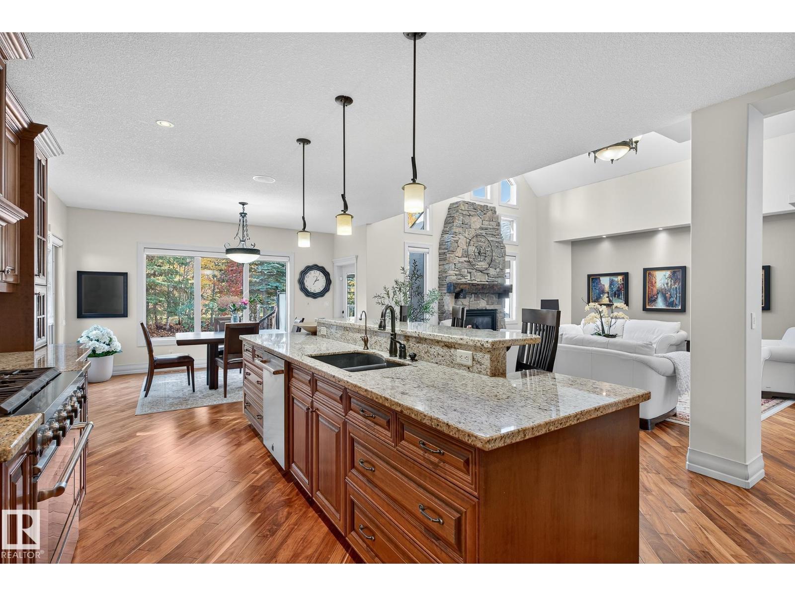 Exceptional custom-built bungalow in prestigious Atim Creek Springs, 20 mins west of Edmonton and 5 mins north of Spruce Grove features a fully landscaped, fenced yard with electric gate offering privacy among mature spruce trees, perennial beds, and underground irrigation. Over 4,600 sq ft of refined living space and oversized triple garage. This home impresses with a grand foyer, soaring 20’ vaulted ceilings, and a striking barrel-vaulted ceiling. Formal dining room with coffered ceilings, a private office with French doors, and surround sound throughout. The chef’s kitchen features a 6-burner gas stove, newer appliances, and breakfast nook opening to a west-facing deck with swim spa—ideal for entertaining. The primary suite offers a spa-inspired ensuite with steam shower and jetted tub. Fully finished basement includes 9’ ceilings, in-floor heat, two colossal bedrooms, one with walk-in closet, a 4-piece bath, media room, gym, sitting room with stone fireplace, and generous storage. New paint and carpet (id:63190)