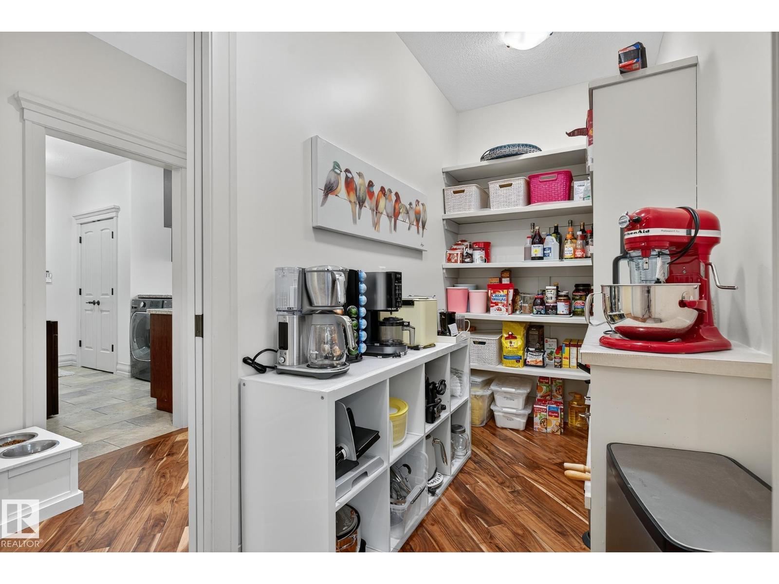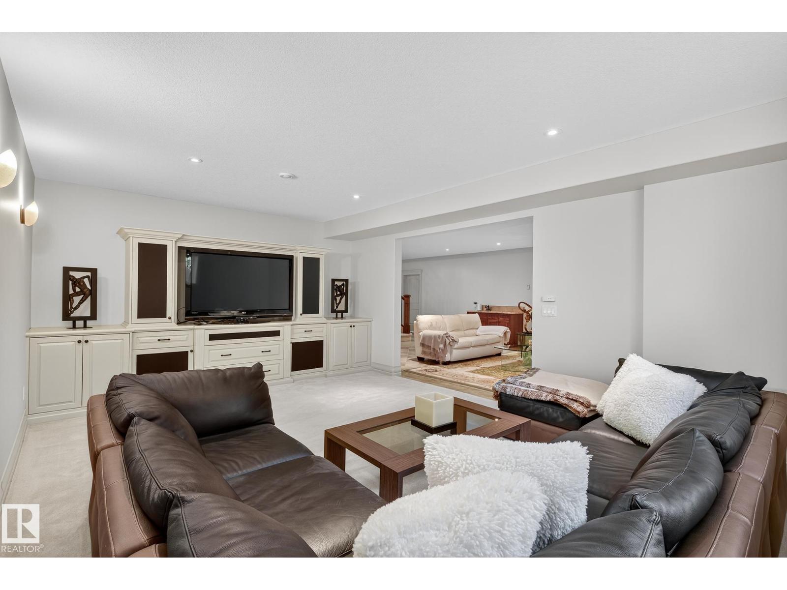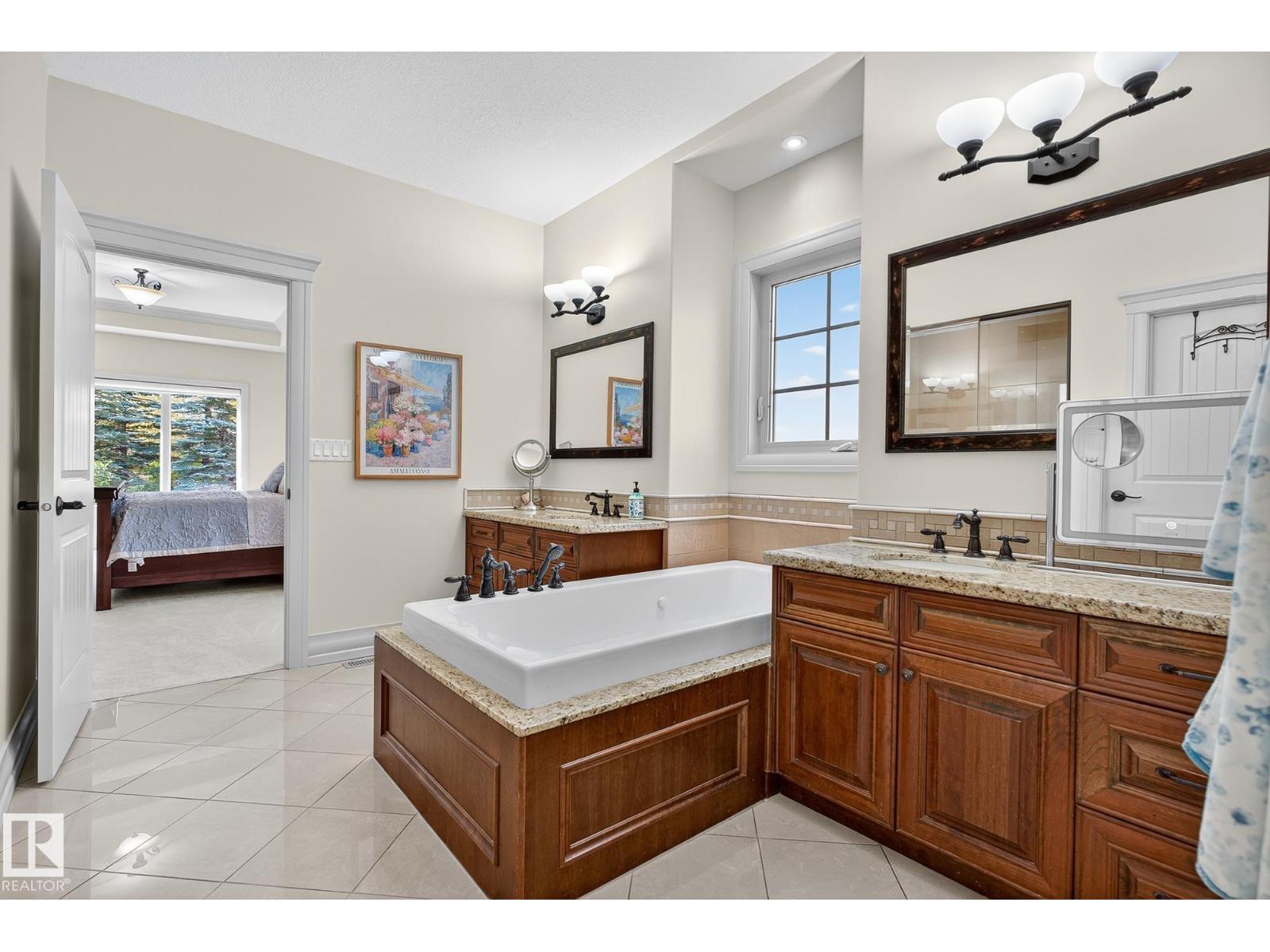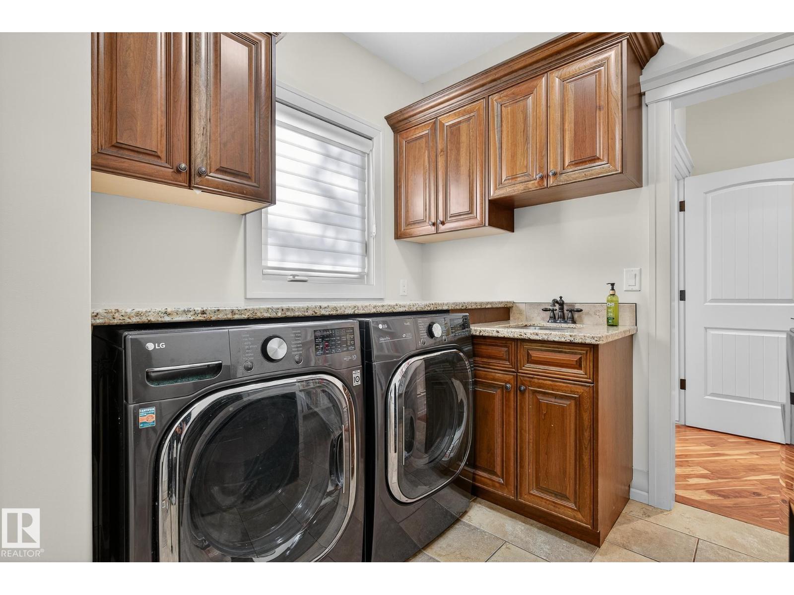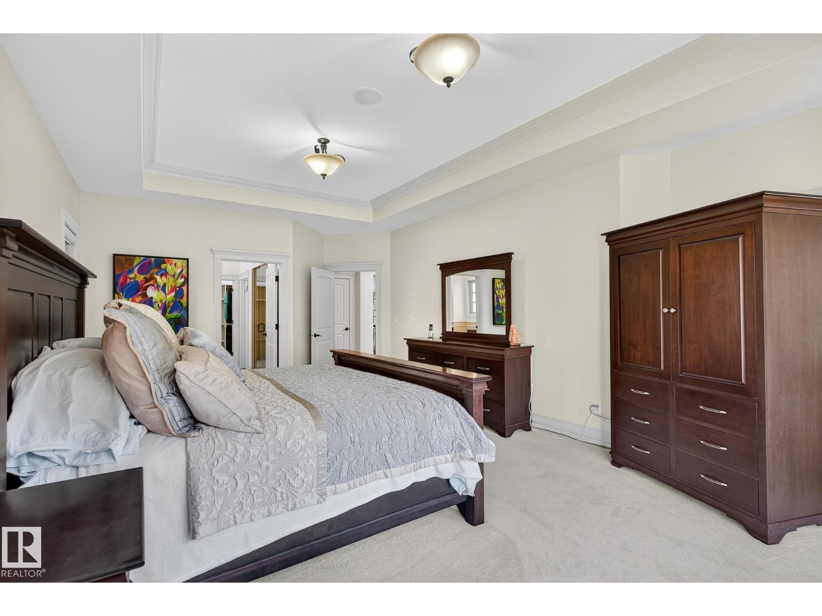 Exceptional custom-built bungalow in prestigious Atim Creek Springs, 20 mins west of Edmonton and 5 mins north of Spruce Grove features a fully landscaped, fenced yard with electric gate offering privacy among mature spruce trees, perennial beds, and underground irrigation. Over 4,600 sq ft of refined living space and oversized triple garage. This home impresses with a grand foyer, soaring 20’ vaulted ceilings, and a striking barrel-vaulted ceiling. Formal dining room with coffered ceilings, a private office with French doors, and surround sound throughout. The chef’s kitchen features a 6-burner gas stove, newer appliances, and breakfast nook opening to a west-facing deck with swim spa—ideal for entertaining. The primary suite offers a spa-inspired ensuite with steam shower and jetted tub. Fully finished basement includes 9’ ceilings, in-floor heat, two colossal bedrooms, one with walk-in closet, a 4-piece bath, media room, gym, sitting room with stone fireplace, and generous storage. New paint and carpet (id:63190)