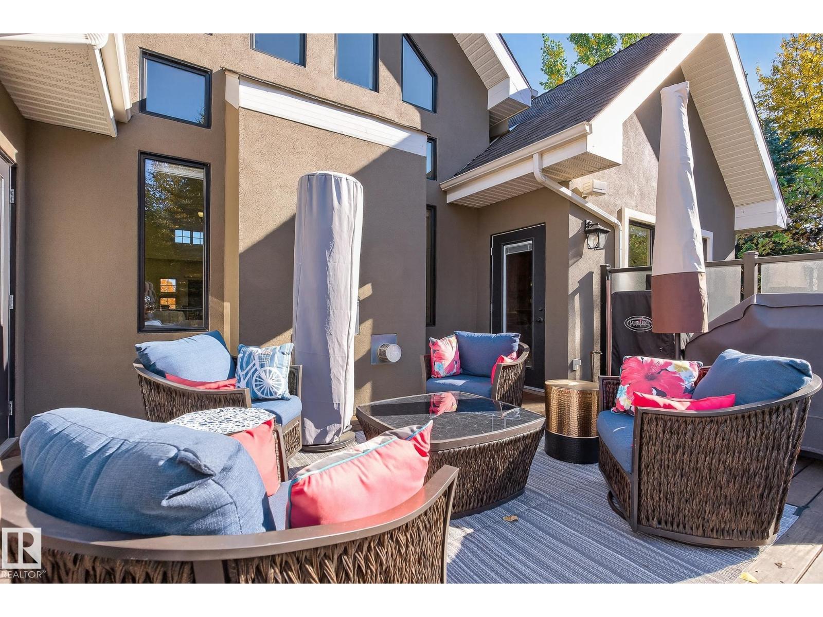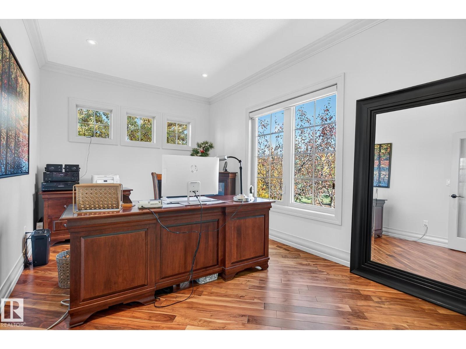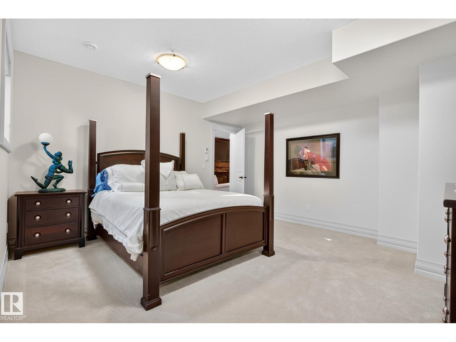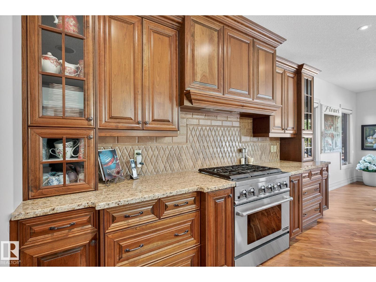 Exceptional custom-built bungalow in prestigious Atim Creek Springs, 20 mins west of Edmonton and 5 mins north of Spruce Grove features a fully landscaped, fenced yard with electric gate offering privacy among mature spruce trees, perennial beds, and underground irrigation. Over 4,600 sq ft of refined living space and oversized triple garage. This home impresses with a grand foyer, soaring 20’ vaulted ceilings, and a striking barrel-vaulted ceiling. Formal dining room with coffered ceilings, a private office with French doors, and surround sound throughout. The chef’s kitchen features a 6-burner gas stove, newer appliances, and breakfast nook opening to a west-facing deck with swim spa—ideal for entertaining. The primary suite offers a spa-inspired ensuite with steam shower and jetted tub. Fully finished basement includes 9’ ceilings, in-floor heat, two colossal bedrooms, one with walk-in closet, a 4-piece bath, media room, gym, sitting room with stone fireplace, and generous storage. New paint and carpet (id:63190)