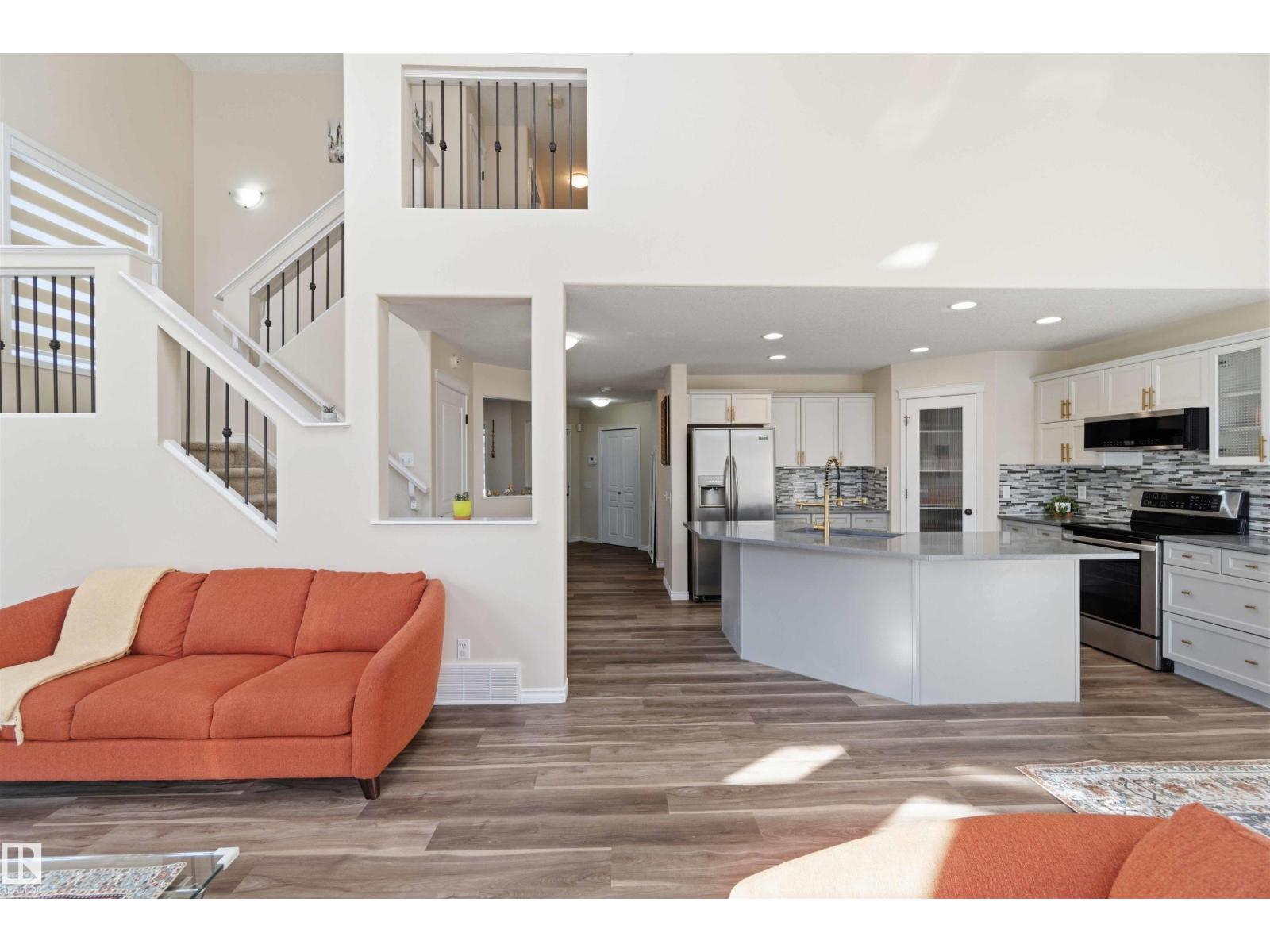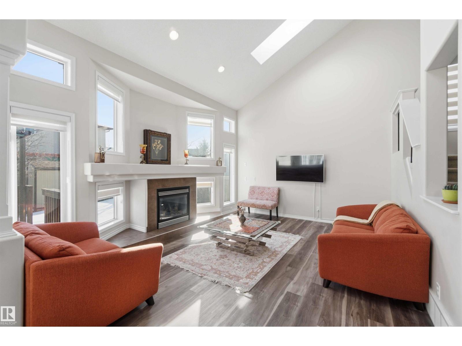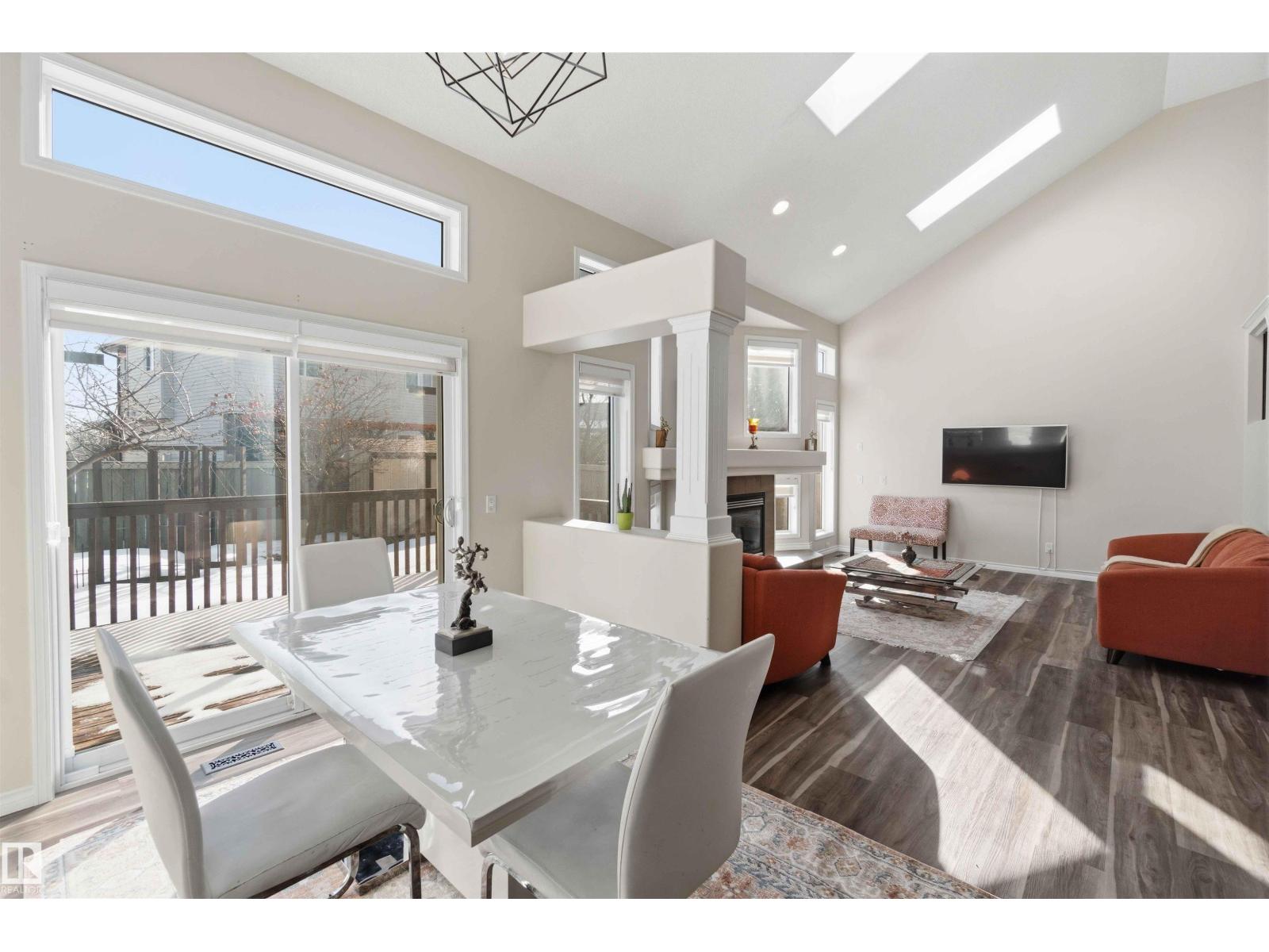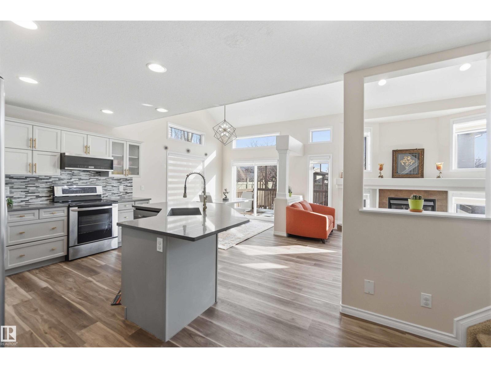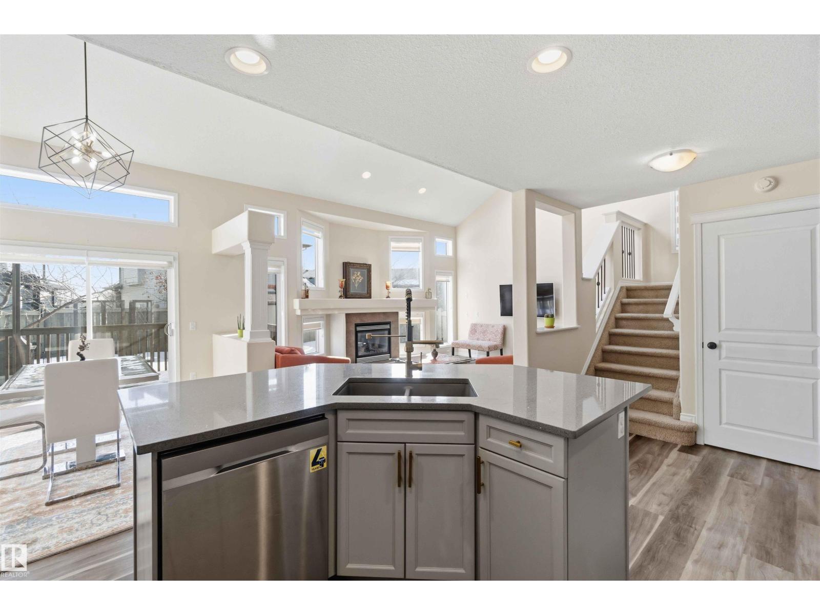Stunning fully finished 2-storey Daytona BENZ home with vaulted ceilings and large windows, offering abundant natural light and views of the spacious deck and well-maintained backyard. The main floor features a versatile dining room/den ideal for a home office, convenient laundry with a new washer, and an open-concept layout. Kitchen was fully updated in 2025 with quartz countertops, new dishwasher, hood fan microwave, flowing into a large family room with fireplace. Main level light fixtures and window coverings updated in 2024. Upstairs offers 3 generous bedrooms, including a primary suite with walk-in closet and ensuite, plus a large 4-piece bath. The finished basement includes a rec room, bedroom, full bath, and ample storage. Other updates include flooring and paint (2022). Enjoy a backyard with deck, paved patio, shed, storage container, cherry & apple trees. Extra-wide garage fits a crew cab truck and an SUV. Close to schools, shopping (including Costco), public transit, parks, and walking trails. (id:63190)