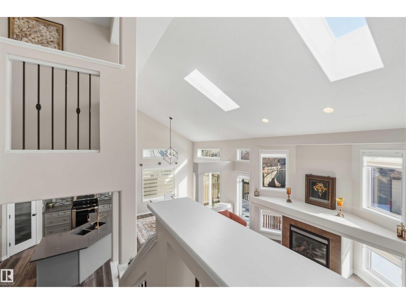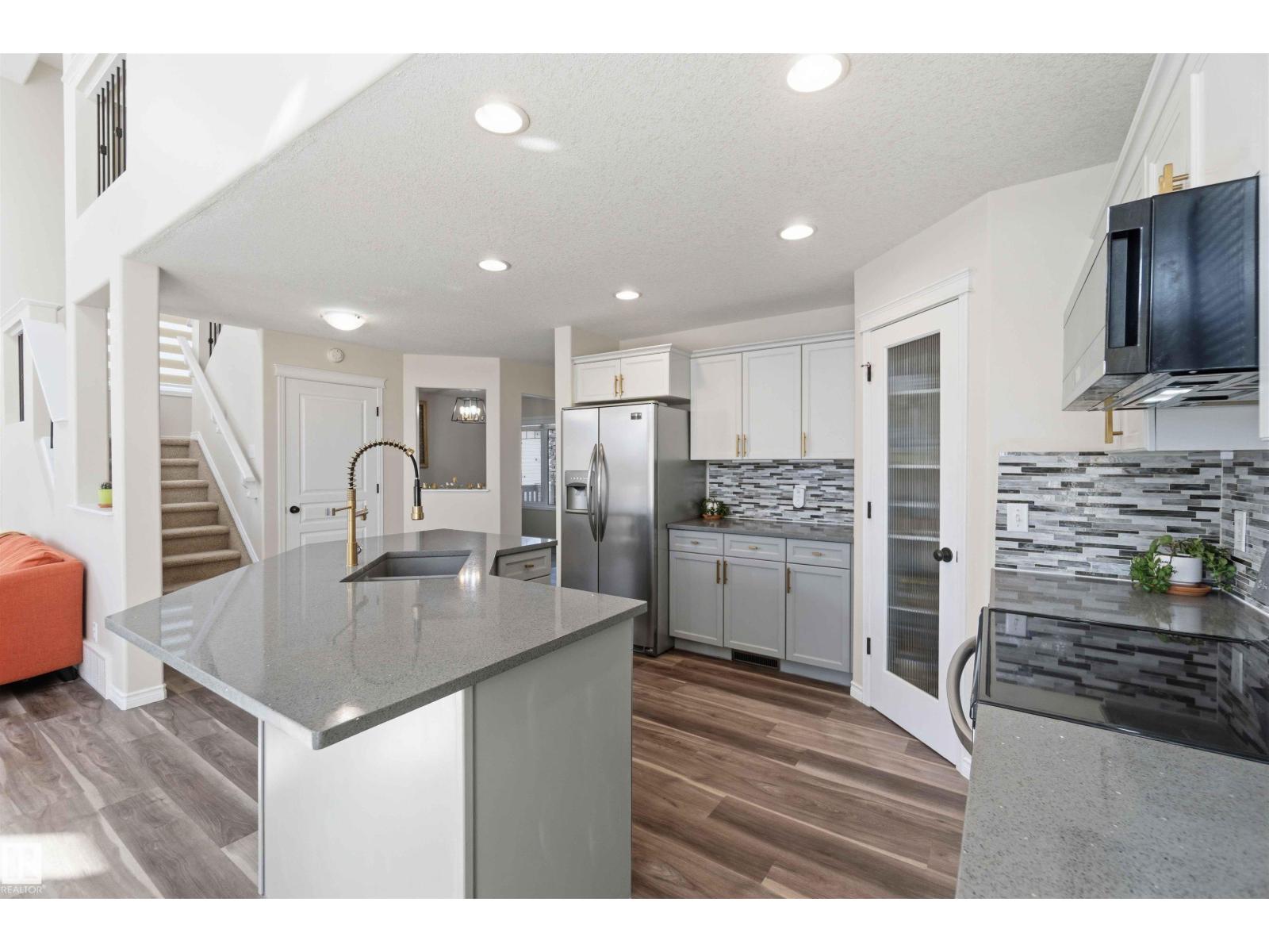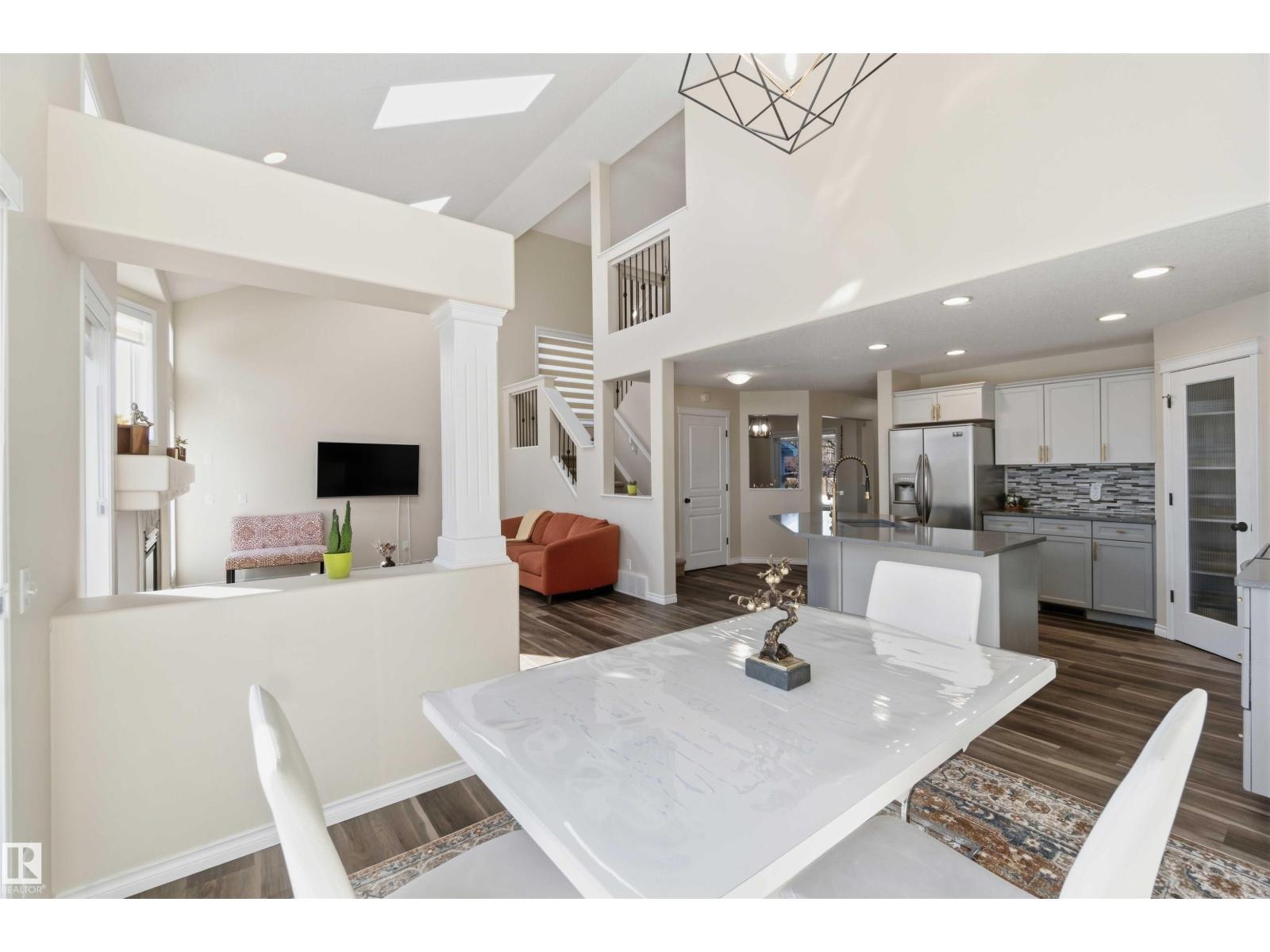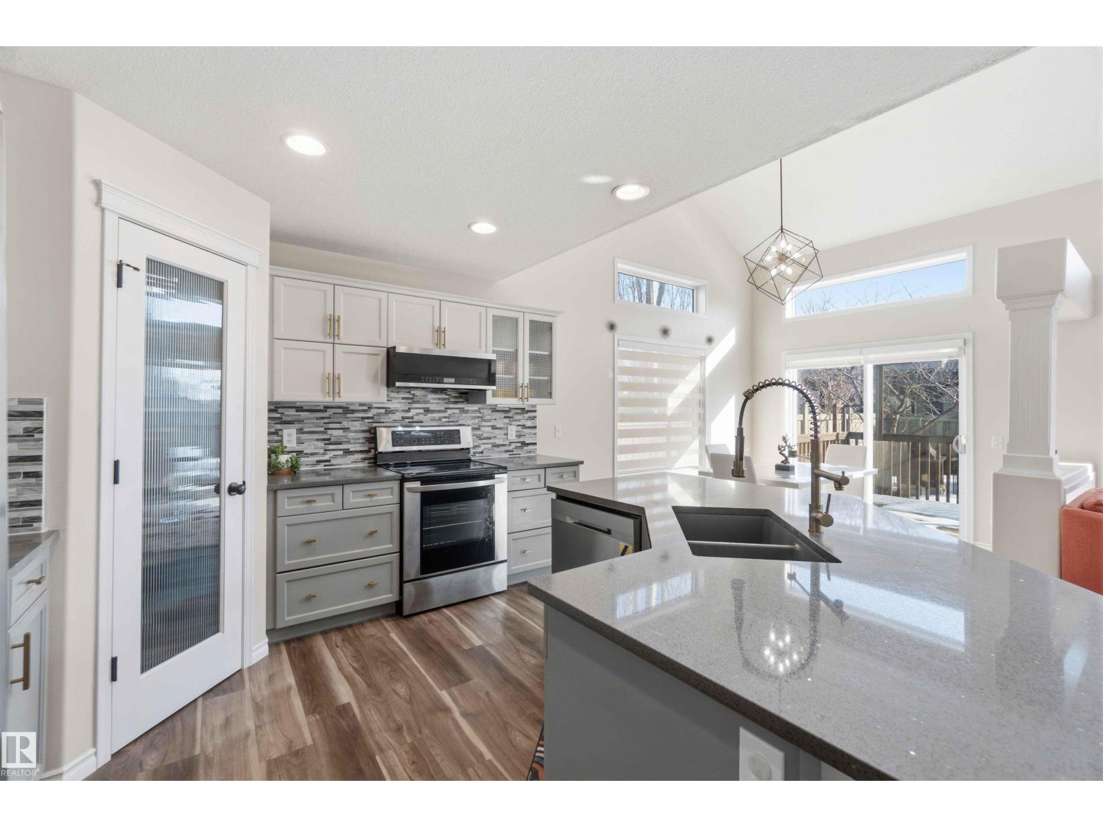 Stunning fully finished 2-storey Daytona BENZ home with vaulted ceilings and large windows, offering abundant natural light and views of the spacious deck and well-maintained backyard. The main floor features a versatile dining room/den ideal for a home office, convenient laundry with a new washer, and an open-concept layout. Kitchen was fully updated in 2025 with quartz countertops, new dishwasher, hood fan microwave, flowing into a large family room with fireplace. Main level light fixtures and window coverings updated in 2024. Upstairs offers 3 generous bedrooms, including a primary suite with walk-in closet and ensuite, plus a large 4-piece bath. The finished basement includes a rec room, bedroom, full bath, and ample storage. Other updates include flooring and paint (2022). Enjoy a backyard with deck, paved patio, shed, storage container, cherry & apple trees. Extra-wide garage fits a crew cab truck and an SUV. Close to schools, shopping (including Costco), public transit, parks, and walking trails. (id:63190)