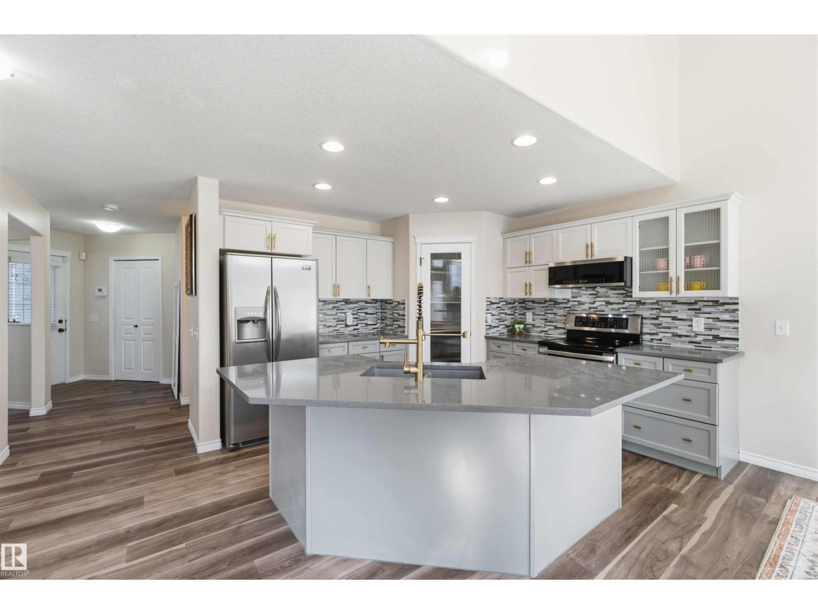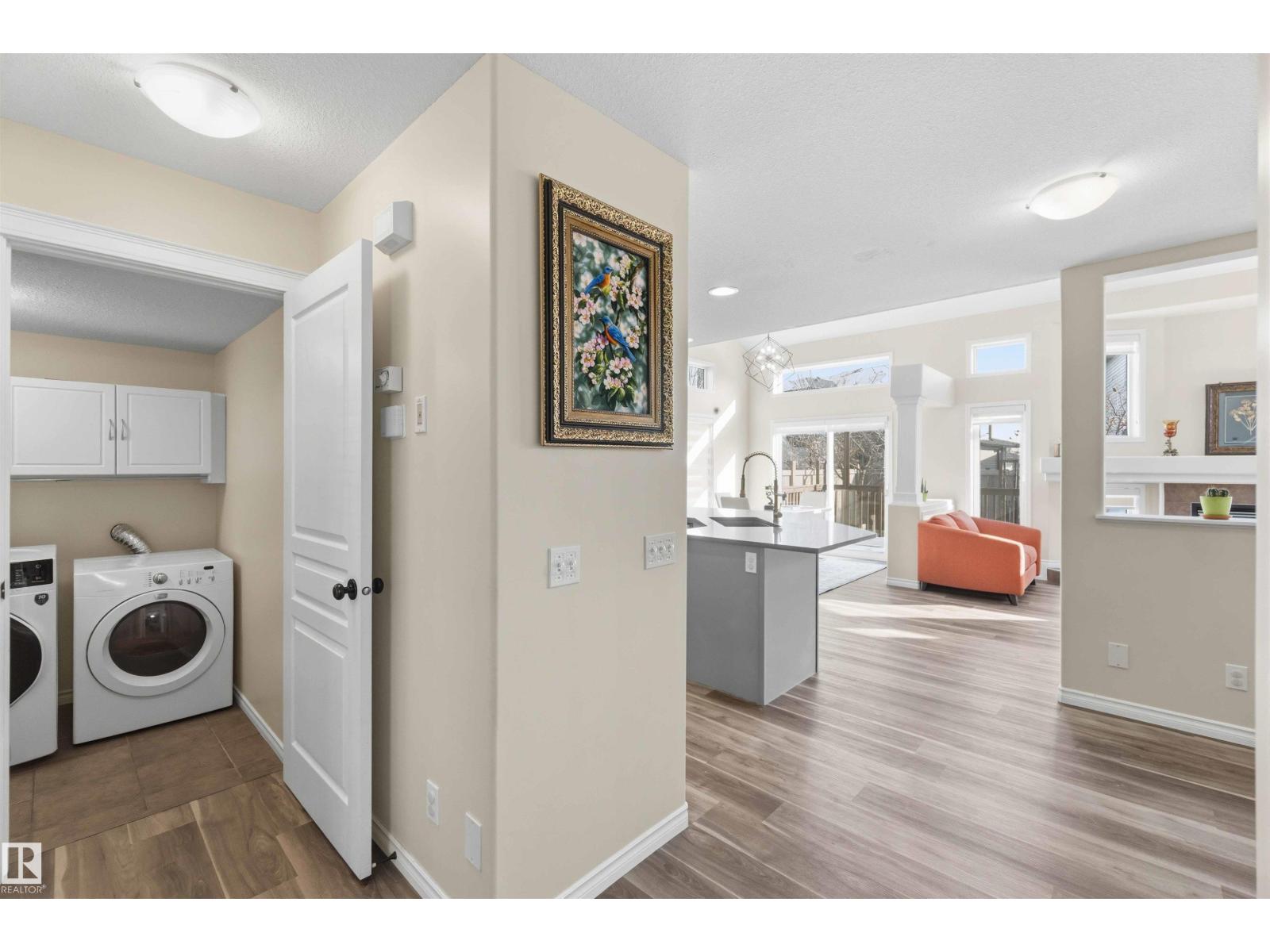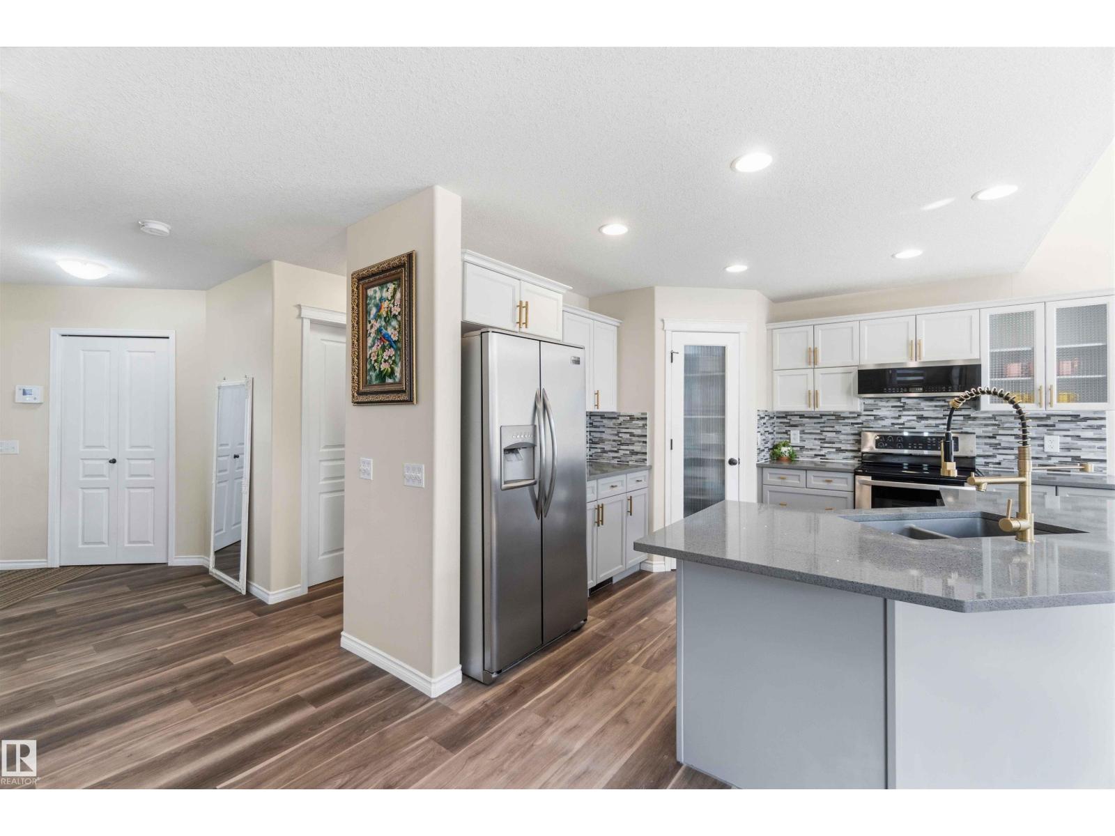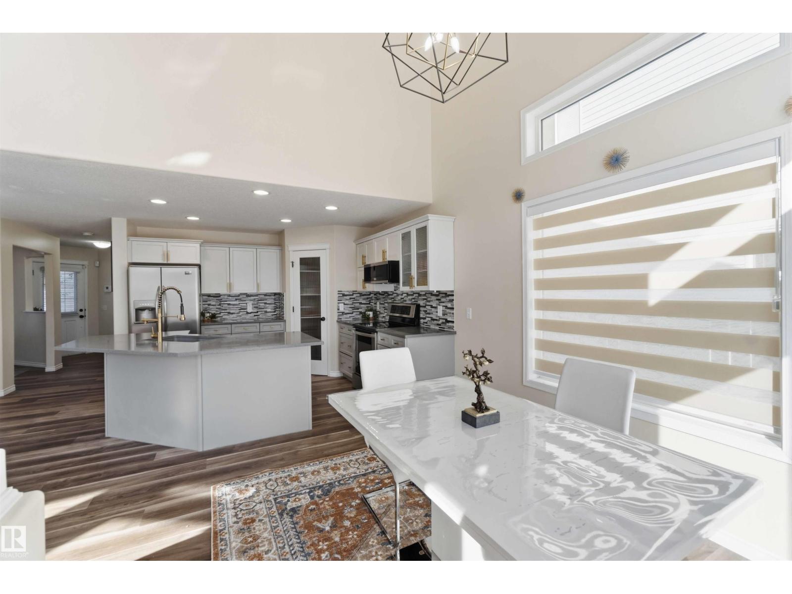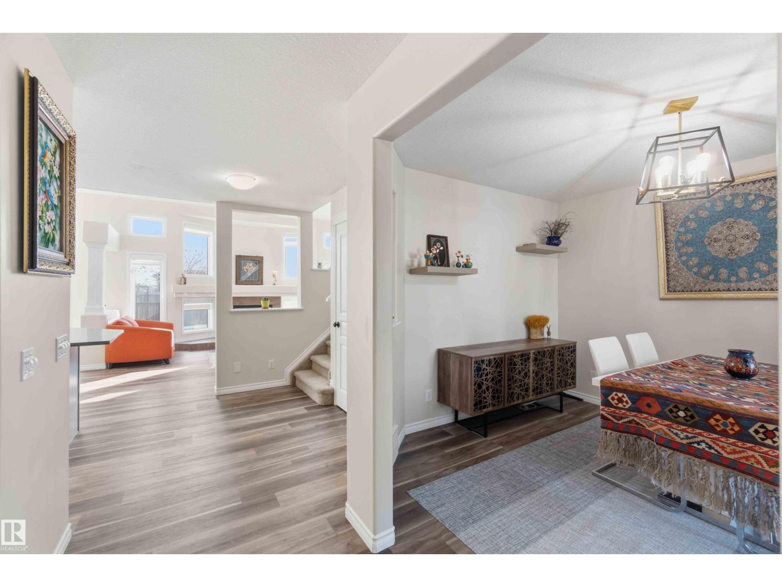 Stunning fully finished 2-storey Daytona BENZ home with vaulted ceilings and large windows, offering abundant natural light and views of the spacious deck and well-maintained backyard. The main floor features a versatile dining room/den ideal for a home office, convenient laundry with a new washer, and an open-concept layout. Kitchen was fully updated in 2025 with quartz countertops, new dishwasher, hood fan microwave, flowing into a large family room with fireplace. Main level light fixtures and window coverings updated in 2024. Upstairs offers 3 generous bedrooms, including a primary suite with walk-in closet and ensuite, plus a large 4-piece bath. The finished basement includes a rec room, bedroom, full bath, and ample storage. Other updates include flooring and paint (2022). Enjoy a backyard with deck, paved patio, shed, storage container, cherry & apple trees. Extra-wide garage fits a crew cab truck and an SUV. Close to schools, shopping (including Costco), public transit, parks, and walking trails. (id:63190)