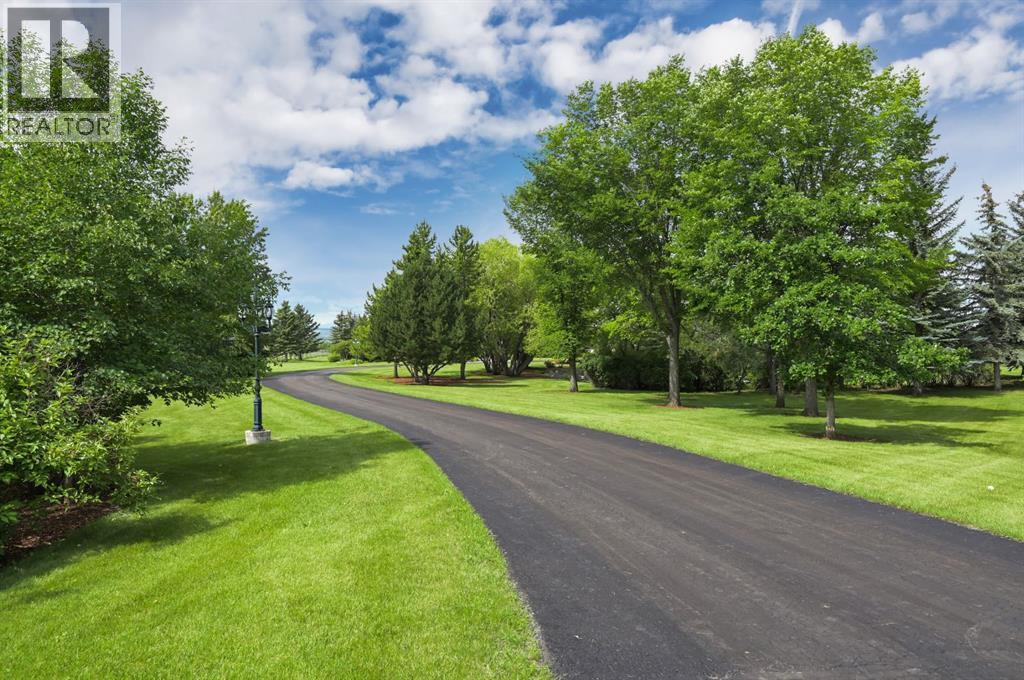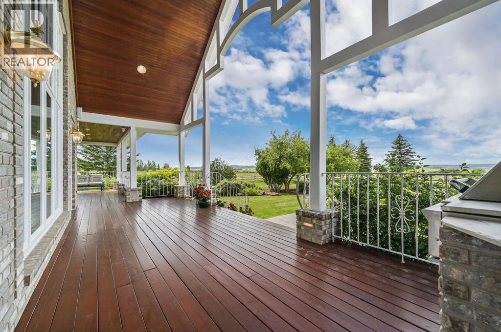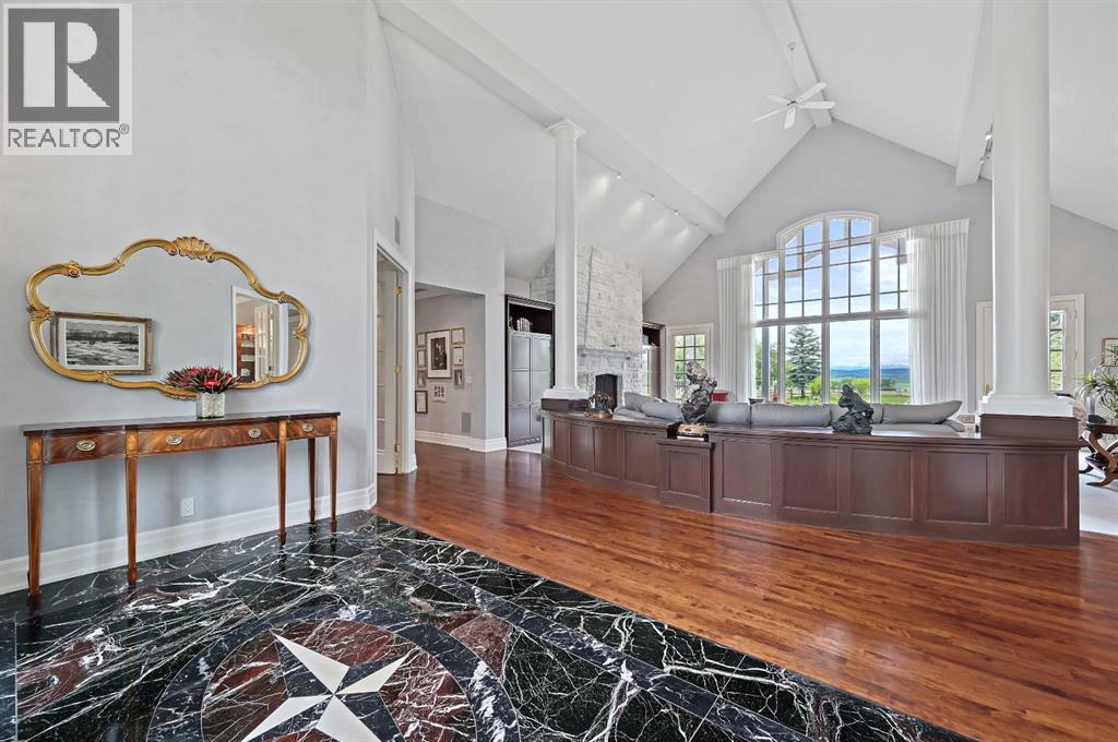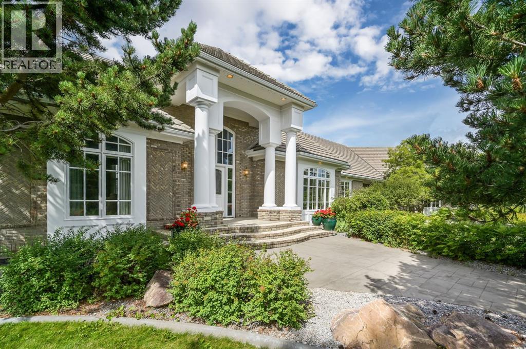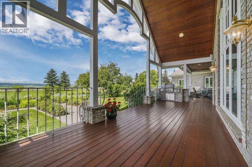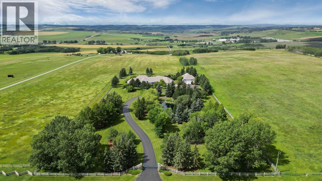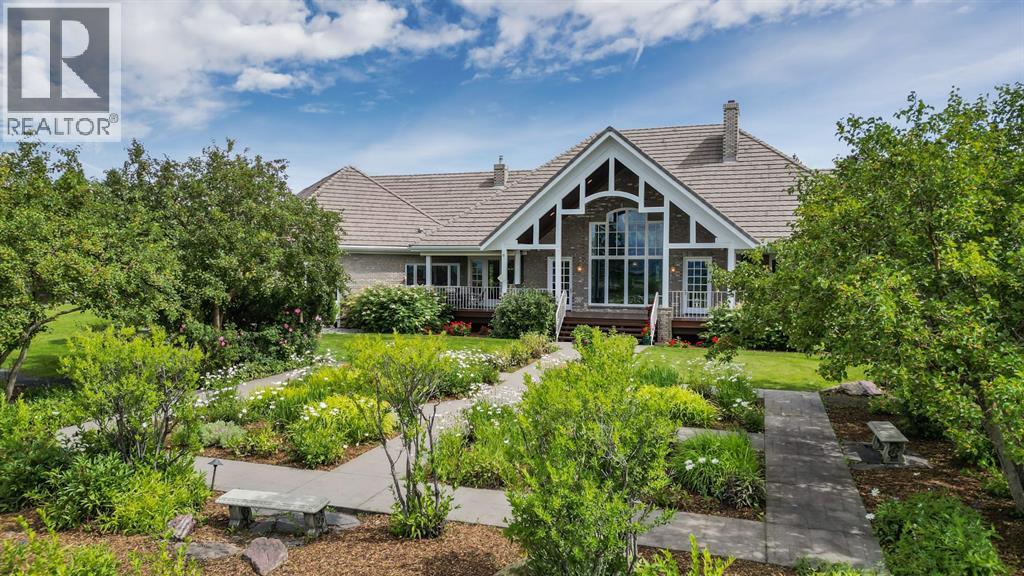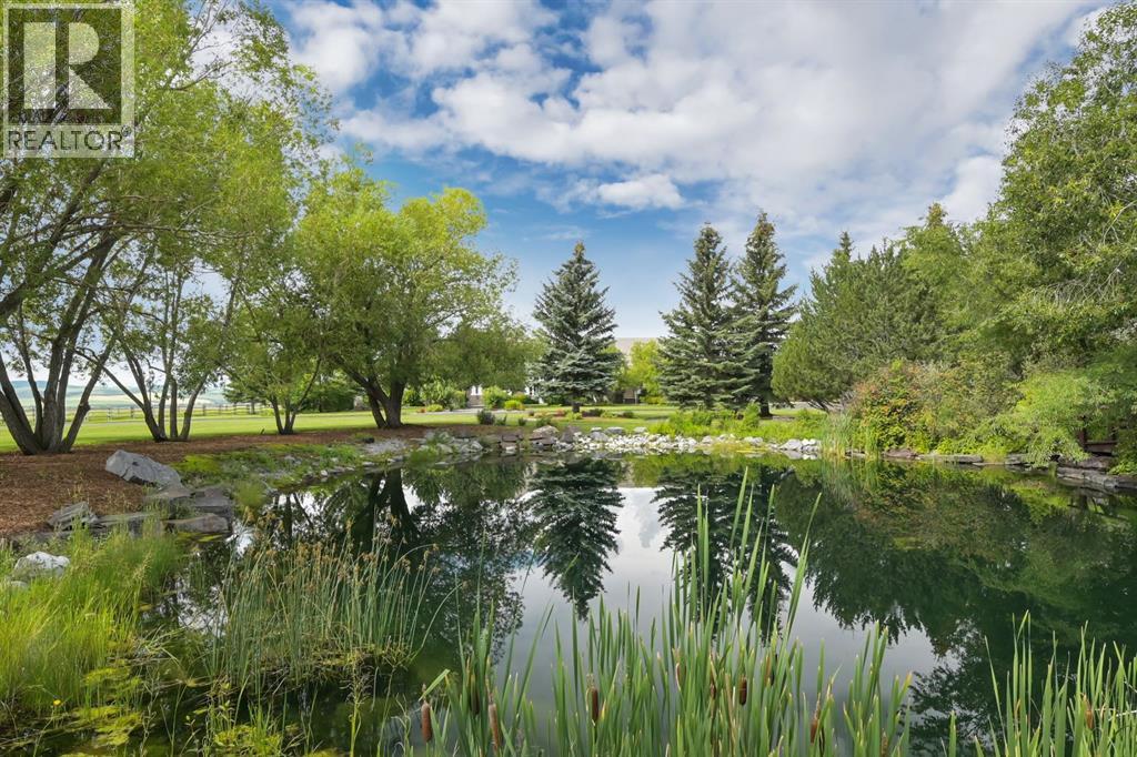 Set on 4.94 acres in the scenic beauty of Rural Foothills County, this impeccably maintained bungalow offers over 9,500 square feet of living space—providing the peace and privacy of a country estate just a short drive from Calgary’s downtown core. From the moment you arrive, the stately brick exterior, durable clay tile roof, and manicured landscaping hint at the exceptional quality within. A serene pond with a cascading waterfall sets a tranquil tone, while a beautifully landscaped courtyard adds to the property’s charm. Inside, a grand marble-floored entryway opens into the expansive living room, where a wood-burning fireplace and large west-facing windows frame spectacular mountain views. Rich hardwood floors flow throughout the main level, complementing the timeless design. The chef’s kitchen, crafted by Empire Kitchen and Bath, features Gaggenau and Sub-Zero appliances, custom cabinetry, and generous prep space. A den and an office with custom built-ins offer quiet retreats, while the massive primary bedroom boasts a walk-in closet and a spa-inspired ensuite with a soaker tub. Two additional bedrooms and a well-appointed mud/laundry room off the heated triple-car garage complete the main level. Outdoor living is elevated with a massive west-facing deck, complete with a built-in BBQ that steps down into a beautifully landscaped garden with stone walkway. The lower level includes a fully built-out legal nanny suite with kitchen, living room, and bedroom, thoughtfully tucked away for privacy. Additional spaces include a games room, billiards room, recreation area, exercise space, full wet bar, a fourth bedroom, and two more wood-burning fireplaces. An extraordinary 2,300 square feet RV garage/workshop offers endless possibilities for collectors, hobbyists, or large-scale projects. Blending elegance, functionality, and an enviable location, this estate is just minutes from Calgary’s city limits, Strathcona-Tweedsmuir School, the Calgary Polo Club, and Spruce Meado ws—delivering a rare combination of luxury, privacy, and convenience. (id:63190)