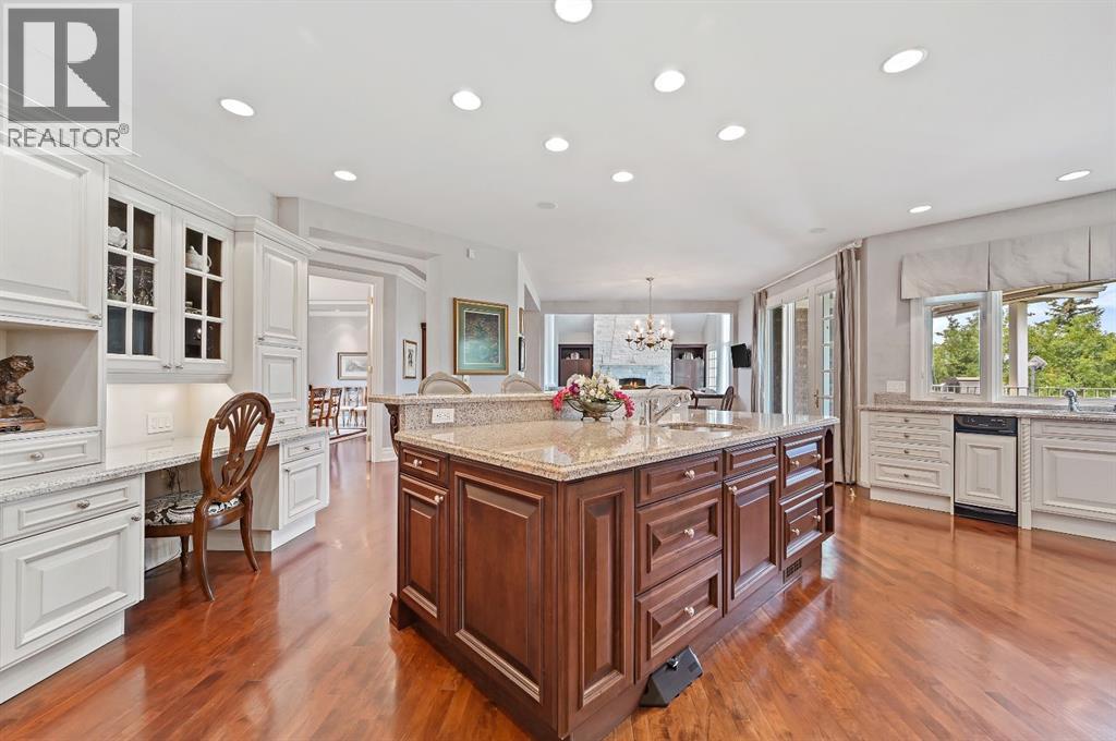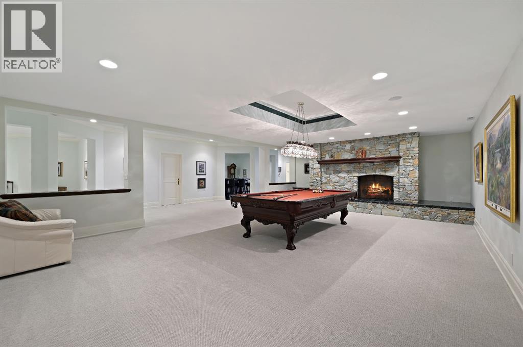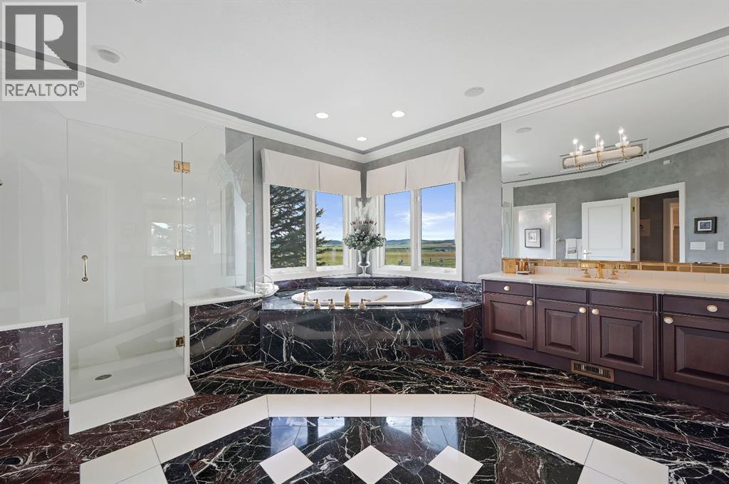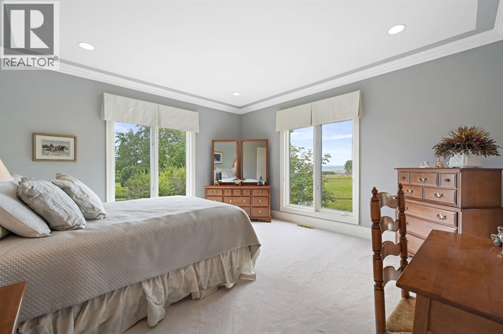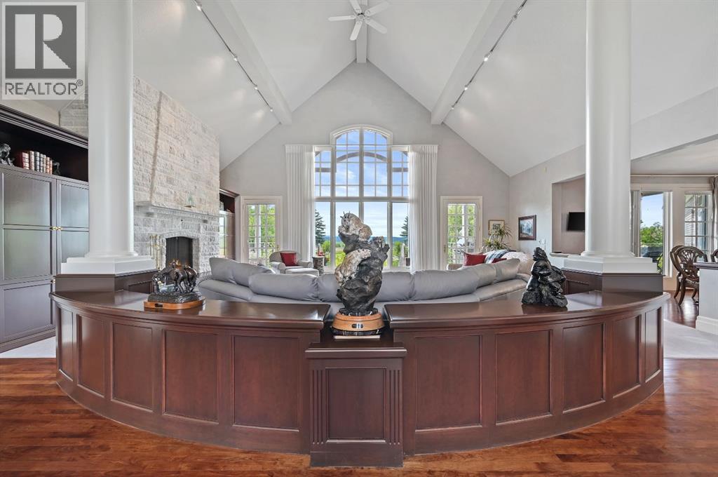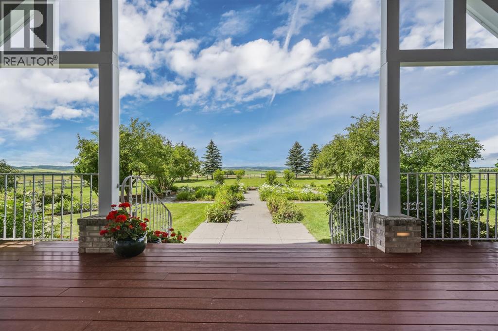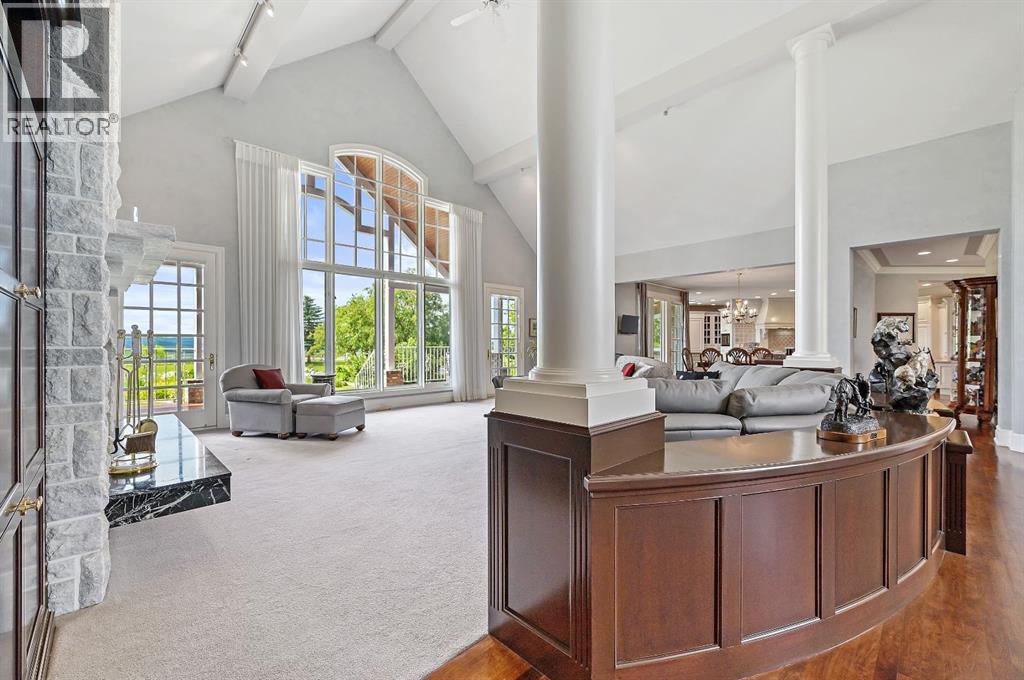 Set on 4.94 acres in the scenic beauty of Rural Foothills County, this impeccably maintained bungalow offers over 9,500 square feet of living space—providing the peace and privacy of a country estate just a short drive from Calgary’s downtown core. From the moment you arrive, the stately brick exterior, durable clay tile roof, and manicured landscaping hint at the exceptional quality within. A serene pond with a cascading waterfall sets a tranquil tone, while a beautifully landscaped courtyard adds to the property’s charm. Inside, a grand marble-floored entryway opens into the expansive living room, where a wood-burning fireplace and large west-facing windows frame spectacular mountain views. Rich hardwood floors flow throughout the main level, complementing the timeless design. The chef’s kitchen, crafted by Empire Kitchen and Bath, features Gaggenau and Sub-Zero appliances, custom cabinetry, and generous prep space. A den and an office with custom built-ins offer quiet retreats, while the massive primary bedroom boasts a walk-in closet and a spa-inspired ensuite with a soaker tub. Two additional bedrooms and a well-appointed mud/laundry room off the heated triple-car garage complete the main level. Outdoor living is elevated with a massive west-facing deck, complete with a built-in BBQ that steps down into a beautifully landscaped garden with stone walkway. The lower level includes a fully built-out legal nanny suite with kitchen, living room, and bedroom, thoughtfully tucked away for privacy. Additional spaces include a games room, billiards room, recreation area, exercise space, full wet bar, a fourth bedroom, and two more wood-burning fireplaces. An extraordinary 2,300 square feet RV garage/workshop offers endless possibilities for collectors, hobbyists, or large-scale projects. Blending elegance, functionality, and an enviable location, this estate is just minutes from Calgary’s city limits, Strathcona-Tweedsmuir School, the Calgary Polo Club, and Spruce Meado ws—delivering a rare combination of luxury, privacy, and convenience. (id:63190)