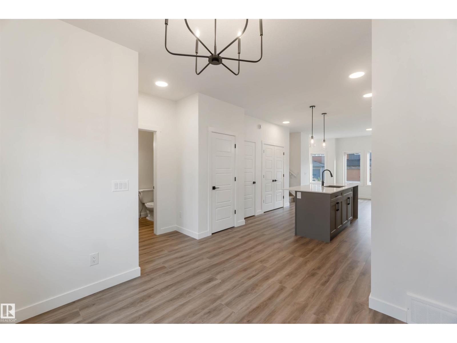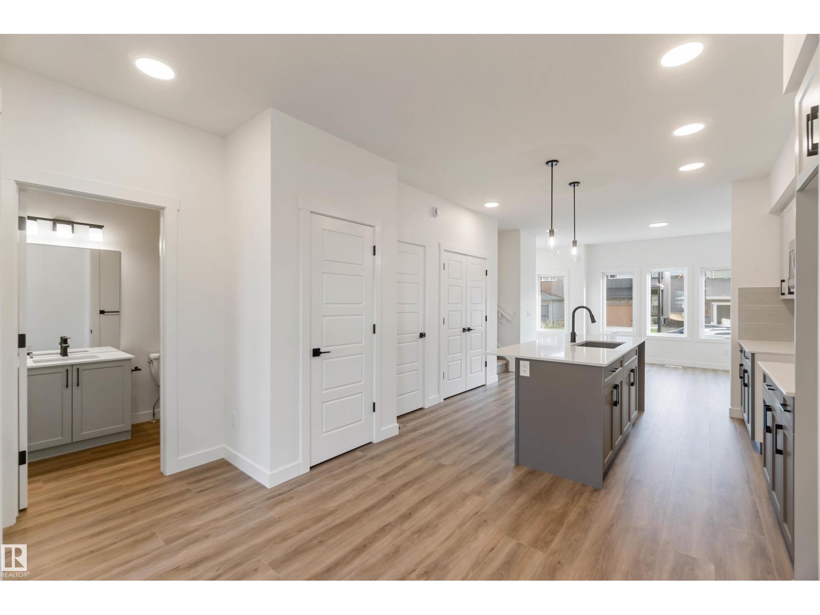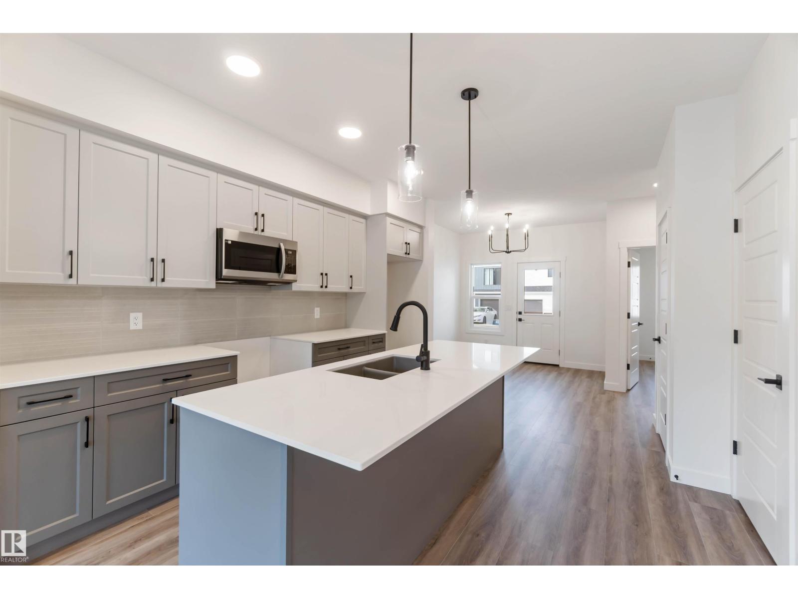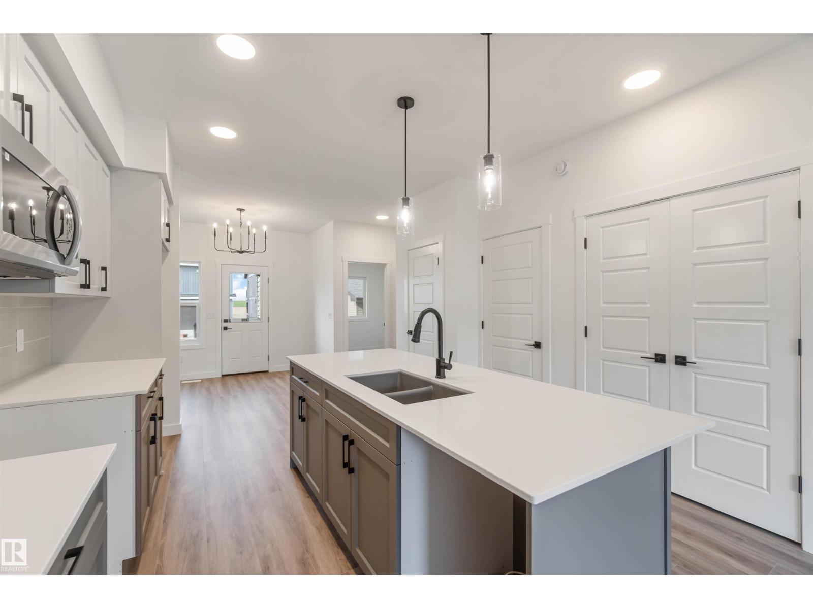 Built by Sterling Homes, this elegant 4-bed home comes with luxurious vinyl plank flooring and a bright foyer leading to a cozy great room. The kitchen impresses with quartz countertops, a functional island with a silgranit sink, pendant lighting, soft-close cabinetry, and an over-the-range microwave, complemented by a roomy pantry. At the rear, a sunlit nook overlooks the backyard, alongside a main-floor bedroom, a 3-piece bath with a stand-up shower, and a garden door to outdoor space. A parking pad is included, with an option for a detached two-car garage. Upstairs, the primary suite offers a walk-in closet, and a 3-piece ensuite with tub/shower, two additional bedrooms, another 3-piece bath, and a laundry closet complete the level. Features include 9-ft ceilings on main and basement floors, a separate side entrance, brushed nickel fixtures, and basement rough-in plumbing. (id:63190)