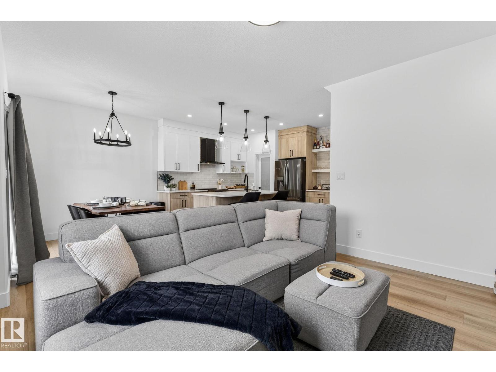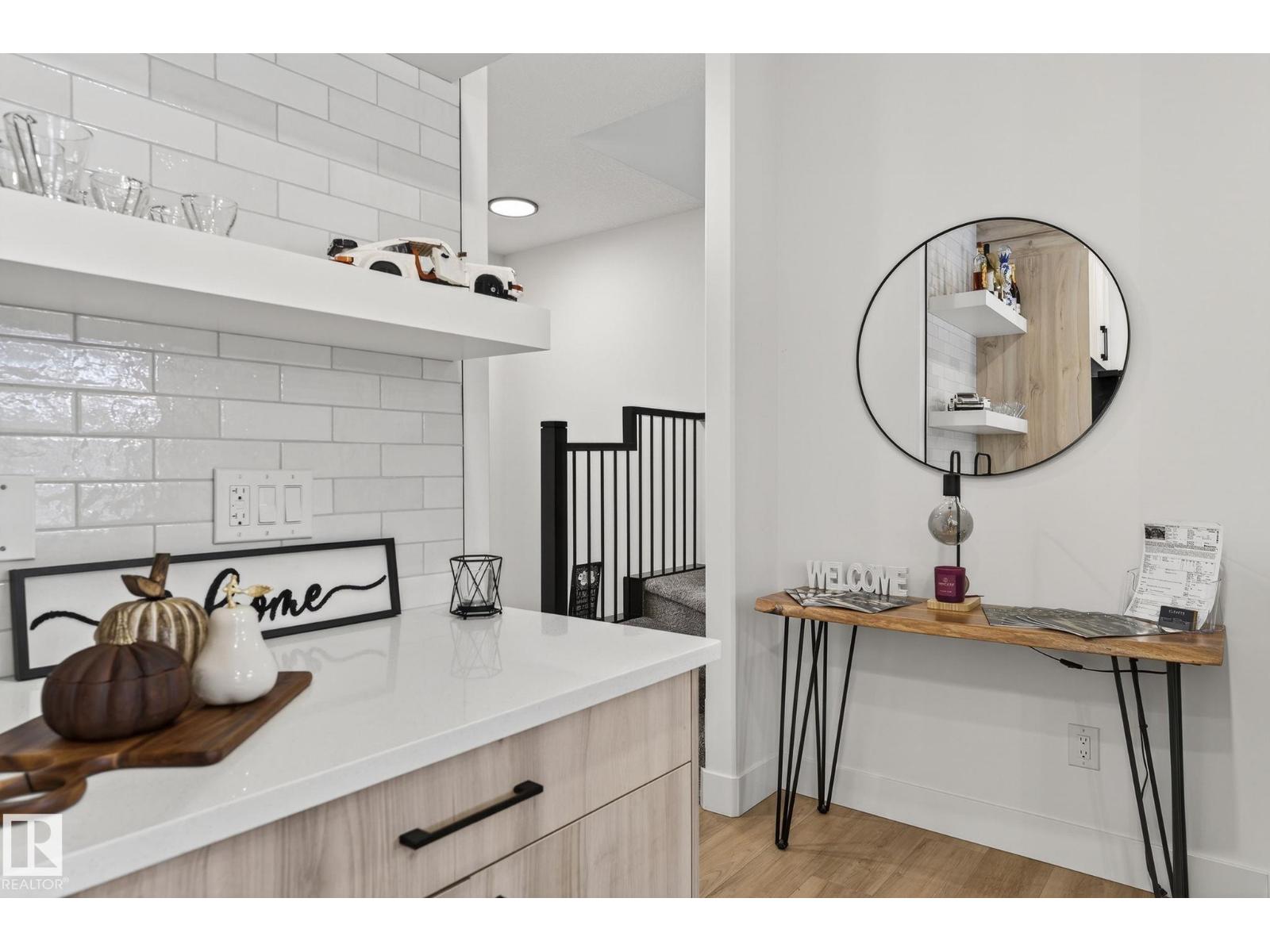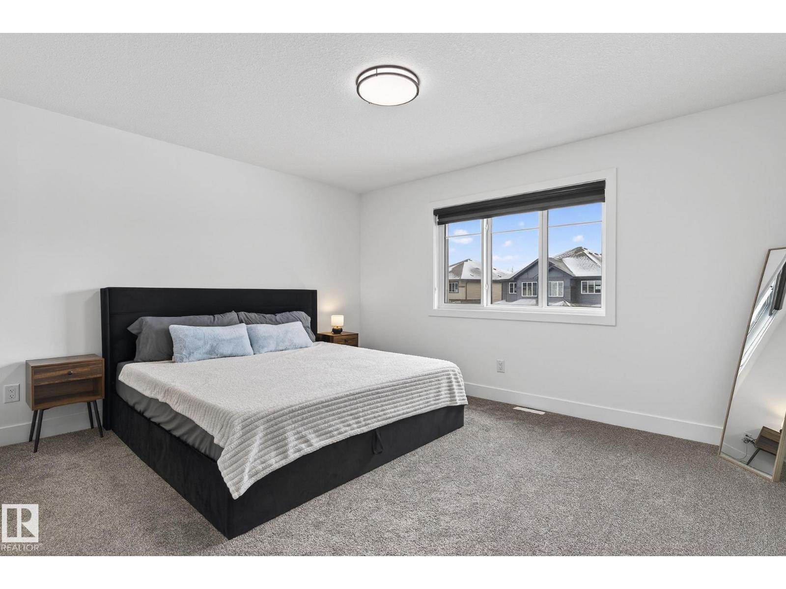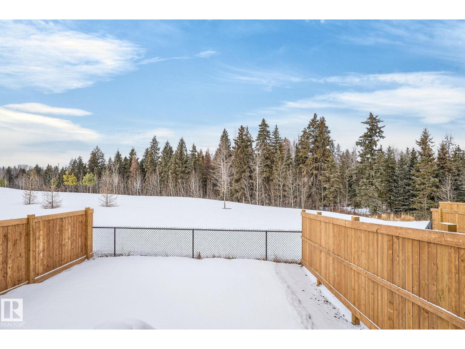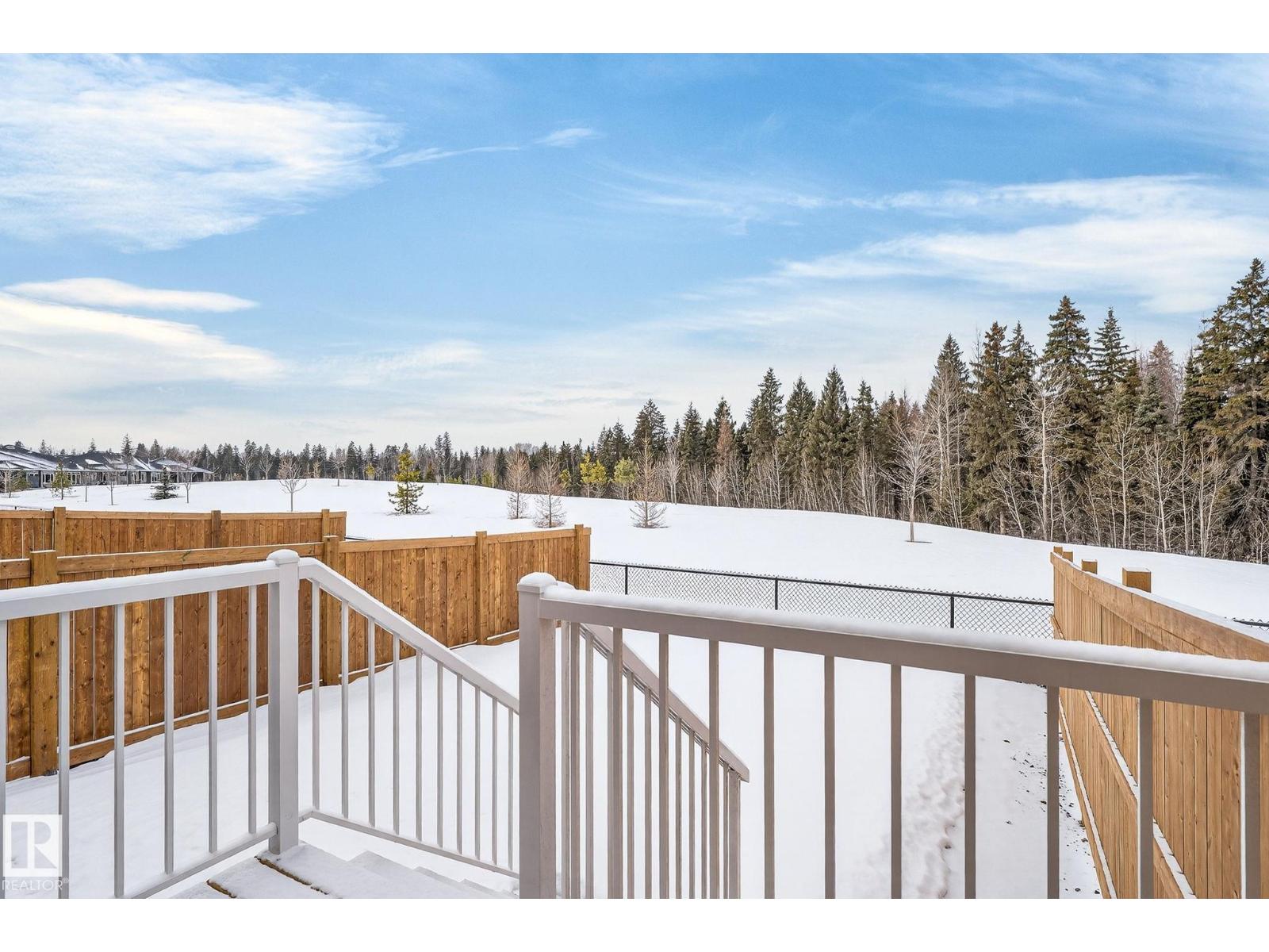Welcome to this beautiful half duplex in Harvest Ridge, perfectly positioned backing onto mature trees. The main floor is thoughtfully designed with a bright, open-concept filled with natural light, which makes an immediate impression with its modern floor-to-ceiling feature wall and sleek electric fireplace. The kitchen is beautifully appointed with quartz countertops, soft-close cabinetry, and a walk-through pantry. Upstairs, a spacious bonus room offers flexible living space, while the primary suite offers a 4-piece ensuite and a generous walk-in closet that conveniently connects to the laundry room. Two additional bedrooms and a second 4-piece bath complete this level. Thoughtfully designed with MDF shelving throughout every closet, pantry, and mudroom, plus upgrades like a garage drain and BBQ gas line, blending style with function. A fully fenced backyard and an unfinished basement with a side entrance offer incredible future potential. This home is move-in ready and beautifully finished! (id:63190)