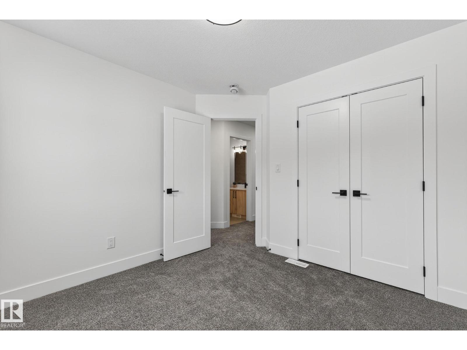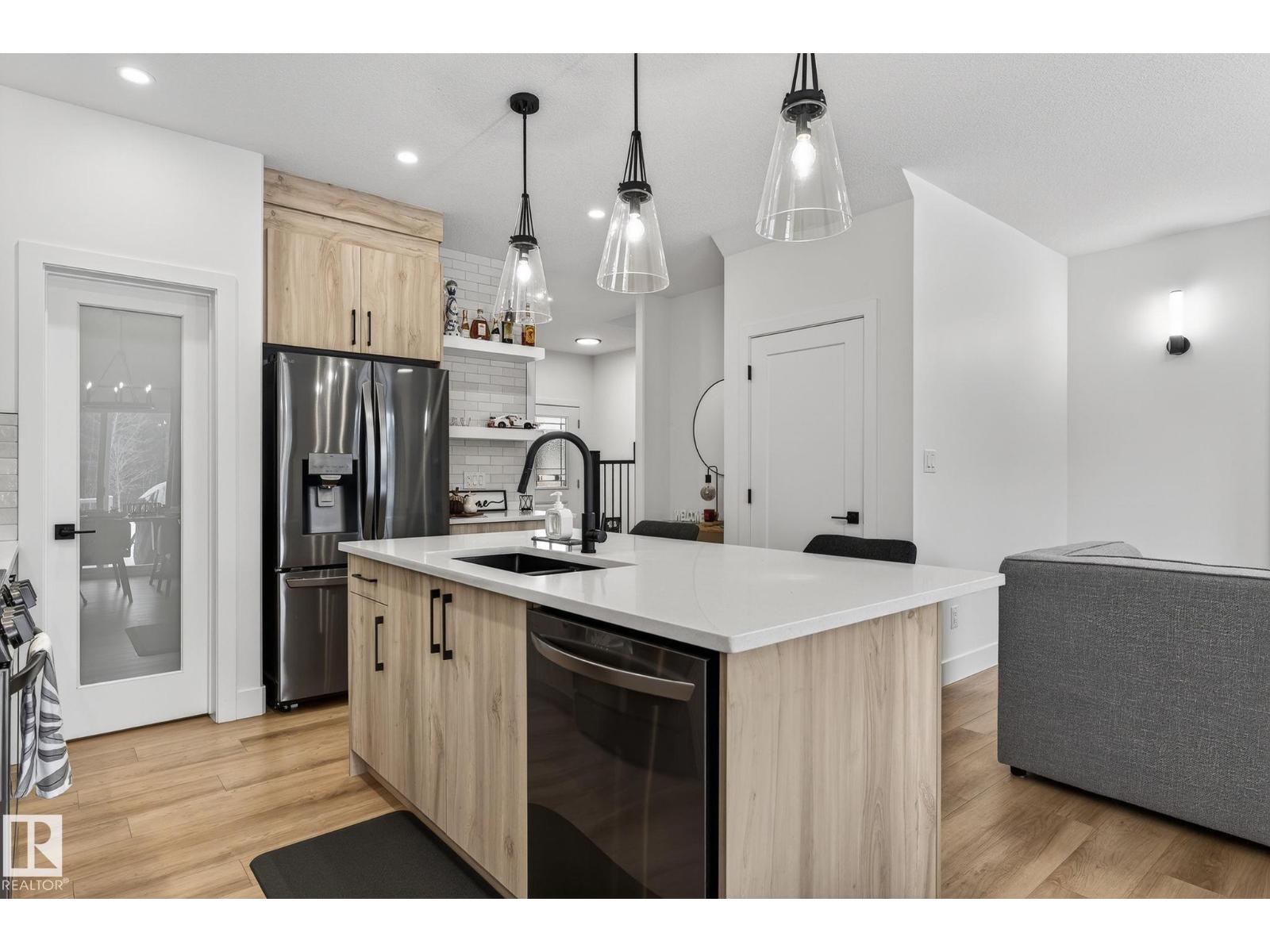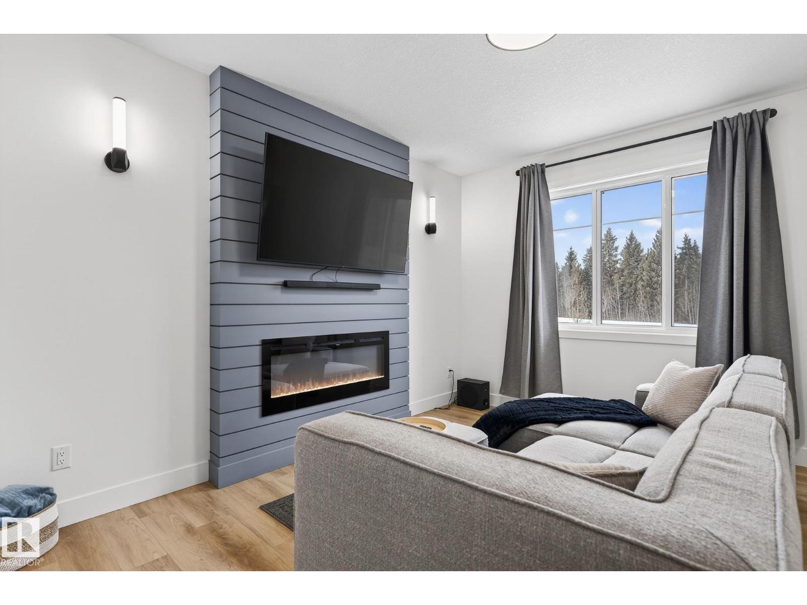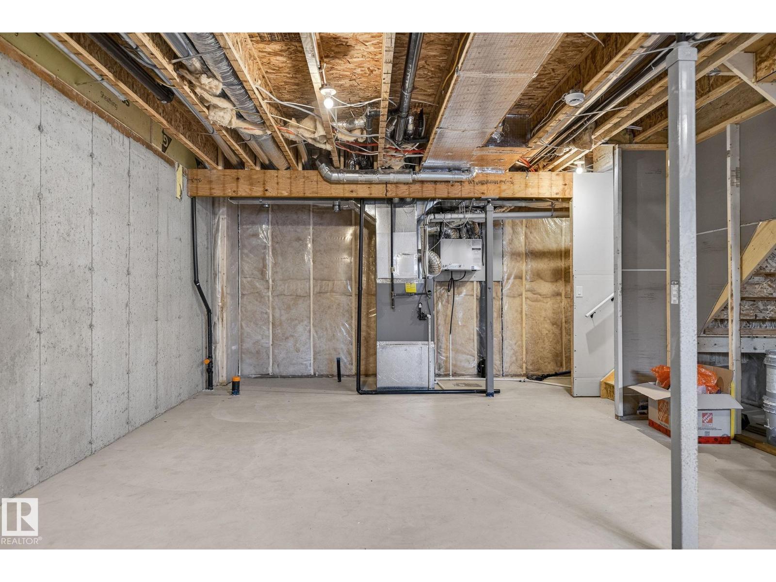 Welcome to this beautiful half duplex in Harvest Ridge, perfectly positioned backing onto mature trees. The main floor is thoughtfully designed with a bright, open-concept filled with natural light, which makes an immediate impression with its modern floor-to-ceiling feature wall and sleek electric fireplace. The kitchen is beautifully appointed with quartz countertops, soft-close cabinetry, and a walk-through pantry. Upstairs, a spacious bonus room offers flexible living space, while the primary suite offers a 4-piece ensuite and a generous walk-in closet that conveniently connects to the laundry room. Two additional bedrooms and a second 4-piece bath complete this level. Thoughtfully designed with MDF shelving throughout every closet, pantry, and mudroom, plus upgrades like a garage drain and BBQ gas line, blending style with function. A fully fenced backyard and an unfinished basement with a side entrance offer incredible future potential. This home is move-in ready and beautifully finished! (id:63190)