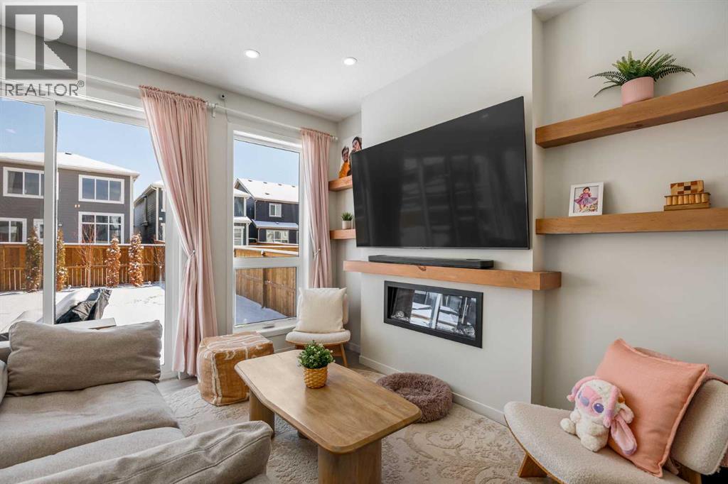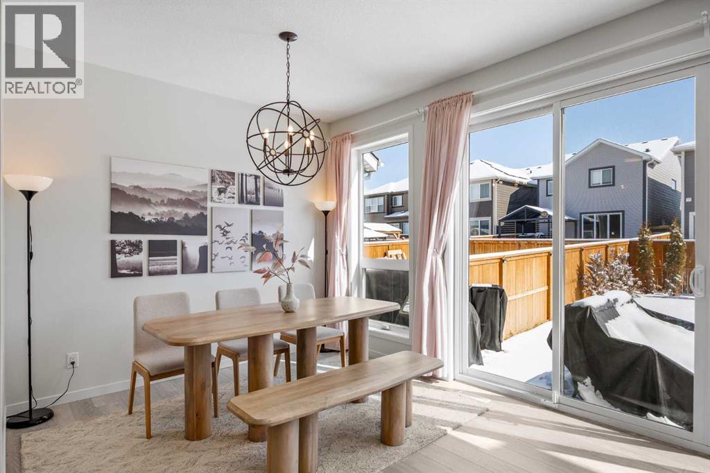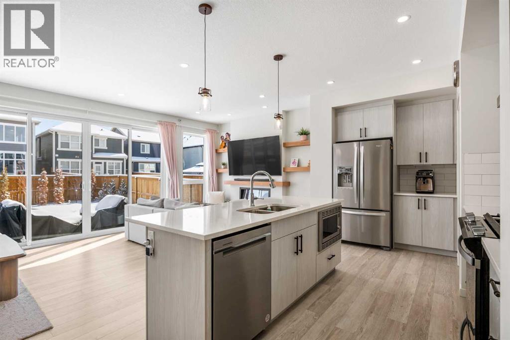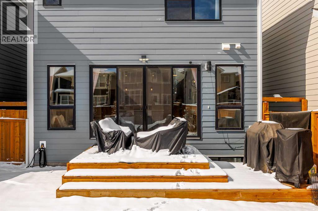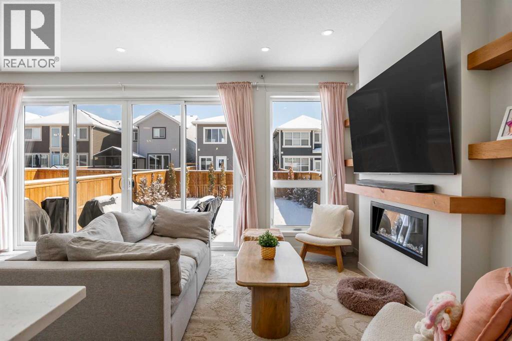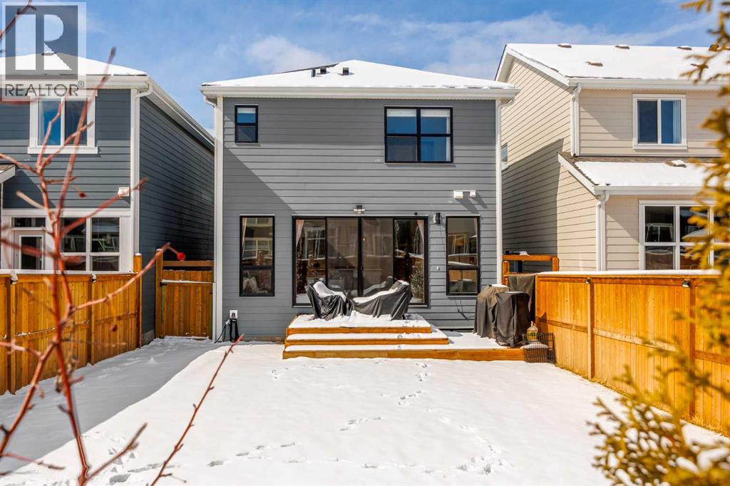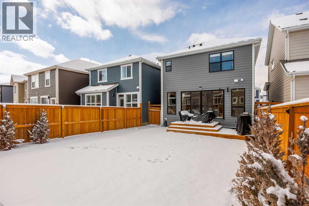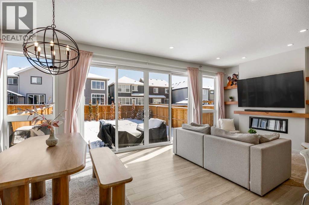 Welcome to this beautifully finished, fully developed home in Mahogany, offering over 1,700 sq ft above grade plus a builder finished basement for a truly turnkey opportunity. Thoughtfully designed in warm, modern tones, this home stands out with an airy Scandinavian inspired feel, a functional family layout, and one of its most compelling features: an exceptional indoor-outdoor living experience that is rarely found in the area. From the moment you step inside, the home makes a strong first impression with a spacious front entry, complete with a front closet and convenient access to both the upper and lower levels. As you move into the heart of the home, the layout opens up beautifully with a central kitchen that anchors the space while overlooking the back dining area and living room, creating the kind of connected main floor that works just as well for daily life as it does for entertaining. The kitchen is a true showpiece, finished with stylish white oak-inspired cabinetry, black hardware, raised cabinetry to the bulkhead, stainless steel appliances, a gas stove, elongated white subway tile backsplash, and white quartz counters with soft grey veining. A large central island offers plenty of prep space and casual seating, while the walk-through pantry connects seamlessly to the back mudroom and double attached garage. At the rear of the home, the living and dining spaces are filled with natural light through the wall to wall windows and patio doors, designed to make the most of the backyard setting (but don't worry the central A/C will keep you cool all summer long). The living room is warm and inviting, highlighted by an electric fireplace with a wood mantle and built-in wood shelving. The dining area is generously sized with a modern light fixture above, while dual central sliding patio doors create a standout feature, opening the home to the deck and oversized backyard beyond. With more outdoor space than many homes in the area and trees along the back, this s etting creates a rare and highly desirable indoor-outdoor lifestyle. Upstairs, a central bonus room with a transom window creates a bright and versatile second living space, while glass railing wraps the upper level and enhances the open feel throughout. The primary suite is a relaxing retreat with a walk-in closet complete with organizers and a beautifully finished 5 piece ensuite featuring dual sinks, a soaker tub, a standalone shower, and marble look vinyl tile flooring. Two additional bedrooms, a full 4 piece bathroom, and a separate laundry room complete the upper level. The fully finished basement adds even more value, offering a central rec room, a full bedroom, a 4-piece bathroom, and a mechanical room that still provides excellent storage. Located close to two playgrounds and in one of Calgary’s most sought-after lake communities, Mahogany offers an unmatched lifestyle with lake access, beaches, pathways, parks, schools, shops, and restaurants all nearby. (id:63190)
