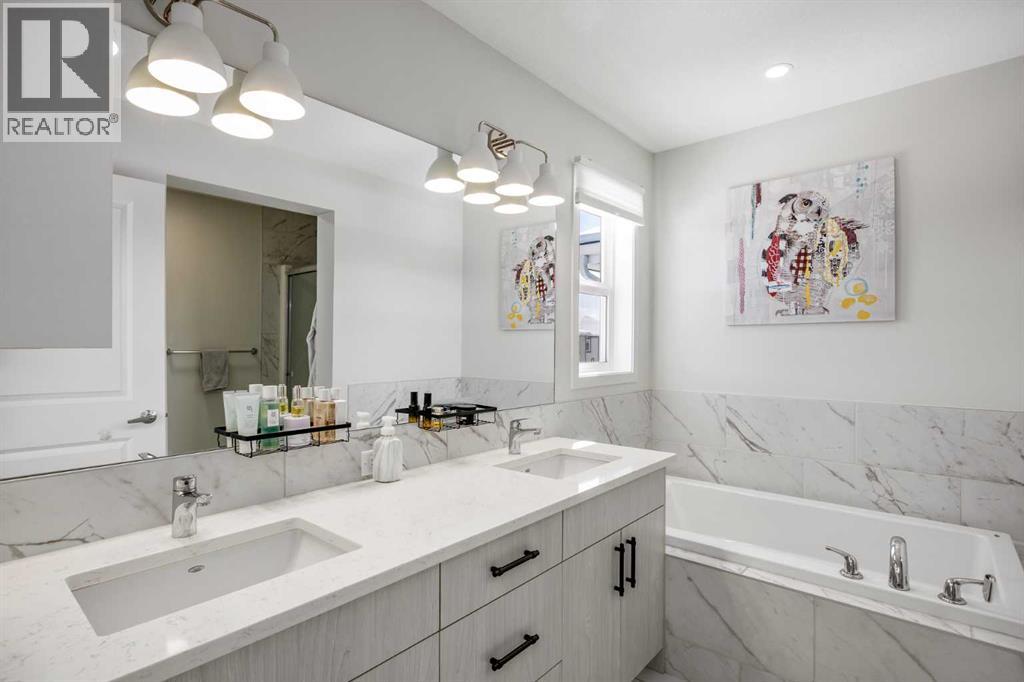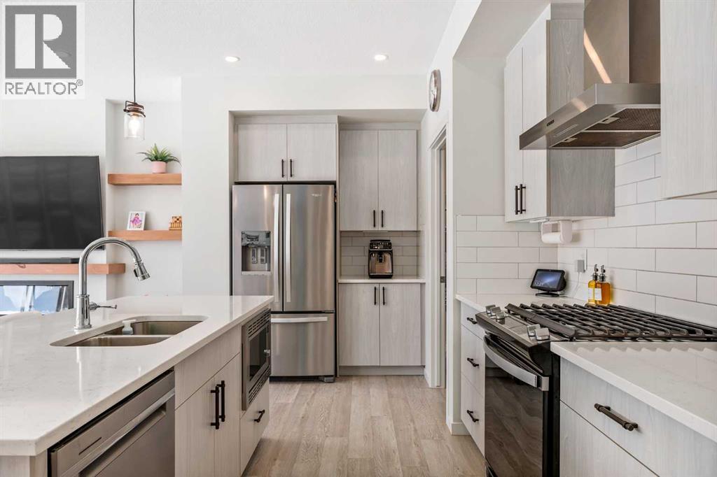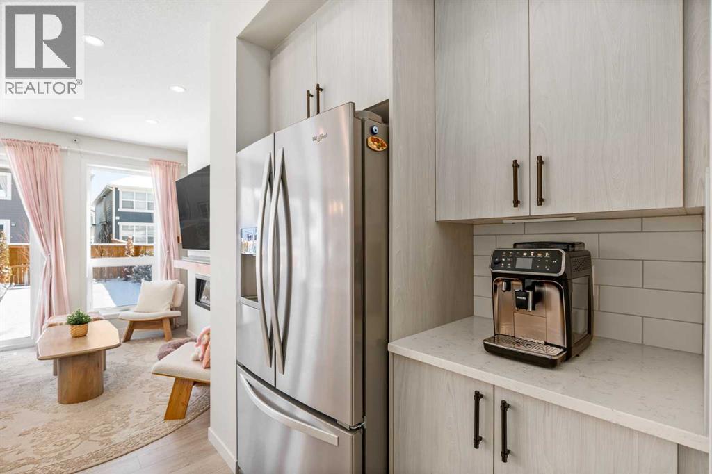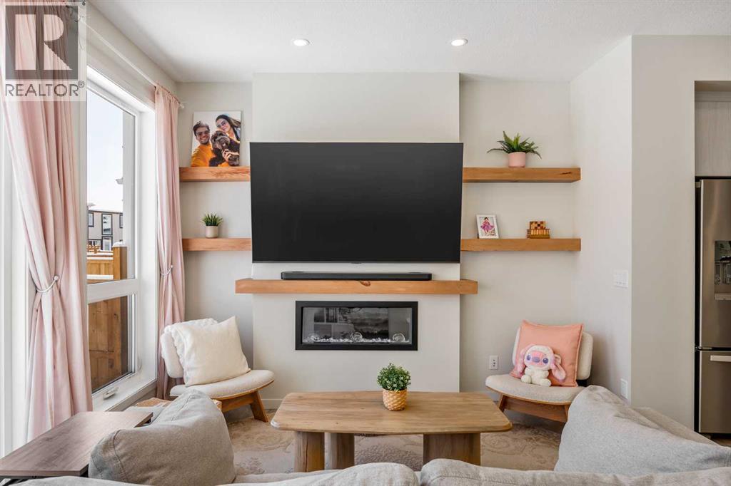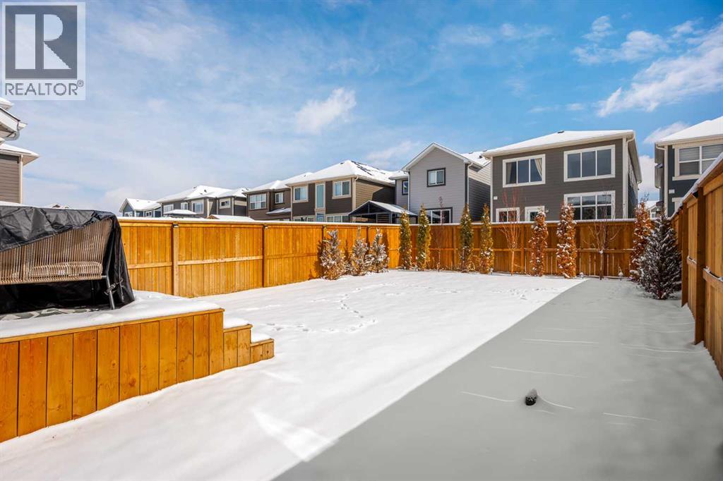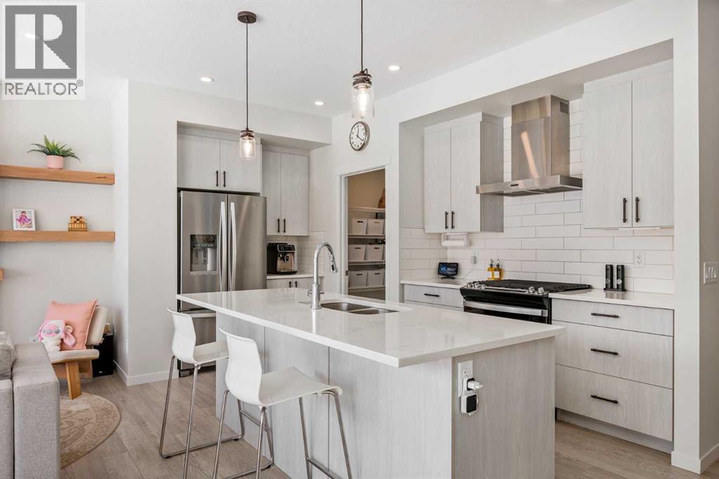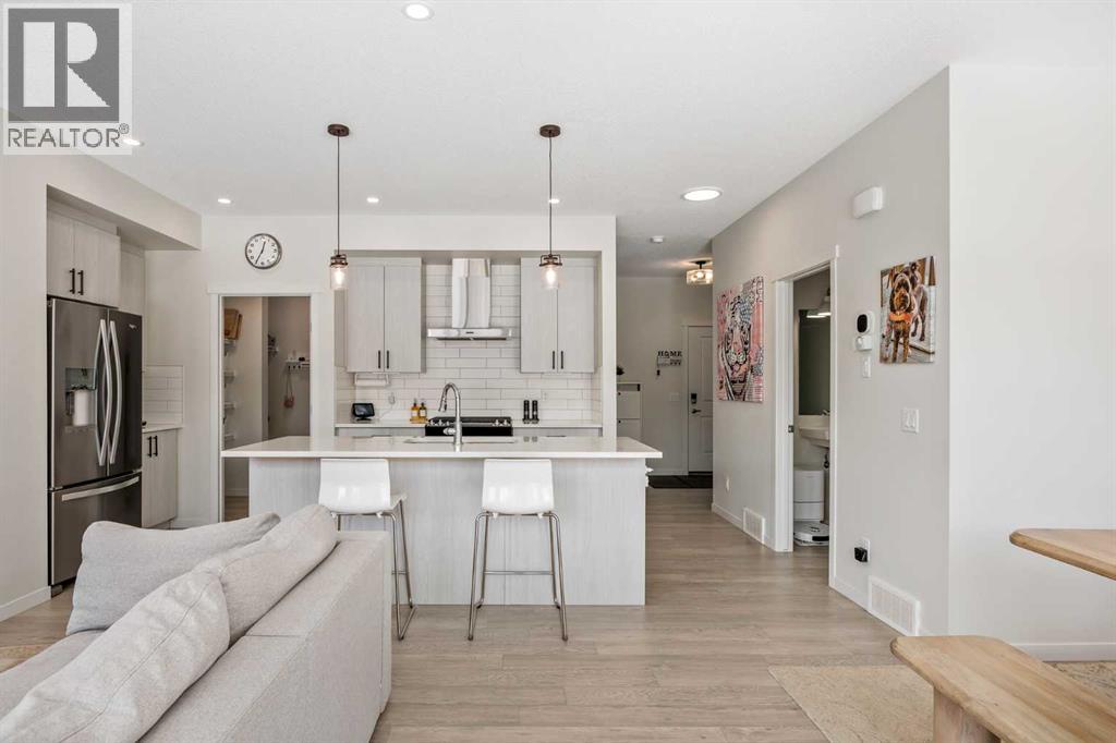 Welcome to this beautifully finished, fully developed home in Mahogany, offering over 1,700 sq ft above grade plus a builder finished basement for a truly turnkey opportunity. Thoughtfully designed in warm, modern tones, this home stands out with an airy Scandinavian inspired feel, a functional family layout, and one of its most compelling features: an exceptional indoor-outdoor living experience that is rarely found in the area. From the moment you step inside, the home makes a strong first impression with a spacious front entry, complete with a front closet and convenient access to both the upper and lower levels. As you move into the heart of the home, the layout opens up beautifully with a central kitchen that anchors the space while overlooking the back dining area and living room, creating the kind of connected main floor that works just as well for daily life as it does for entertaining. The kitchen is a true showpiece, finished with stylish white oak-inspired cabinetry, black hardware, raised cabinetry to the bulkhead, stainless steel appliances, a gas stove, elongated white subway tile backsplash, and white quartz counters with soft grey veining. A large central island offers plenty of prep space and casual seating, while the walk-through pantry connects seamlessly to the back mudroom and double attached garage. At the rear of the home, the living and dining spaces are filled with natural light through the wall to wall windows and patio doors, designed to make the most of the backyard setting (but don't worry the central A/C will keep you cool all summer long). The living room is warm and inviting, highlighted by an electric fireplace with a wood mantle and built-in wood shelving. The dining area is generously sized with a modern light fixture above, while dual central sliding patio doors create a standout feature, opening the home to the deck and oversized backyard beyond. With more outdoor space than many homes in the area and trees along the back, this s etting creates a rare and highly desirable indoor-outdoor lifestyle. Upstairs, a central bonus room with a transom window creates a bright and versatile second living space, while glass railing wraps the upper level and enhances the open feel throughout. The primary suite is a relaxing retreat with a walk-in closet complete with organizers and a beautifully finished 5 piece ensuite featuring dual sinks, a soaker tub, a standalone shower, and marble look vinyl tile flooring. Two additional bedrooms, a full 4 piece bathroom, and a separate laundry room complete the upper level. The fully finished basement adds even more value, offering a central rec room, a full bedroom, a 4-piece bathroom, and a mechanical room that still provides excellent storage. Located close to two playgrounds and in one of Calgary’s most sought-after lake communities, Mahogany offers an unmatched lifestyle with lake access, beaches, pathways, parks, schools, shops, and restaurants all nearby. (id:63190)