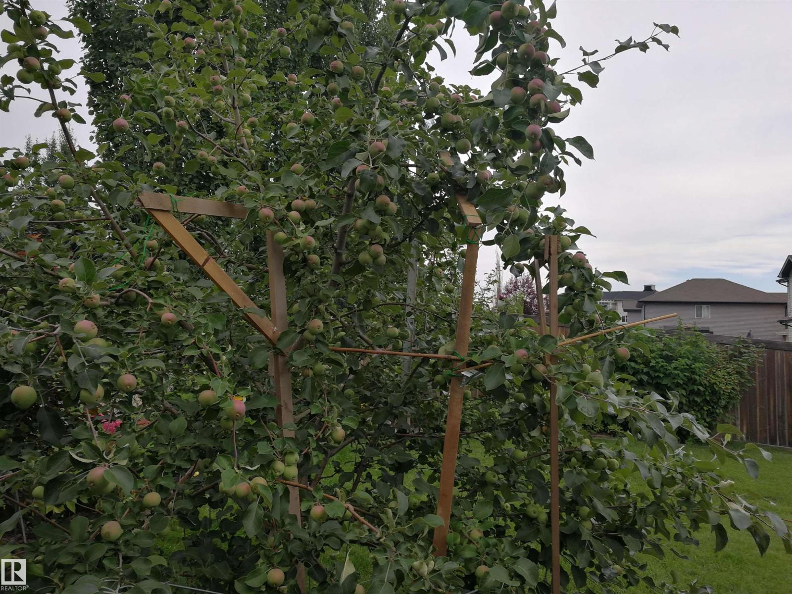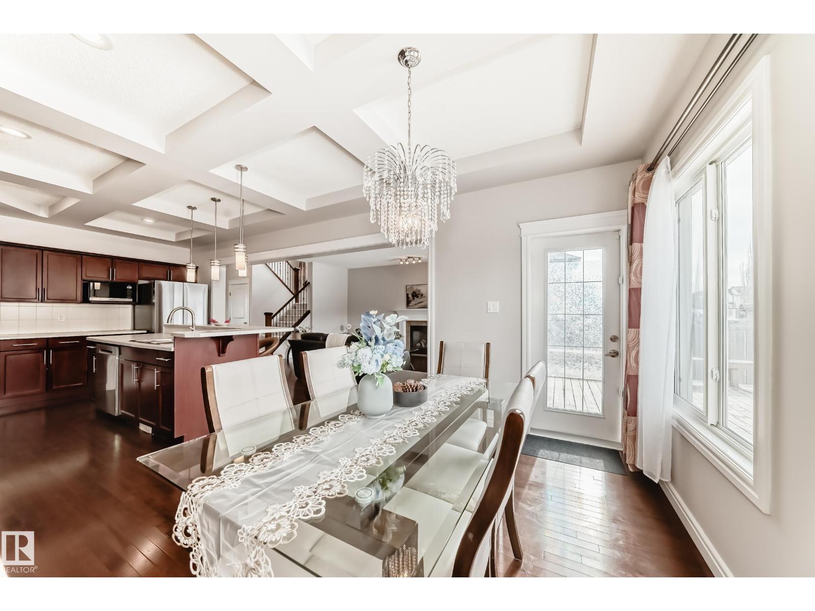 Rare opportunity to own a huge lot backing onto a walking trail in desirable Rutherford, offering beautiful green views and even apple harvest. The oversized full-size deck is perfect for outdoor entertaining. Step inside to a bright and spacious living area, with 9’ ceilings, hardwood flooring, and central vacuum. A versatile den/office and an open-concept kitchen with elegant coffered ceiling, The dining area overlooks the backyard and walking trail. Upstairs, a large staircase window fills the home with natural light. The wide hallway leads to an oversized primary bedroom that easily fits a king-size bed, plus a spacious bonus room and two additional bright bedrooms. The fully finished basement offers a built-in home theatre, and a wet bar—perfect for family movie nights. Walking distance to schools, 5 minutes to Heritage Shopping Centre, with easy access to Anthony Henday Drive. Recent upgrades: Hot water tank (2024), Garage Door (2025), Refrigerator (2025), Dishwasher (2025), Fresh Paint (2026). (id:63190)