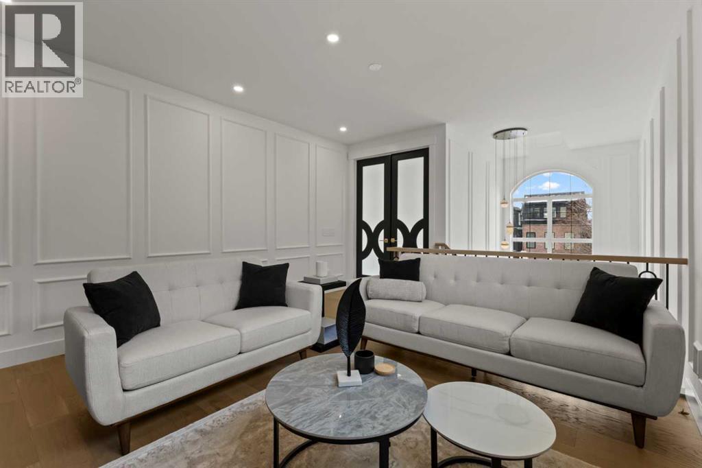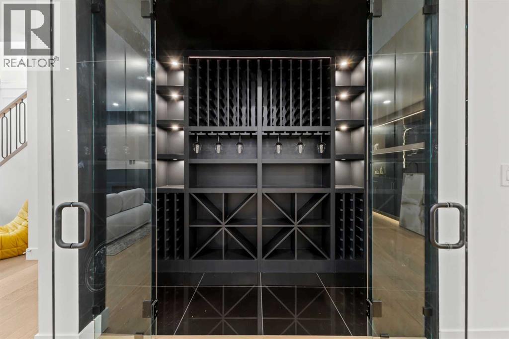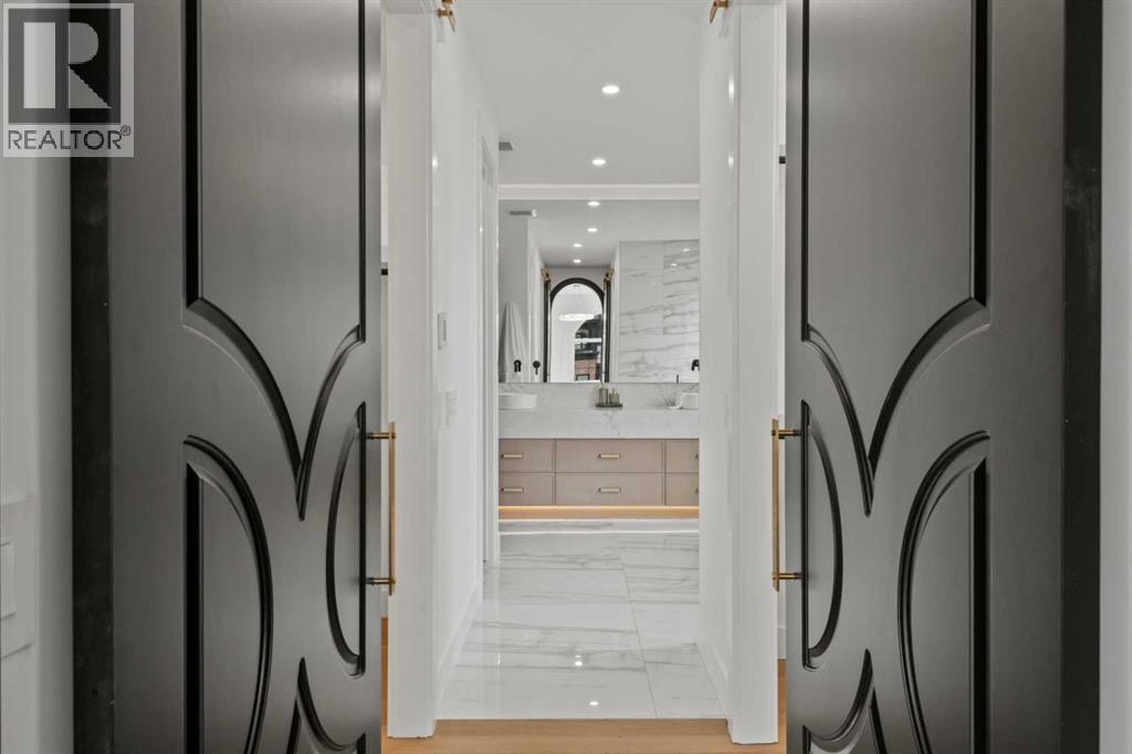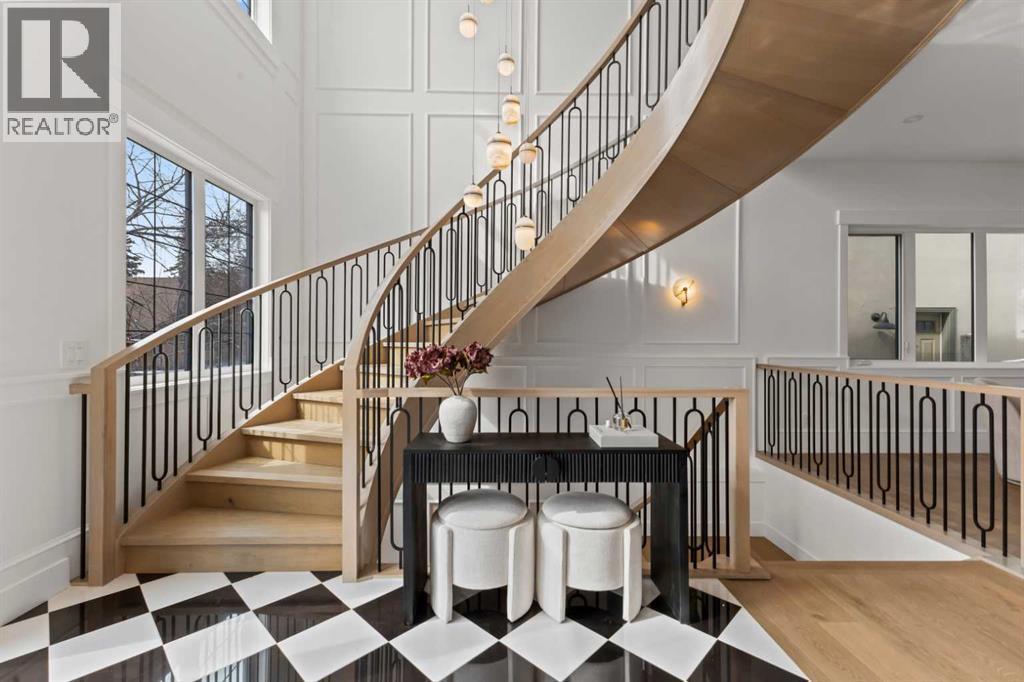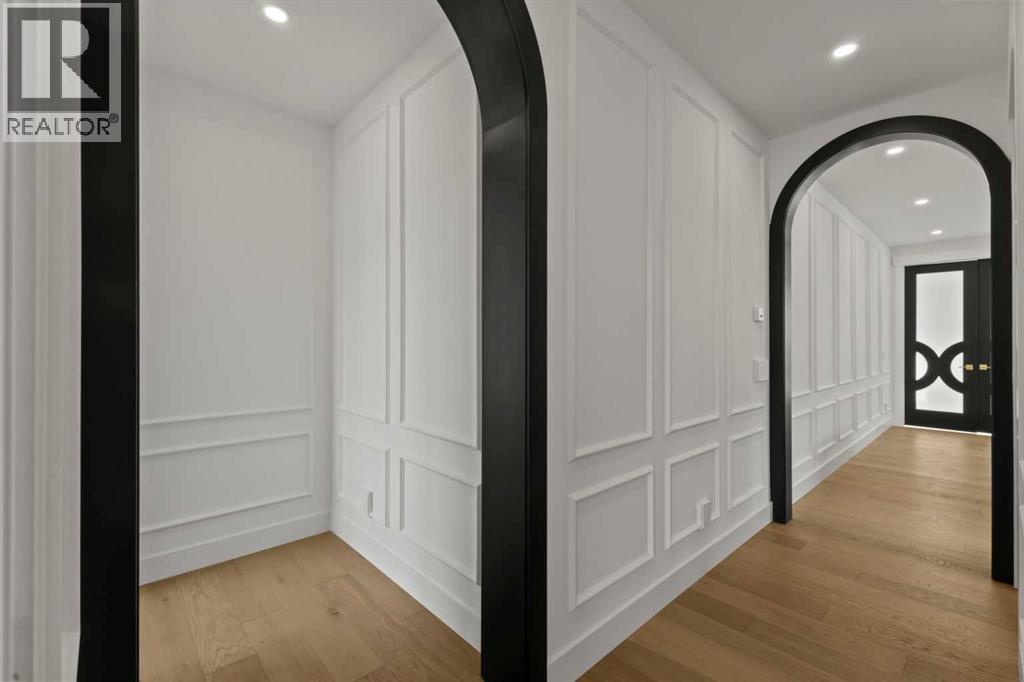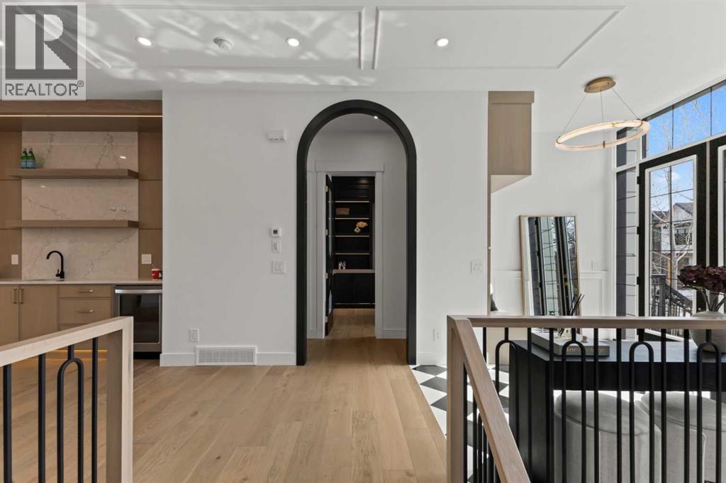 Over 4,200 sq ft of meticulously curated living space defines this exceptional estate by Moon Homes, where architectural elegance and elevated design come together in the heart of West Hillhurst.From the moment you arrive, the home makes a striking impression with full-height arched windows, a curved concrete front porch, elegant cast-iron fencing, and a beautifully illuminated exterior. The front steps are fully lit, while the signature front arch is softly illuminated, creating a dramatic presence day and night. Step inside to a breathtaking foyer anchored by a showpiece spiral staircase that immediately captures attention. Rich white oak paneling, extensive wainscoting, and elegant archways create a refined, cohesive aesthetic throughout.The main floor is designed for both grand entertaining and everyday luxury, featuring 10ft ceilings and engineered hardwood flooring. A private front office with custom built-in shelving and a large sun-filled window offers an ideal workspace. The formal dining area, framed by floor-to-ceiling windows, connects seamlessly to a custom wet bar and coffee station, while a stunning two-way gas fireplace elegantly divides the dining and living spaces. The living room is centred around a built-in feature wall and opens through dual sliding doors to the rear deck.At the heart of the home, the designer kitchen showcases custom cabinetry, a custom-crafted quartz island, quartz sink, and a striking quartz range hood. A premium appliance package and under-cabinet lighting elevate both form and function, while a large rear window fills the space with natural light. The mudroom offers built-in storage, coat closets, and direct access to a fully outfitted pantry with built-ins, leading to the triple detached garage.Upstairs, 9ft ceilings and oversized windows continue the sense of openness. A central bonus room provides flexible living space, while all bedrooms feature their own private ensuites. The primary retreat offers French doors , a private lounge area, and downtown views. Dual walk-through his-and-hers closets lead to a spa-inspired ensuite with heated floors, dual vanities, a freestanding soaker tub, and a fully tiled steam shower.The upper laundry room includes raised washer and dryer, quartz counters, upper cabinetry, and a sink for added convenience.The fully developed lower level features a spacious rec room, custom wet bar with quartz counters and island, built-in cabinetry, beverage fridge, and a walk-in wine room. A dedicated gym or flex space, an additional bedroom, and a full bathroom complete this level. Two furnaces provide efficient climate control for both upper levels and basement.Located steps from the Bow River pathways and minutes to Kensington, Edworthy Park, top schools, downtown, U of C, SAIT, and Foothills Hospital, with quick access to Crowchild Trail and Memorial Drive.A rare opportunity to own a truly refined inner-city estate crafted with precision and intention. (id:63190)