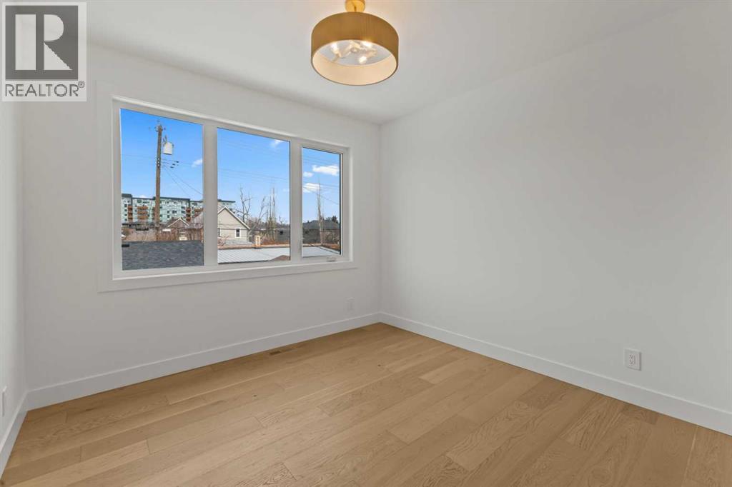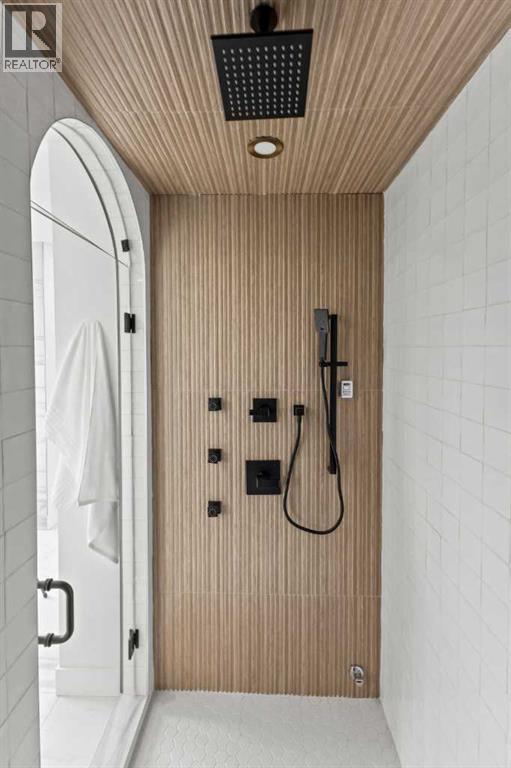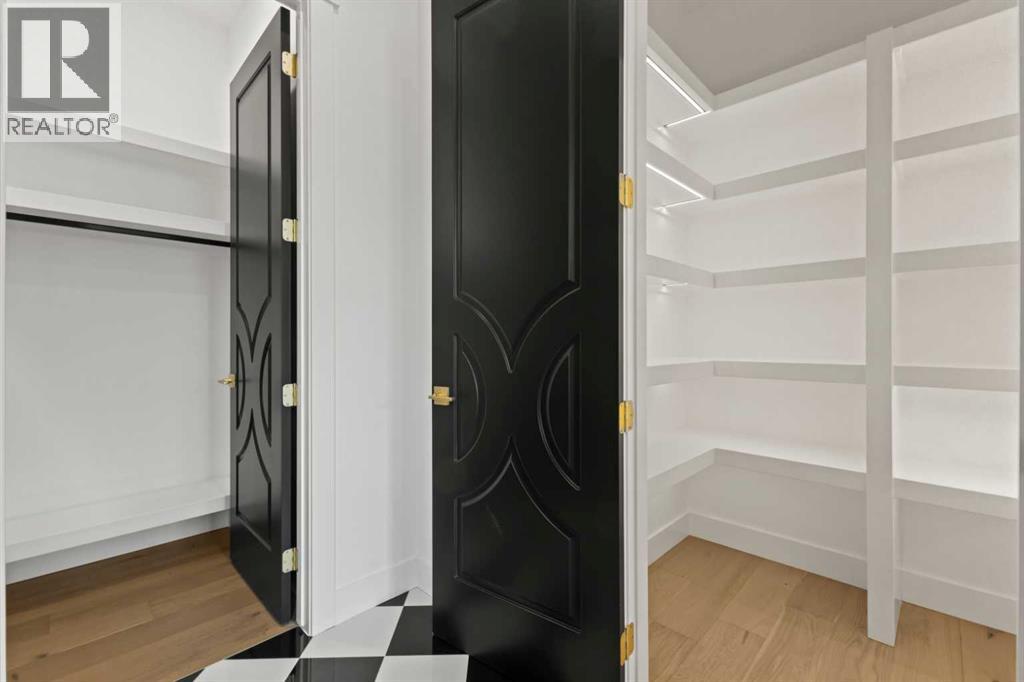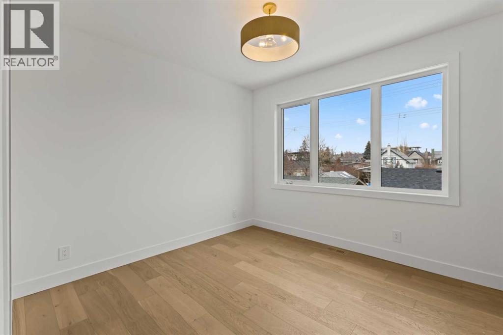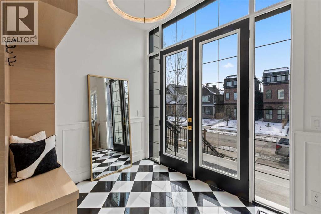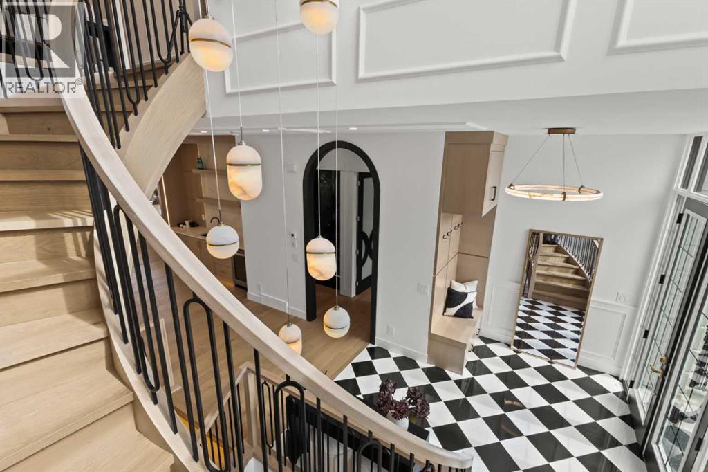 Over 4,200 sq ft of meticulously curated living space defines this exceptional estate by Moon Homes, where architectural elegance and elevated design come together in the heart of West Hillhurst.From the moment you arrive, the home makes a striking impression with full-height arched windows, a curved concrete front porch, elegant cast-iron fencing, and a beautifully illuminated exterior. The front steps are fully lit, while the signature front arch is softly illuminated, creating a dramatic presence day and night. Step inside to a breathtaking foyer anchored by a showpiece spiral staircase that immediately captures attention. Rich white oak paneling, extensive wainscoting, and elegant archways create a refined, cohesive aesthetic throughout.The main floor is designed for both grand entertaining and everyday luxury, featuring 10ft ceilings and engineered hardwood flooring. A private front office with custom built-in shelving and a large sun-filled window offers an ideal workspace. The formal dining area, framed by floor-to-ceiling windows, connects seamlessly to a custom wet bar and coffee station, while a stunning two-way gas fireplace elegantly divides the dining and living spaces. The living room is centred around a built-in feature wall and opens through dual sliding doors to the rear deck.At the heart of the home, the designer kitchen showcases custom cabinetry, a custom-crafted quartz island, quartz sink, and a striking quartz range hood. A premium appliance package and under-cabinet lighting elevate both form and function, while a large rear window fills the space with natural light. The mudroom offers built-in storage, coat closets, and direct access to a fully outfitted pantry with built-ins, leading to the triple detached garage.Upstairs, 9ft ceilings and oversized windows continue the sense of openness. A central bonus room provides flexible living space, while all bedrooms feature their own private ensuites. The primary retreat offers French doors , a private lounge area, and downtown views. Dual walk-through his-and-hers closets lead to a spa-inspired ensuite with heated floors, dual vanities, a freestanding soaker tub, and a fully tiled steam shower.The upper laundry room includes raised washer and dryer, quartz counters, upper cabinetry, and a sink for added convenience.The fully developed lower level features a spacious rec room, custom wet bar with quartz counters and island, built-in cabinetry, beverage fridge, and a walk-in wine room. A dedicated gym or flex space, an additional bedroom, and a full bathroom complete this level. Two furnaces provide efficient climate control for both upper levels and basement.Located steps from the Bow River pathways and minutes to Kensington, Edworthy Park, top schools, downtown, U of C, SAIT, and Foothills Hospital, with quick access to Crowchild Trail and Memorial Drive.A rare opportunity to own a truly refined inner-city estate crafted with precision and intention. (id:63190)