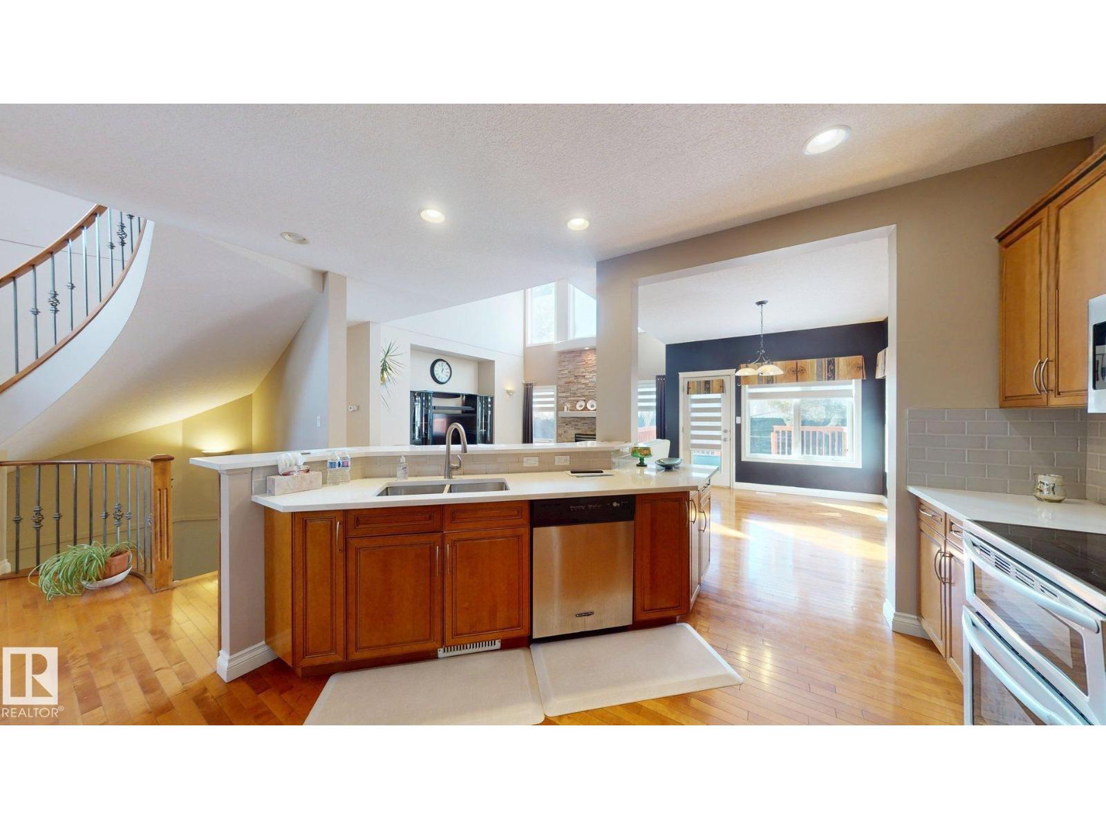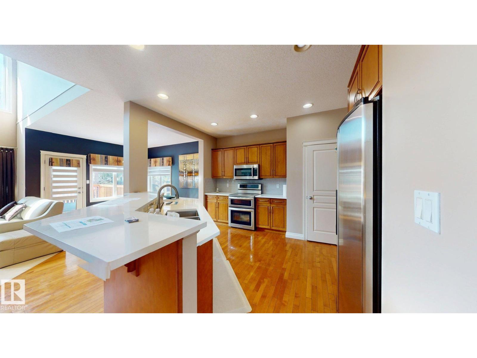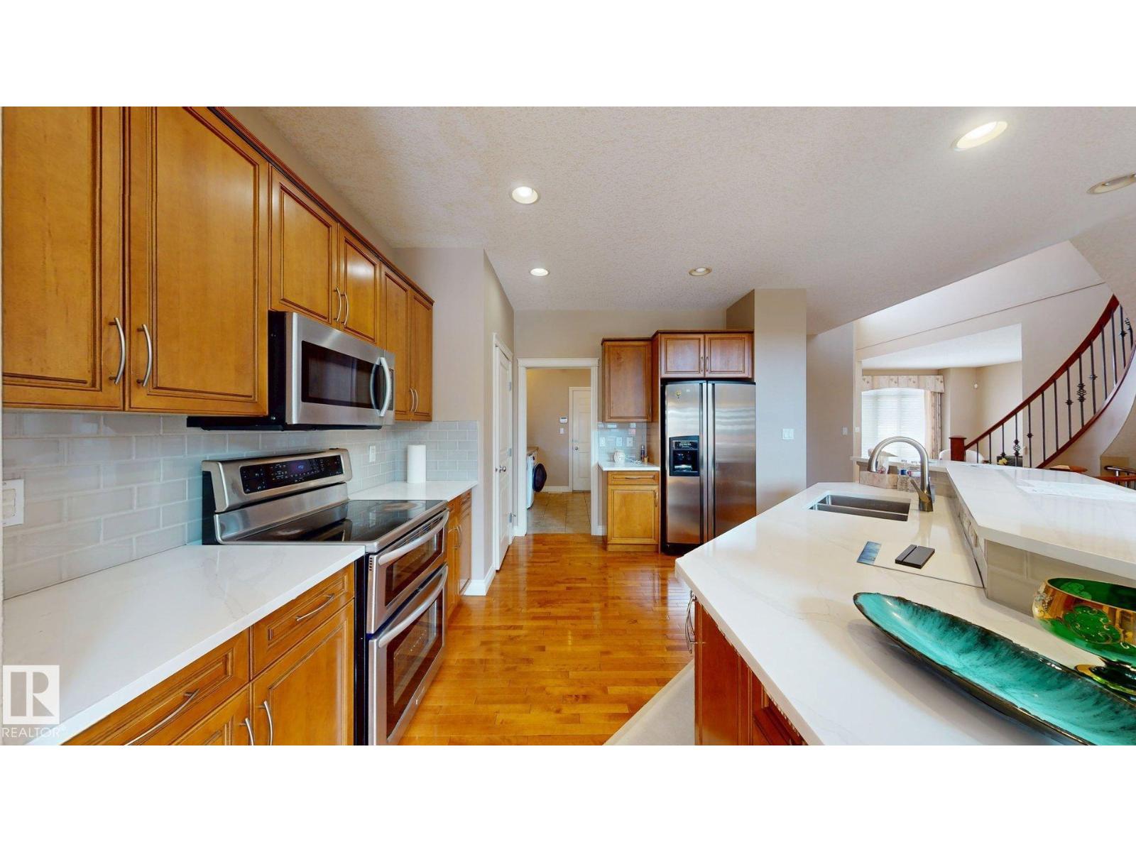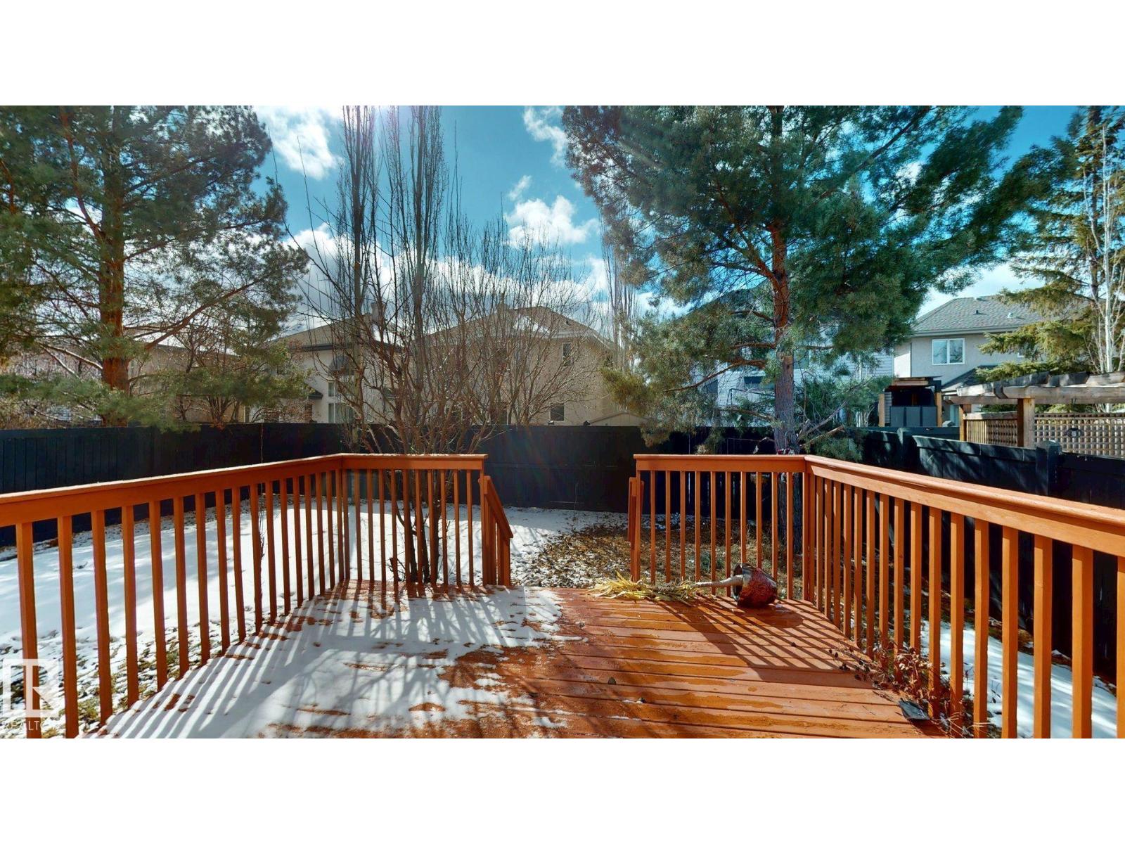 Welcome to this stunning home located in a quite cul-de-sac, just steps away from a large greenspace in the sought-after Terwillegar Gardens. Easy access to A. Henday and Terwillegar Drive. It comes with an oversized double garage and central ACs. The recently updated quartz countertops throughout the house and updated water tank which is less than a year old, adds to the huge windows throughout, offering incredible space, brightness and natural light. The main floor is thoughtfully laid out with a separate living room and formal dinning area, cozy family room with gas fireplace, a nook area, a spacious kitchen, home office/den, powder room and a laundry area. Upstairs features a large primary bedroom with 5-piece ensuite and walk-in closet, plus three more generously sized bedrooms and a full bathroom. The Fully Finished Basement includes a fifth bedroom flex room/home gym, recreation/media room, wet bar, bathroom, and tons of storage space. Enjoy a beautiful landscaped yard with mature trees and a deck. (id:63190)