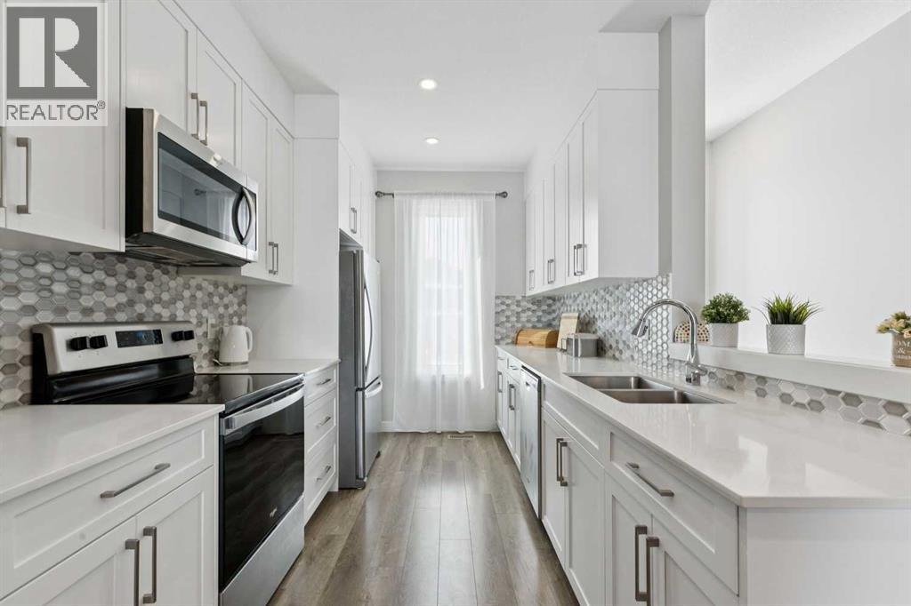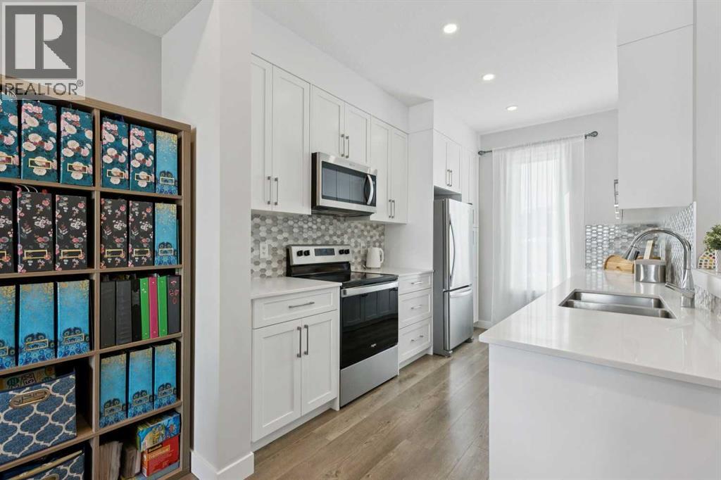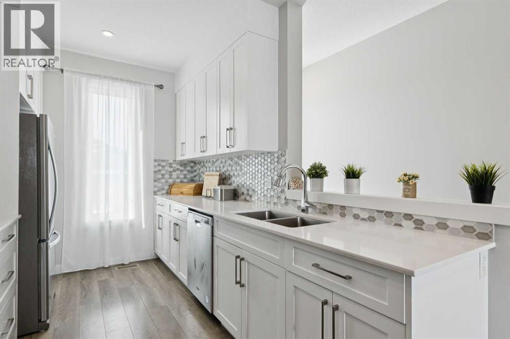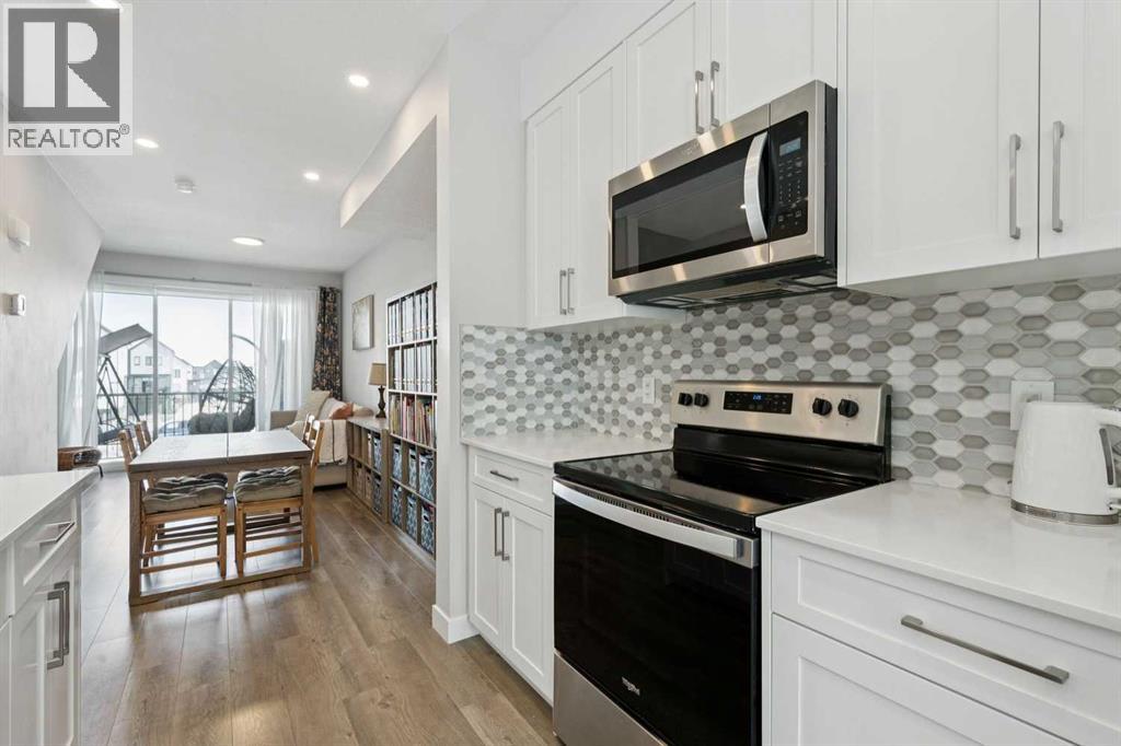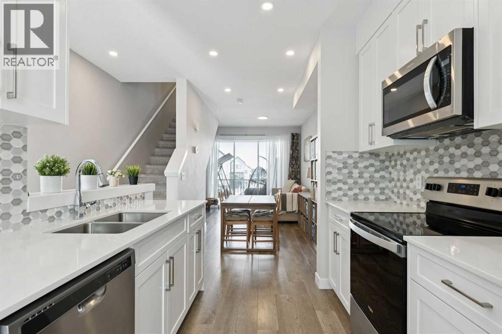 Welcome to 579 Evanston Link NW…a fantastic townhome, in the sought-after community of Evanston. If walkability is important to you, this one is just around the corner from all the Evanston amenities. Also, if you are using a car, there is quick access in and out of the community via Stoney trail as well. It’s a really convenient location within the community. Inside, the home features an open main floor where the kitchen flows directly into the dining and living areas. Outfitted with hardwood floors, quartz countertops, and stainless steel appliances, the main level is really awesome. A shaded, east-facing balcony is your own private outdoor space, and a 2 piece guest bath on the entry level is super convenient. The upper floor has two well-proportioned bedrooms. The primary suite includes its own private ensuite, while the large second bedroom sits directly adjacent to the main four-piece bath. Completing the package is an attached single garage supplemented by plenty of street parking for guests. To see our 360 Tour as well as extra details about this fantastic Evanston townhome, click the links below. (id:63190)
