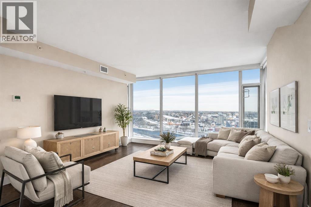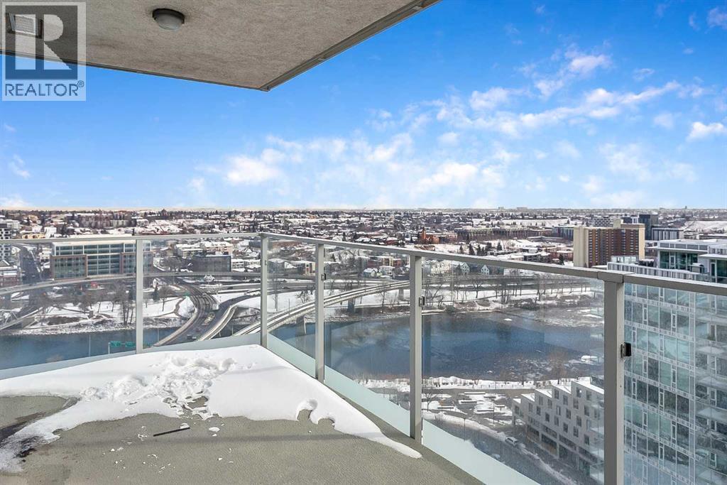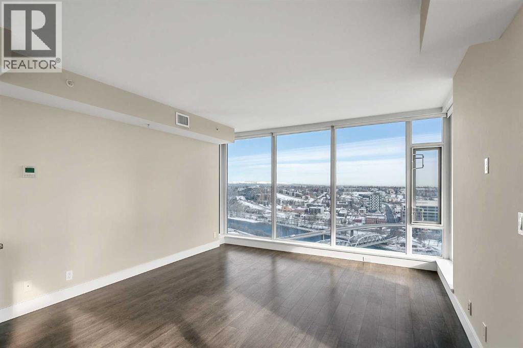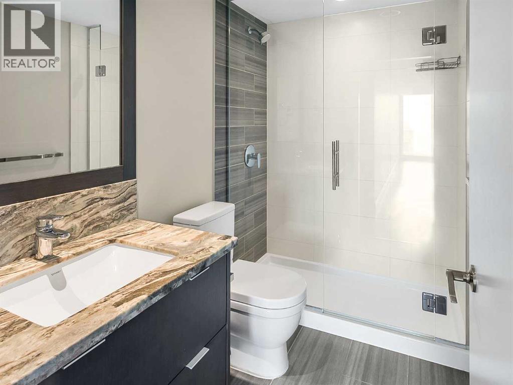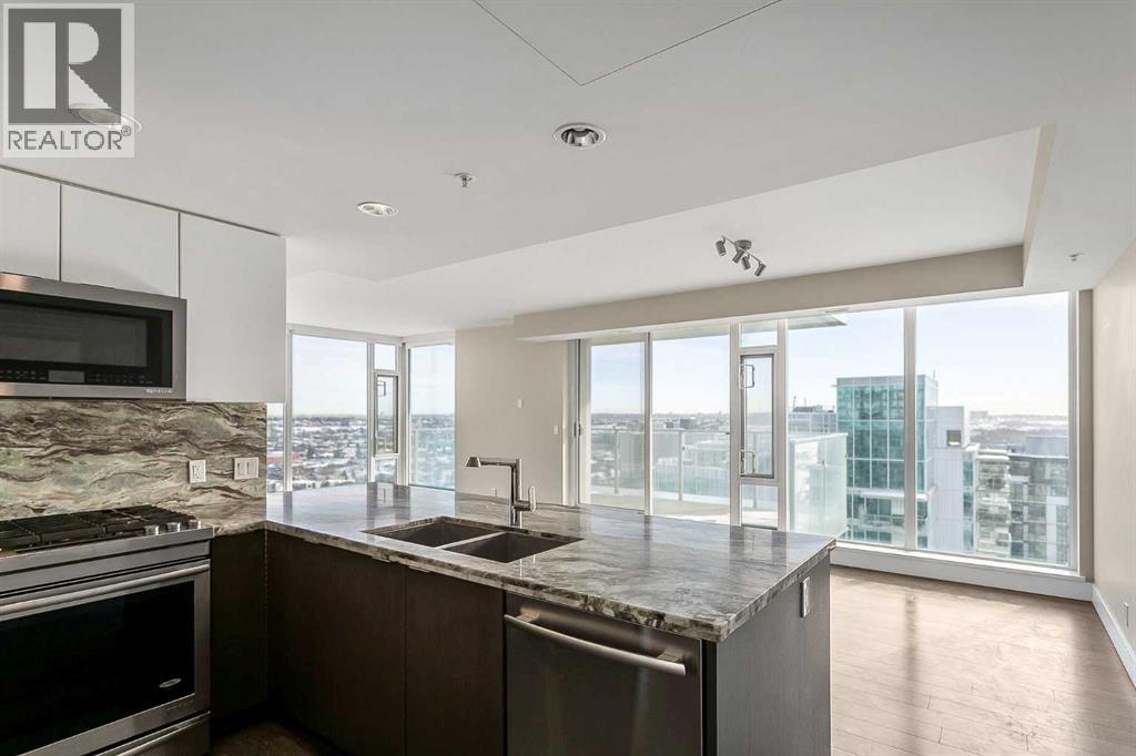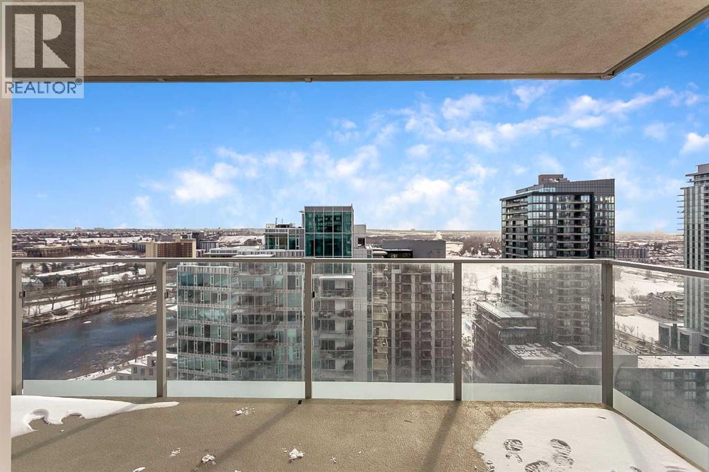 Welcome to the 21st floor of Evolution, where elevated living meets modern design in the heart of the city. This spacious 1,121 sqft unit offers a functional layout with a versatile front den that is perfect for a home office or flex space and the convenience of in-suite laundry. The kitchen is thoughtfully designed with granite countertops and a full-height granite backsplash, under-cabinet lighting, two-toned cabinetry, and a eating bar. The dining area is bathed in natural light, while the expansive living room offers flexibility to accommodate a variety of furniture options. Enjoy stunning northeast-facing views of the Bow River, along with breathtaking sunrises that fill the home with natural light creating a bright and inviting atmosphere throughout the day. The primary bedroom features a walkthrough closet leading to a stunning 5-piece ensuite complete with heated floors, dual sinks, granite countertops, a soaker tub, and a 10mm glass shower. The second bedroom is generously sized with ample closet space, and the additional 3-piece bathroom also includes heated floors, granite counters, and a 10mm glass shower. Residents of Evolution enjoy premium amenities located on the second floor, including a fully equipped fitness centre, sauna, party room, and rooftop patio. This unit includes one assigned underground parking stall and a storage locker. (id:63190)