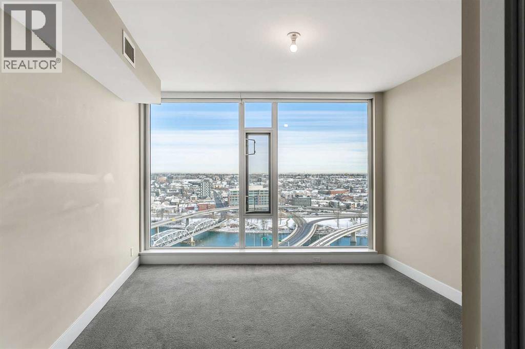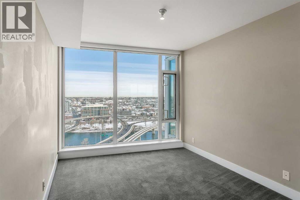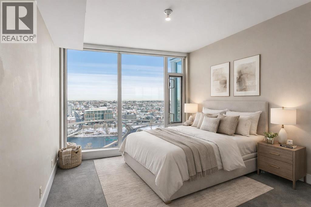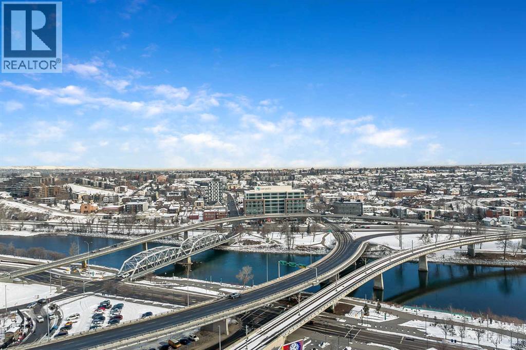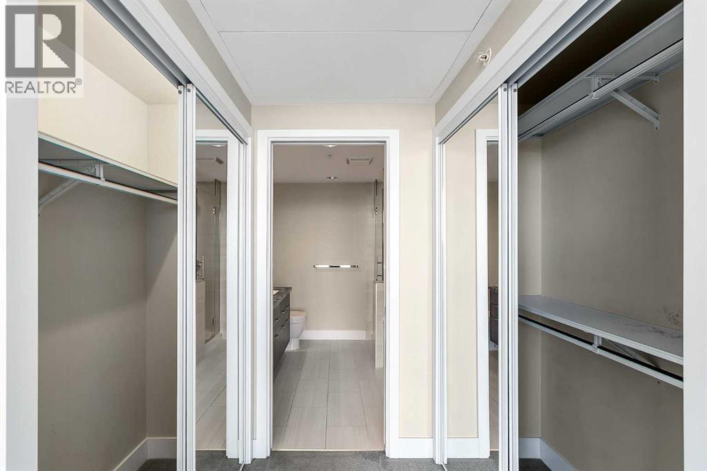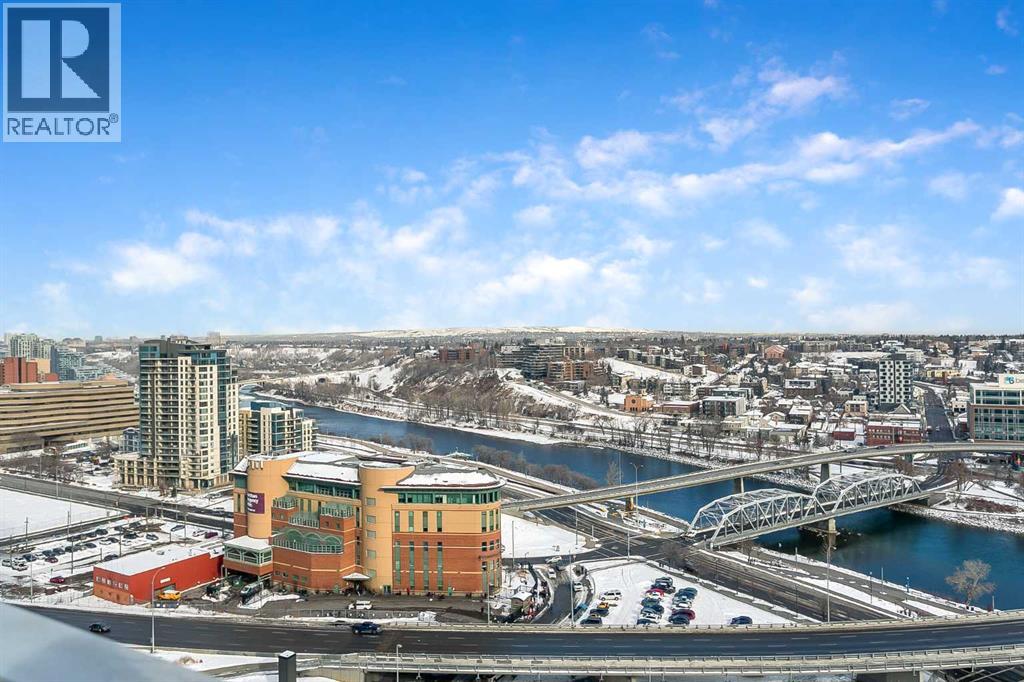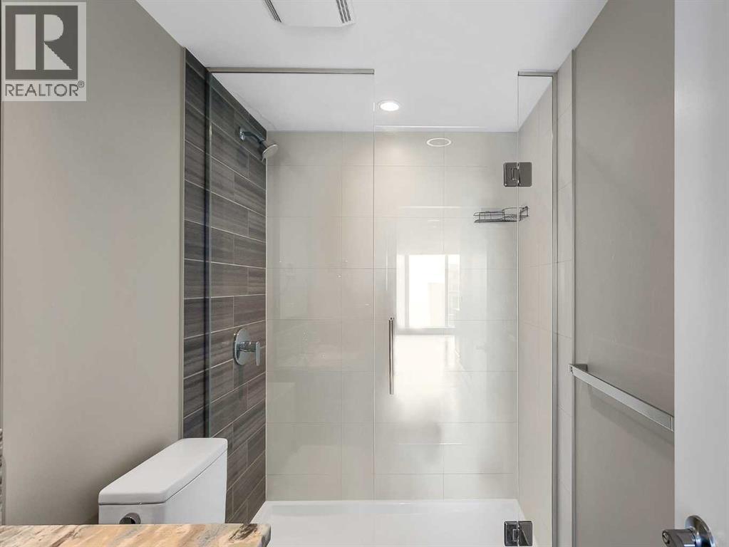 Welcome to the 21st floor of Evolution, where elevated living meets modern design in the heart of the city. This spacious 1,121 sqft unit offers a functional layout with a versatile front den that is perfect for a home office or flex space and the convenience of in-suite laundry. The kitchen is thoughtfully designed with granite countertops and a full-height granite backsplash, under-cabinet lighting, two-toned cabinetry, and a eating bar. The dining area is bathed in natural light, while the expansive living room offers flexibility to accommodate a variety of furniture options. Enjoy stunning northeast-facing views of the Bow River, along with breathtaking sunrises that fill the home with natural light creating a bright and inviting atmosphere throughout the day. The primary bedroom features a walkthrough closet leading to a stunning 5-piece ensuite complete with heated floors, dual sinks, granite countertops, a soaker tub, and a 10mm glass shower. The second bedroom is generously sized with ample closet space, and the additional 3-piece bathroom also includes heated floors, granite counters, and a 10mm glass shower. Residents of Evolution enjoy premium amenities located on the second floor, including a fully equipped fitness centre, sauna, party room, and rooftop patio. This unit includes one assigned underground parking stall and a storage locker. (id:63190)