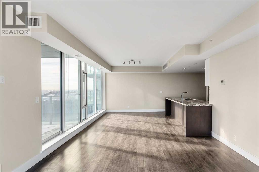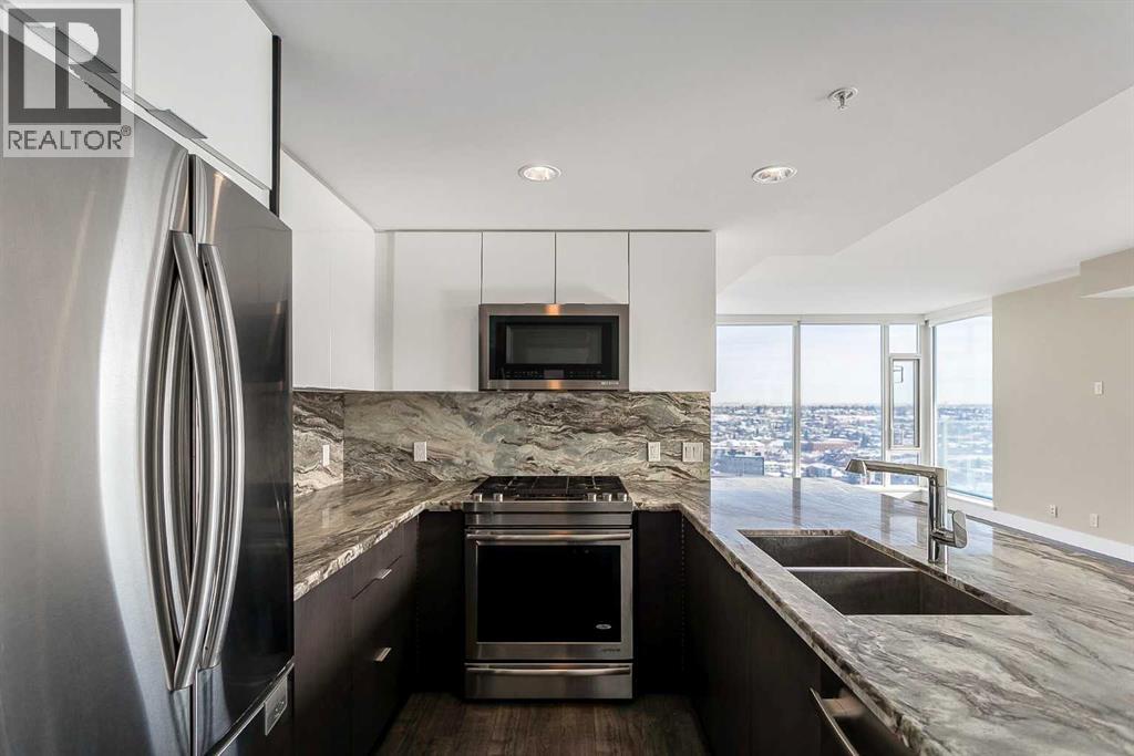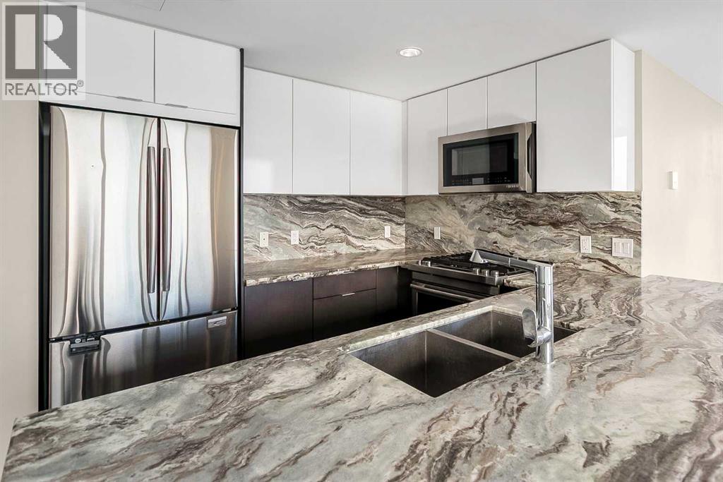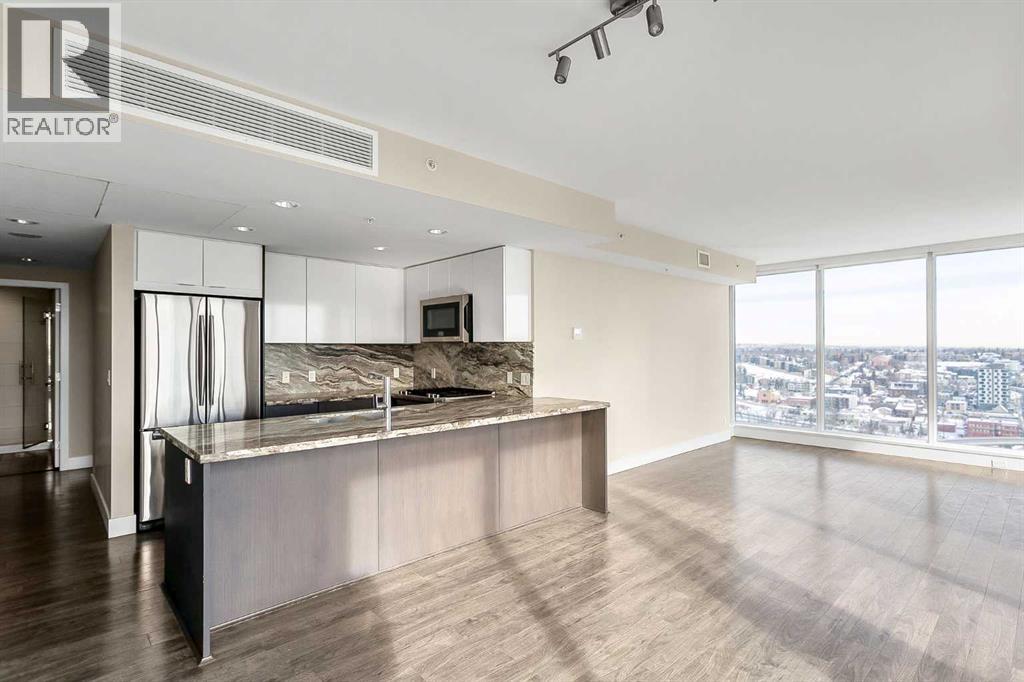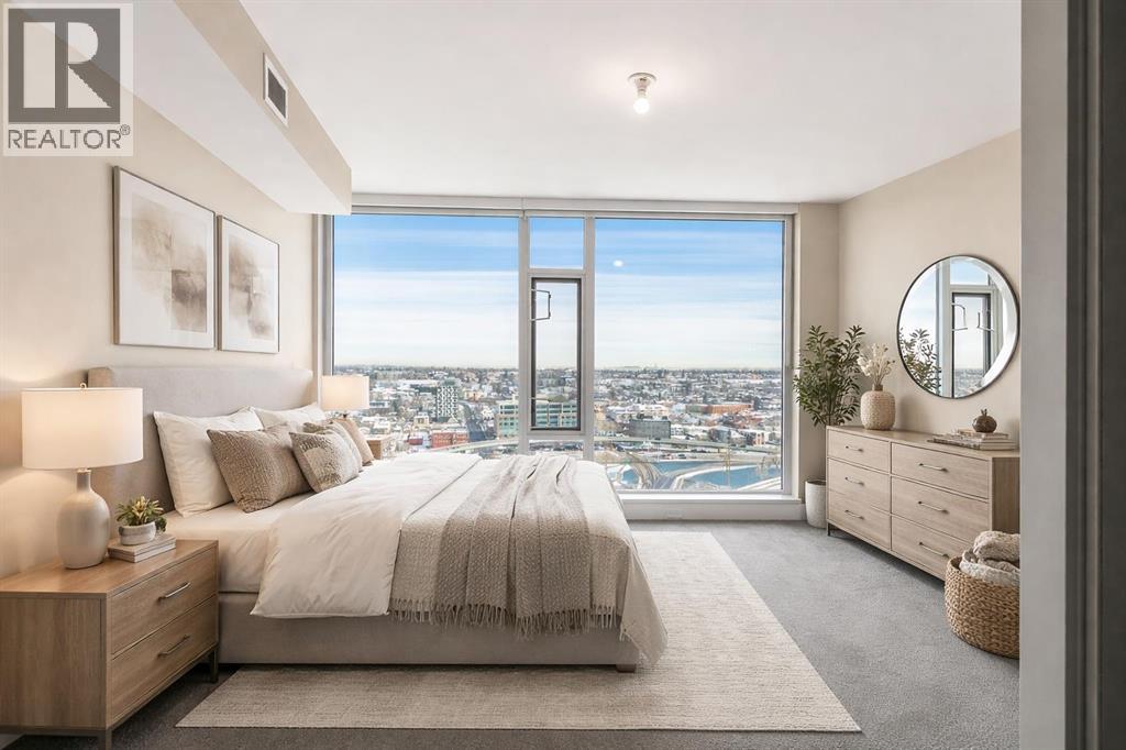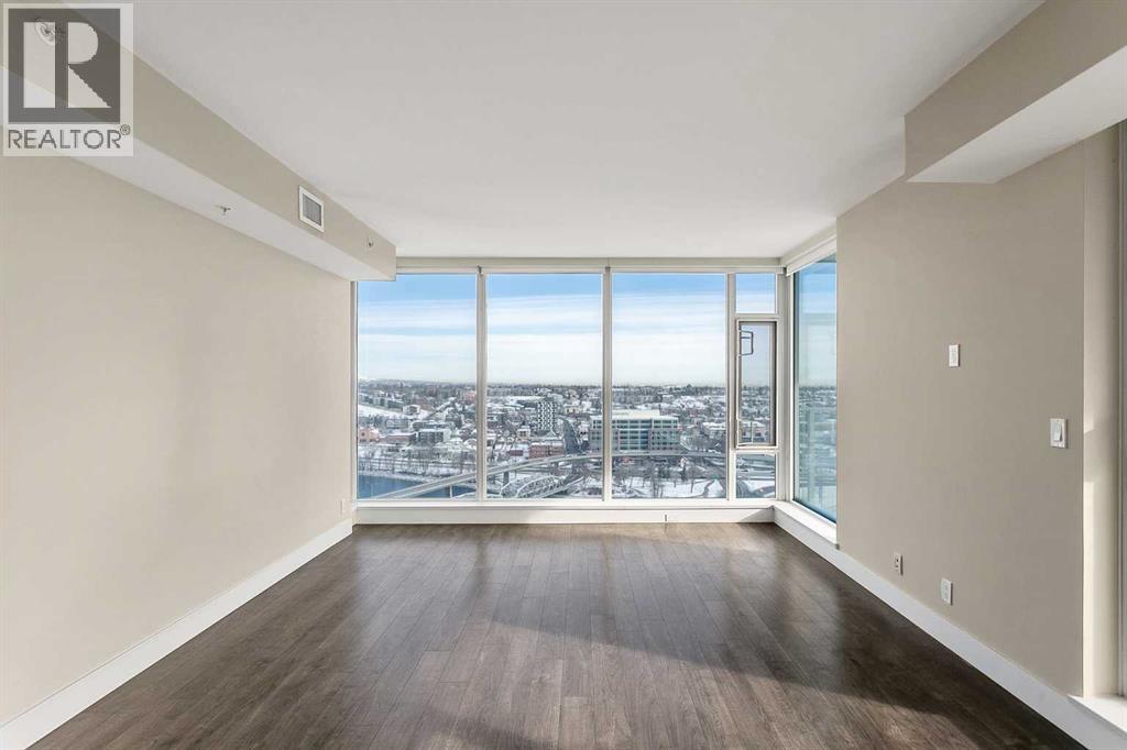 Welcome to the 21st floor of Evolution, where elevated living meets modern design in the heart of the city. This spacious 1,121 sqft unit offers a functional layout with a versatile front den that is perfect for a home office or flex space and the convenience of in-suite laundry. The kitchen is thoughtfully designed with granite countertops and a full-height granite backsplash, under-cabinet lighting, two-toned cabinetry, and a eating bar. The dining area is bathed in natural light, while the expansive living room offers flexibility to accommodate a variety of furniture options. Enjoy stunning northeast-facing views of the Bow River, along with breathtaking sunrises that fill the home with natural light creating a bright and inviting atmosphere throughout the day. The primary bedroom features a walkthrough closet leading to a stunning 5-piece ensuite complete with heated floors, dual sinks, granite countertops, a soaker tub, and a 10mm glass shower. The second bedroom is generously sized with ample closet space, and the additional 3-piece bathroom also includes heated floors, granite counters, and a 10mm glass shower. Residents of Evolution enjoy premium amenities located on the second floor, including a fully equipped fitness centre, sauna, party room, and rooftop patio. This unit includes one assigned underground parking stall and a storage locker. (id:63190)
