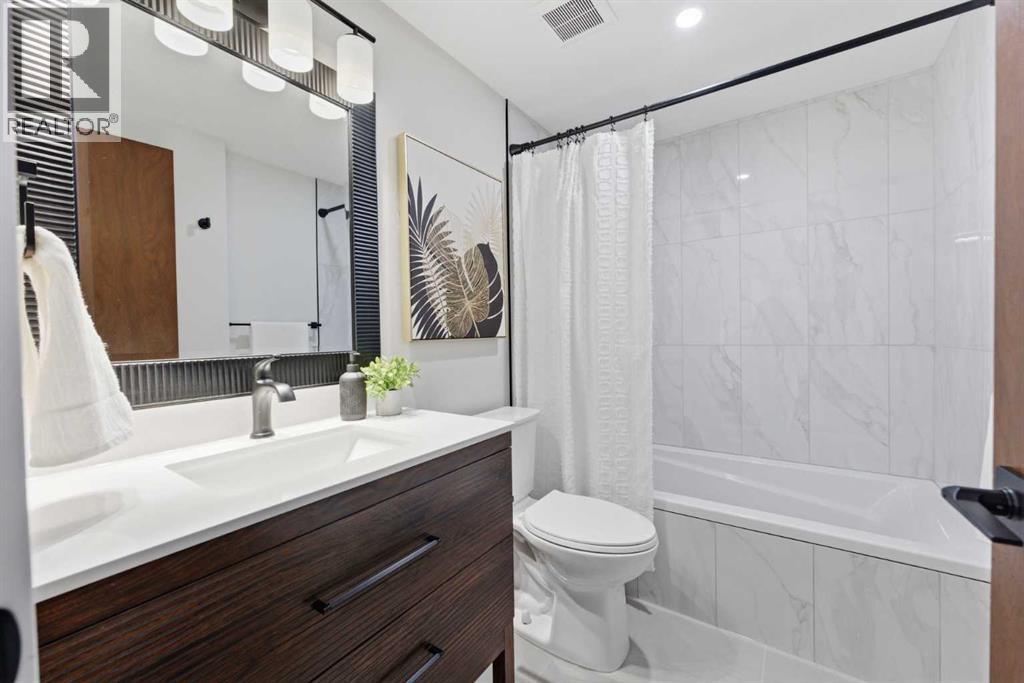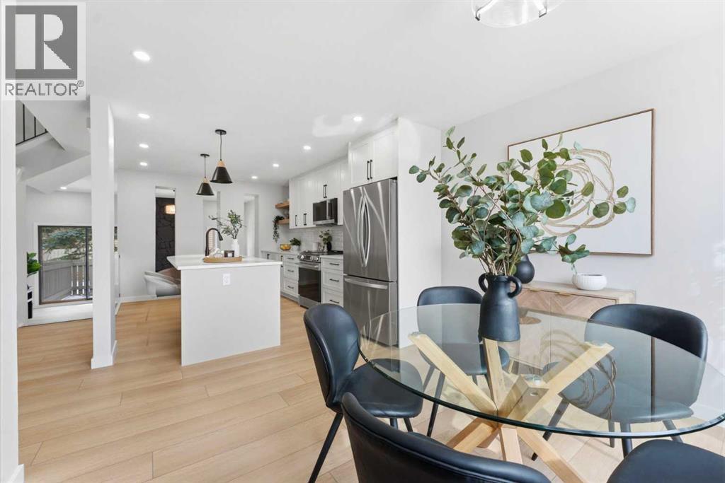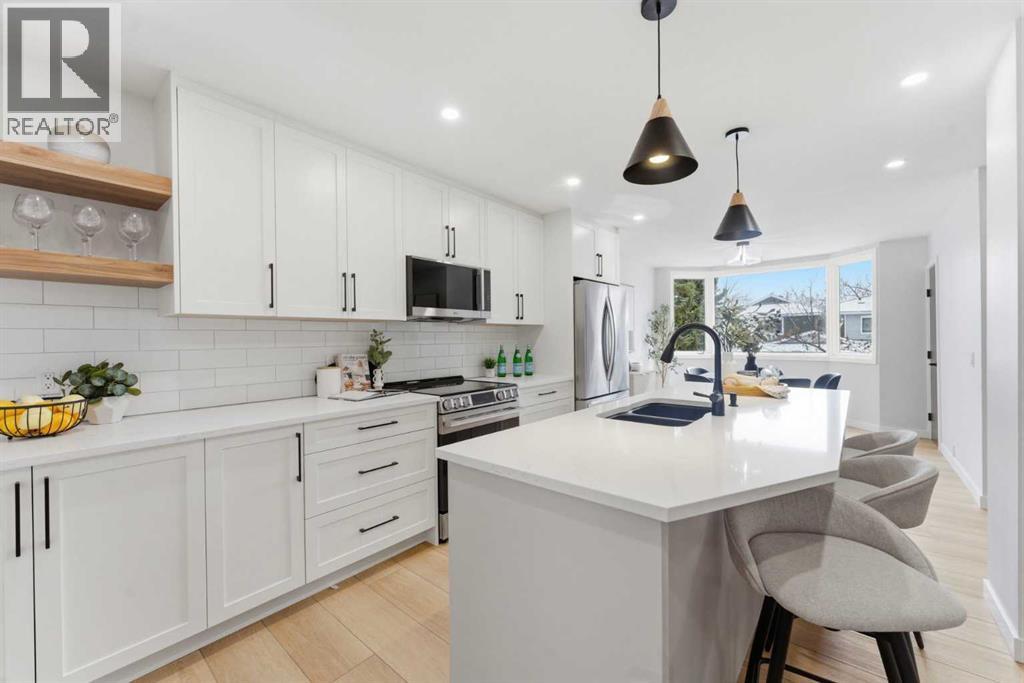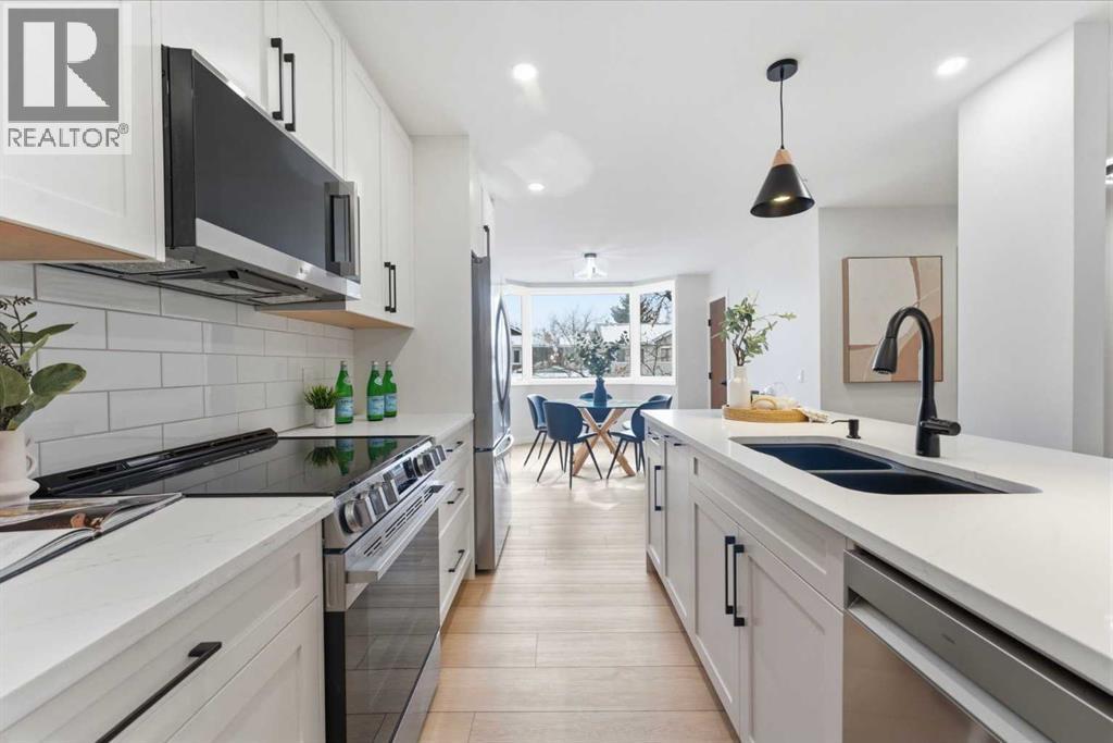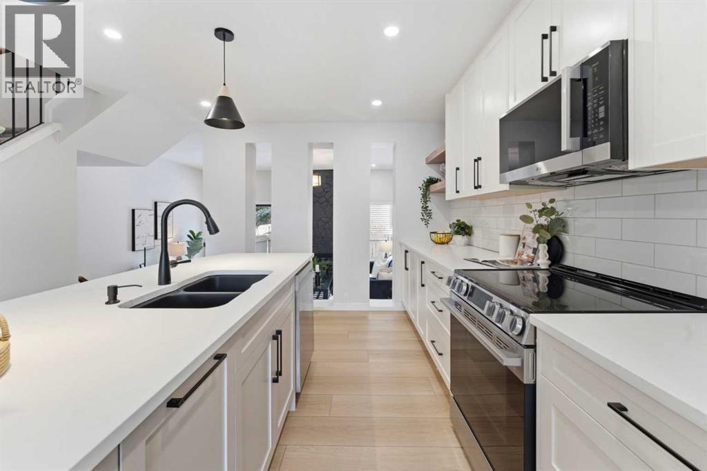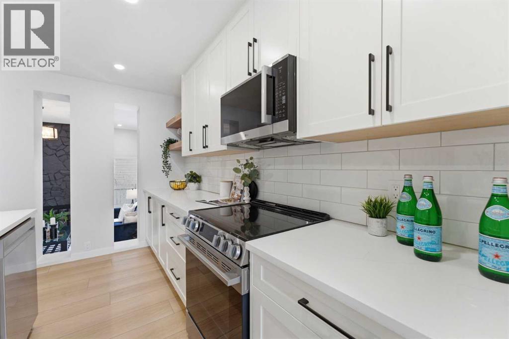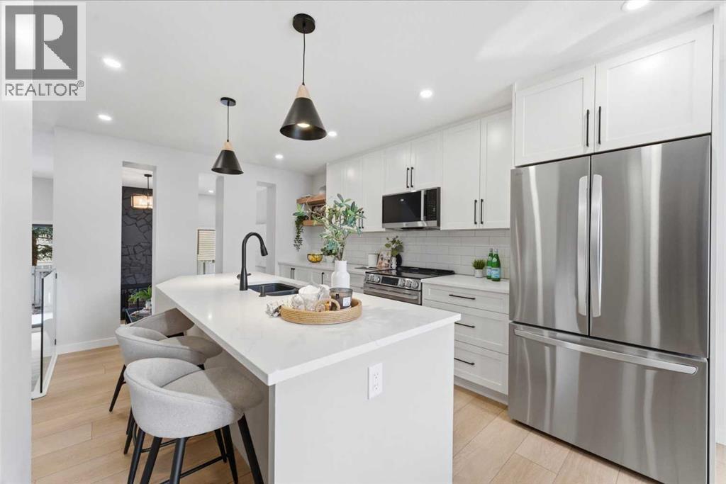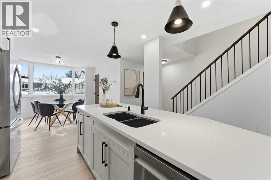 Infill luxury in a modern townhouse! Fully renovated and reimagined, this home stands out the moment you walk in. The main living space is elevated with vaulted ceilings, oversized windows, and a bold floor-to-ceiling stone fireplace that anchors the entire room. The expansive kitchen is bright, open and completely different from every other unit in this complex. It also has a full size island, a perfect gathering spot for guests & entertaining. The kitchen design features a modern look with two-toned organic colouring cabinetry, quartz countertops, new stainless steel appliances, tons of storage, and coffee nook with floating accent shelves. Flowing effortlessly into the dining area, it's gives enough space for a 6-8 person table and is surrounded by windows and natural light. Upstairs offers 3 well-sized bedrooms, including a spacious master bedroom and large walk in closet with custom built-ins. The laundry has also been moved from the basement to the second level for added convenience. The bathrooms have also been updated with modern vanities, tiled bathtub, and custom cabinetry. The basement provides extra space for you to use your imagination with, workout space, rec room, lots of potential! The backyard is fully fenced, private, and usable. It’s the kind of space you’ll actually use: morning coffee, letting the dog out, and enjoying the summer evenings. An attached garage, quiet complex, and a location that puts you close to everything without feeling busy. Fully renovated, luxury townhouse living in this desirable lake community—this one hits different! (id:63190)