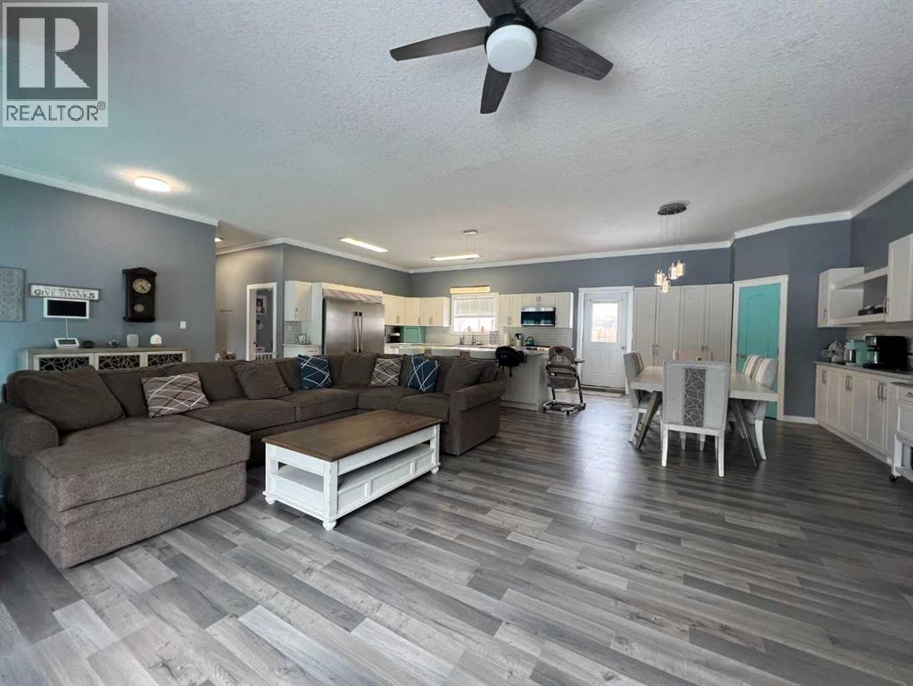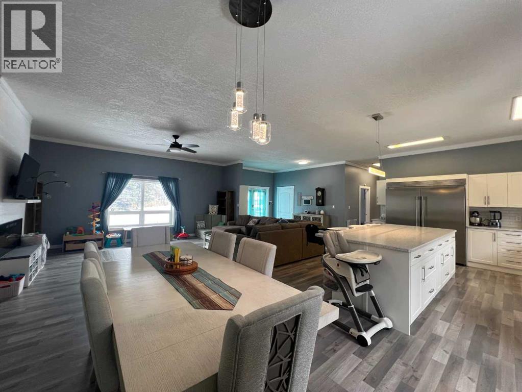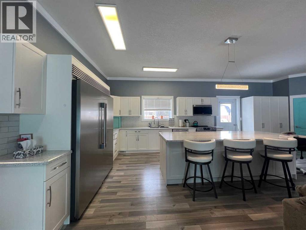 Absolutely stunning, fully upgraded bungalow on two town lots! This 4-bedroom, 2-bathroom home offers an impressive 24,694 sq ft of outdoor space and is ideally located in the desirable east end, close to the new hospital and paved walking trails. Step inside to discover 10’ ceilings and a bright, open-concept layout featuring a spacious entry and main living area. The show-stopping kitchen and dining space boasts Oakleaf custom cabinetry, sleek countertops, a corner pantry, a massive eat-up island, and newer appliances—including an oversized custom Frigidaire fridge/freezer. The large, sun-filled living room is highlighted by a wall-mounted electric fireplace. The primary bedroom offers custom-built closets, its own electric fireplace, and a convenient 2-piece ensuite. Three additional bedrooms, an updated 4-piece bathroom, and a separate laundry room complete the main floor. Extensive upgrades include windows, interior and exterior doors, garden doors, plumbing lines, soffits, eavestroughs, siding, flooring, paint, trim, LED lighting, kitchen backsplash, and modern bathroom fixtures—with a detailed upgrade list available. Outside, enjoy exceptional space for entertaining and family living with a 44’ x 12’ front deck, 6’ x 12’ back deck, and a beautifully landscaped yard featuring mature trees, shrubs, and a privacy fence. There’s even a dedicated play area with swings and a play structure—perfect for kids. Ample parking accommodates vehicles, RVs, and all your recreational toys. Originally built in 1975 and extensively upgraded in 1996 and again in 2020/2021, this home truly must be seen to be appreciated. (id:63190)