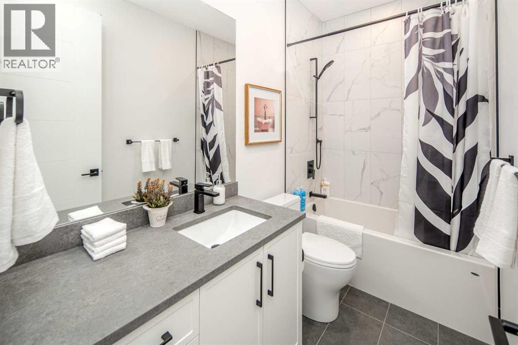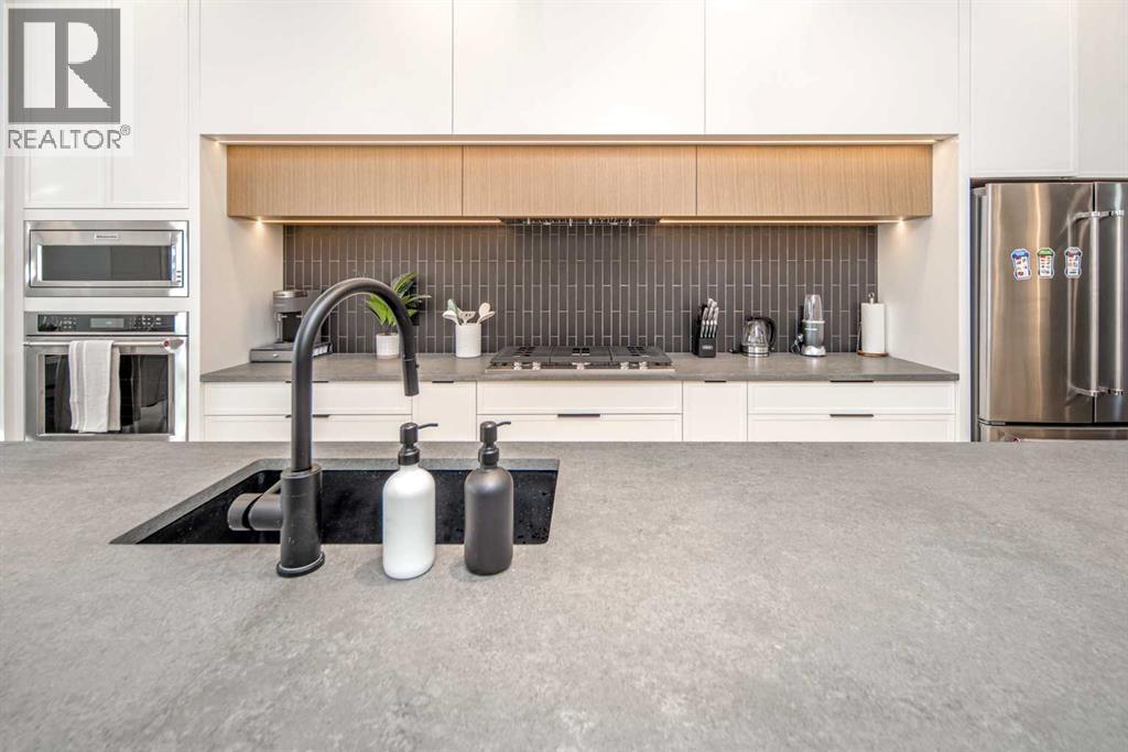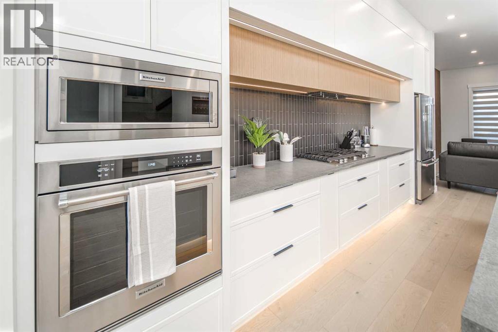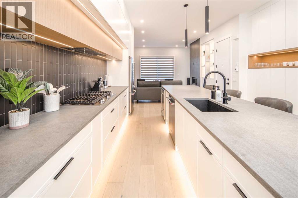 This luxury semi-detached infill combines refined design, thoughtful layout, and strong income potential with a fully legal 2-bedroom basement suite (city approved), making it well-suited for both end users and investors in today’s market.The main floor is designed to feel open and elevated, featuring 10-ft ceilings that enhance natural light flow and create a more spacious, airy environment compared to standard builds. A bright front dining area is framed by large windows, offering a welcoming space for both daily living and entertaining. At the center of the home, the chef-inspired kitchen showcases natural stone countertops, full-height custom cabinetry, a waterfall island with oak accents, LED feature lighting, and a premium appliance package—delivering both durability and a high-end finish. The adjacent living room is anchored by a floor-to-ceiling tiled gas fireplace with custom built-ins, creating a warm yet modern focal point. A dedicated main floor office provides flexibility for working from home, while the rear mudroom with built-in storage offers practical access to the backyard and garage.Upstairs continues with 9-ft ceilings, maintaining a consistent sense of space throughout. A versatile bonus room at the top of the stairs functions well as a secondary lounge, media area, or workspace. The primary suite is elevated by a vaulted ceiling, adding volume and a more luxurious feel to the retreat. The ensuite is thoughtfully designed with a double vanity, soaker tub, glass-enclosed shower, and in-floor heating, delivering everyday comfort during Calgary’s colder seasons. Two additional well-sized bedrooms, a full bathroom, and a conveniently located upper laundry room complete the level.The basement is built with 9-ft ceilings and features a fully finished legal 2-bedroom suite with a separate entrance. Designed to maximize livability, the suite includes a bright open living area, a modern kitchen, and a full bathroom, offering an excellent opportunit y for rental income or multi-generational living without compromising comfort.Located in the established inner-city community of Renfrew, this home offers quick access to downtown (approximately 5 minutes) and is within close proximity to the amenities of Bridgeland, including popular cafes, restaurants, and local shops. With convenient connections to Edmonton Trail, 16 Avenue, and Deerfoot Trail, commuting and daily travel are efficient and accessible. (id:63190)