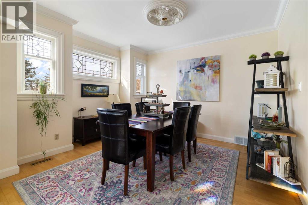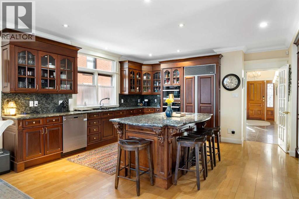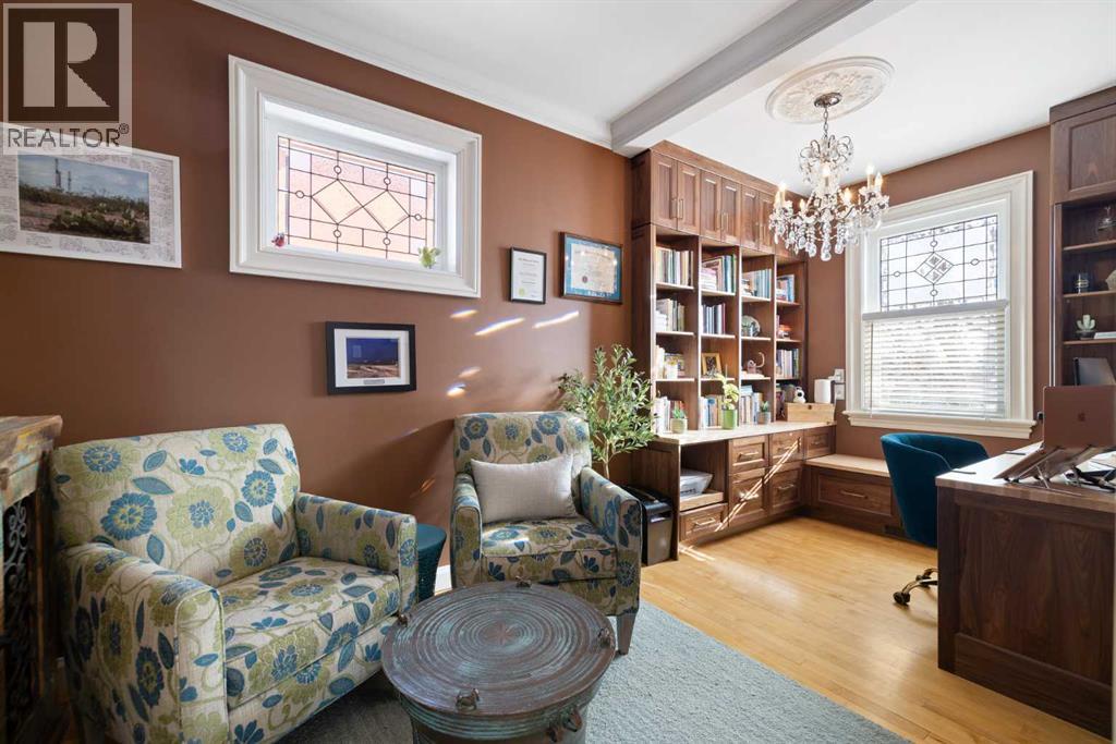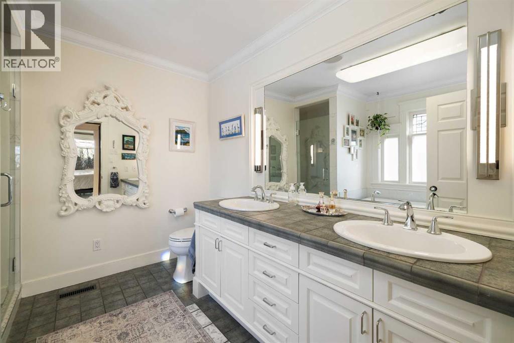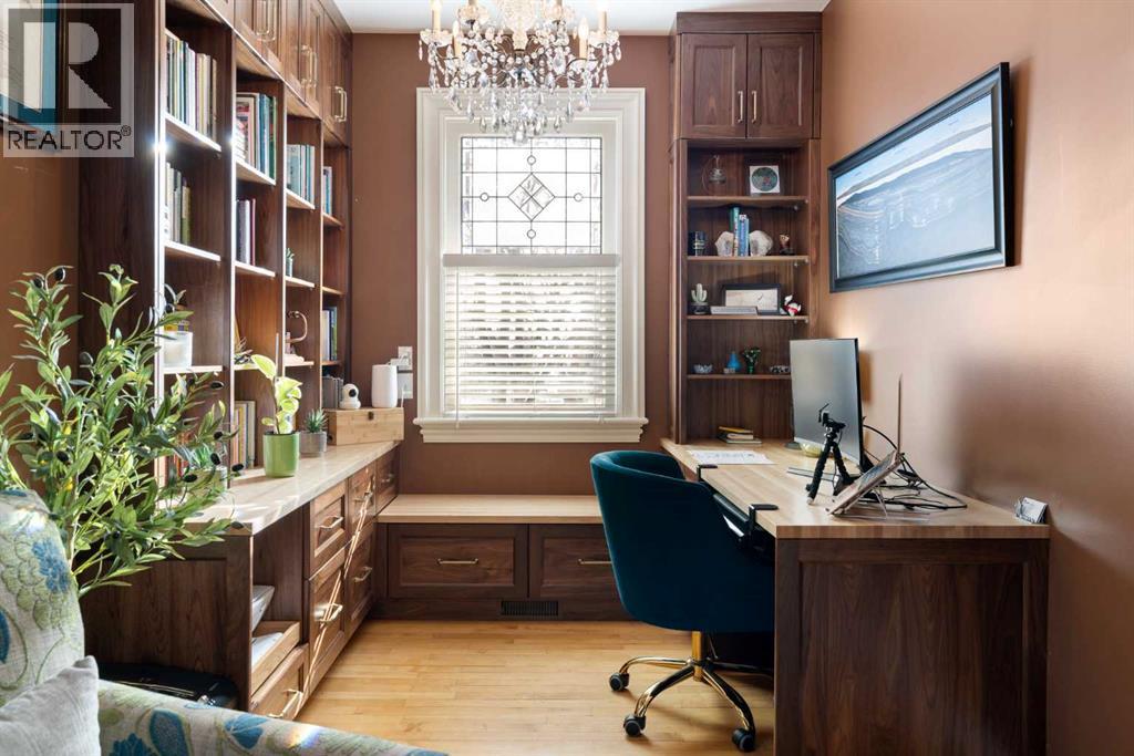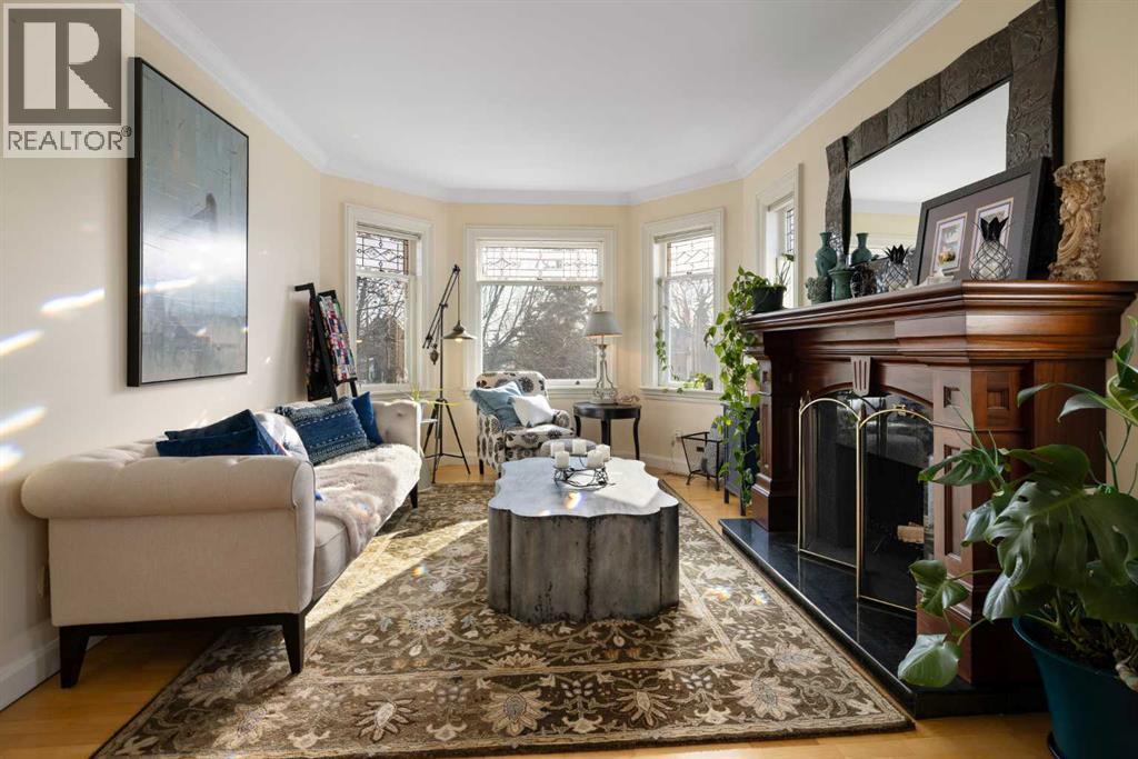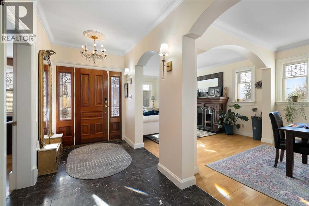 Stepping into this well-maintained 1912 estate in Shaganappi feels like entering a livable piece of art. High ceilings & marble floors set the stage for an interior where historic soul meets modern precision. With over 3,800 sq.ft of curated living space, the layout was designed to host grand events. As you step in, you're welcomed by dual living spaces and two dining features framed by custom mahogany millwork, an executive office with built-ins, and the warmth of a classic wood-burning fireplace. The daily rhythm revolves around light and luxury. The kitchen is anchored by rich mahogany cabinetry, newer Miele appliances, and vast counters scaled for entertaining. Mornings begin in the primary suite, bathed in east-facing sunlight with direct views of the Calgary skyline before stepping into a custom-built ensuite. While heritage homes often lack modern utility, investments in this home ensure comfortable living with dual laundry setups on both the main and upper floors, alongside newly upgraded bathrooms. The lower level maximizes versatility with a separate entrance, a full bathroom, and a dedicated flex space. A third fireplace warms the mahogany-trimmed rec room, but the true highlight is the custom movable bookcase, which seamlessly swings open to reveal hidden storage and a utility room. Outside, the west-facing yard is a private summer oasis featuring a four-zone irrigation system, a stone patio, and a built-in water feature. Inner-city living usually means fighting for parking, but this property redefines urban convenience with a large garage, a parking pad and a long interlocking brick driveway in front, located less than 10 minutes from downtown. You're encouraged to join the Shaganappi community association for access to the private tennis courts, outdoor rink and community events. Make sure to enjoy the surrounding area by visiting either of the two off-leash parks, exploring the Bow River, and discovering all the conveniences along 17th Ave. To finis h it off, take a short 10-minute walk to the C-Train Station where you're only two stops away from Downtown Calgary. (id:63190)