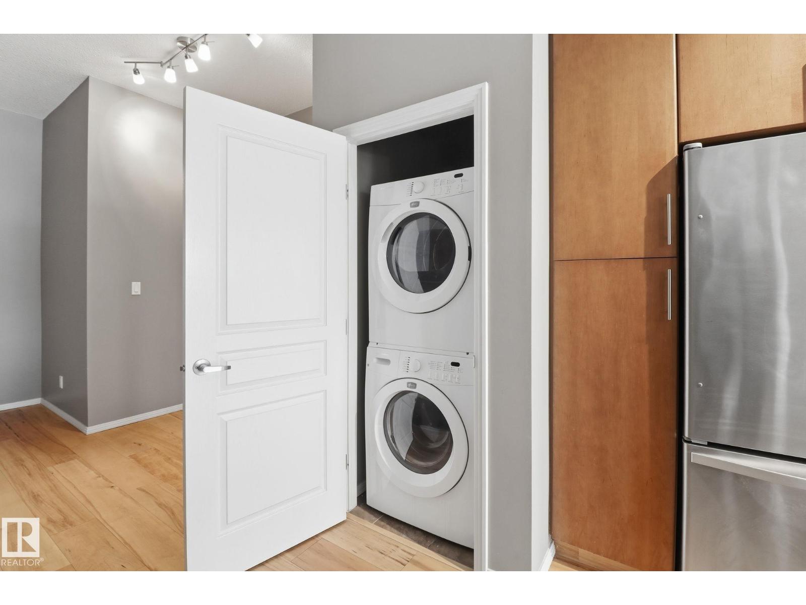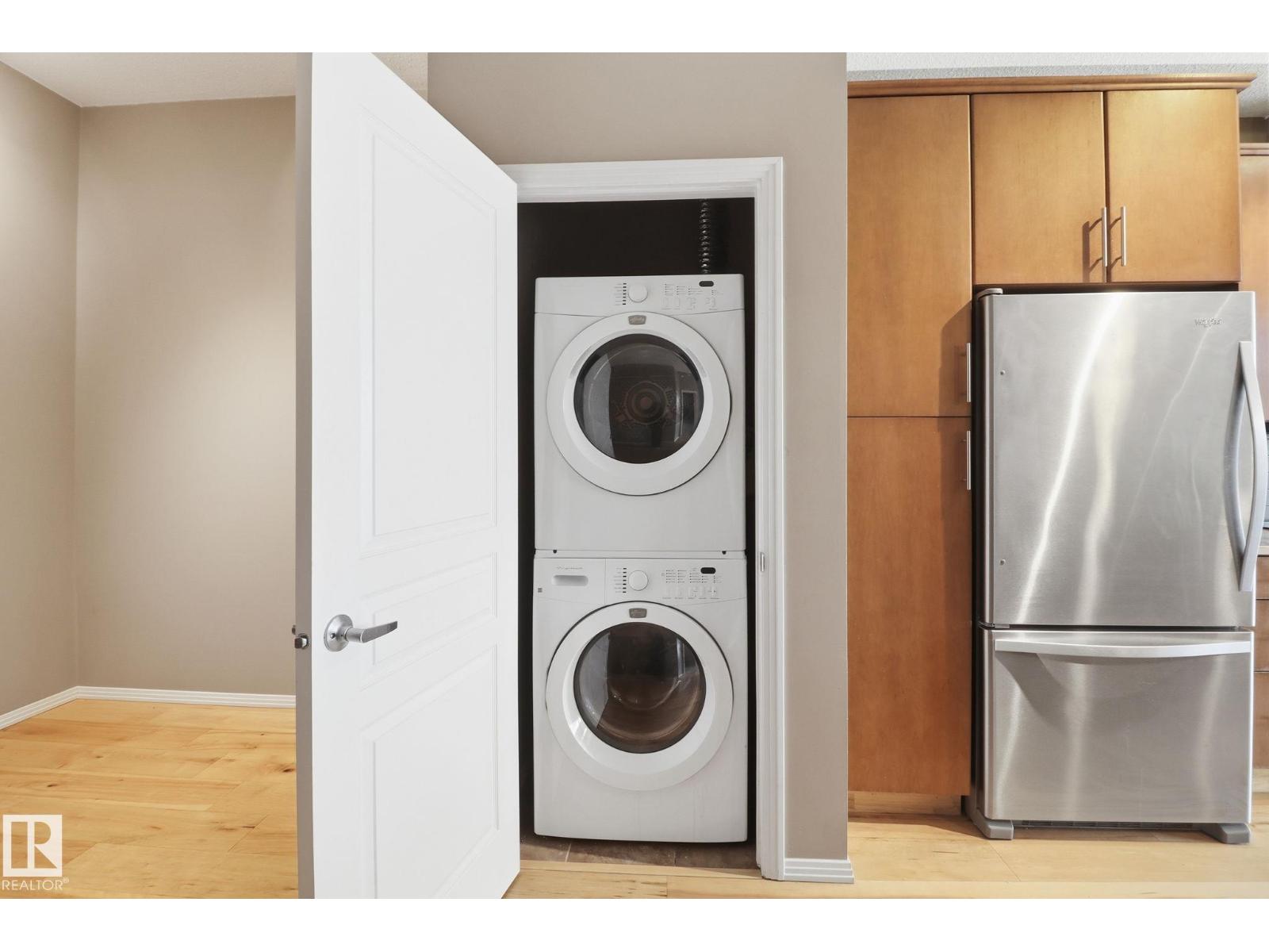 This 1,097 sq ft, 2-bedroom, 2-bath condo is on the 3rd floor of a modern development in a quiet, walkable neighbourhood. Featuring an Art Deco-inspired design with an open-concept layout and 10’ ceilings, the unit boasts new maple hardwood flooring and ceramic tile in bathrooms. The kitchen is equipped with solid maple cabinets, subway tile backsplash, and upgraded stainless steel appliances. The primary suite offers a generous walk-in closet and an ensuite with a deep soaker tub. In-suite front-loading washer and dryer add convenience. Floor-to-ceiling windows flood the space with natural light and provide striking views, while a sliding glass door leads to a 120 sq ft walk-out balcony with a natural gas hookup, overlooking a lush park. Included are one heated, security-monitored underground parking stall, a large secured storage cage, and free on-street parking nearby. Close to Unity Square and the Brewery District, restaurants, shopping, groceries, and just a 15-minute walk to MacEwan University. (id:63190)