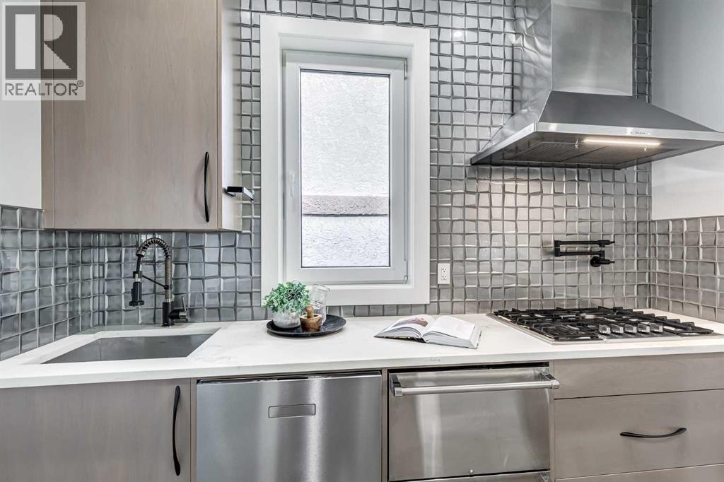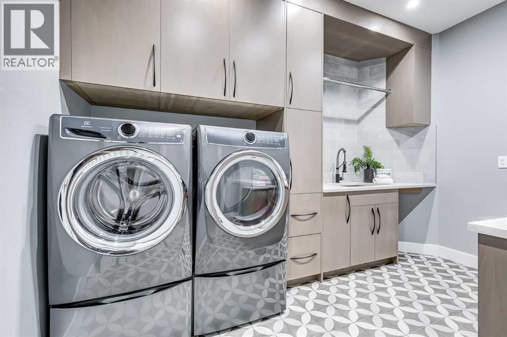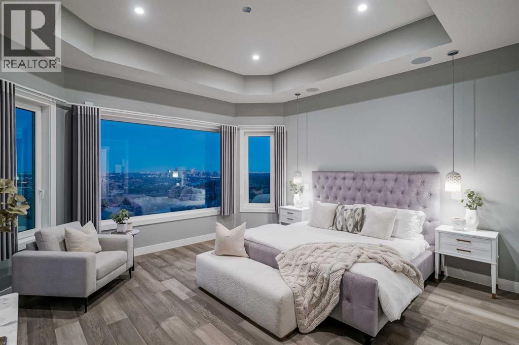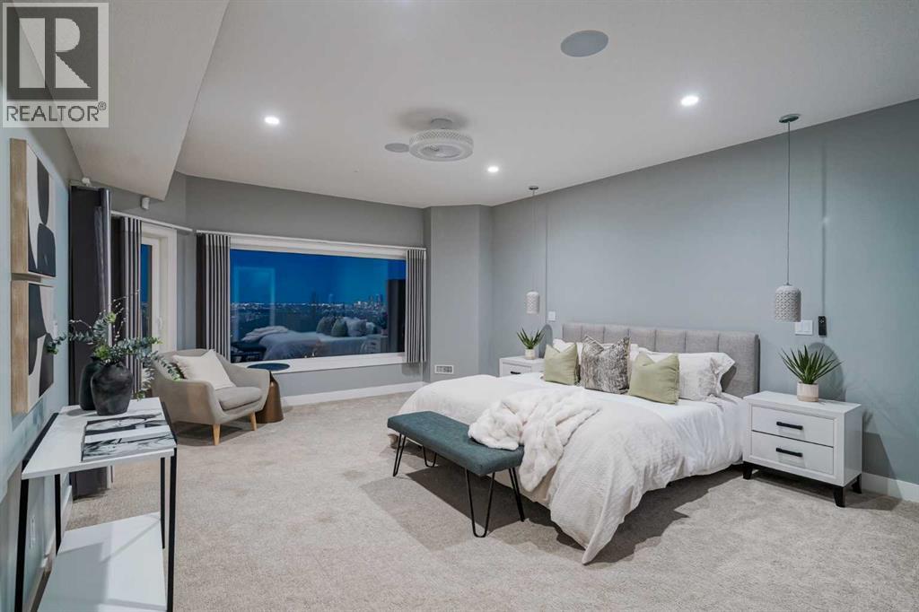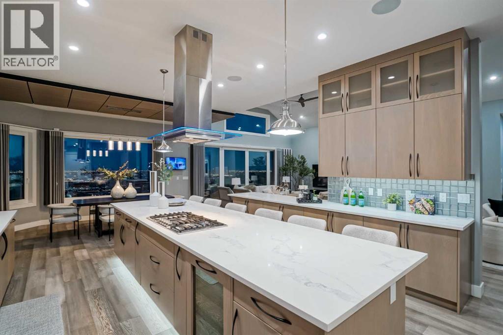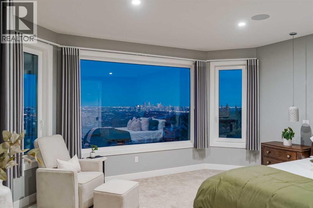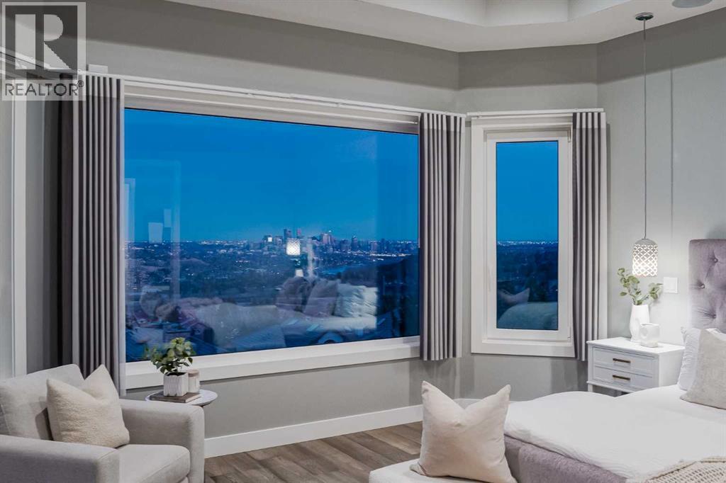 Perched high above the city on one of Patterson’s most prestigious streets, this custom-built luxury bungalow (2019) offers unobstructed, panoramic views of downtown Calgary and the skyline from all three fully developed walkout levels. Architecturally designed and built to an exceptional standard, this residence blends refined design, everyday functionality, and long-term livability in a private elevated setting just minutes to the city core.Offering 2,424 sq. ft. above grade plus 4,524 sq. ft. of developed living space below grade, the main level is tailored for sophisticated single-level living. Expansive windows flood the home with natural light while perfectly framing breathtaking city views. The open-concept living and dining areas are anchored by a striking see-through gas fireplace, creating warmth and architectural interest while preserving open sightlines. Vaulted and tray ceilings add to the sense of scale, complemented by wide-plank engineered hardwood flooring and timeless finishes throughout.The chef-inspired kitchen features premium cabinetry, a large central island, high-end appliances, and seamless flow into the dining area—ideal for entertaining. A fully equipped spice kitchen adds valuable prep space and storage. The primary suite is a private retreat with panoramic views and a spa-inspired ensuite complete with heated floors, deep soaker tub, steam shower, and walk-in closet. A private office or den, powder room, breakfast nook, and functional mudroom with direct garage access complete the main level.The first lower walkout level offers exceptional flexibility while maintaining the same high level of finish, featuring a spacious recreation room, family lounge with city views, dedicated home gym with custom flooring and sliding glass barn doors, two generously sized bedrooms, beautifully appointed bathrooms, full laundry room, and direct outdoor access.The lowest level is designed for entertaining and guests, complete with a large media/theatr e room with golf simulator capability, kitchenette or wet bar, additional bedrooms, full bathroom, second laundry area, and extensive storage/mechanical space.Additional highlights include a heated triple attached garage with impressive ceiling height suitable for a vehicle lift, epoxy flooring, side wall-mounted openers, and space for up to four vehicles. The home is roughed-in for a future elevator and offers multiple walkout patios and decks with glass railings and gas connections. Integrated audio, smart lighting, premium mechanical systems, and an optional landscaping package further elevate this remarkable property.Located in one of Calgary’s most desirable westside communities, Patterson is celebrated for its elevated setting, mature surroundings, city views, and quick access to downtown, parks, top schools, and amenities. (id:63190)