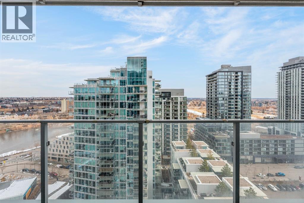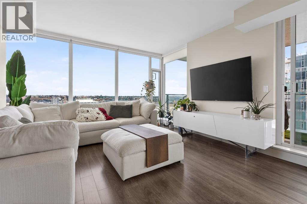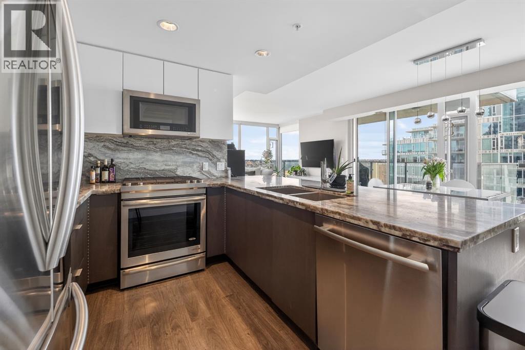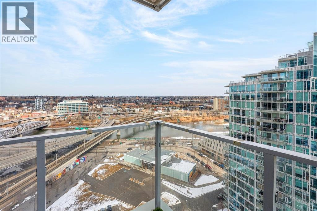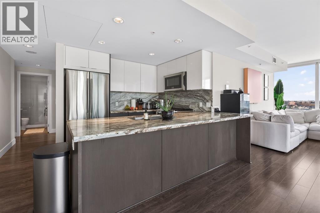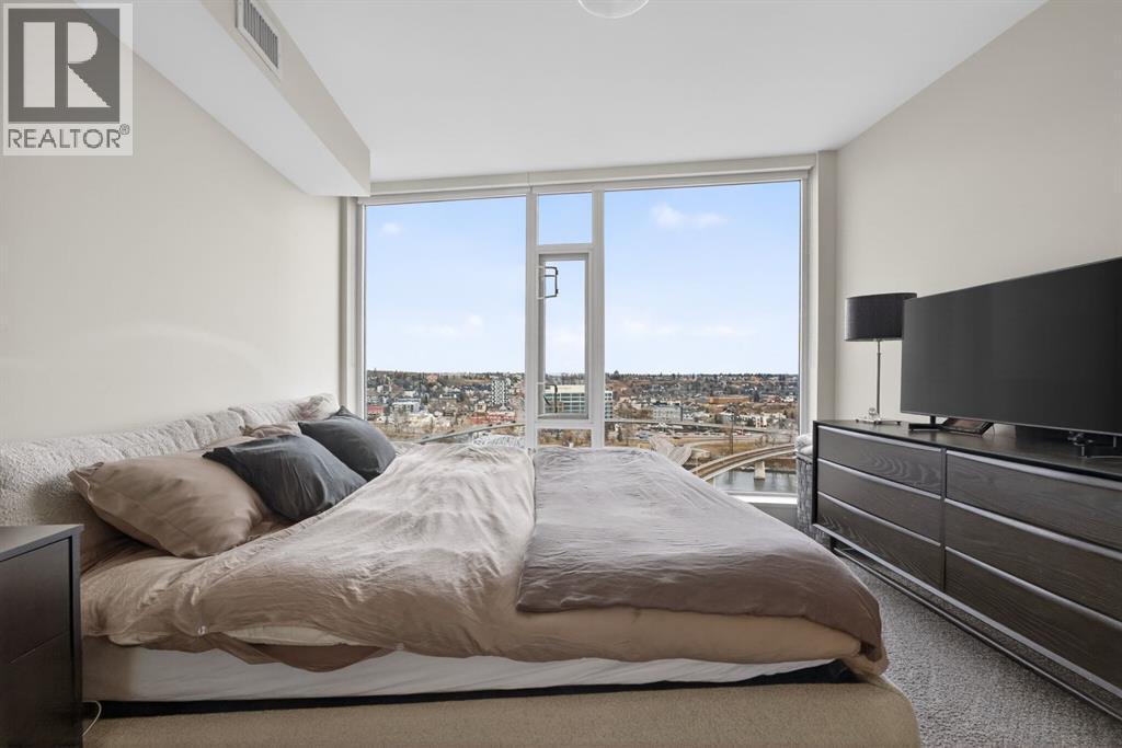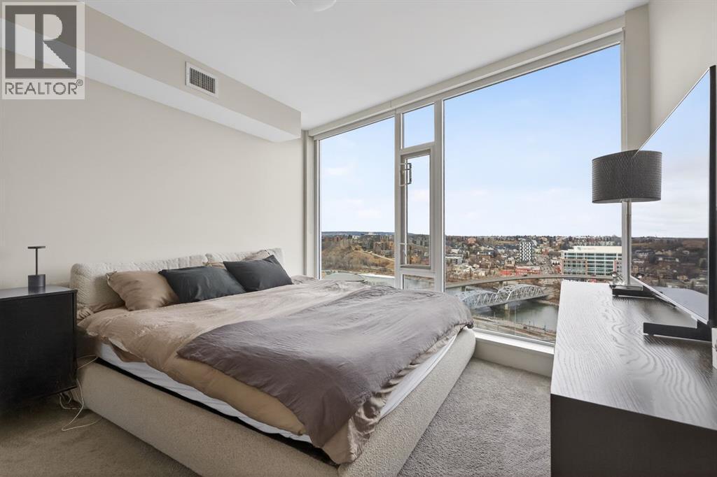 Perched on the 17th floor, this executive residence offers breathtaking views overlooking the Bow River and the vibrant city skyline. Designed with both comfort and style in mind, this spacious 2-bedroom, 2-bathroom suite features soaring ceilings, expansive floor-to-ceiling windows, rich hardwood and tile flooring, and plush carpeting in the primary bedroom. The open-concept layout seamlessly connects the kitchen, dining, and living areas—perfect for hosting guests or enjoying everyday living. The chef-inspired kitchen is equipped with a gas range, stainless steel appliances, granite countertops, and a sleek modern backsplash, delivering both functionality and sophistication. Retreat to the luxurious primary suite, complete with a spa-like 5-piece ensuite showcasing dual vanities, a deep soaker tub, and a fully tiled glass shower. Step outside to your oversized, nearly 20-foot-wide balcony—an ideal space for summer evenings, complete with room for lounging and BBQing while soaking in the incredible river views. Residents enjoy access to exceptional amenities, including a stunning rooftop courtyard, two fully equipped fitness centers, a sauna, and an expansive party room. With 24-hour concierge and security, peace of mind comes standard. This unit also includes a titled parking stall, a secure storage locker, and access to convenient visitor parking. Located in the heart of East Village, you’re just steps from river pathways, dining, shopping, and everything downtown living has to offer. (id:63190)