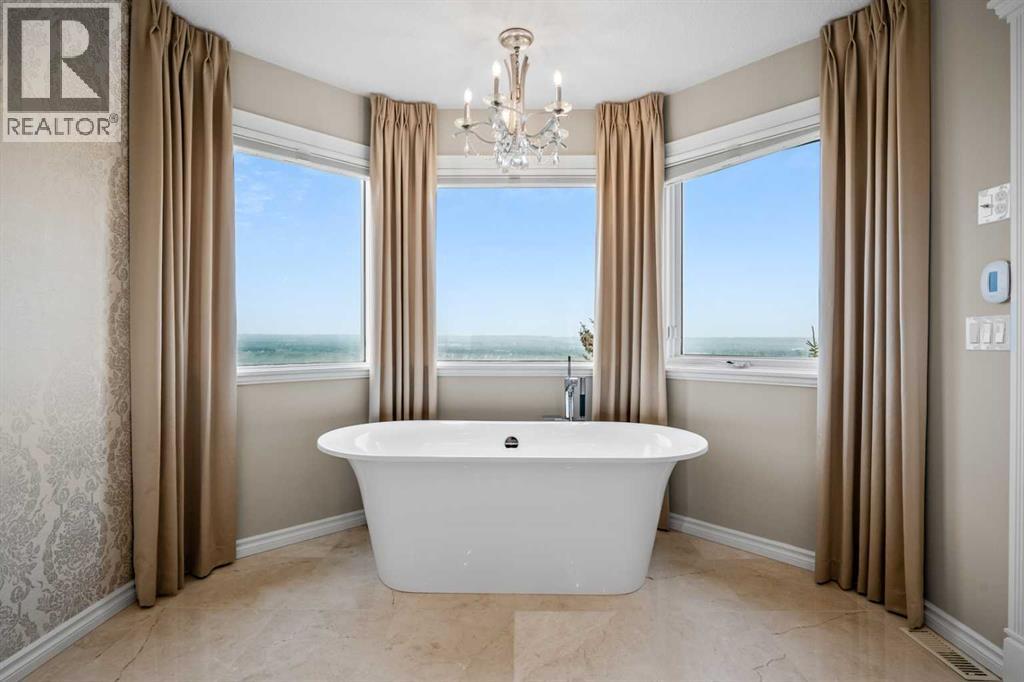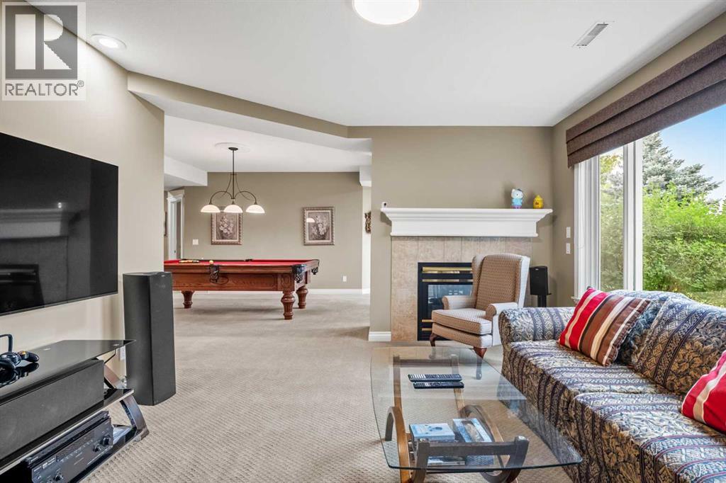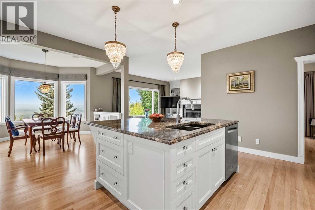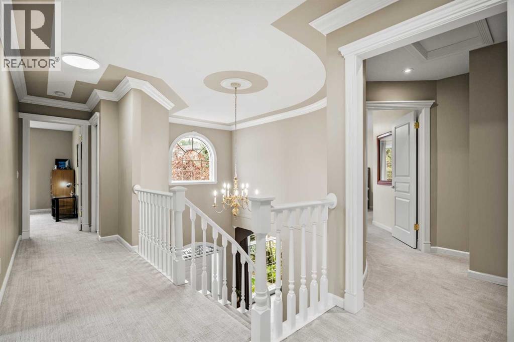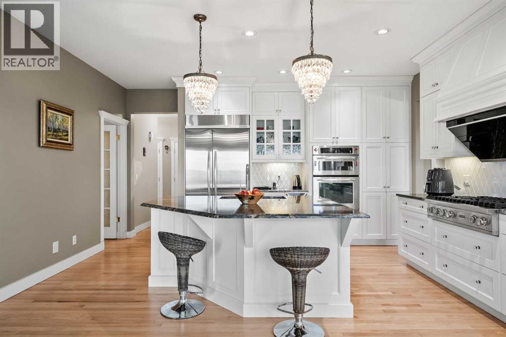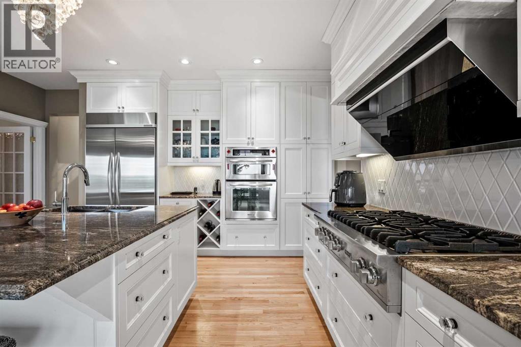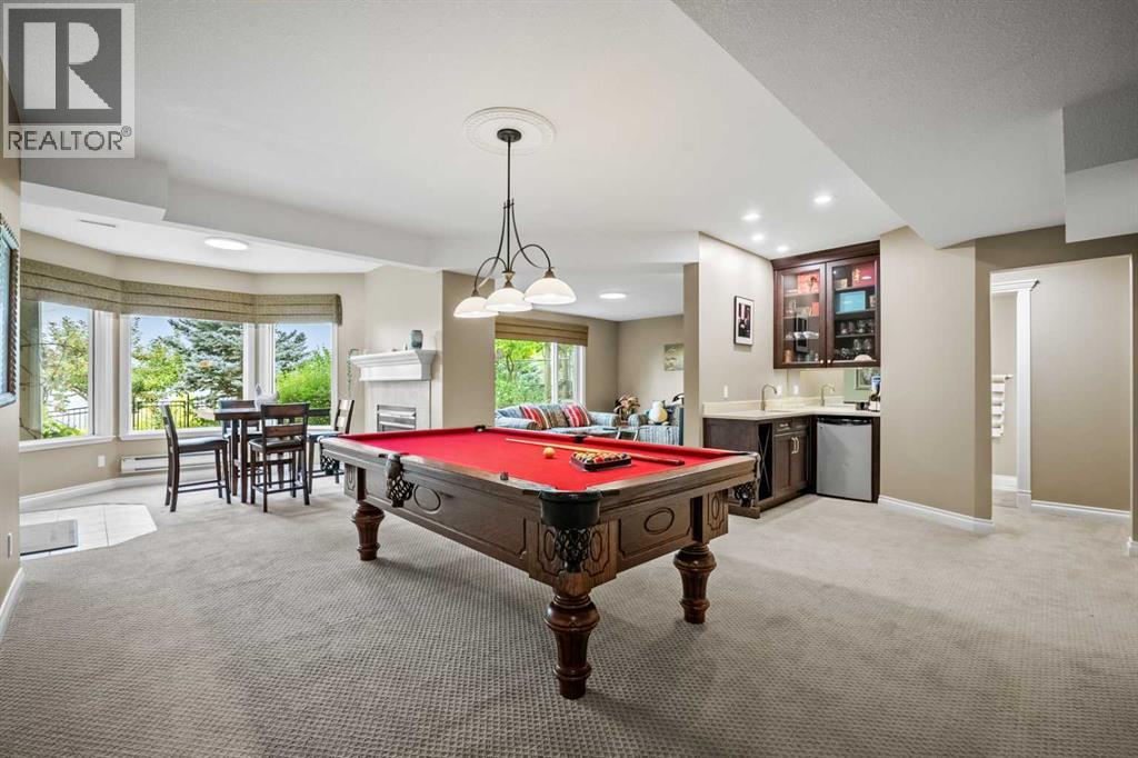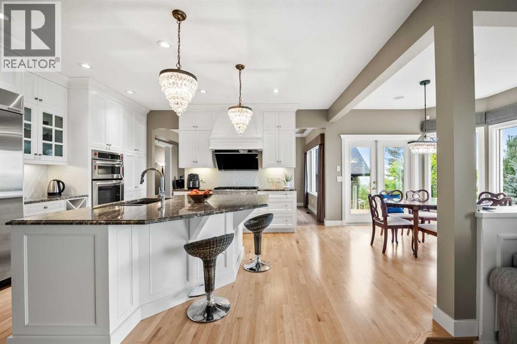 Welcome to 136 Patrick View SW—an executive walkout residence offering over 4,400 sq ft of refined living space, perched aboveaprotected nature reserve in one of Patterson’s most prestigious enclaves. With 3,119 sq ft across the main and upper levels, plus an additional1,300+sq ft in the fully developed walkout basement, this home delivers luxury, functionality, and lasting value. From the moment you enter, agrandstaircase and sunlit foyer set the tone for timeless sophistication. The main floor flows seamlessly through formal and casual living spaces, withnewlyrefinished hardwood, luxury vinyl plank, and designer lighting. The professionally renovated kitchen features granite counters, a gas cooktop,and abuilt-in appliance wall with microwave above and oven below—anchored by a crystal-lit island and breakfast nook that opens to a topless glassraildeck framing panoramic river valley views. Upstairs, the primary suite is a sanctuary with heated marble floors, a freestanding soaker tub beneathachandelier, and a walk-in closet with custom cabinetry and brass accents. The ensuite also includes a frameless glass shower with rainfallandhandheld heads, and dual vanities with elegant lighting. Three additional bedrooms and a 5-piece bath offer comfort and flexibility for familyorguests. A dedicated home office, a serene wellness room, and an elegant upper hallway with tray ceiling and chandelier add both function andflair.The walkout level is designed for leisure and entertaining, featuring a spacious rec room with fireplace, red-felt pool table, built-in bar withglasscabinetry and mini fridge, media lounge, and a cozy dining nook with bay windows. Additional guest bedrooms and a full bath complete thelowerlevel, while large windows flood the space with natural light. Outside, enjoy a professionally landscaped yard with mature trees, a recessed firepitarea with stone surfacing, a private dog run, and a covered patio beneath the elevated deck. The property backs onto a natur e reserve,offeringunobstructed views and exceptional privacy. Aerial perspective reveals the home’s prime location—just minutes from top schools, boutiqueshopping,and downtown Calgary, yet surrounded by greenery and tranquility. Over $35,000 in recent upgrades—including new A/C, hot water tank(2025),washer/dryer, range hood, window treatments, garage painting, and refreshed landscaping—complement earlier renovations to the kitchen,ensuite,and deck. Every detail reflects pride of ownership and professional care. This is elevated living—crafted for those who expect more. (id:63190)