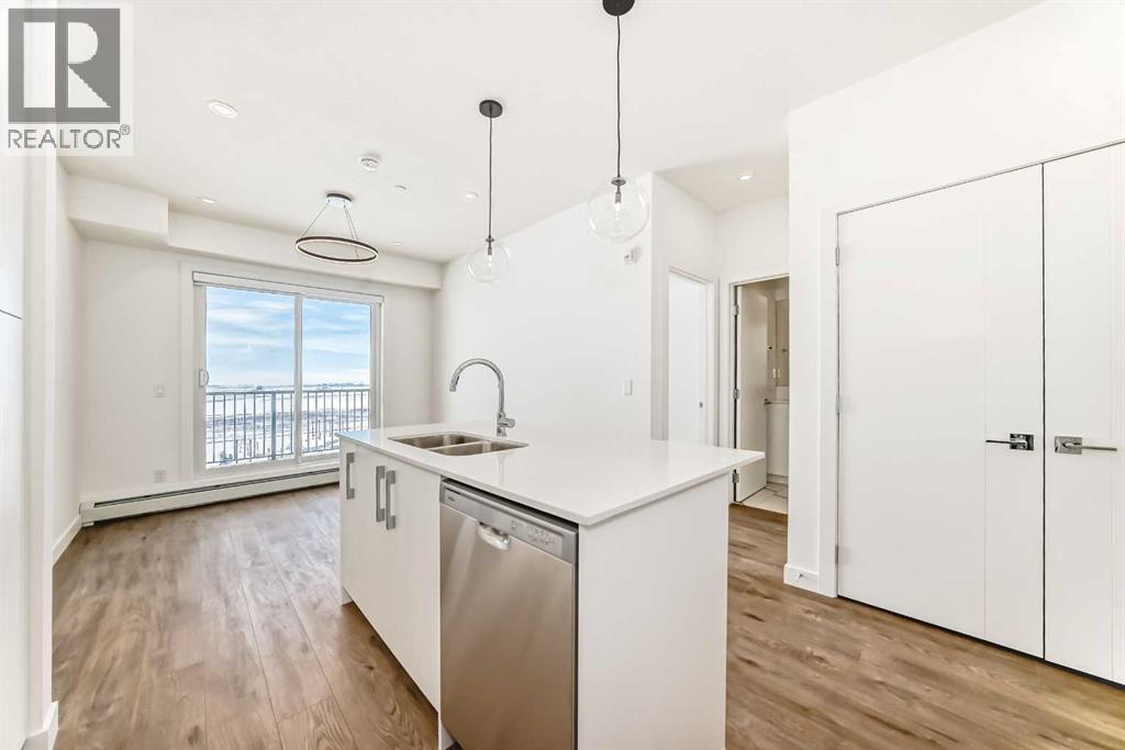 Welcome to Myne by Truman, a refined and contemporary residence nestled in the thriving community of Cornerstone in Northeast Calgary. This impeccably designed 2-bedroom, 2-bathroom condominium offers an elevated living experience, blending sophisticated finishes with effortless functionality—ideal for discerning buyers, professionals, downsizers, or investors seeking both style and convenience.Perched on an upper level, this residence is bathed in natural light, with expansive windows framing serene, unobstructed views. The open-concept layout is thoughtfully curated to create a seamless flow between living, dining, and kitchen spaces—perfect for both everyday living and elegant entertaining.At the heart of the home, the designer kitchen showcases sleek, modern cabinetry, quartz countertops, premium stainless steel appliances, and an oversized island that serves as both a statement piece and a functional gathering space.The primary suite is a private retreat, complete with a well-appointed ensuite, while the second bedroom offers versatility for guests, a home office, or a personalized space. A second full bathroom enhances comfort and privacy for residents and visitors alike.Step onto your private balcony—an ideal setting for morning coffee or evening relaxation. Thoughtfully designed for convenience, the unit also features a dedicated in-suite laundry area, ensuring everyday ease without compromising space or style.Includes a titled underground parking stall and an assigned storage unit, providing both security and additional functionality. Residents enjoy access to premium building amenities, including a fully equipped fitness centre and a lounge area—perfect for relaxation or social gatherings—along with secure entry and elevator access for added peace of mind.Situated in the highly desirable and amenity-rich community of Cornerstone, you are moments away from parks, scenic pathways, shopping, dining, schools, and major routes such as Stoney Trail a nd Metis Trail, ensuring seamless connectivity throughout the city.Experience elevated condo living at Myne by Truman—where modern elegance meets everyday comfort. Schedule your showings today! (id:63190)