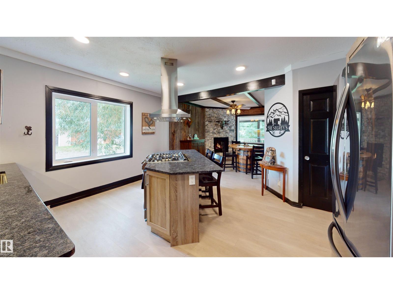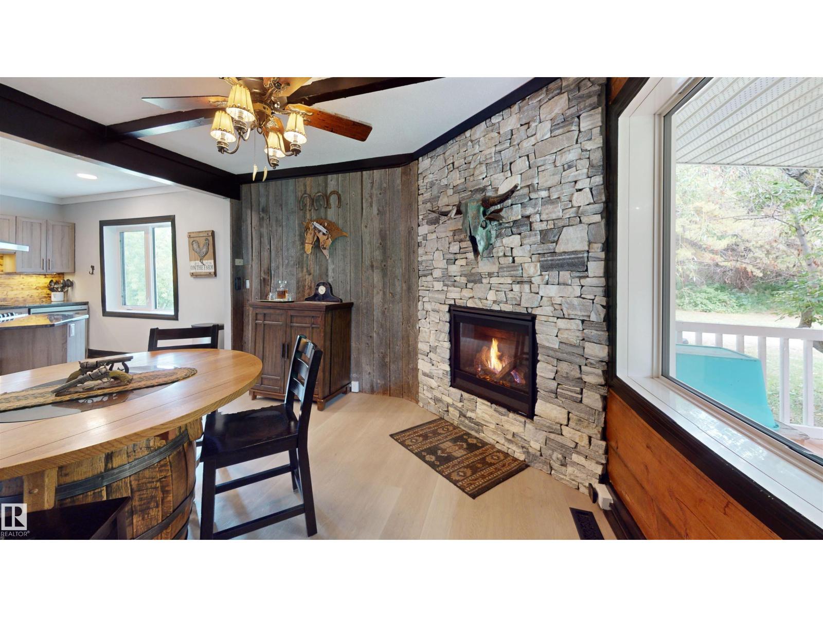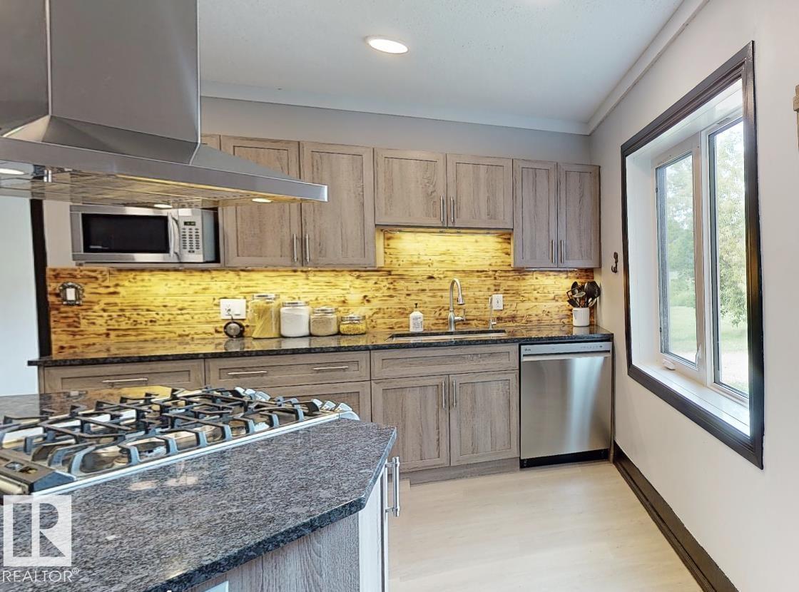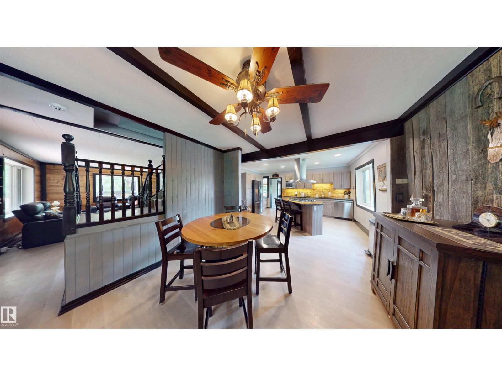 A perfect balance of rural serenity and modern acreage living agricultural zoned, out of subdivision, featuring a heritage square-cut log home. A recent $150K renovation: triple-pane windows, commercial grade LVP flooring, high efficiency furnace with humidifier, water heater, water treatment system, & reverse osmosis system. The Nordic marble natural gas fireplace anchors the open dining and kitchen area, a culinary oasis with upscale appliances, granite countertops on soft-close kitchen cabinets, custom backsplash, spacious island with eating bar. Main floor offers a spacious primary bedroom with a private 4 pc ensuite. Upstairs are 3 bedrooms and 3 pc bath. Step outside onto 1,100 sq ft of covered and open, wrap around deck, for entertaining. Store your cars and toys in the 936 sq/ft 3 Bay heated shop with mezzanine, custom bay doors with automatic openers, engineered concrete pad with durable protective coating and floor drain. Property includes a 2nd residence (ready for rebuild) & a double garage. (id:63190)